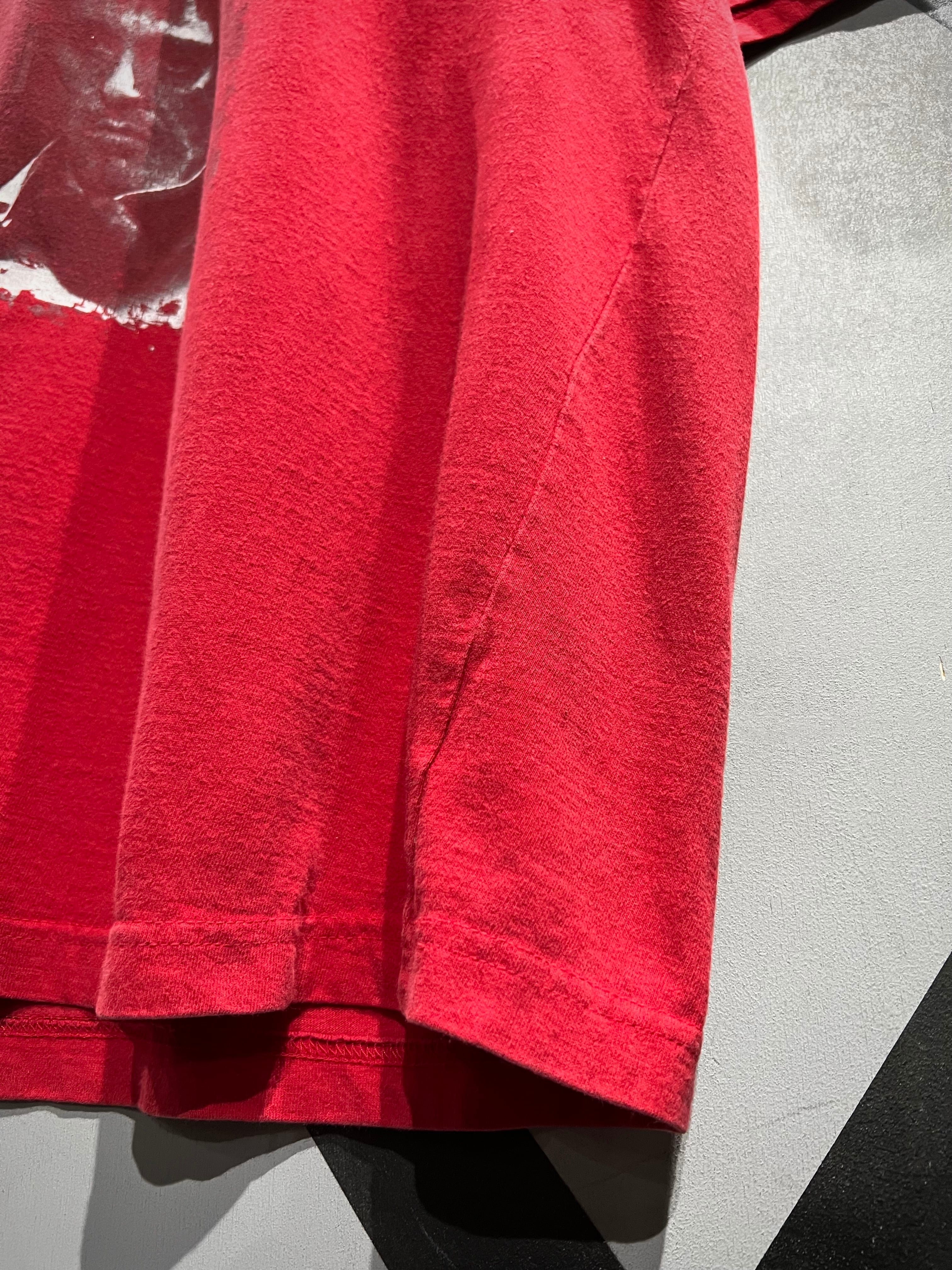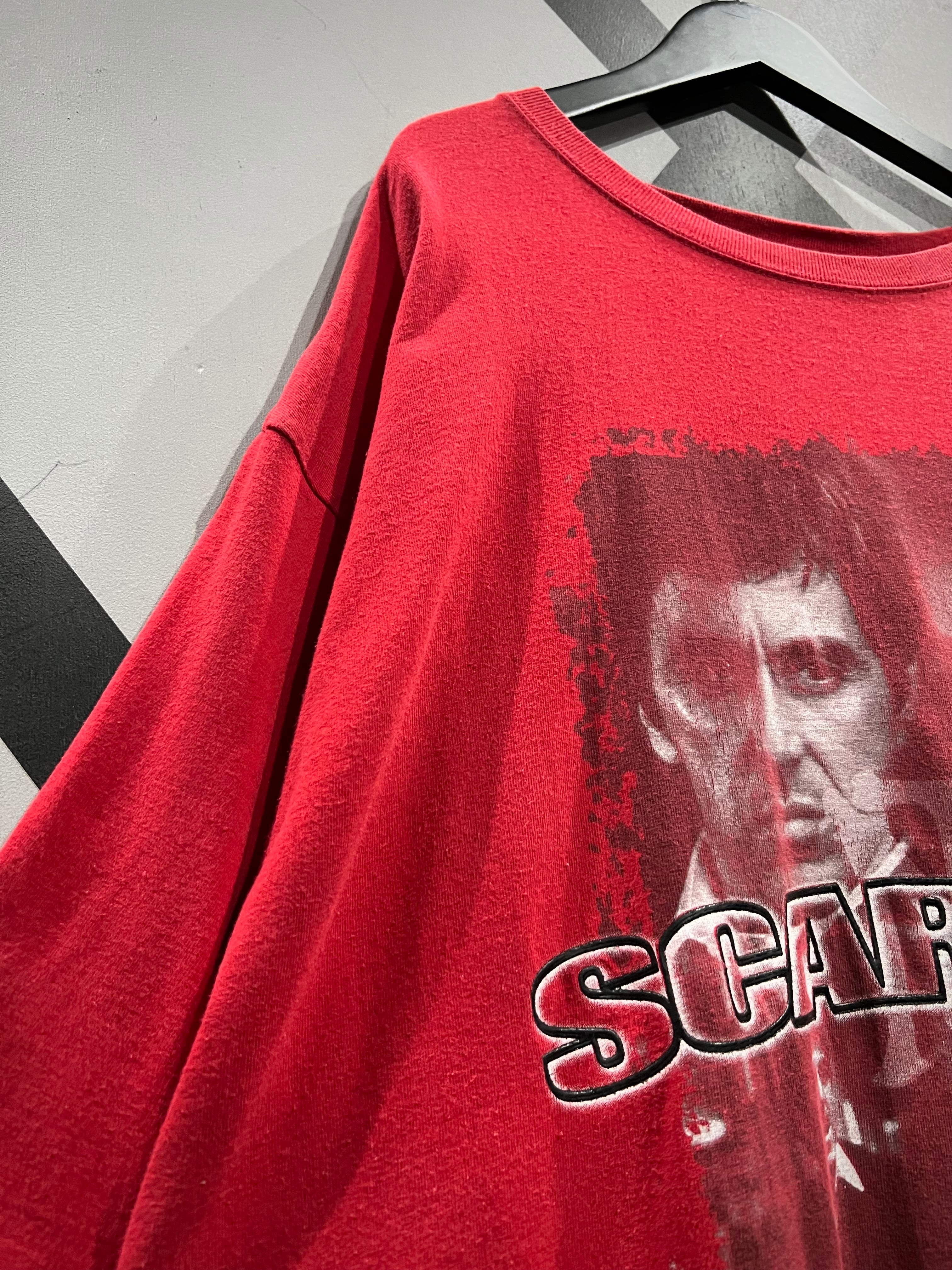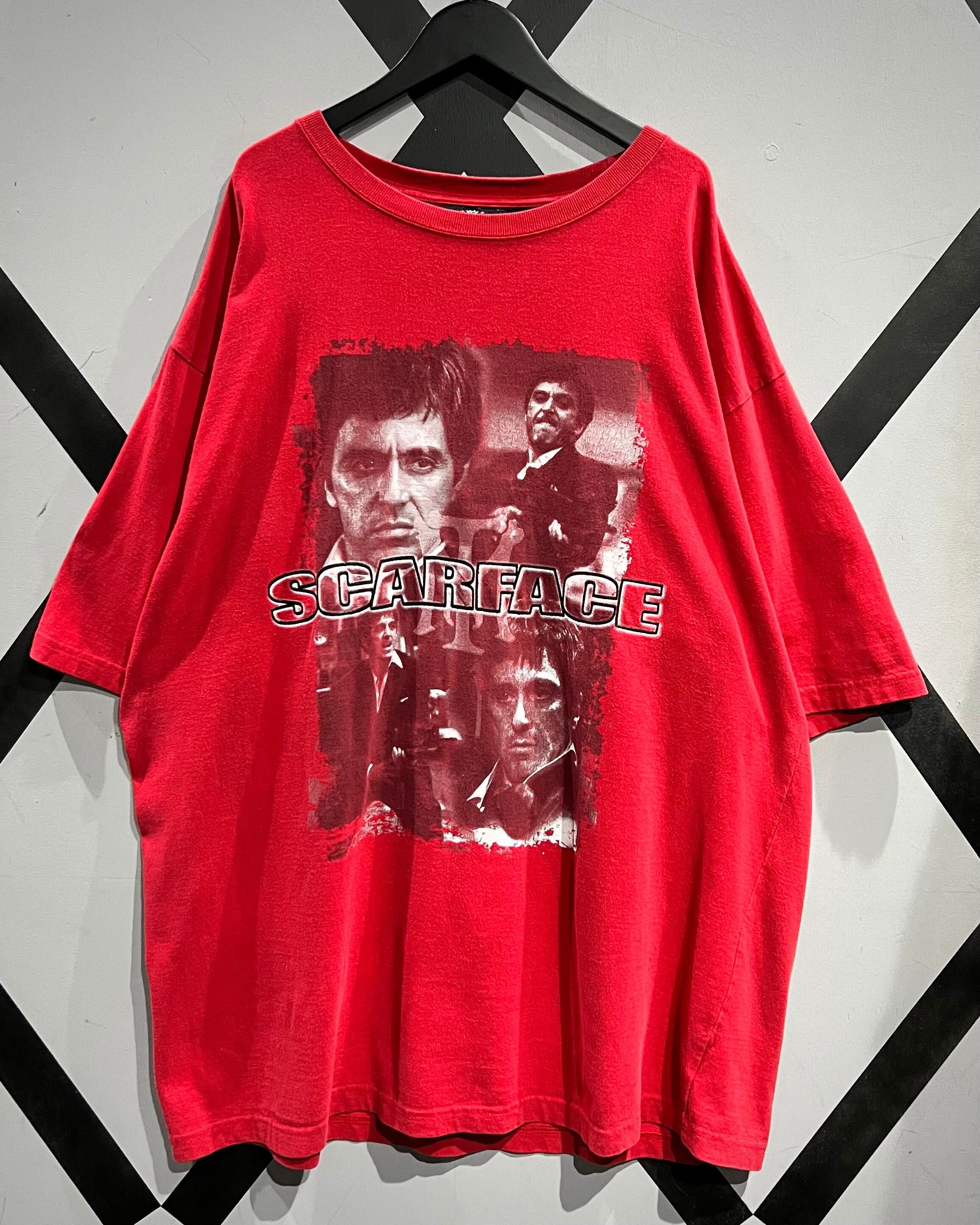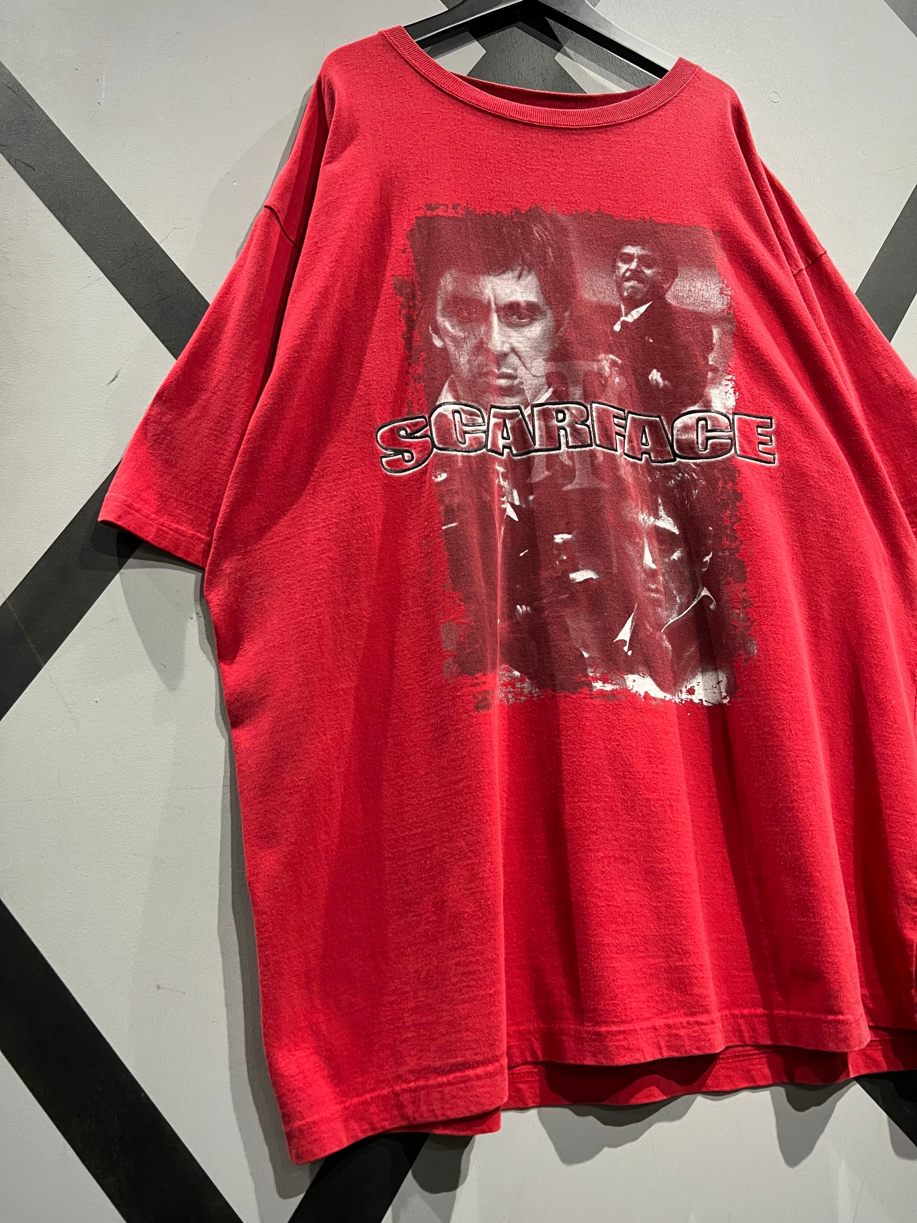 2XL表記のルーズなサイジングの赤ボディに、映画の名シーンプリントでON。経年による絶妙なヒビ割れも良く、その上からはラバープリントで"'SCARFACE"の文字。映画自体の迫力をそのまま一つの洋服に落とし込んだようなデザイン性抜群の仕上がりに。