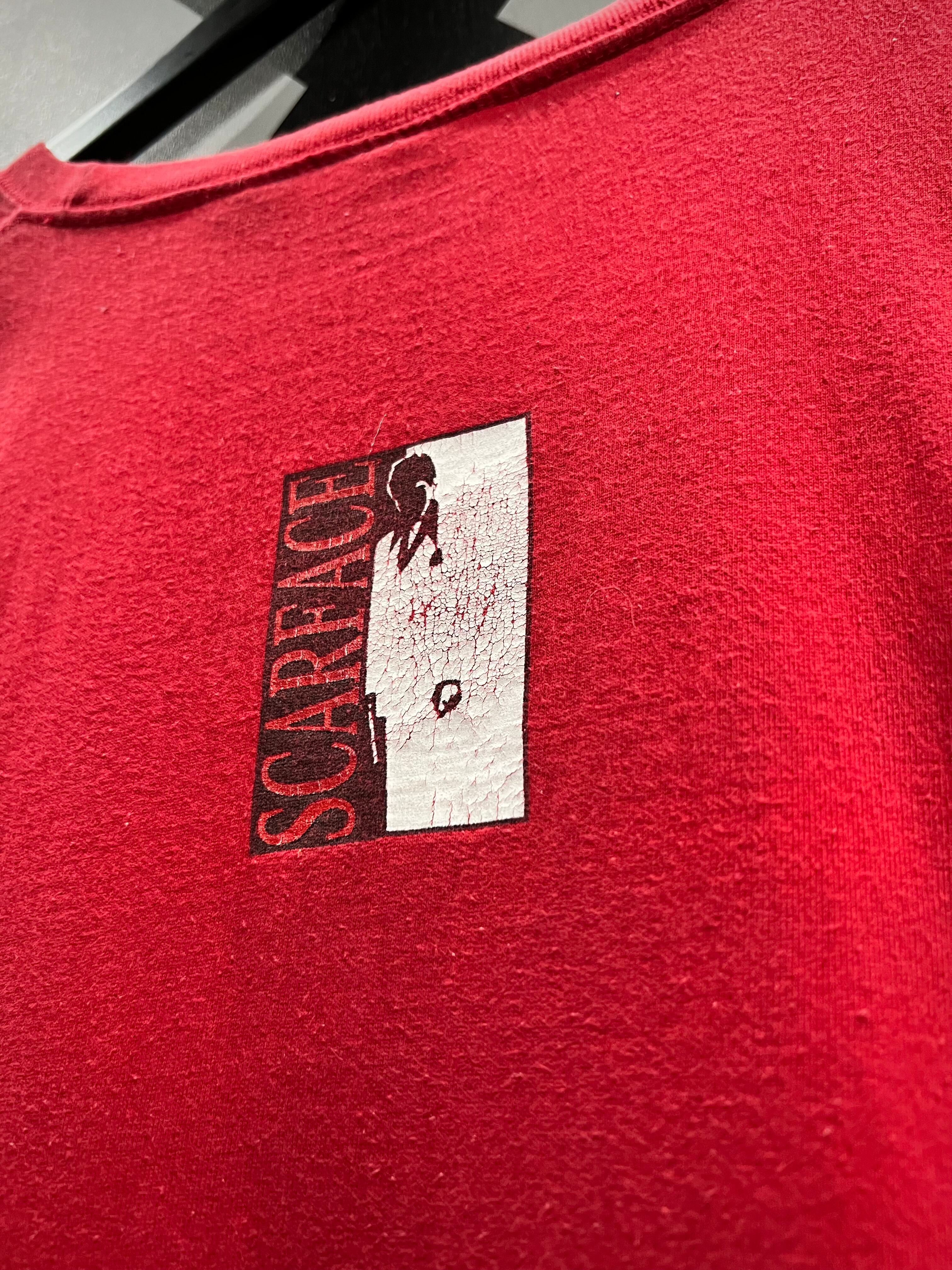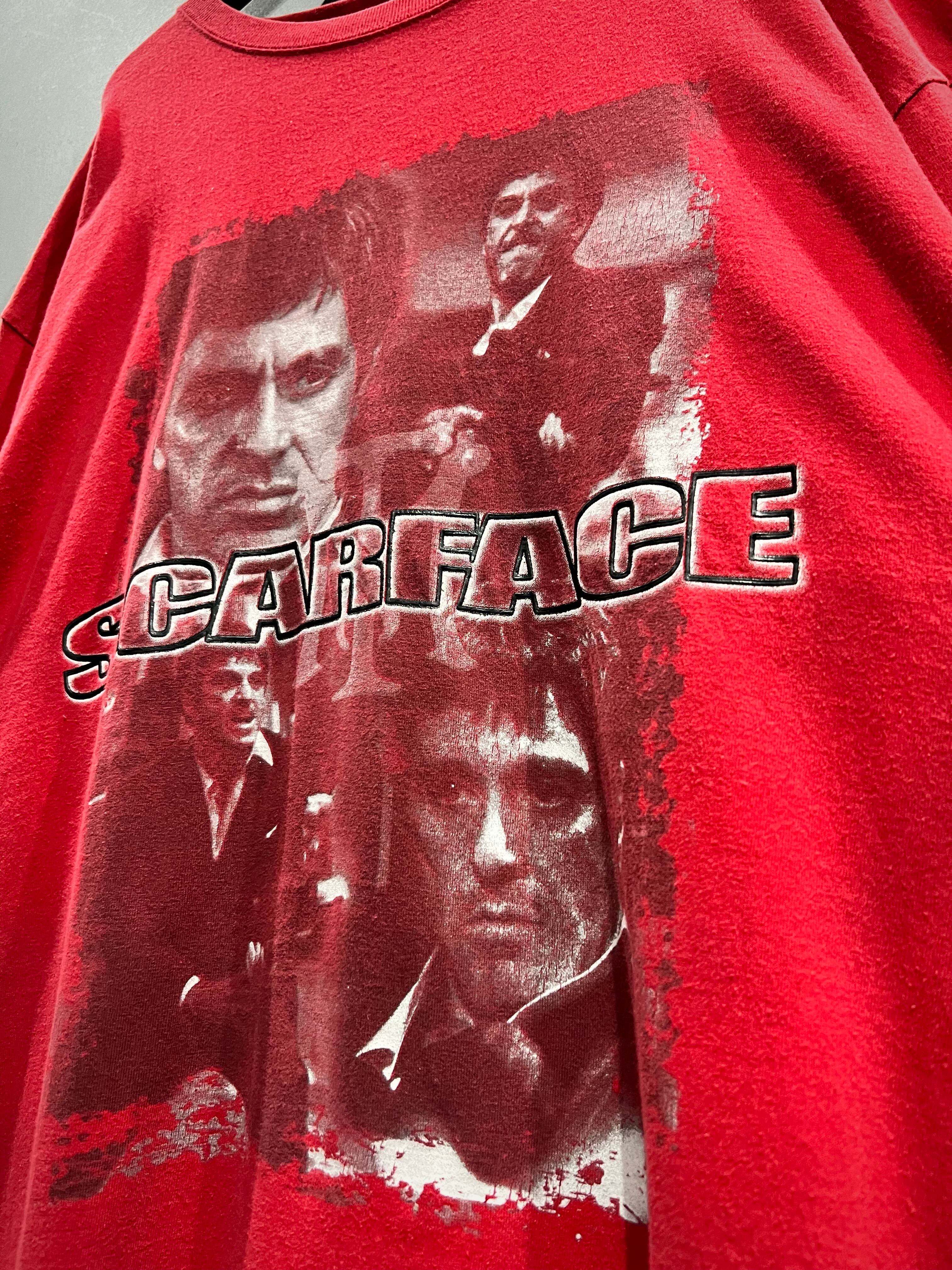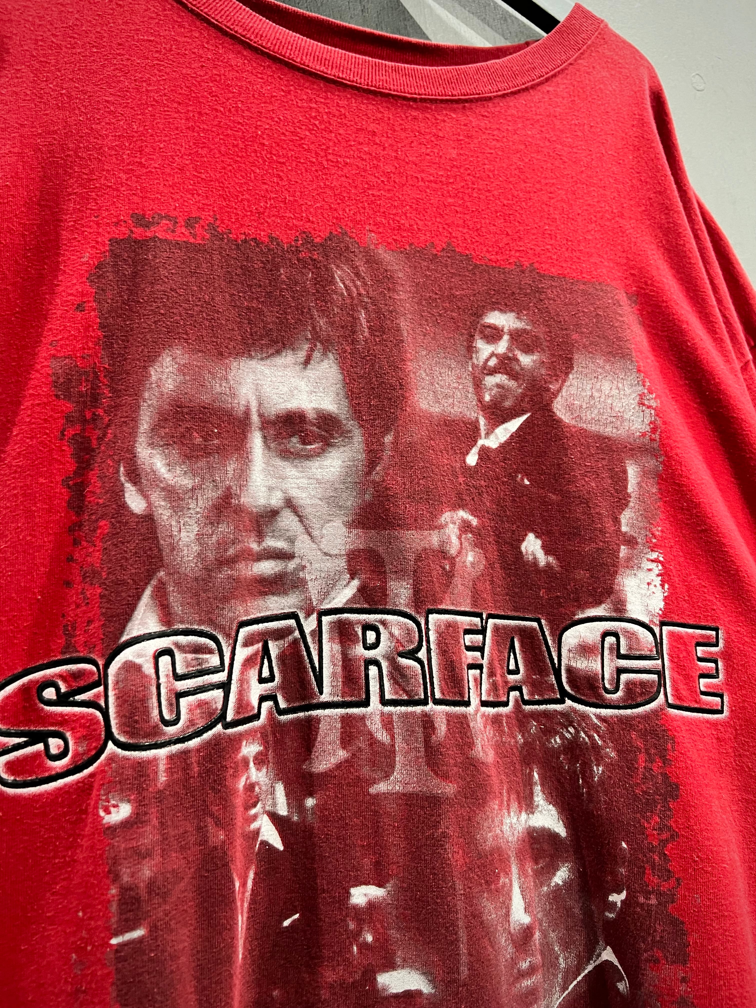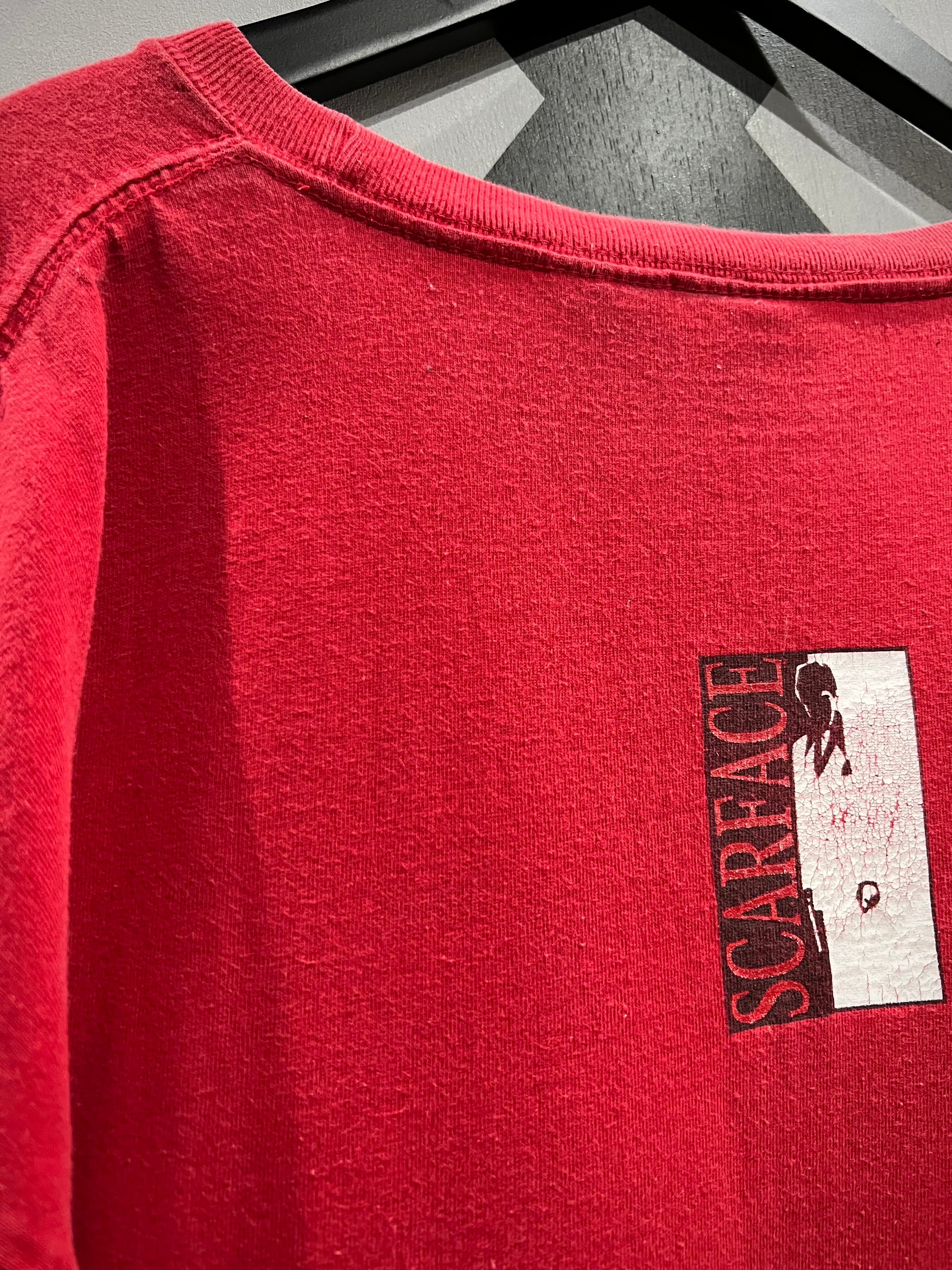 2XL表記のルーズなサイジングの赤ボディに、映画の名シーンプリントでON。経年による絶妙なヒビ割れも良く、その上からはラバープリントで"'SCARFACE"の文字。映画自体の迫力をそのまま一つの洋服に落とし込んだようなデザイン性抜群の仕上がりに。