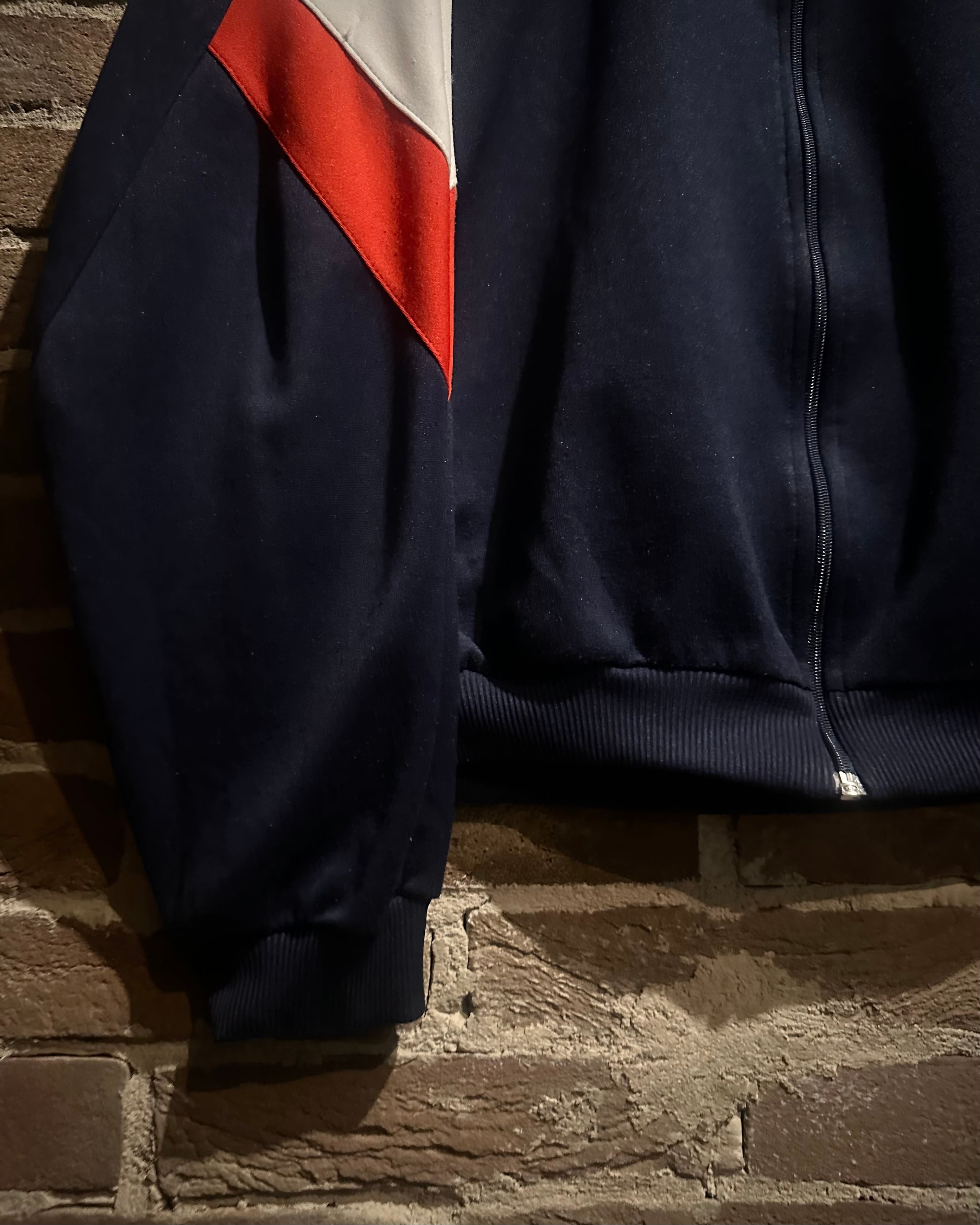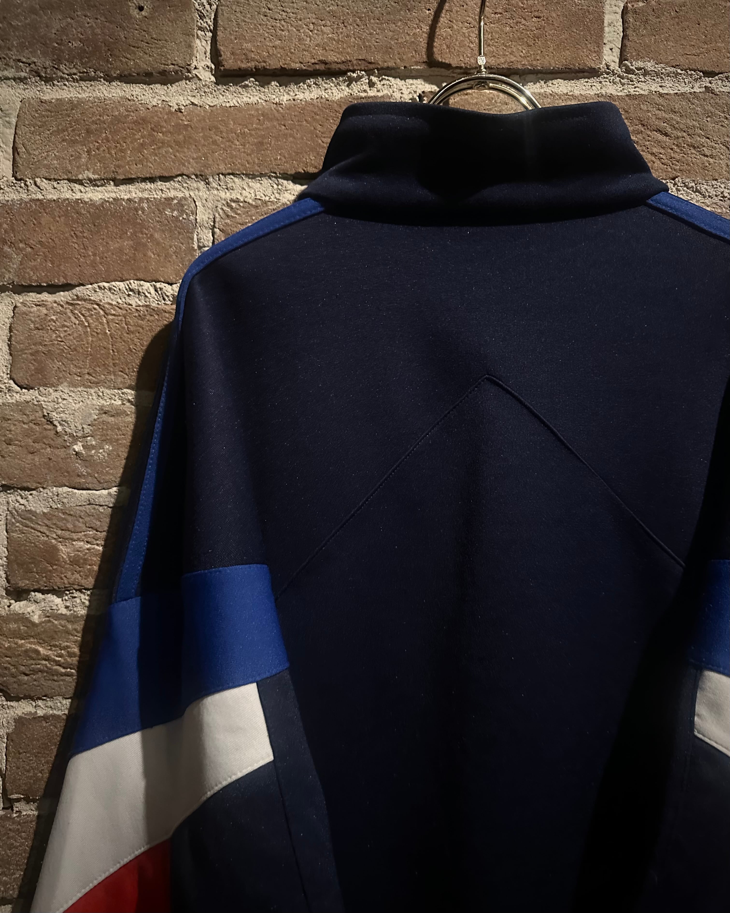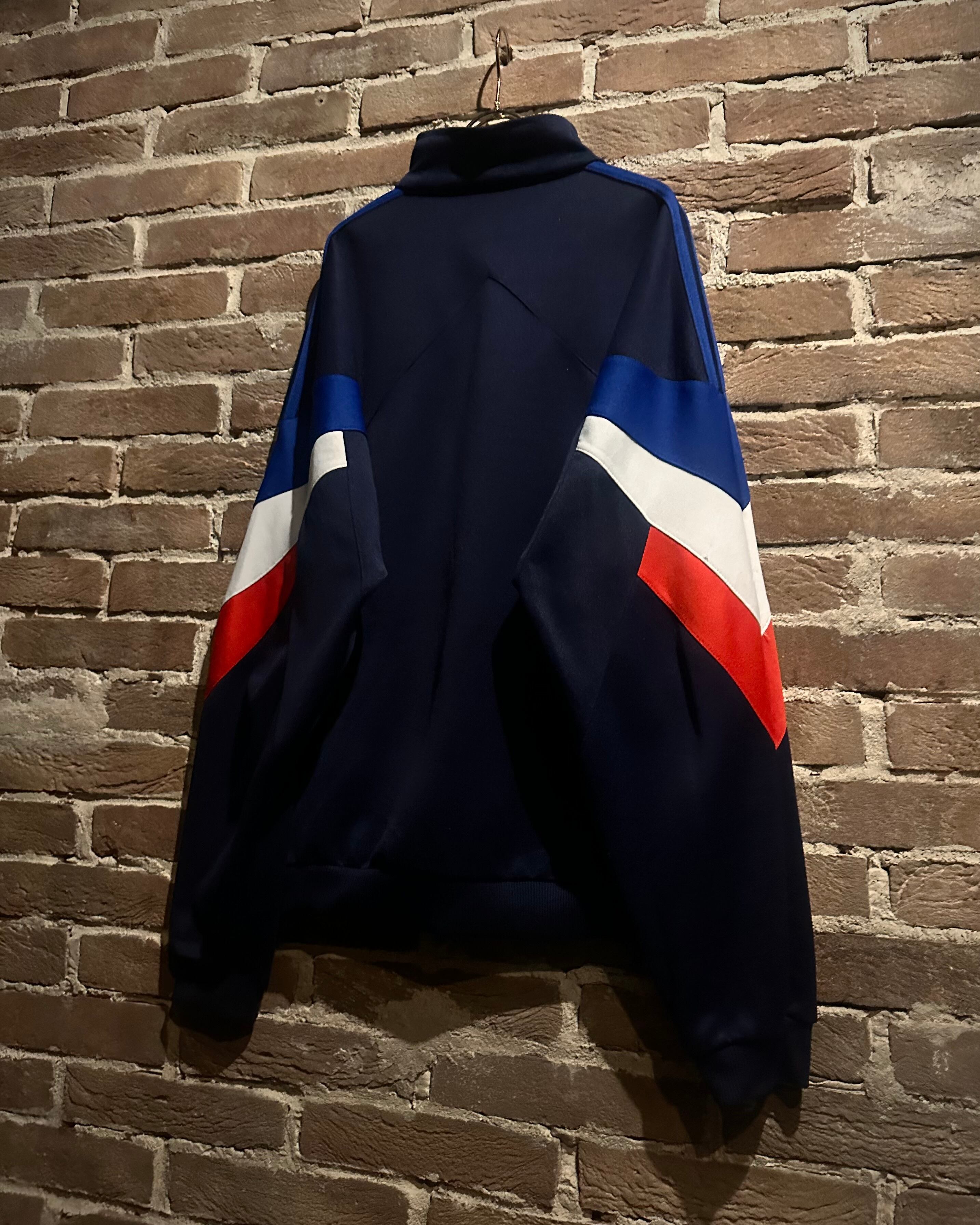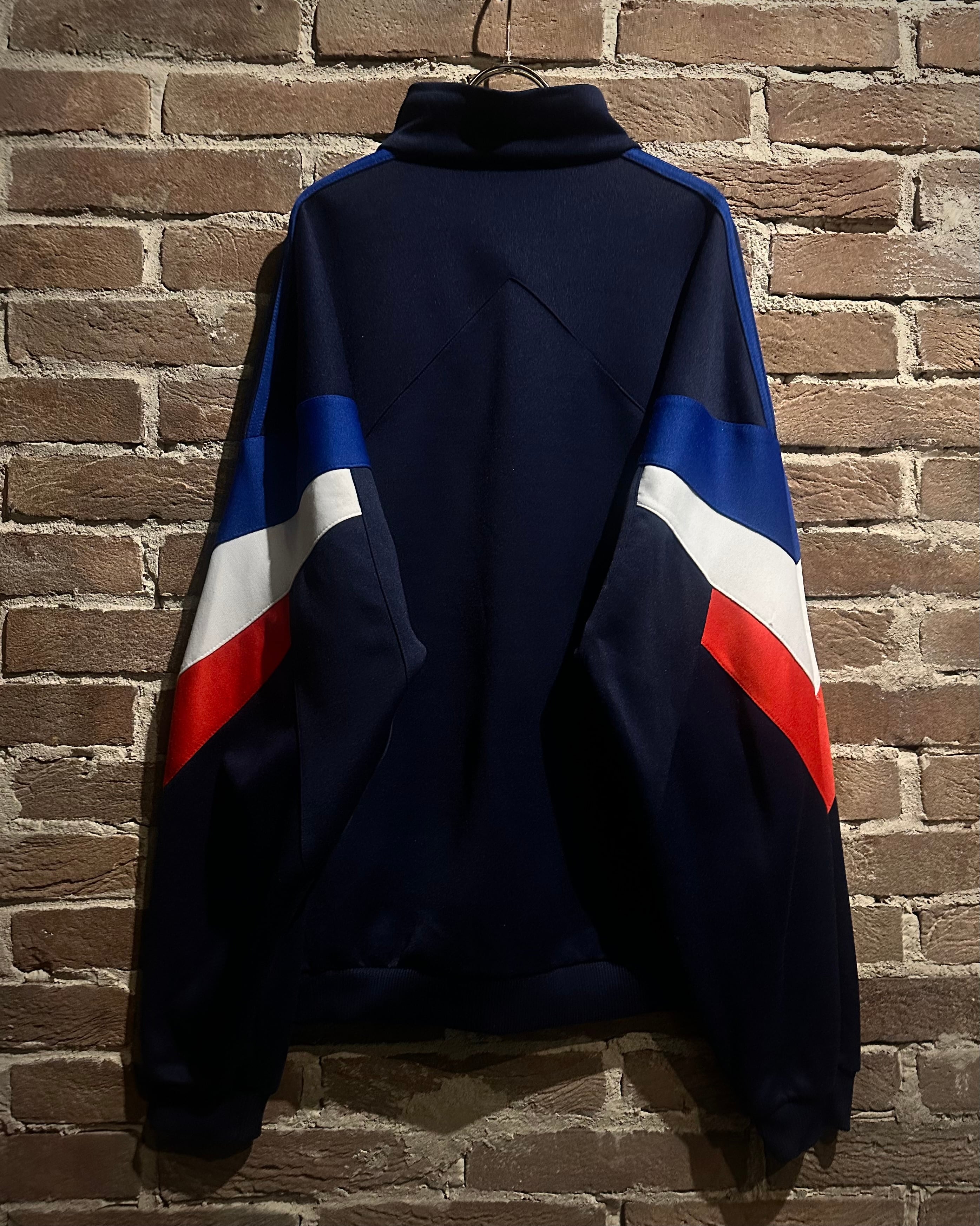 ネイビーのボディに赤,白,青のトリコロールカラーで切り替えを施した、デザインが光り輝く80'sヴィンテージのトラックジャケット。