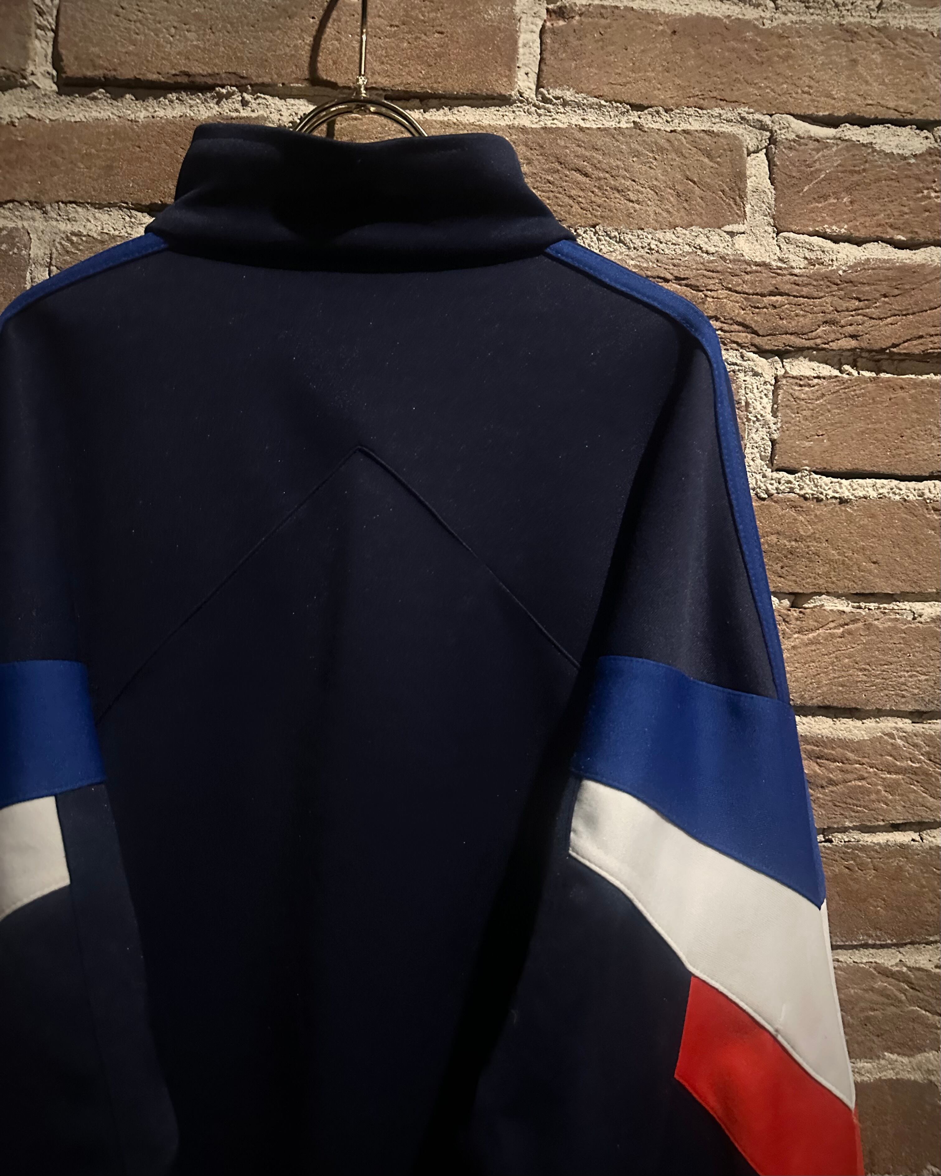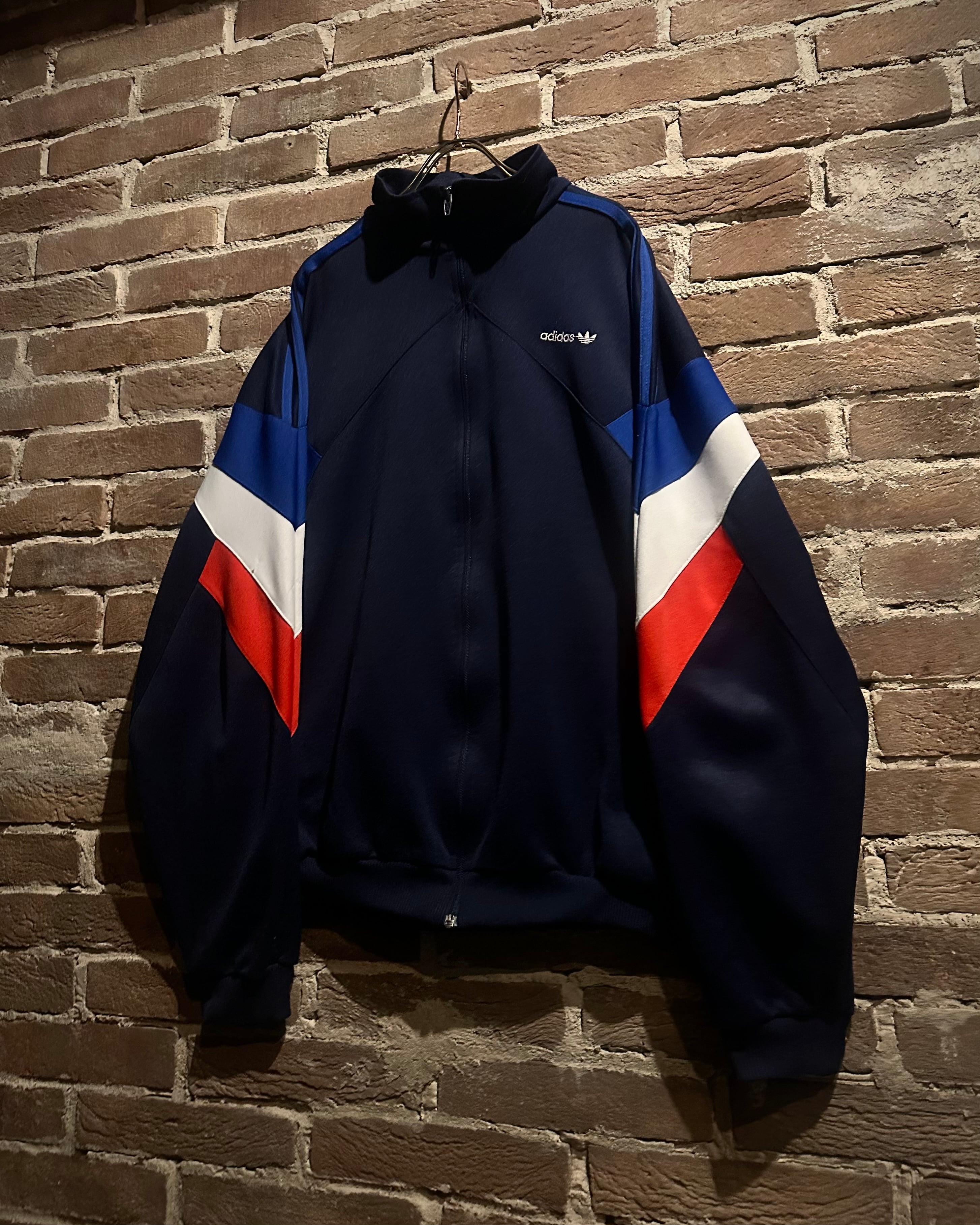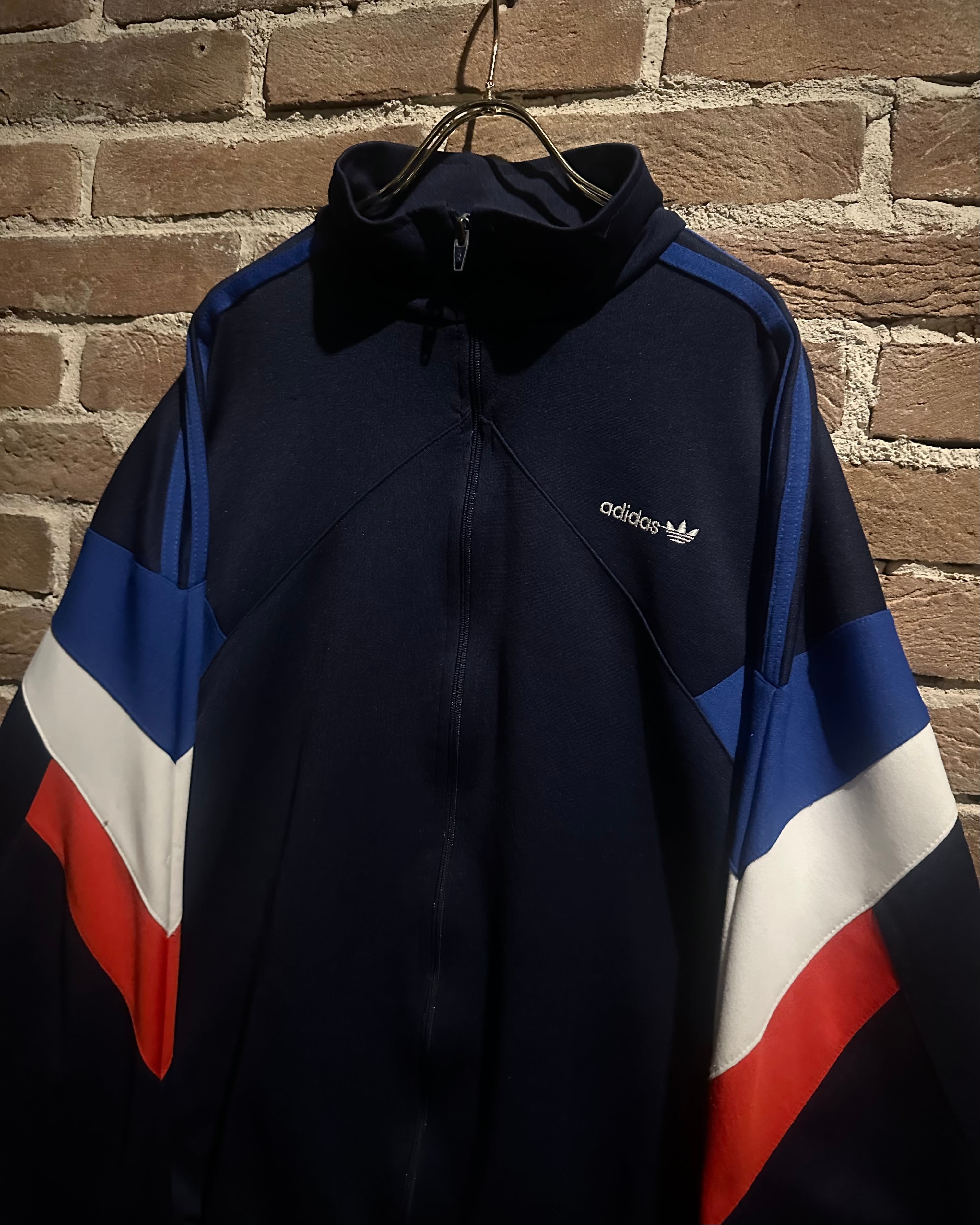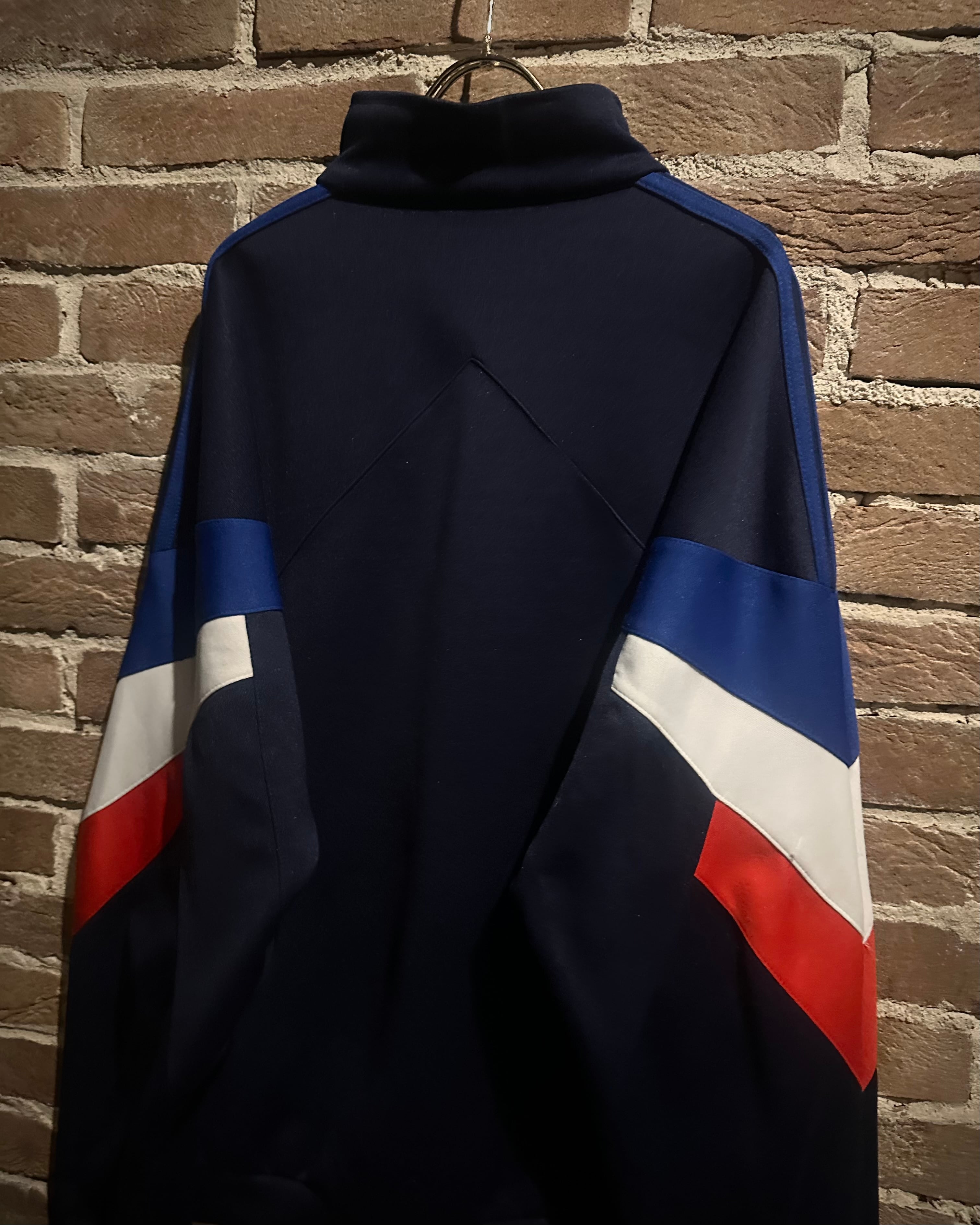 ネイビーのボディに赤,白,青のトリコロールカラーで切り替えを施した、デザインが光り輝く80'sヴィンテージのトラックジャケット。
