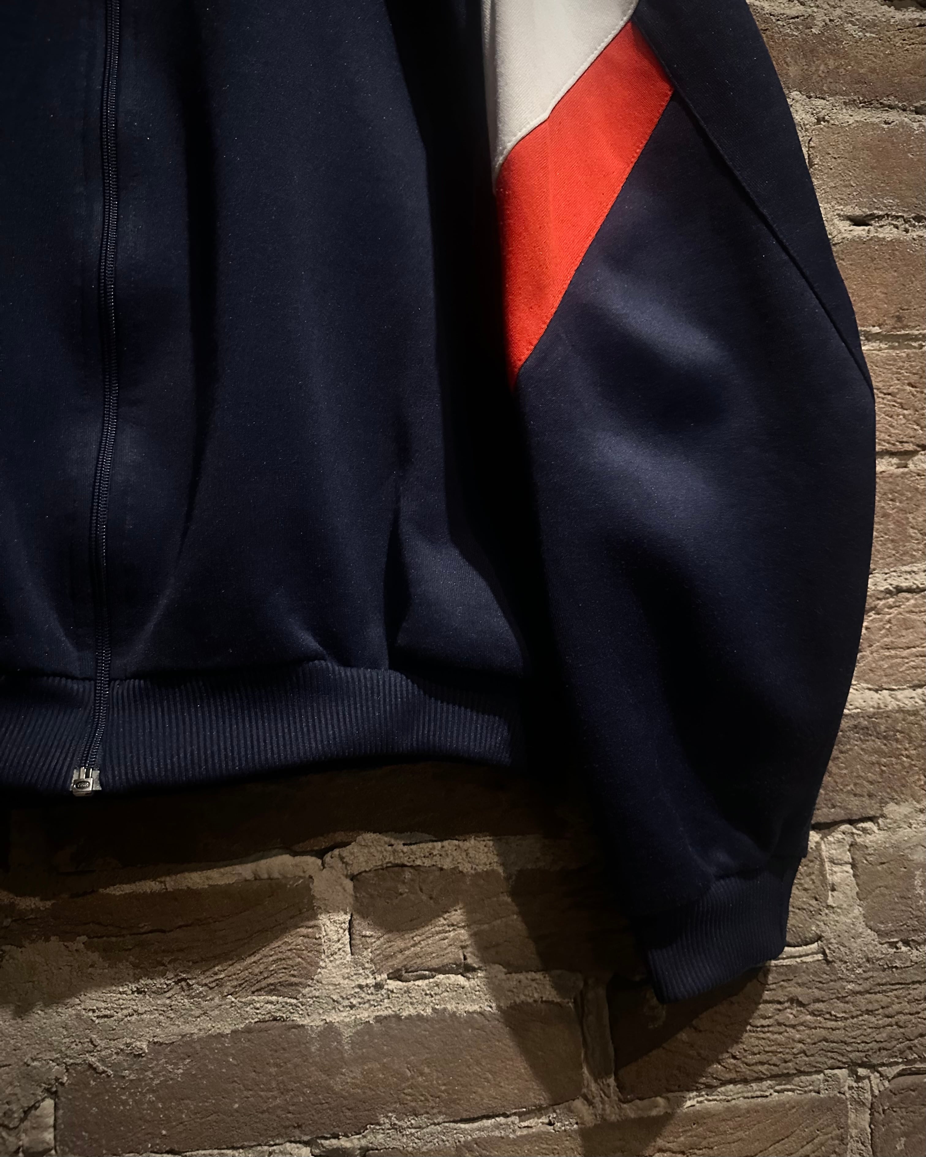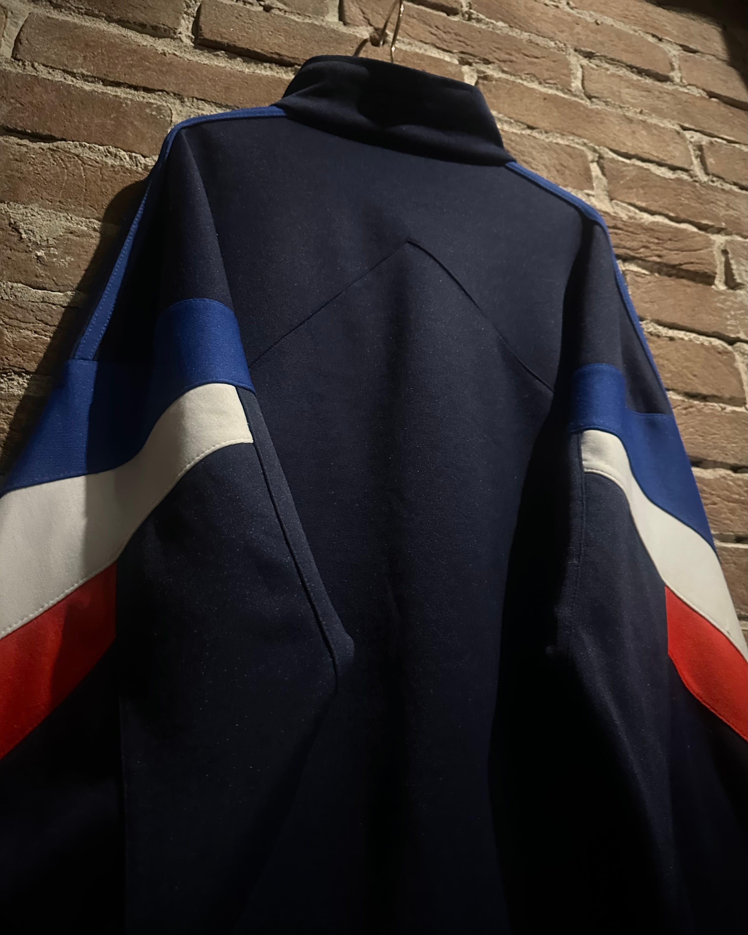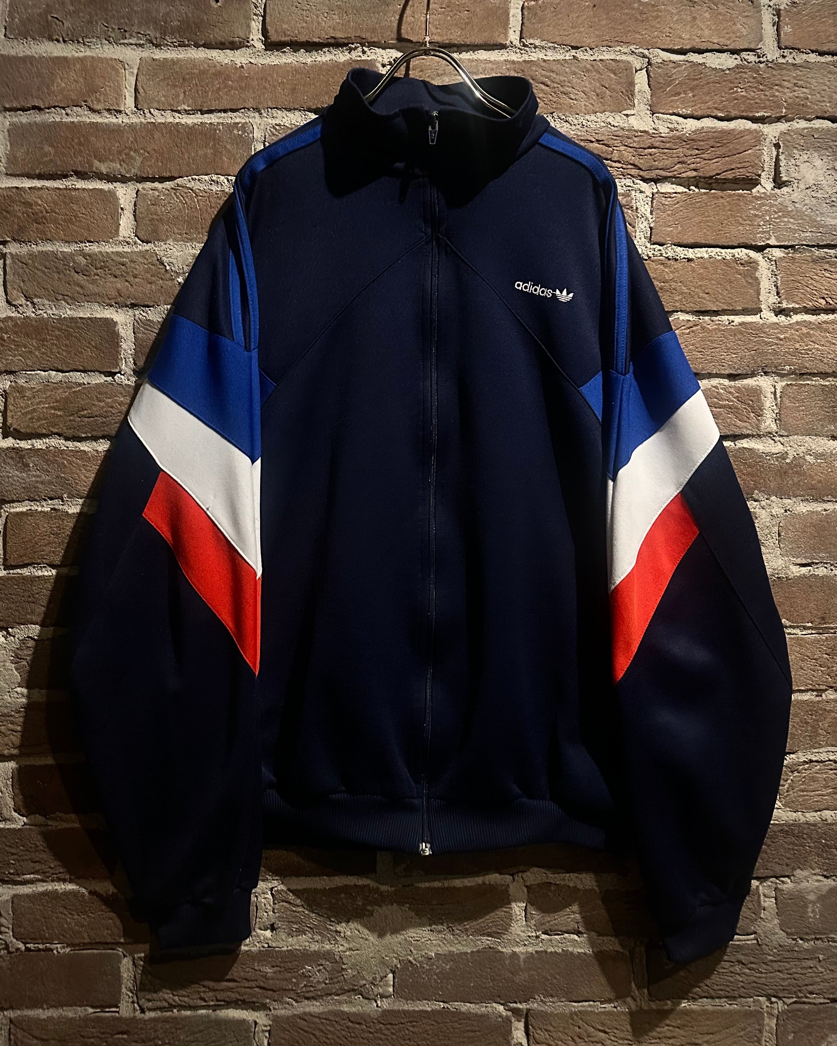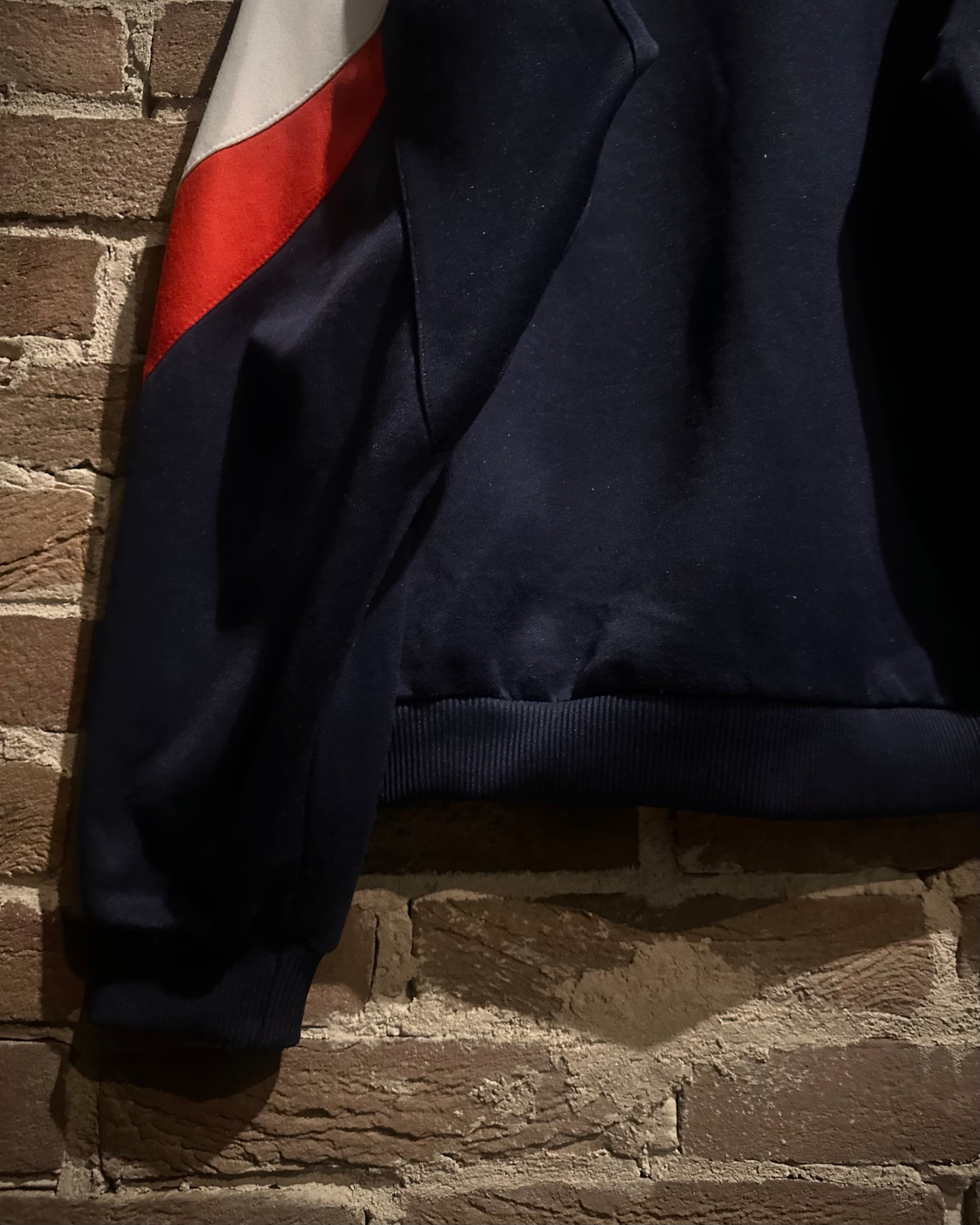 ネイビーのボディに赤,白,青のトリコロールカラーで切り替えを施した、デザインが光り輝く80'sヴィンテージのトラックジャケット。