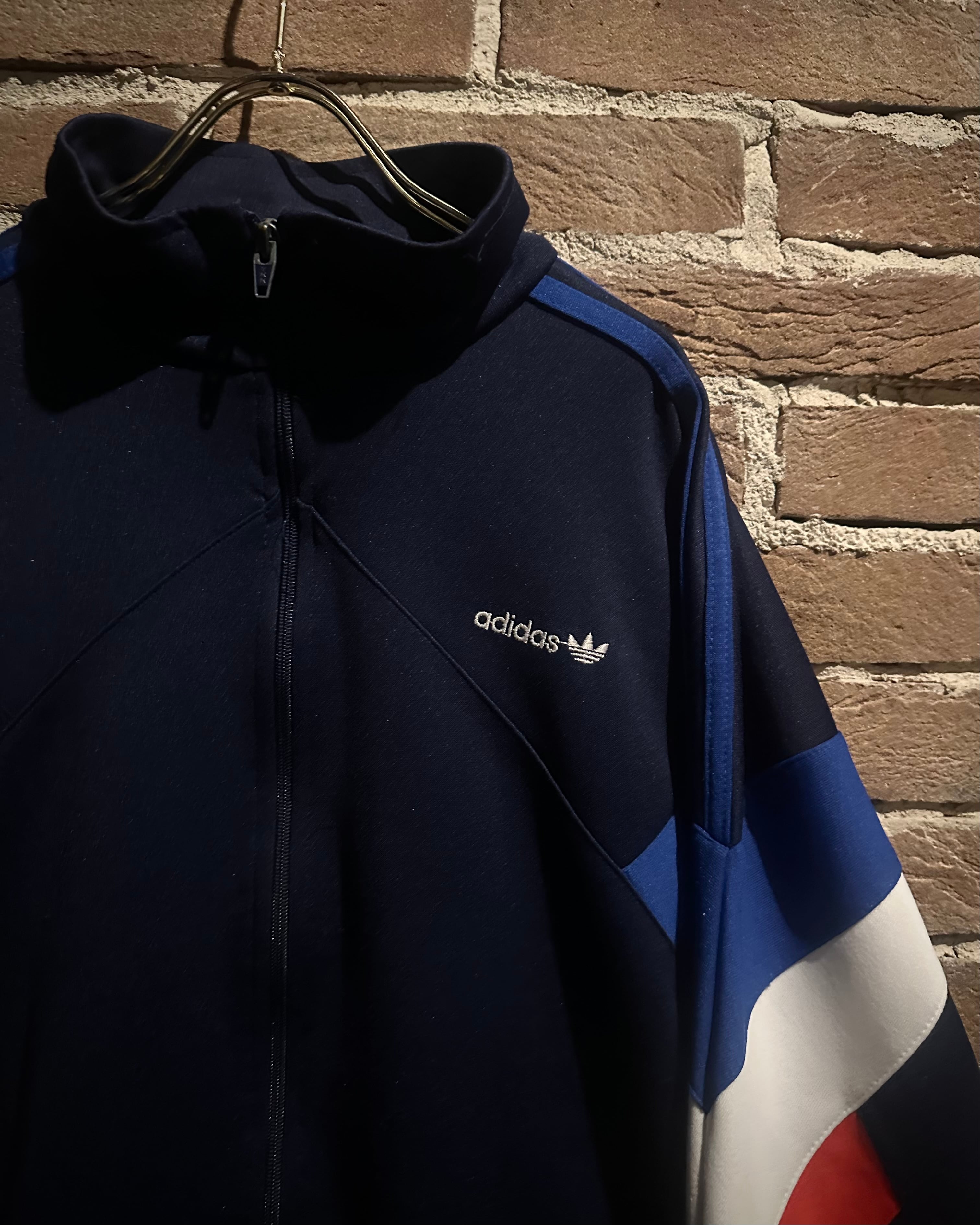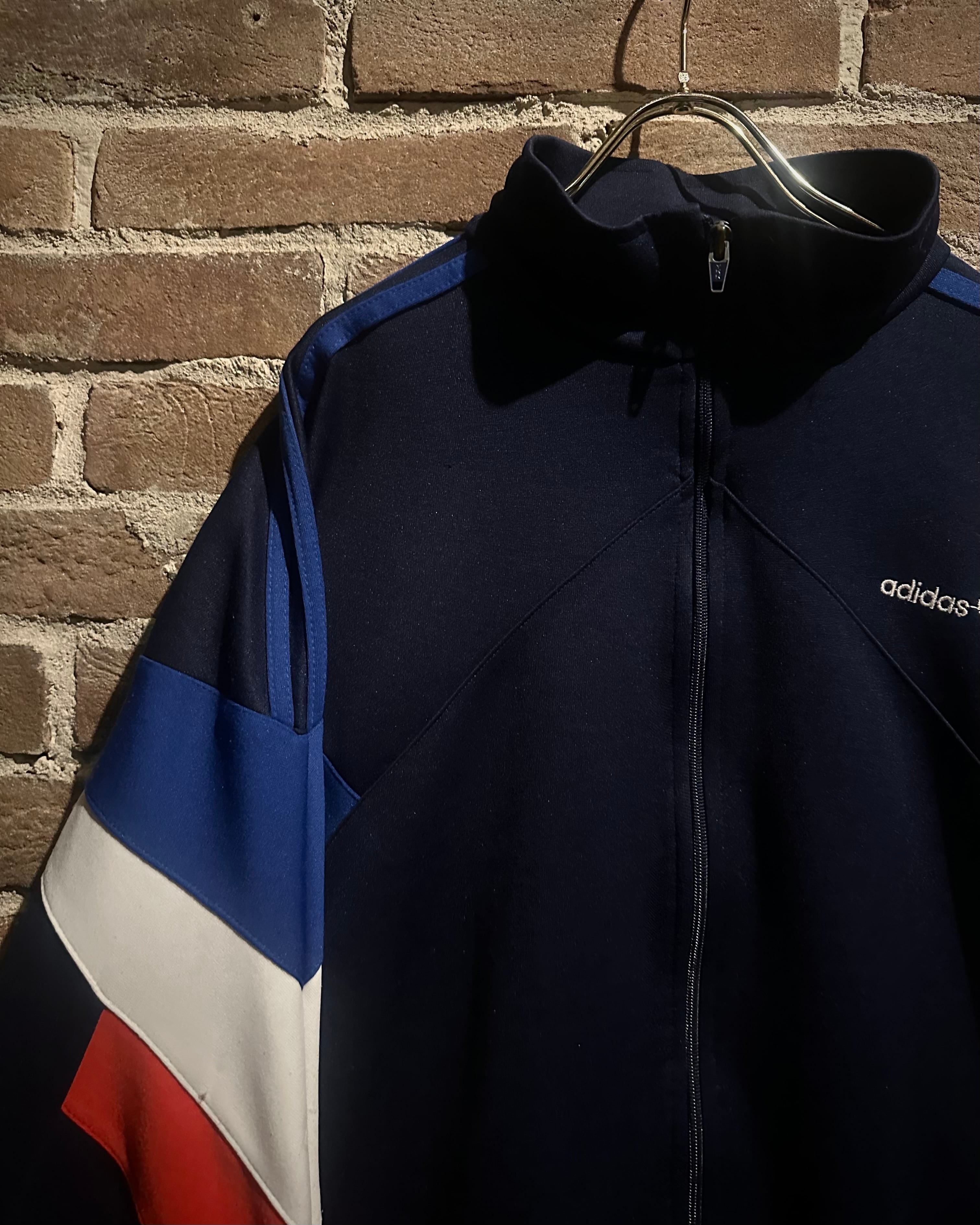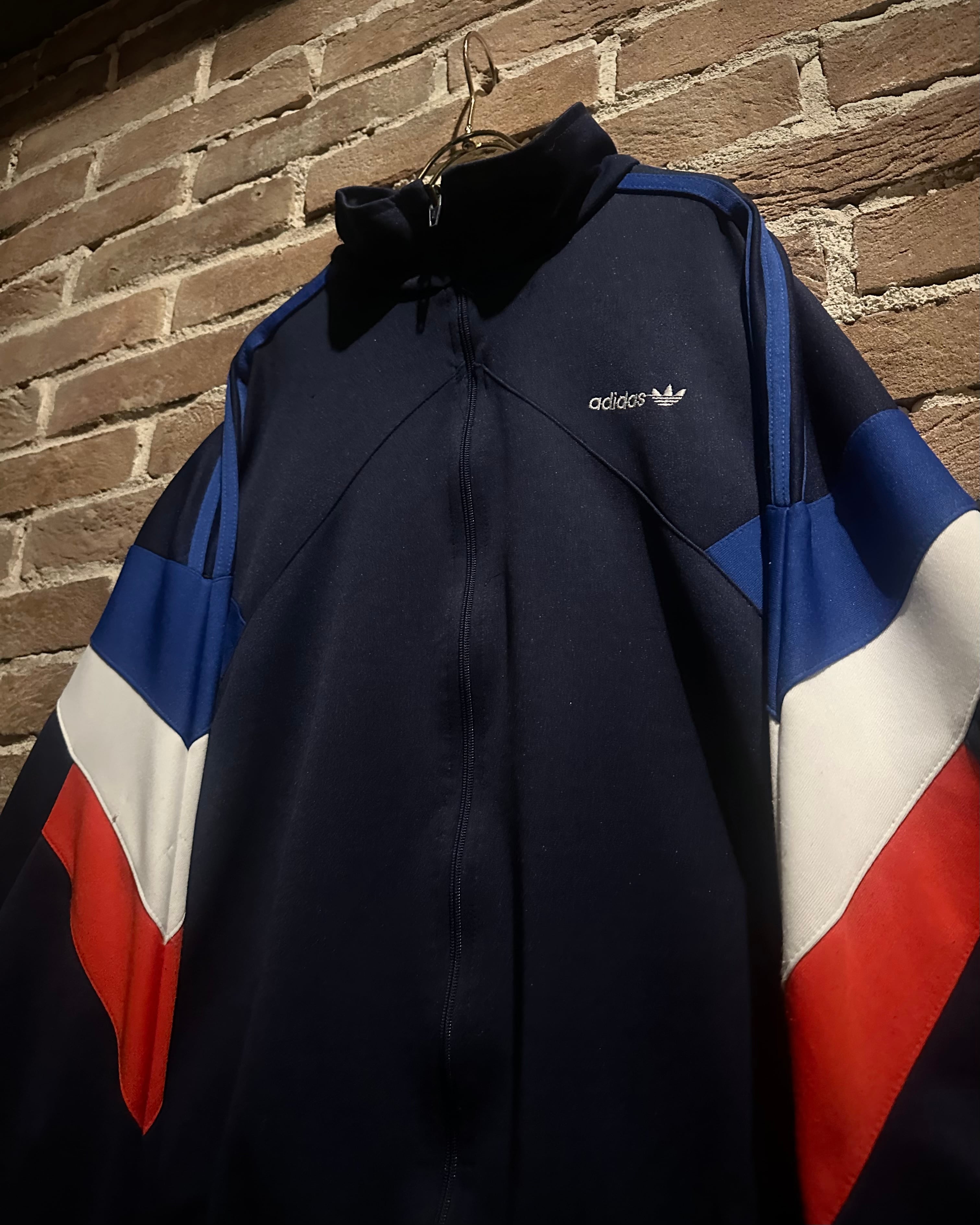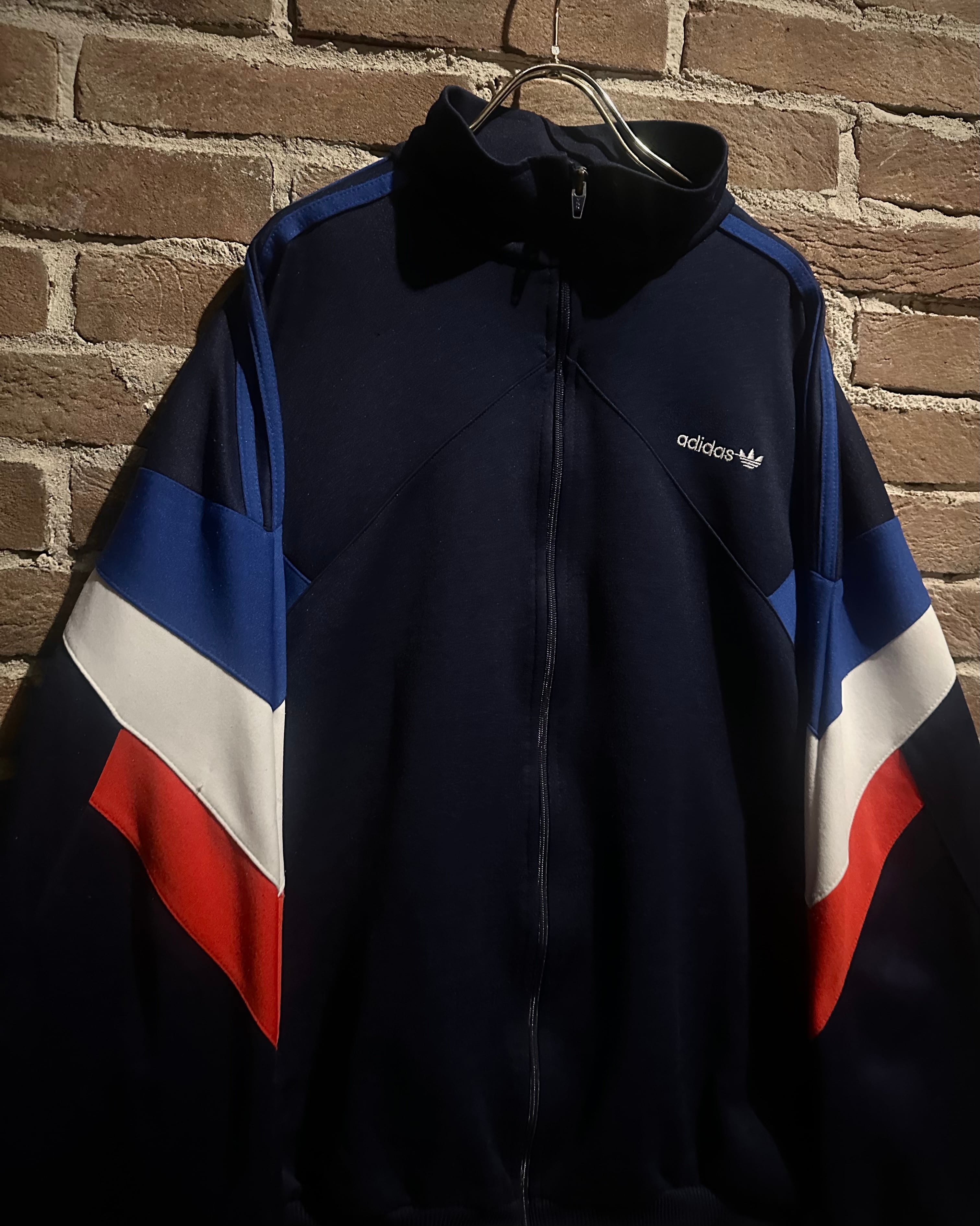 ネイビーのボディに赤,白,青のトリコロールカラーで切り替えを施した、デザインが光り輝く80'sヴィンテージのトラックジャケット。