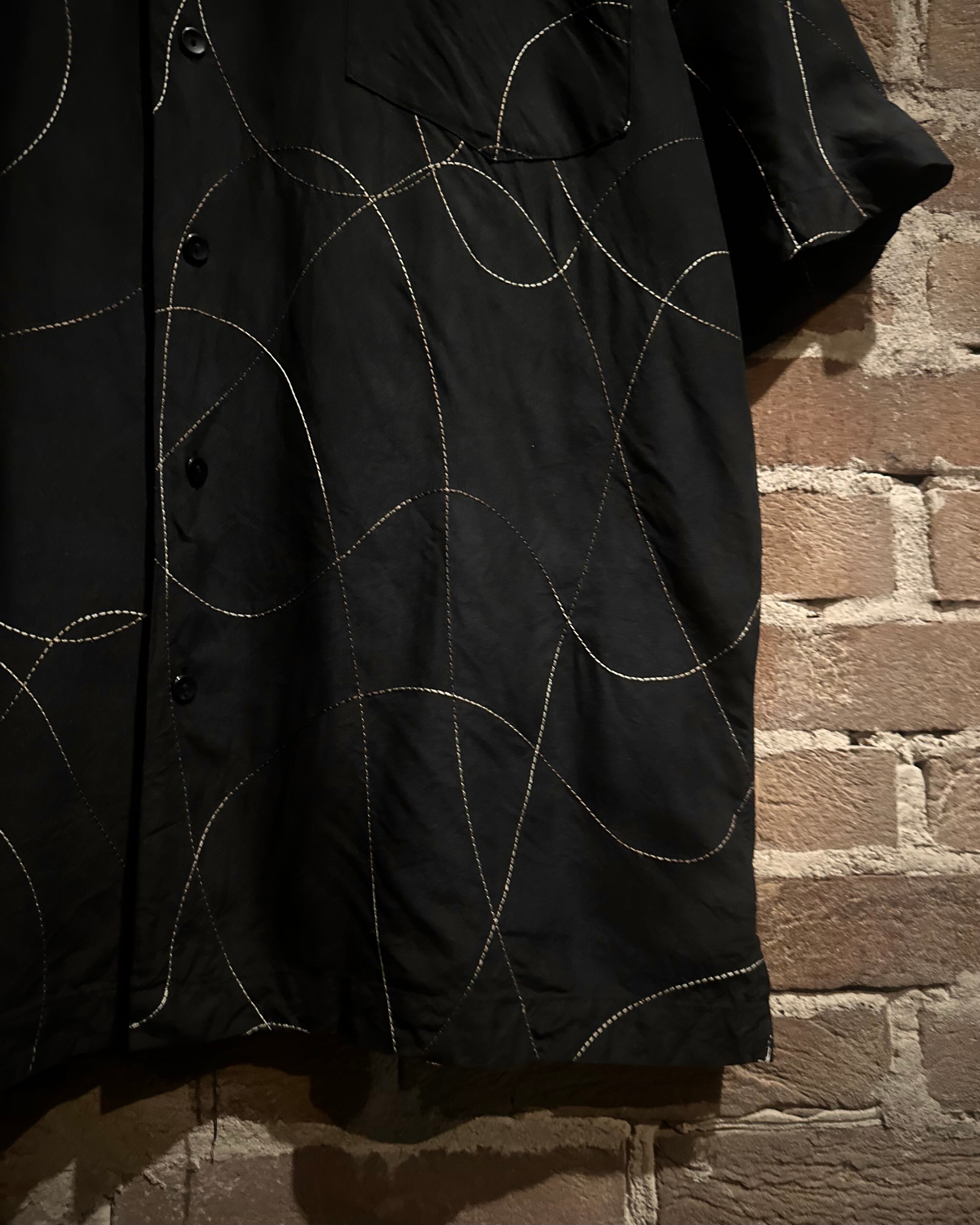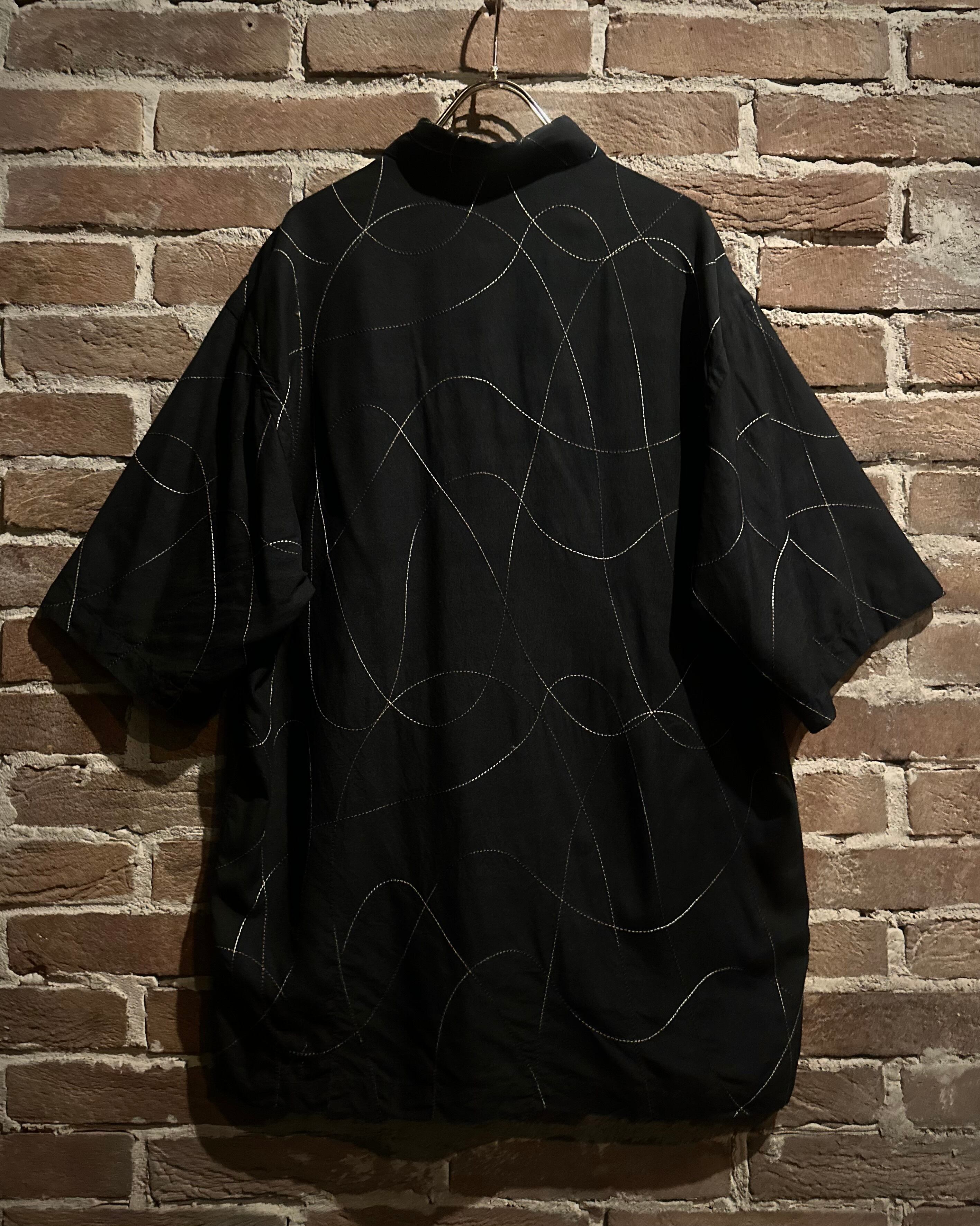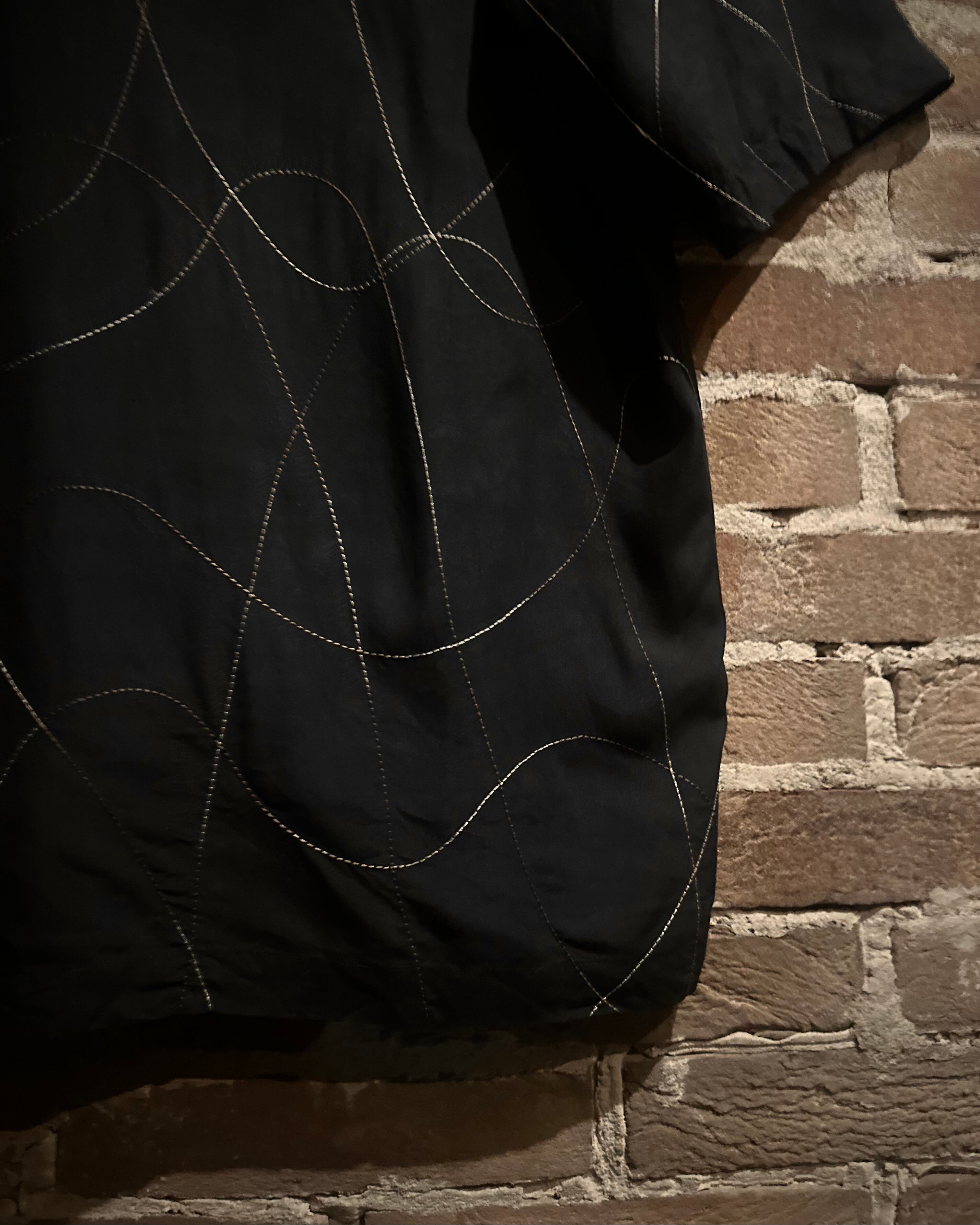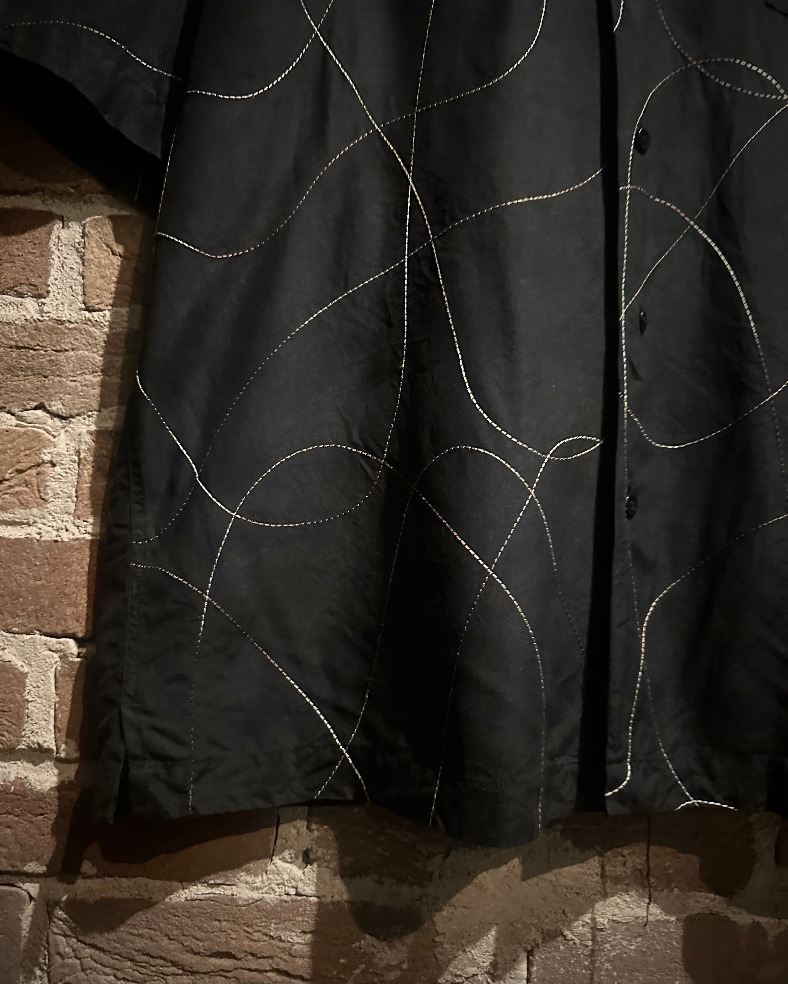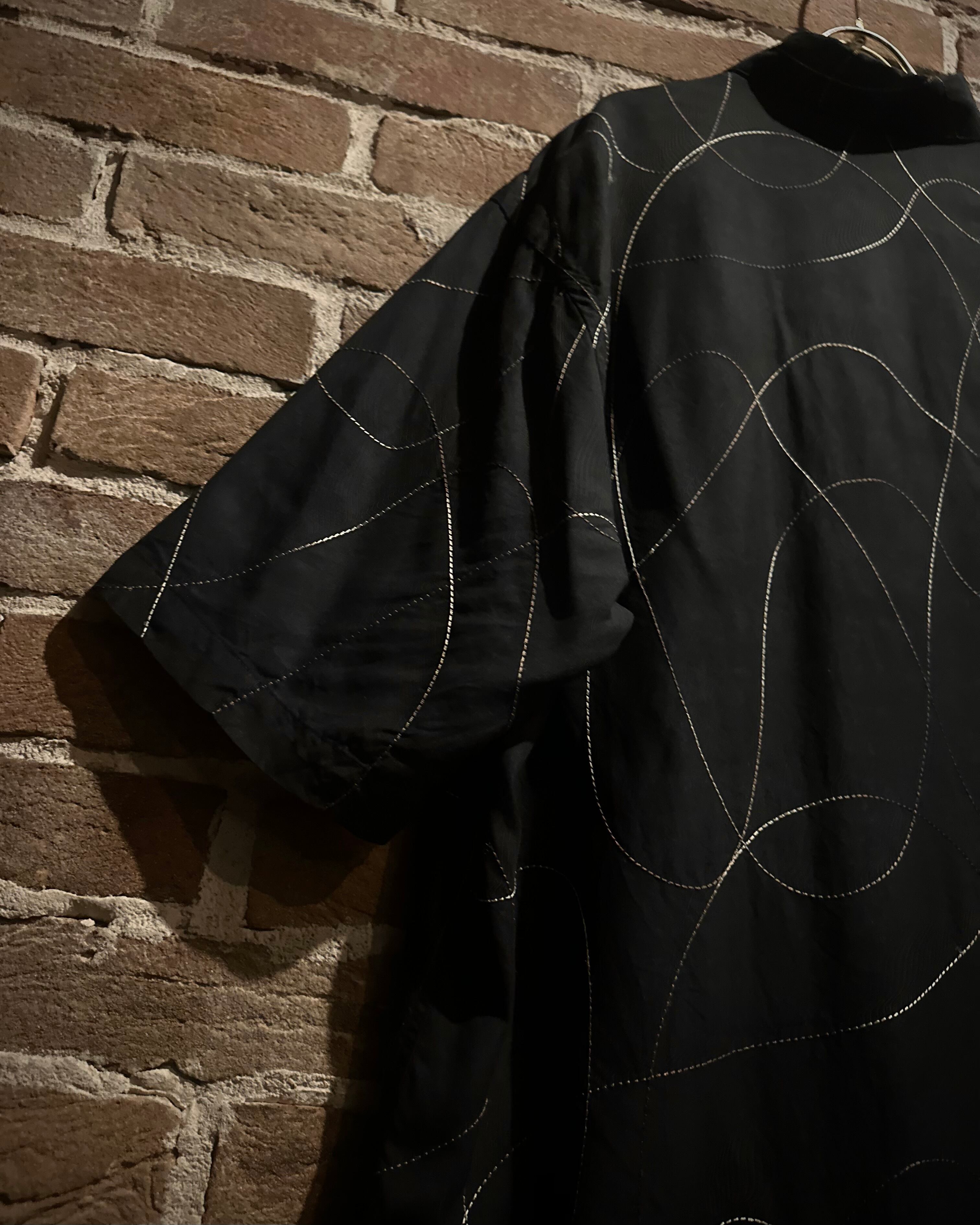 ブラックのボディをベースに、ステッチでラインのデザインを載せた半袖シャツ。