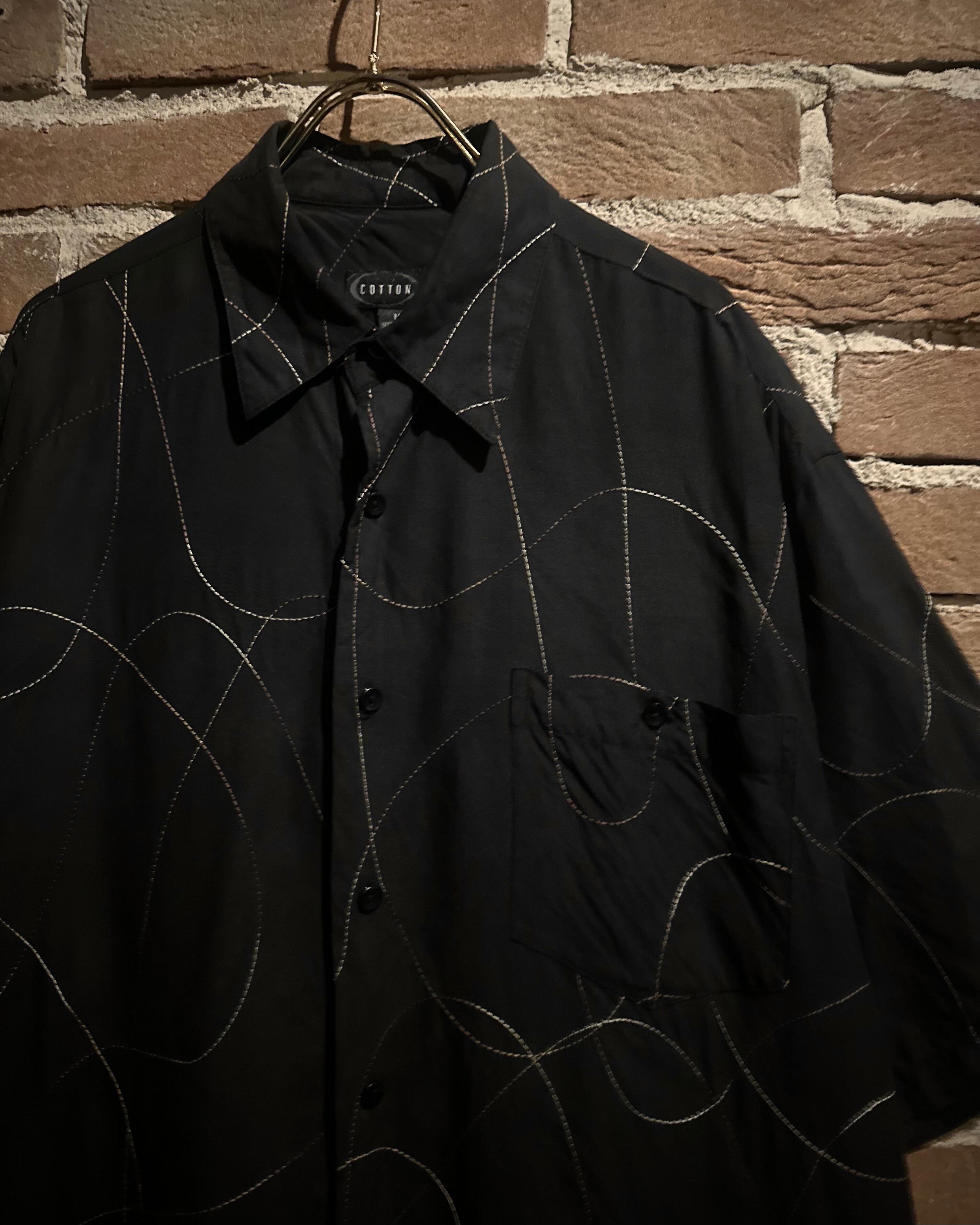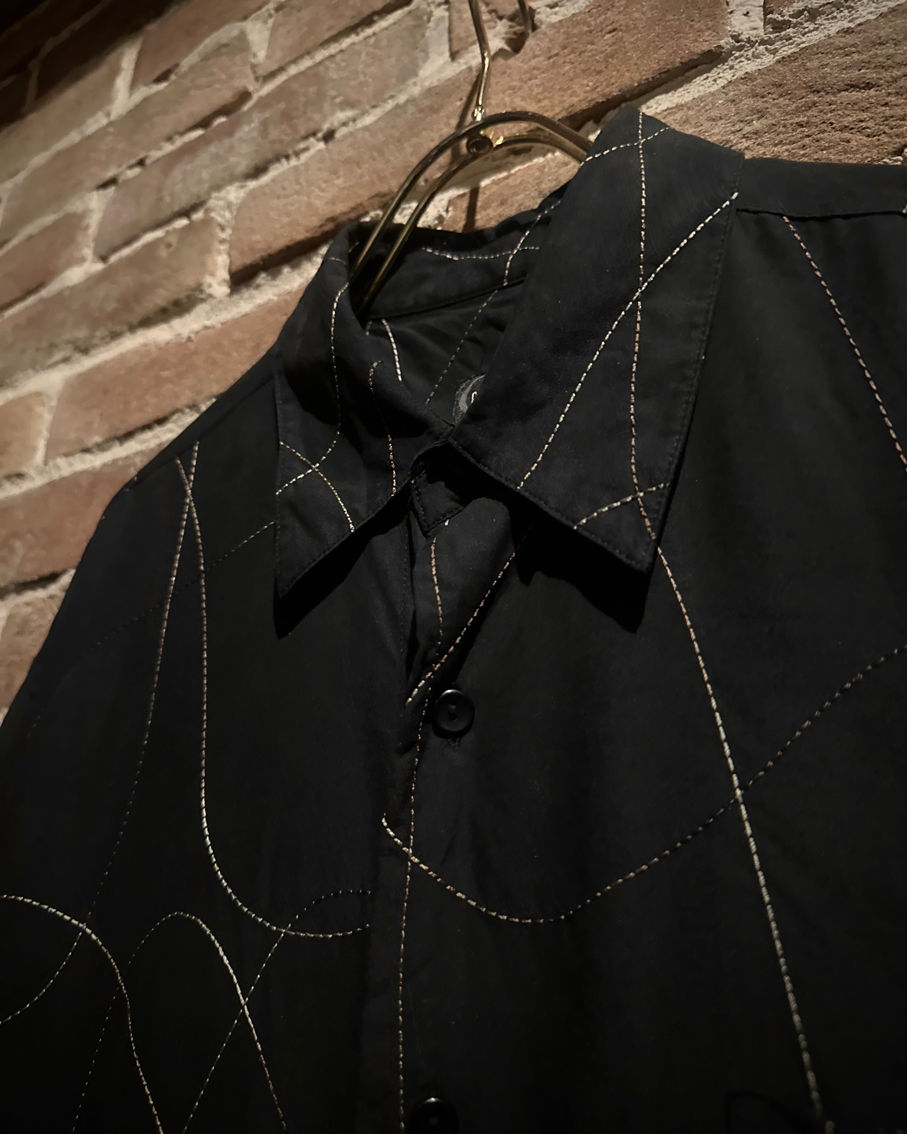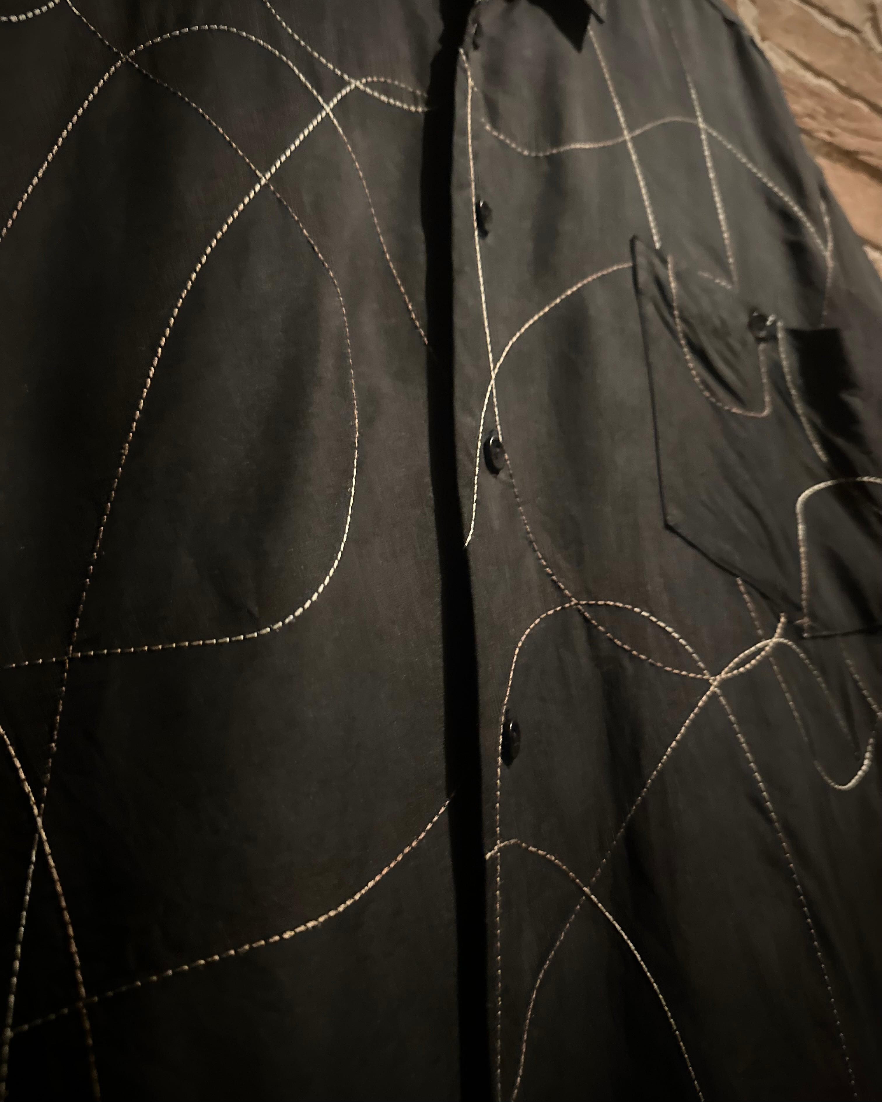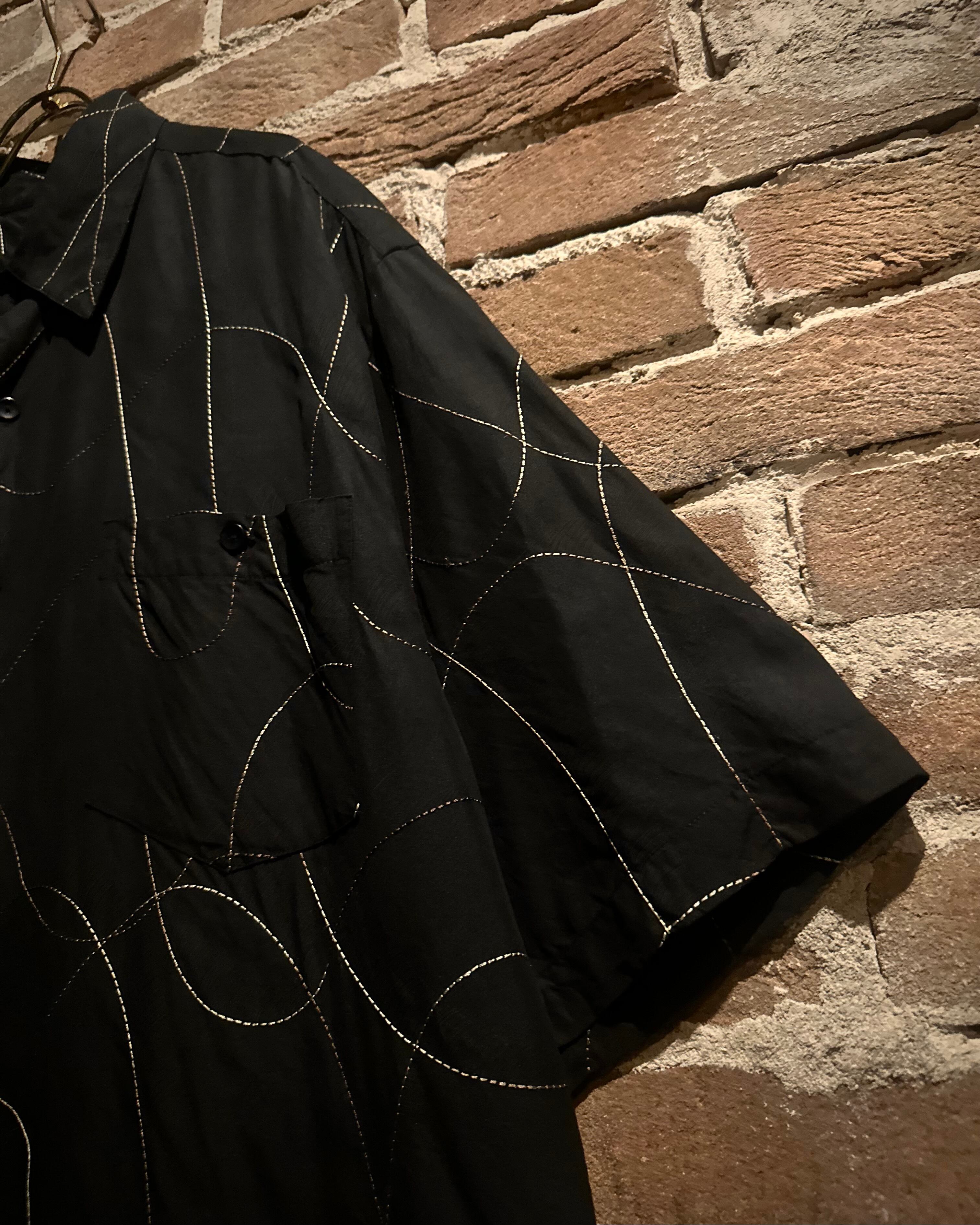 ブラックのボディをベースに、ステッチでラインのデザインを載せた半袖シャツ。