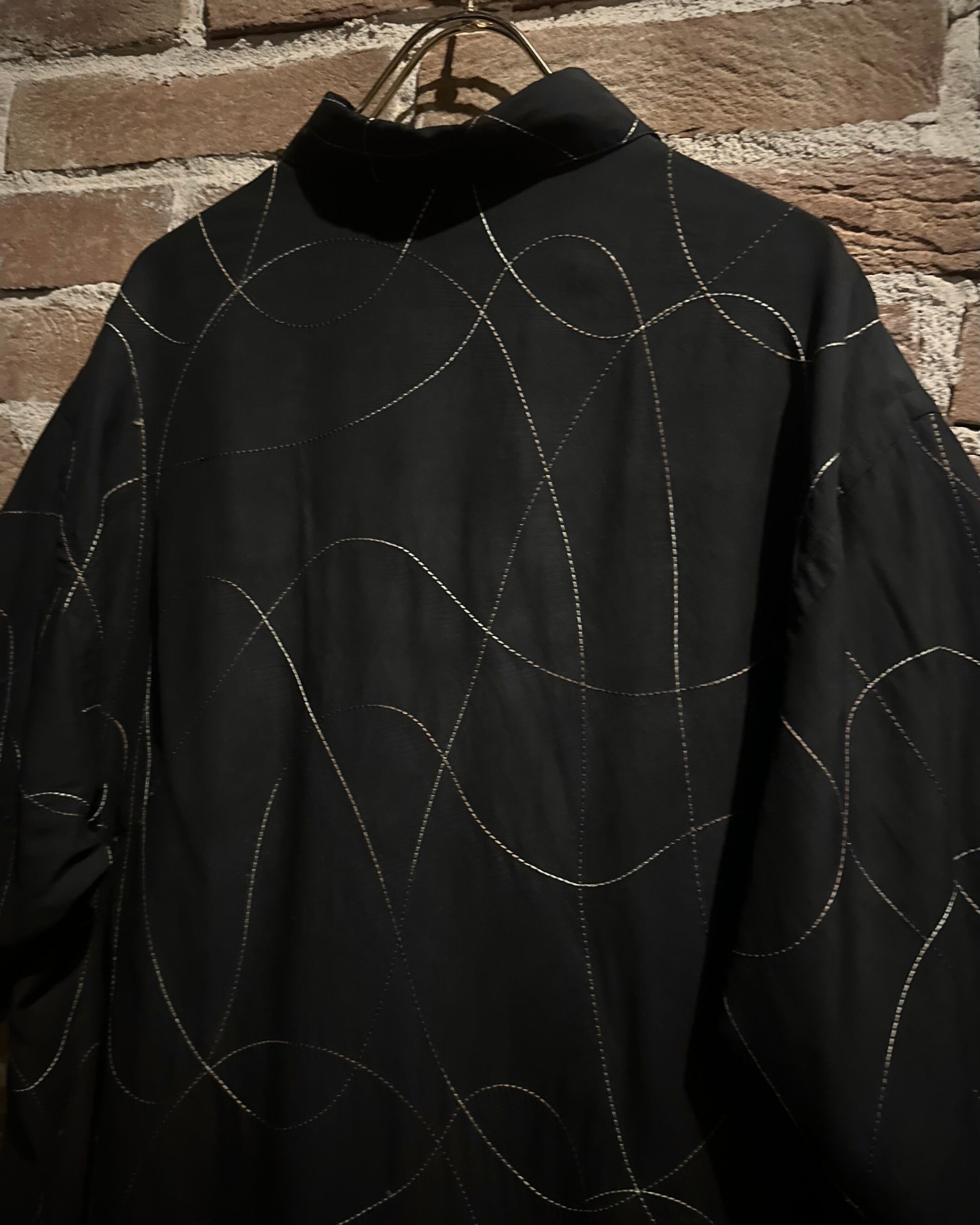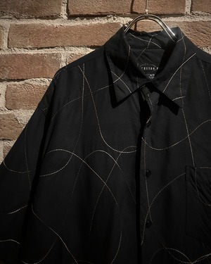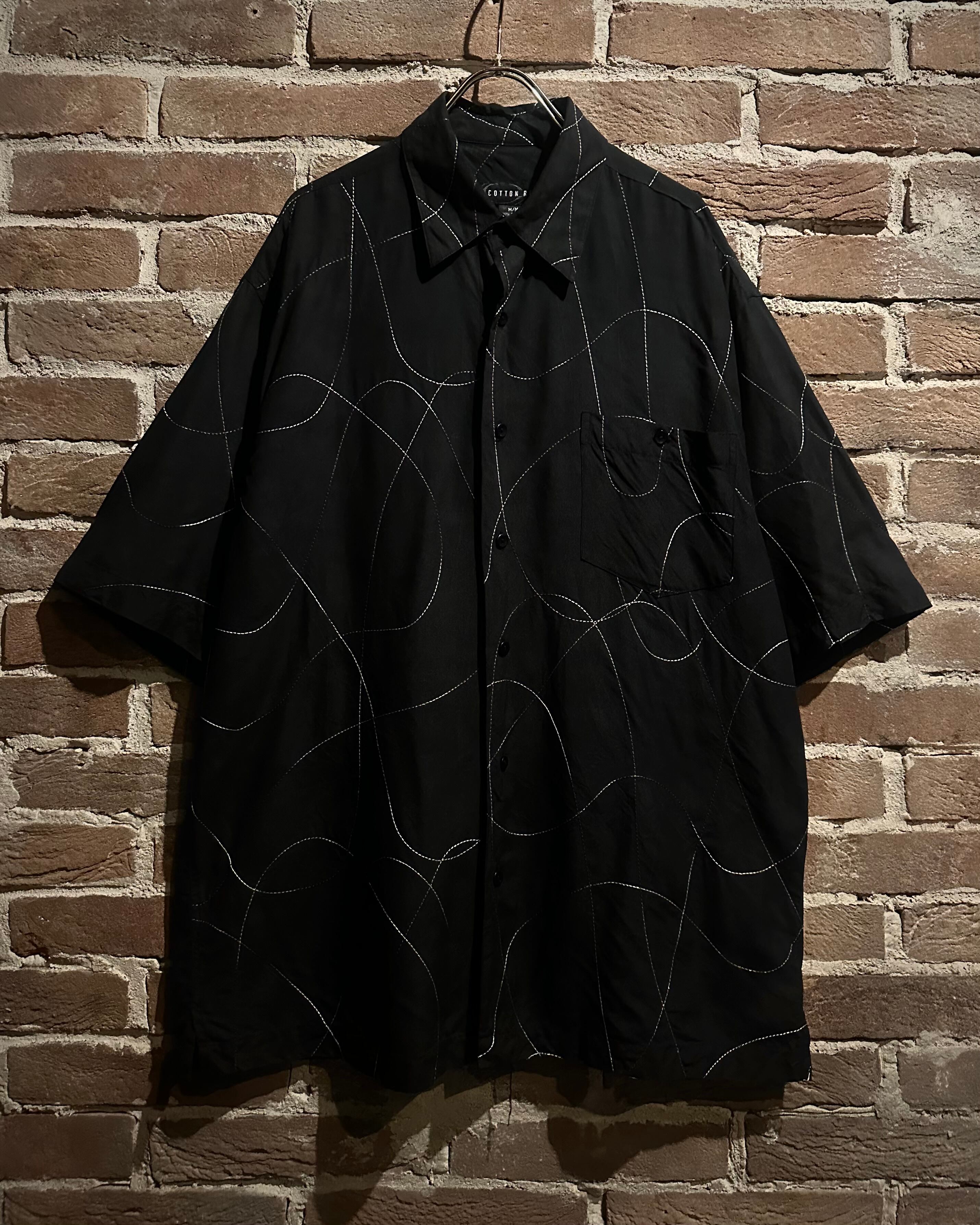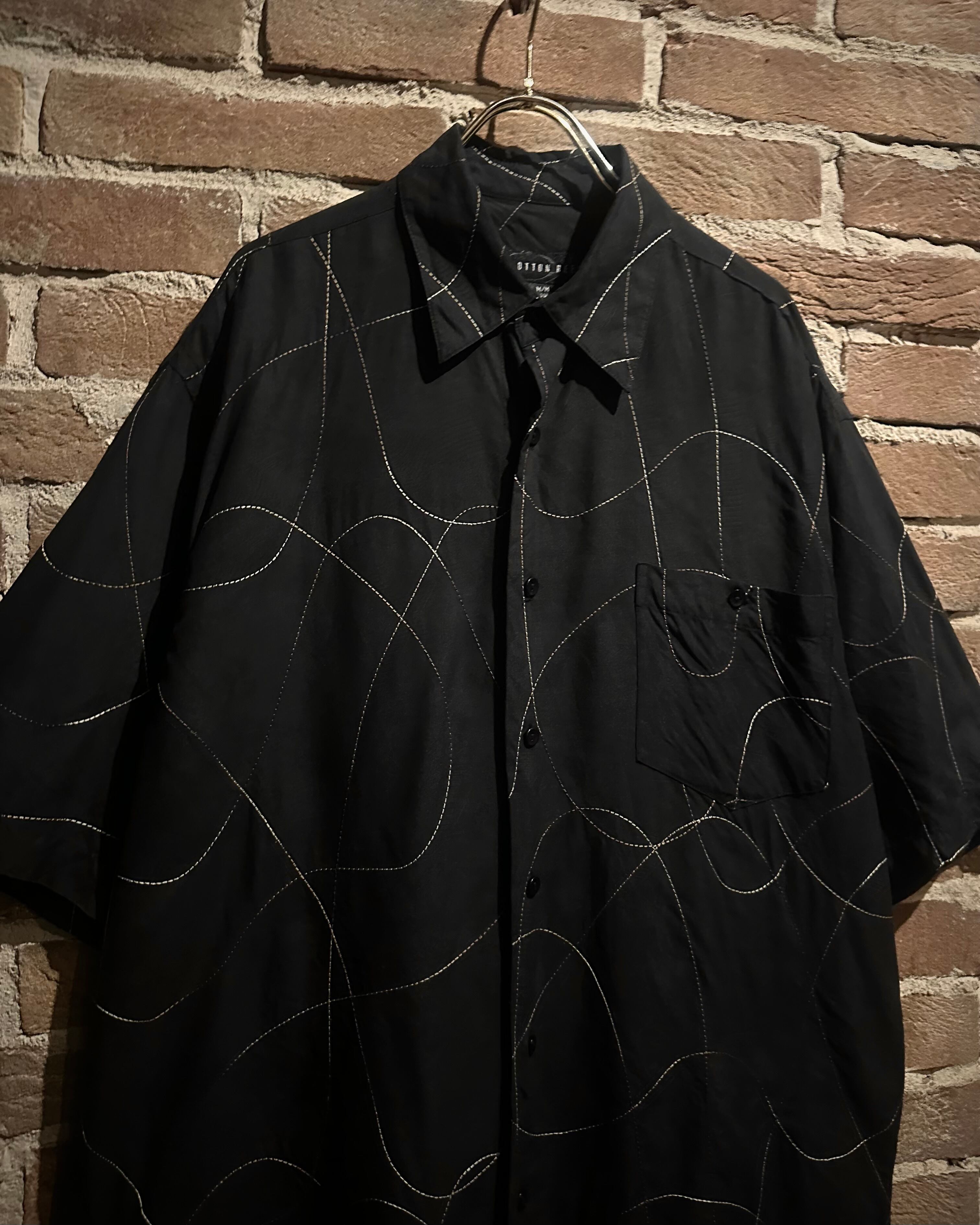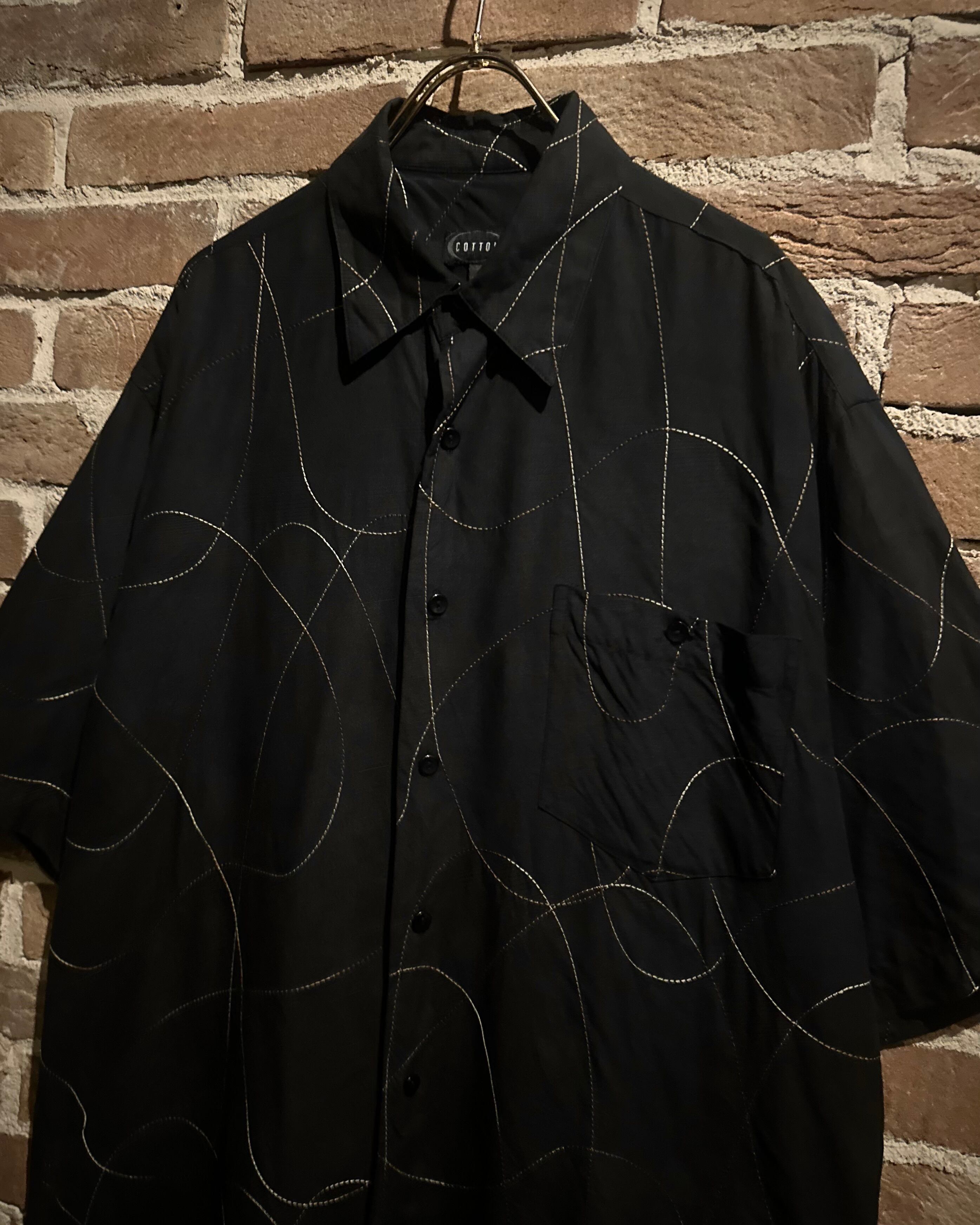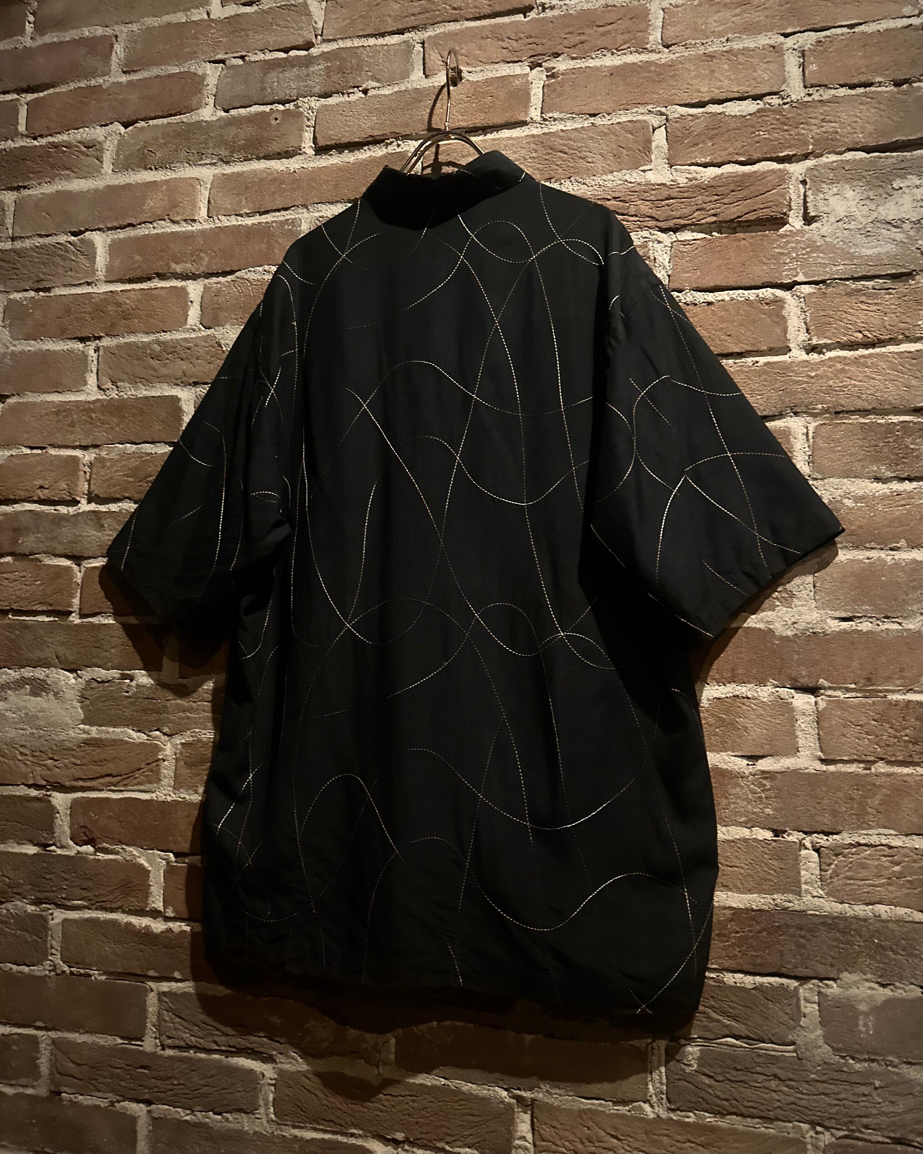 ブラックのボディをベースに、ステッチでラインのデザインを載せた半袖シャツ。