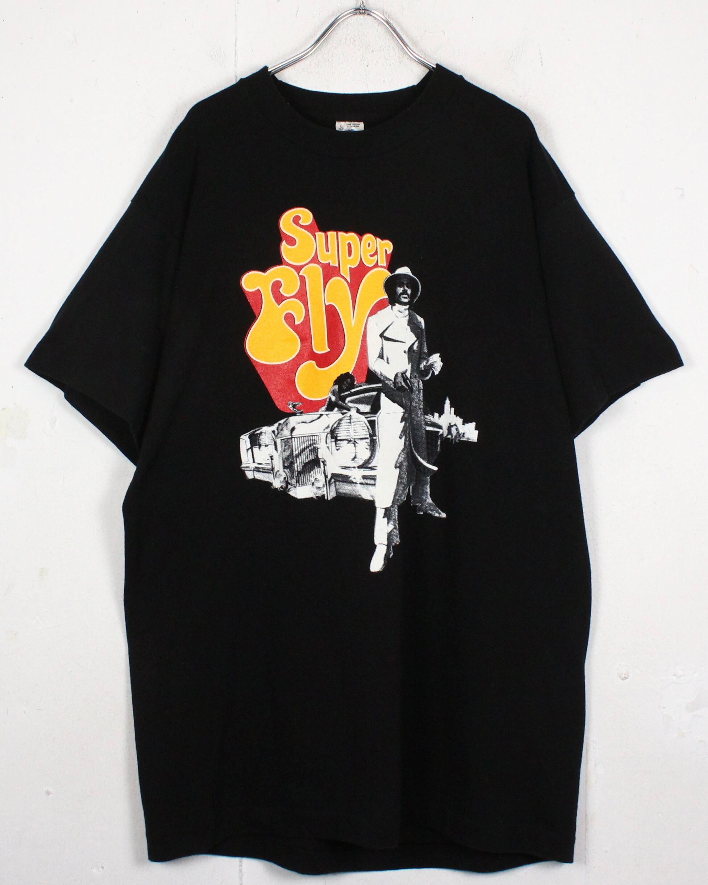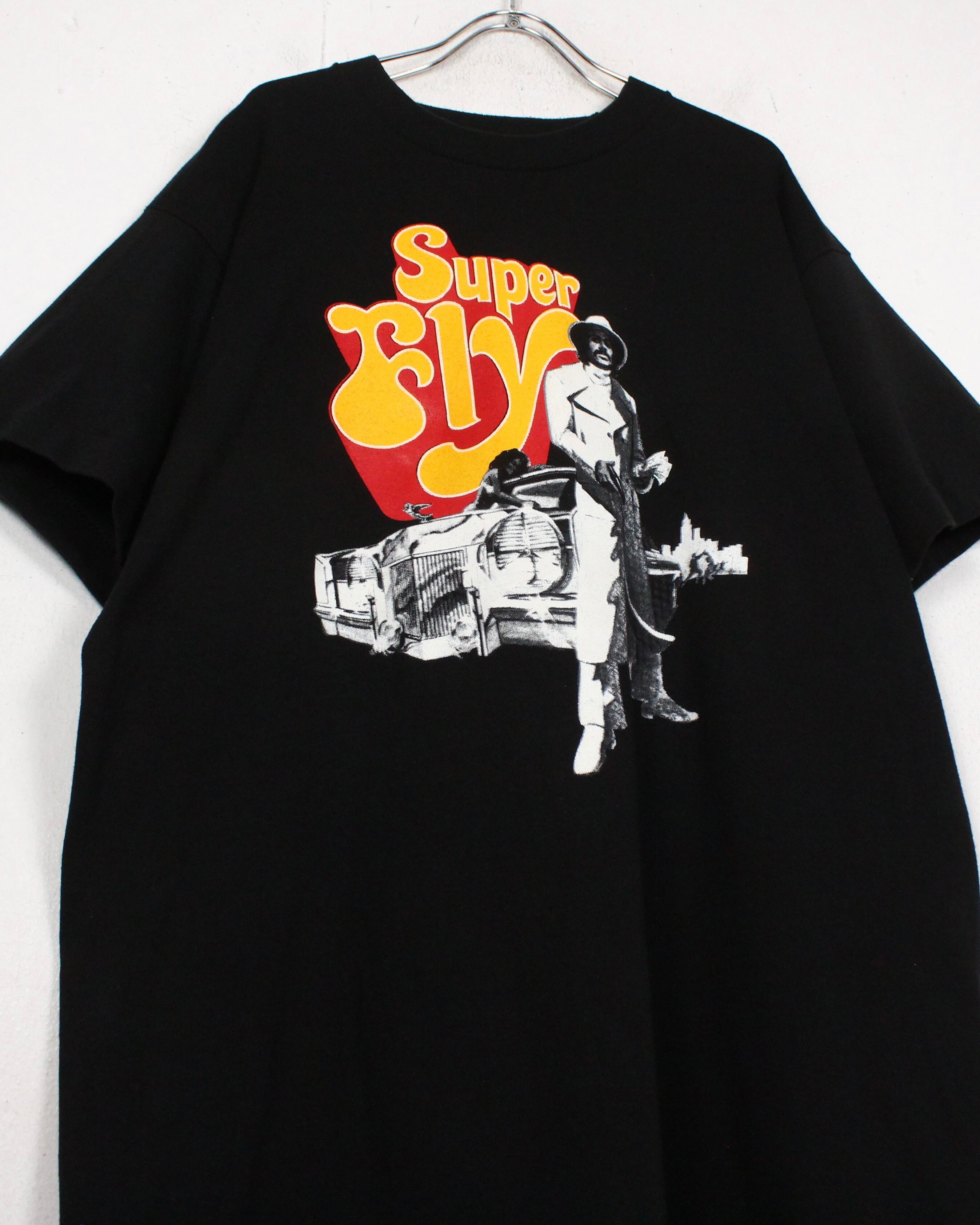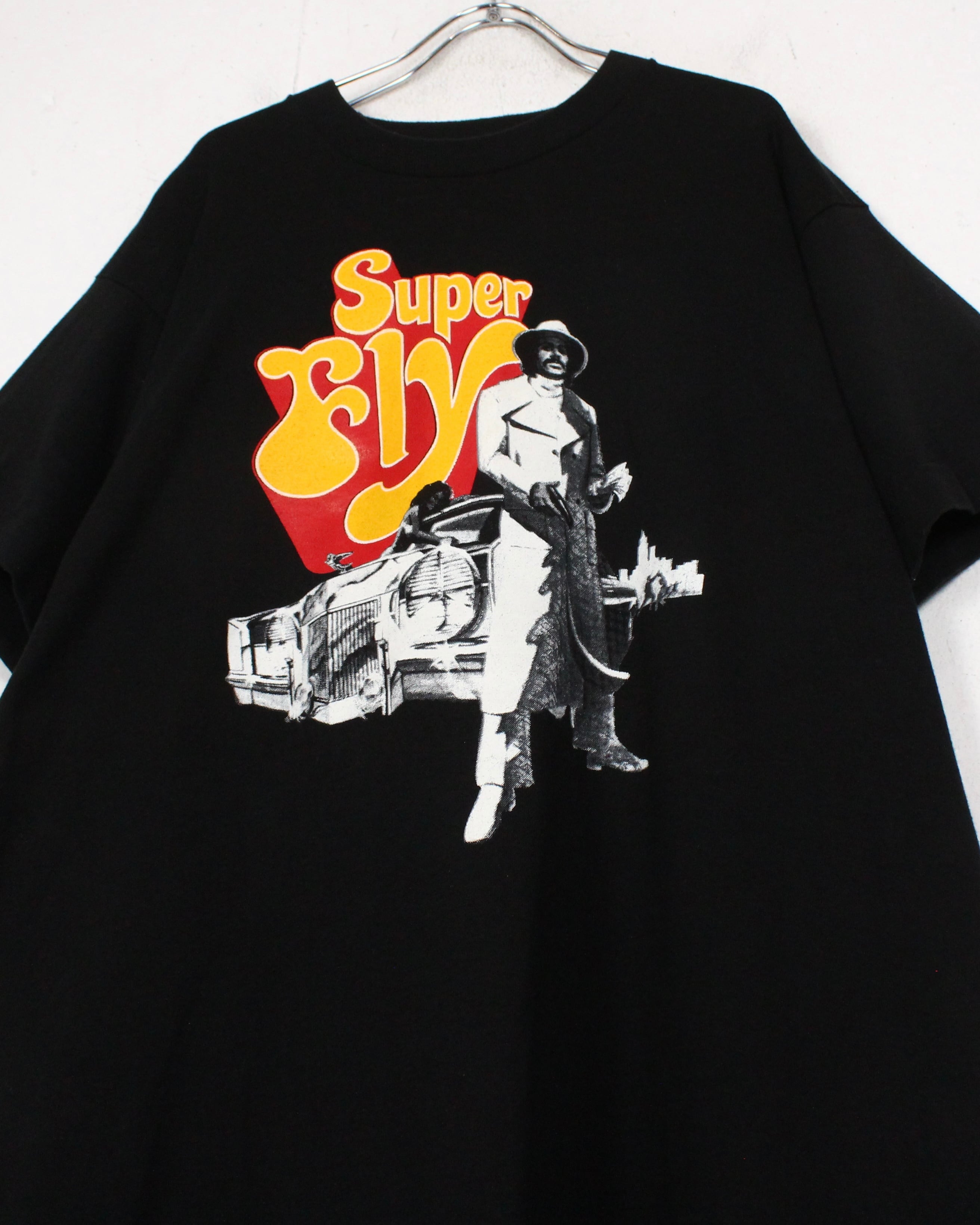 そんな超名作映画のプリントが施されたTシャツ。ブラックのボディに主人公であるロンオニール演じるプリーストを、年代感じる白黒のプリントと、キャッチーなカラーリングで"SuperFly"の題名を配した1着。