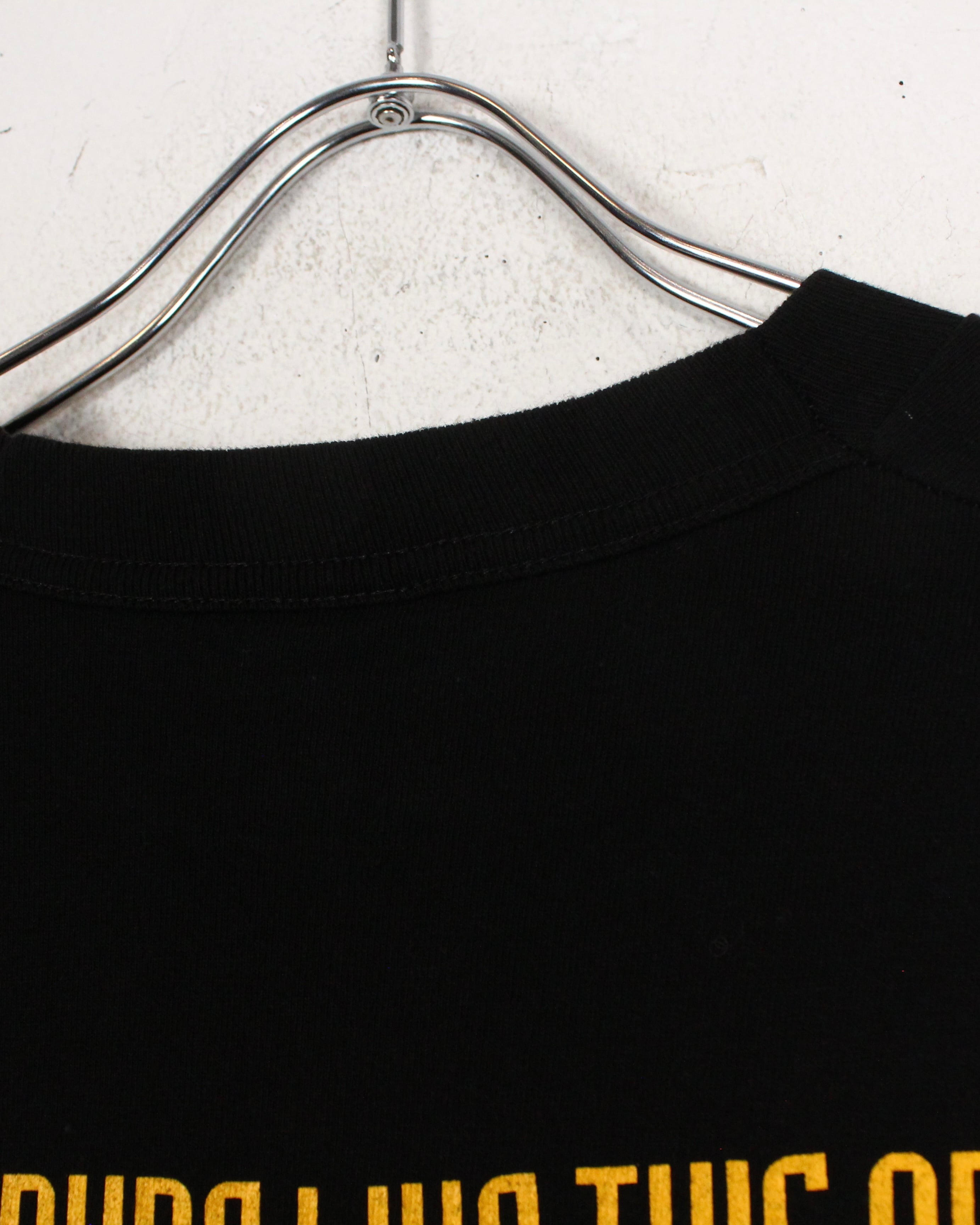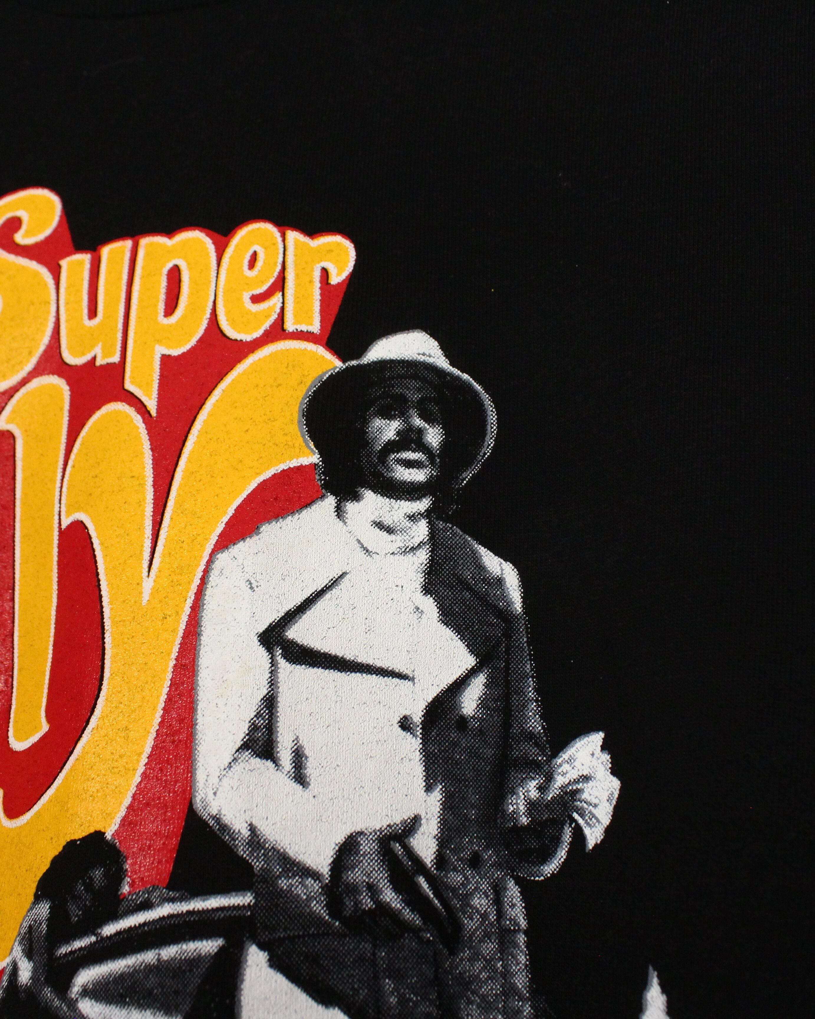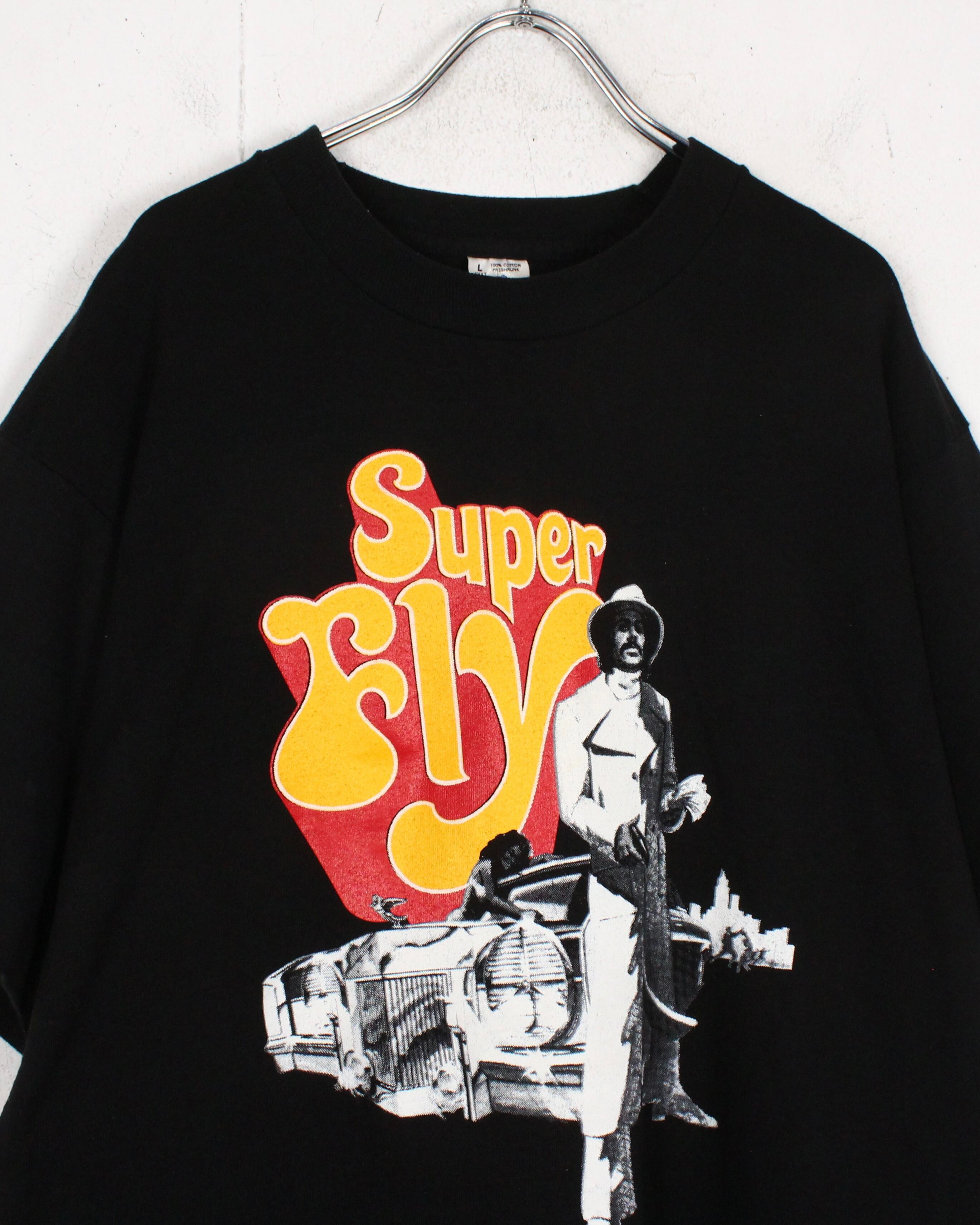 そんな超名作映画のプリントが施されたTシャツ。ブラックのボディに主人公であるロンオニール演じるプリーストを、年代感じる白黒のプリントと、キャッチーなカラーリングで"SuperFly"の題名を配した1着。