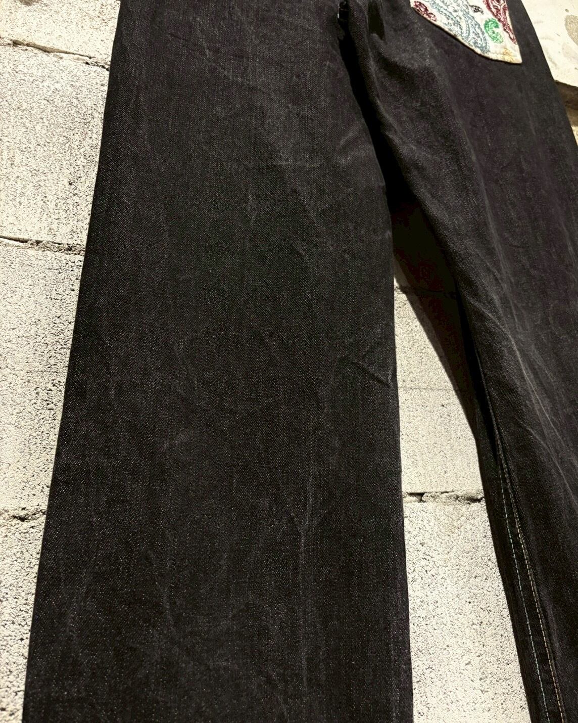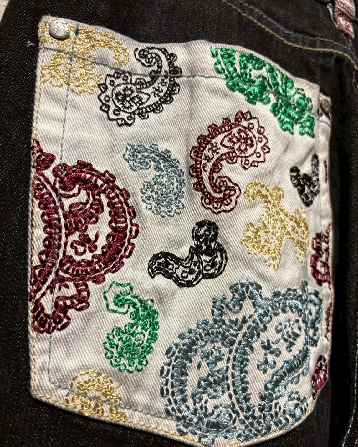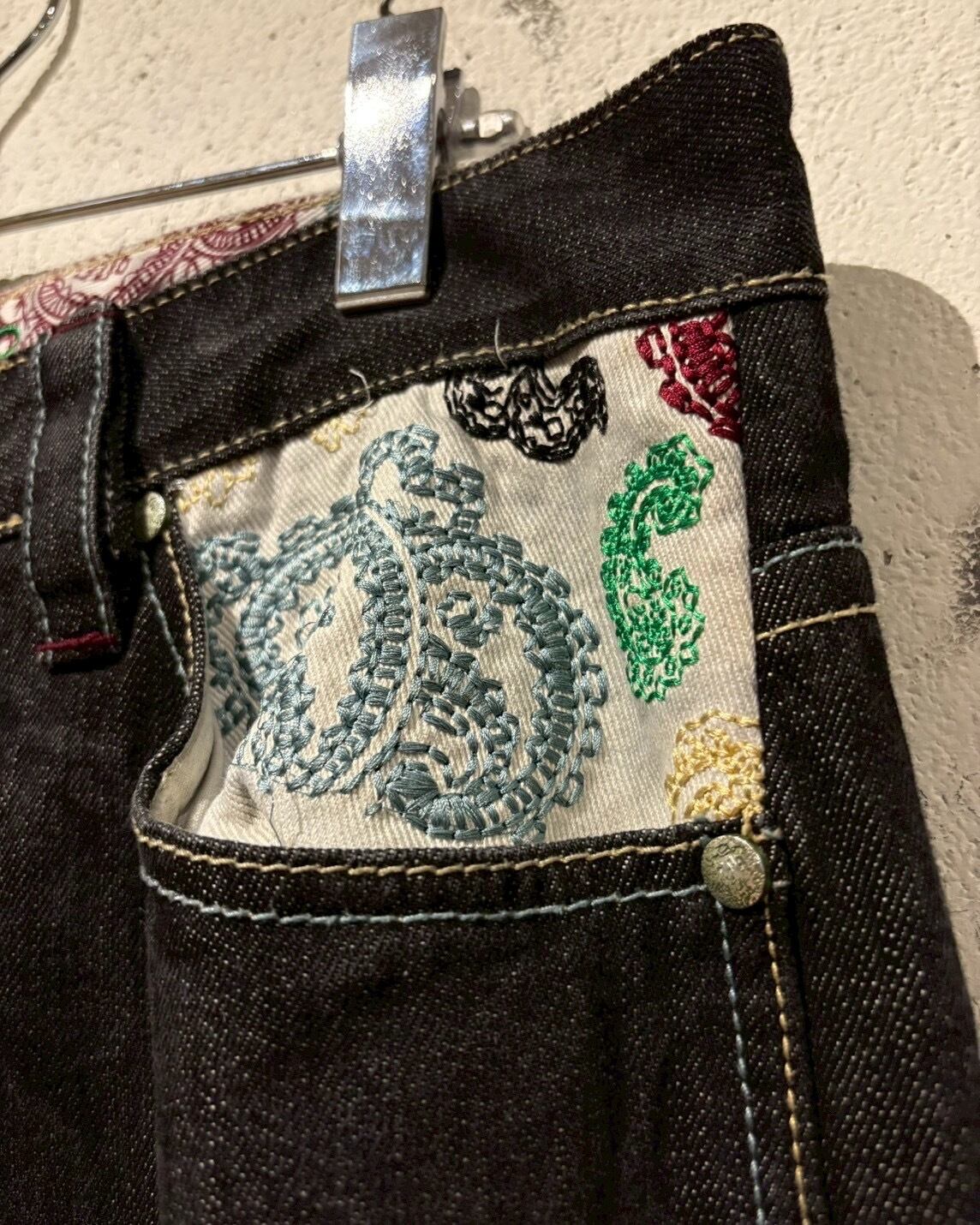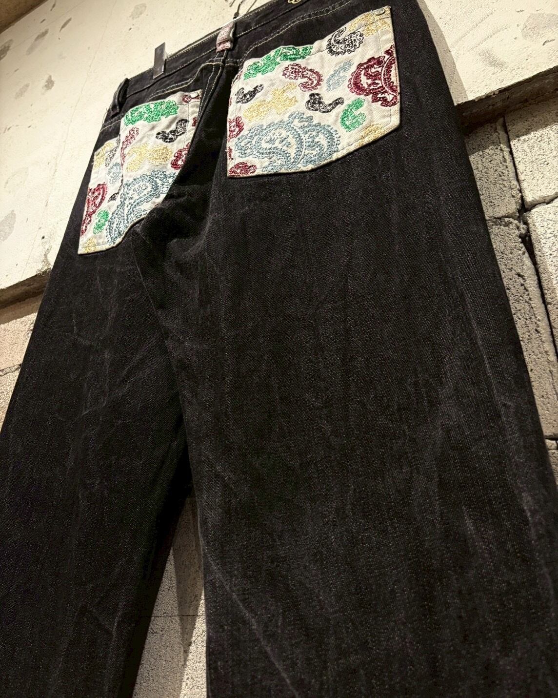 古着業界でも稀少性が高まったブラックデニムのボディに、フロントポケット、バックポケットにホワイトデニムを切り替え、ペイズリー柄の刺繍を刻んだ1着。