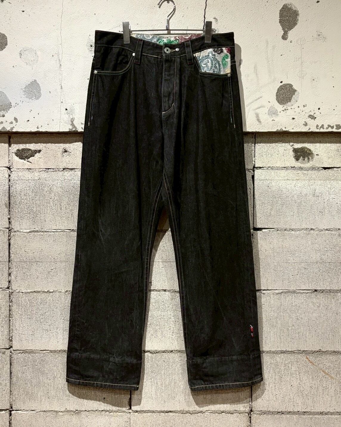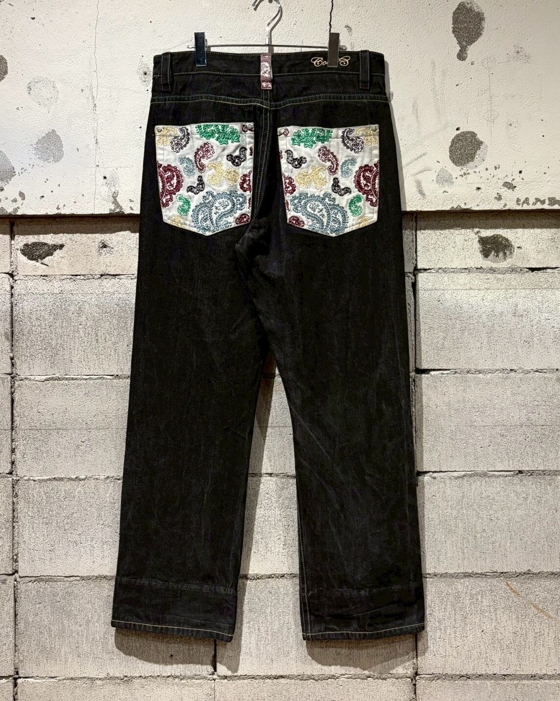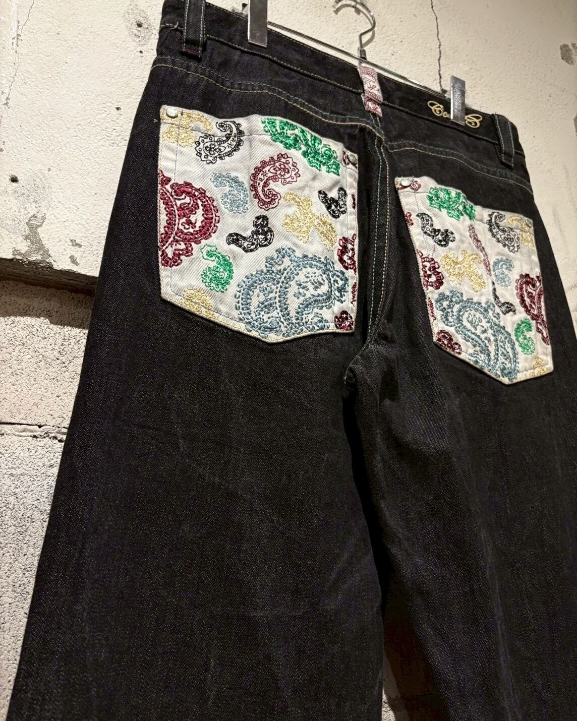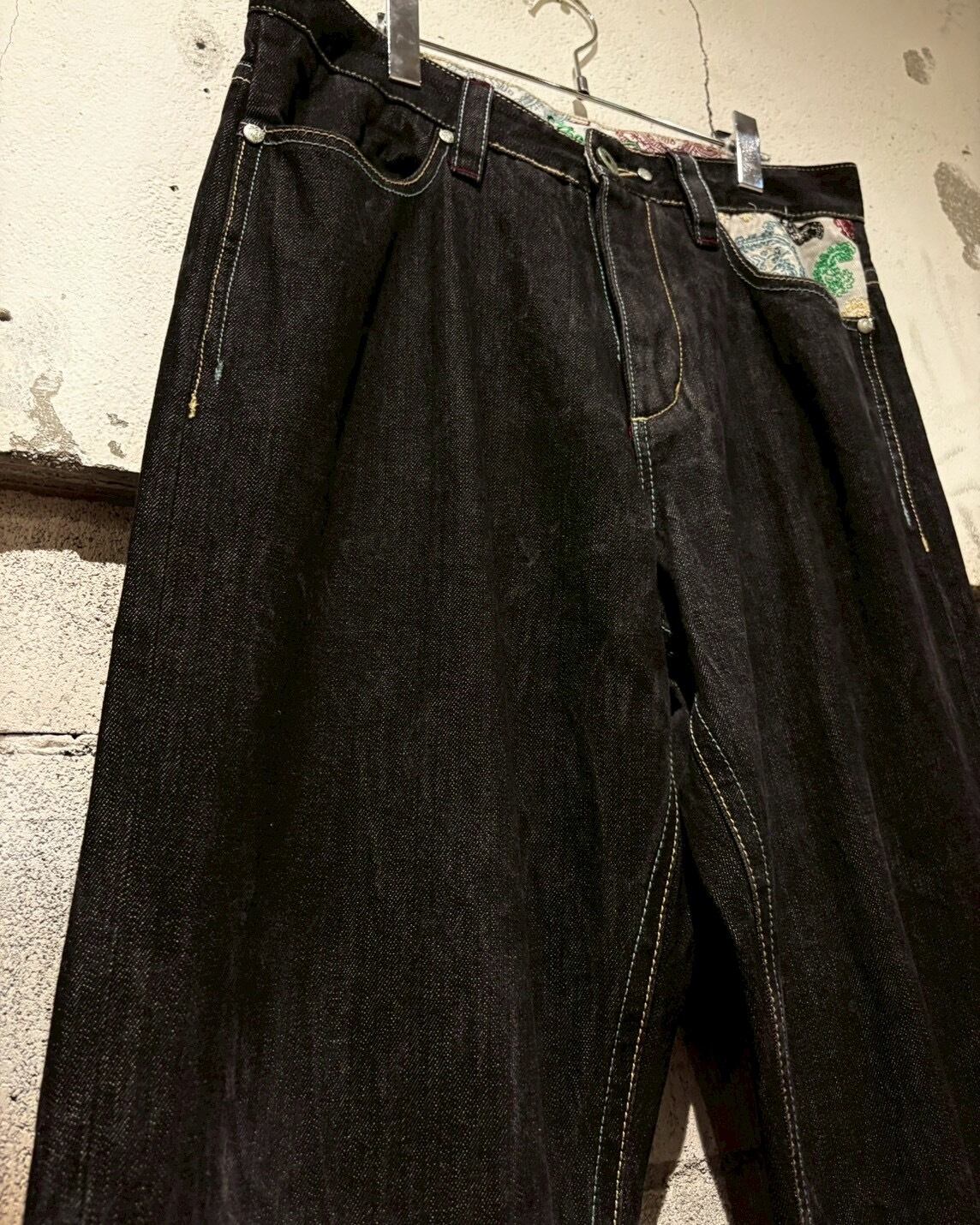古着業界でも稀少性が高まったブラックデニムのボディに、フロントポケット、バックポケットにホワイトデニムを切り替え、ペイズリー柄の刺繍を刻んだ1着。