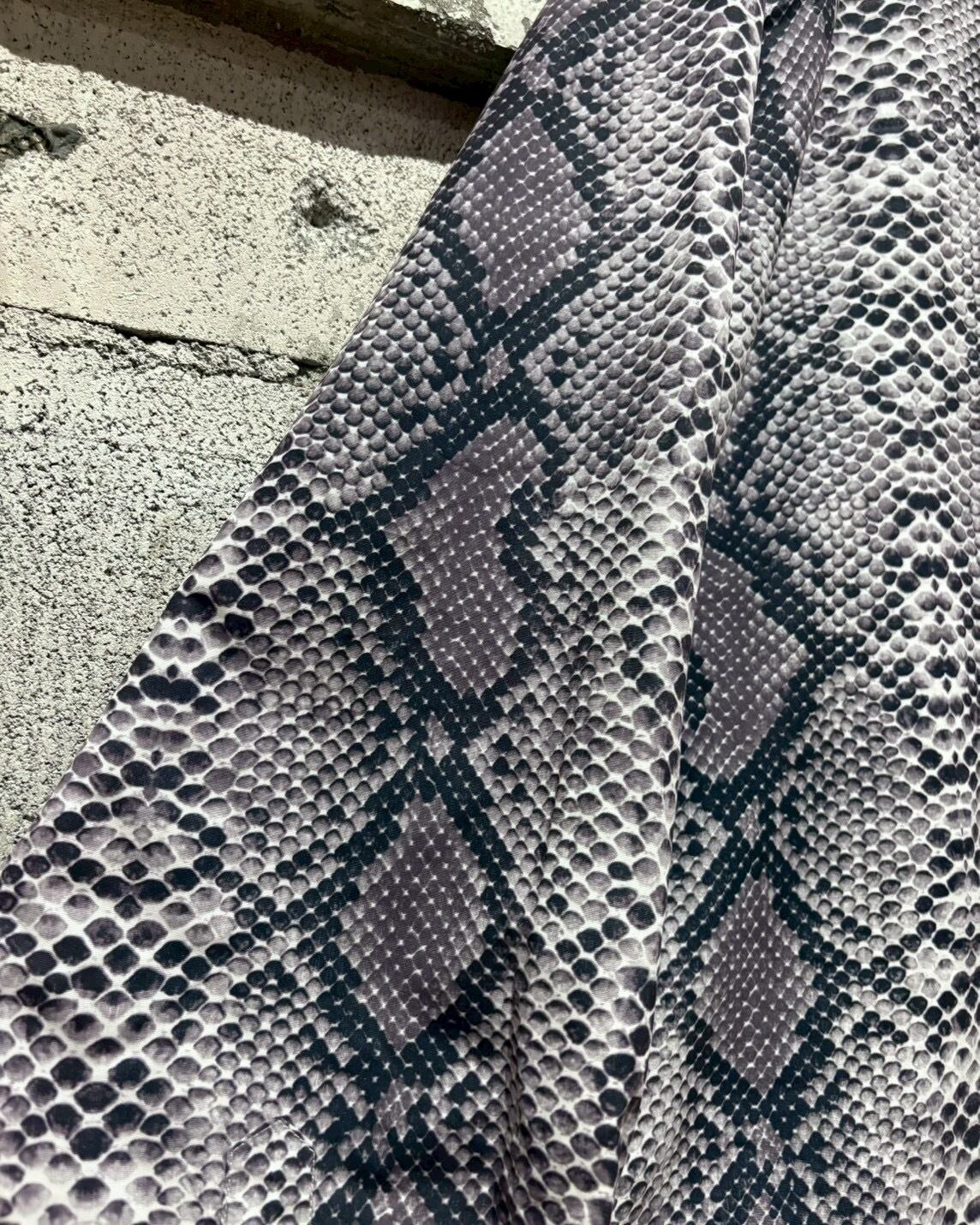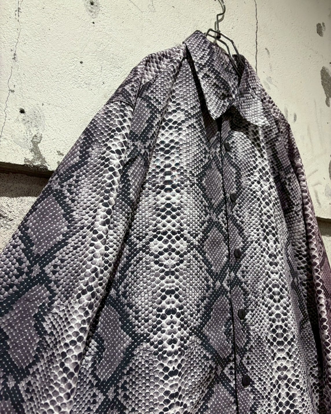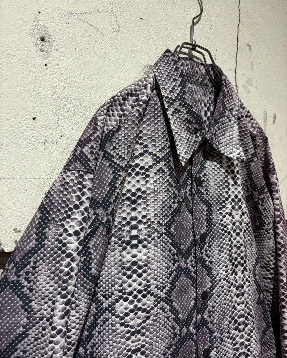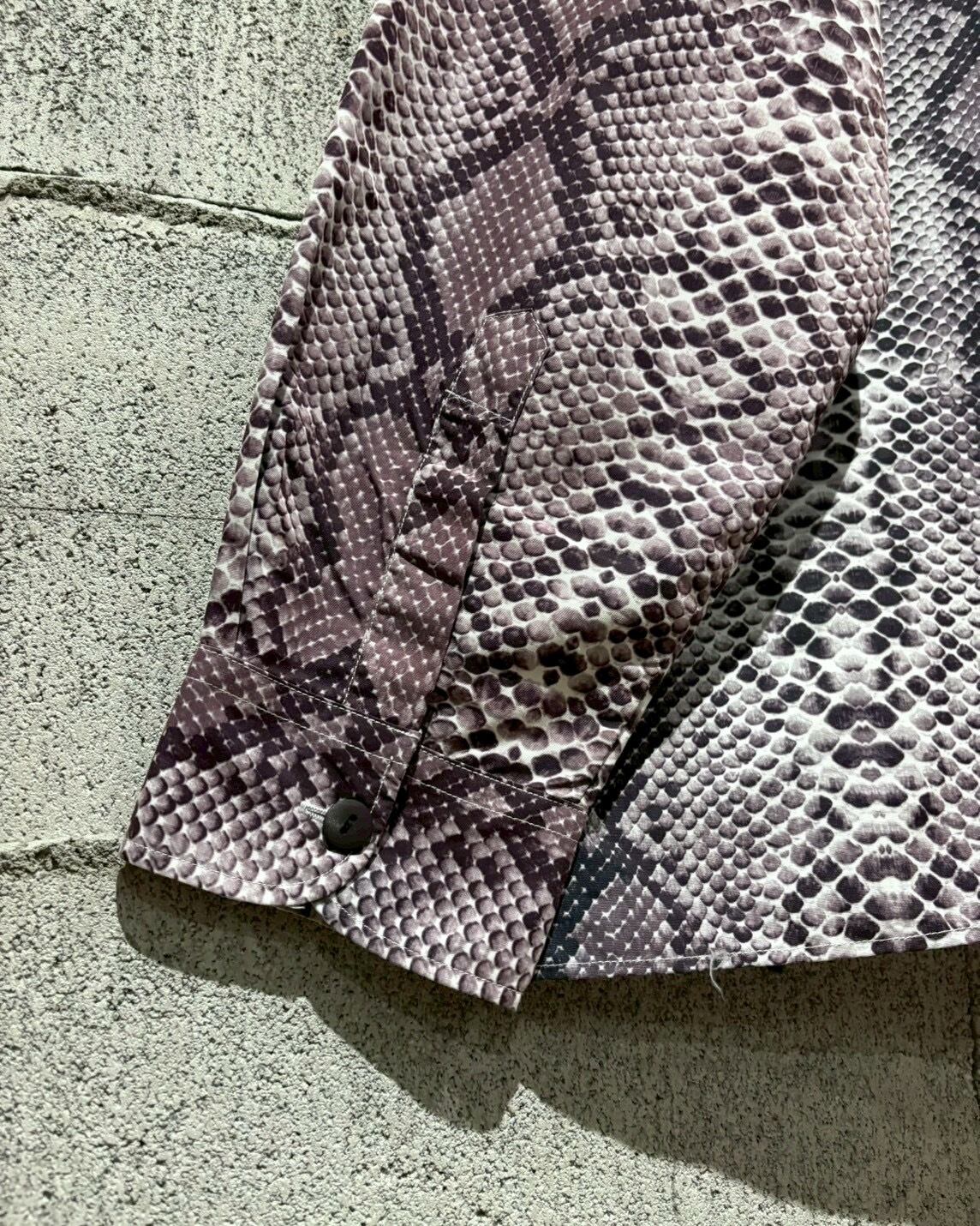ハリとコシのあるポリのボディに、パイソン柄を乗せた長袖シャツ。