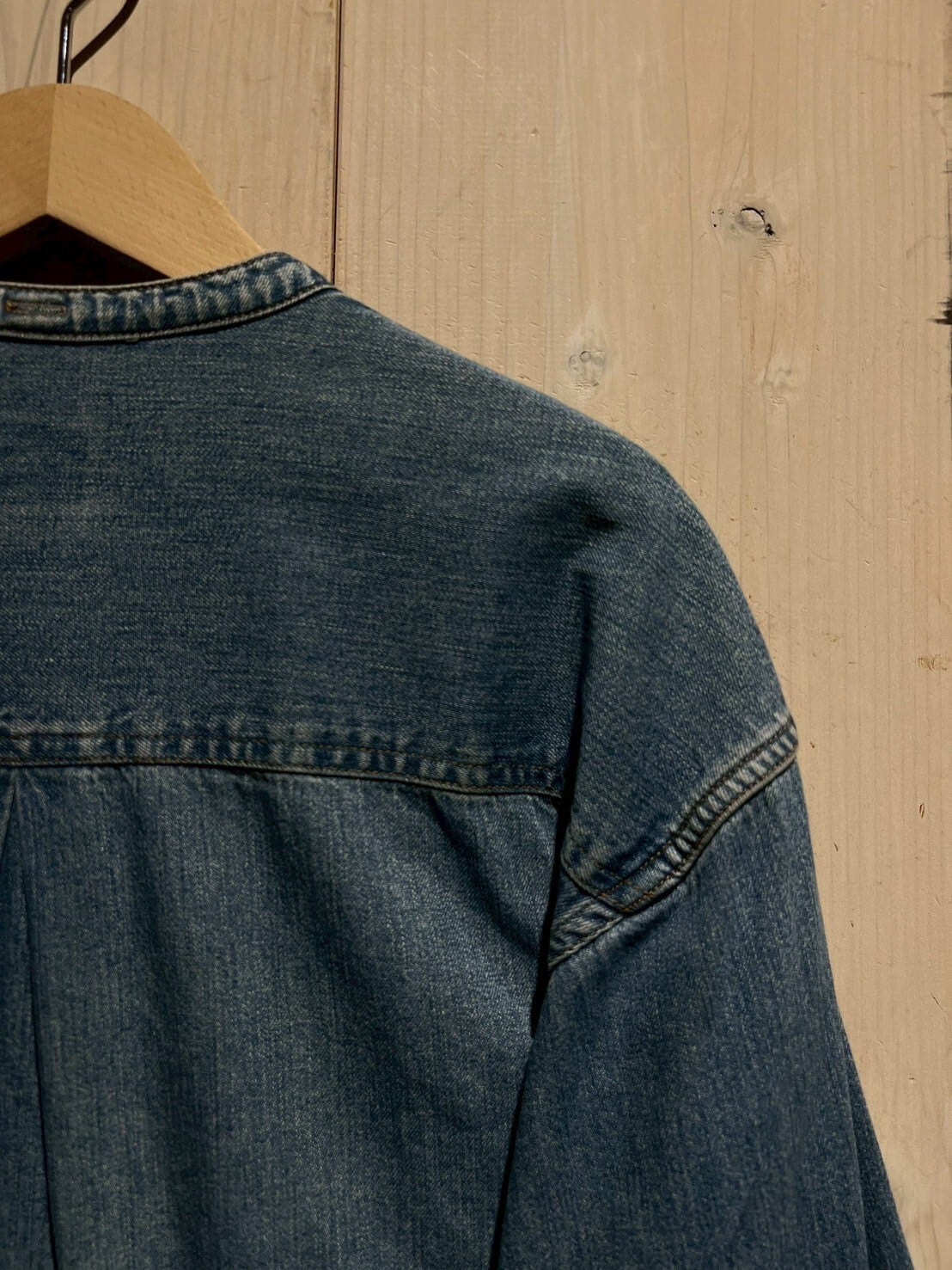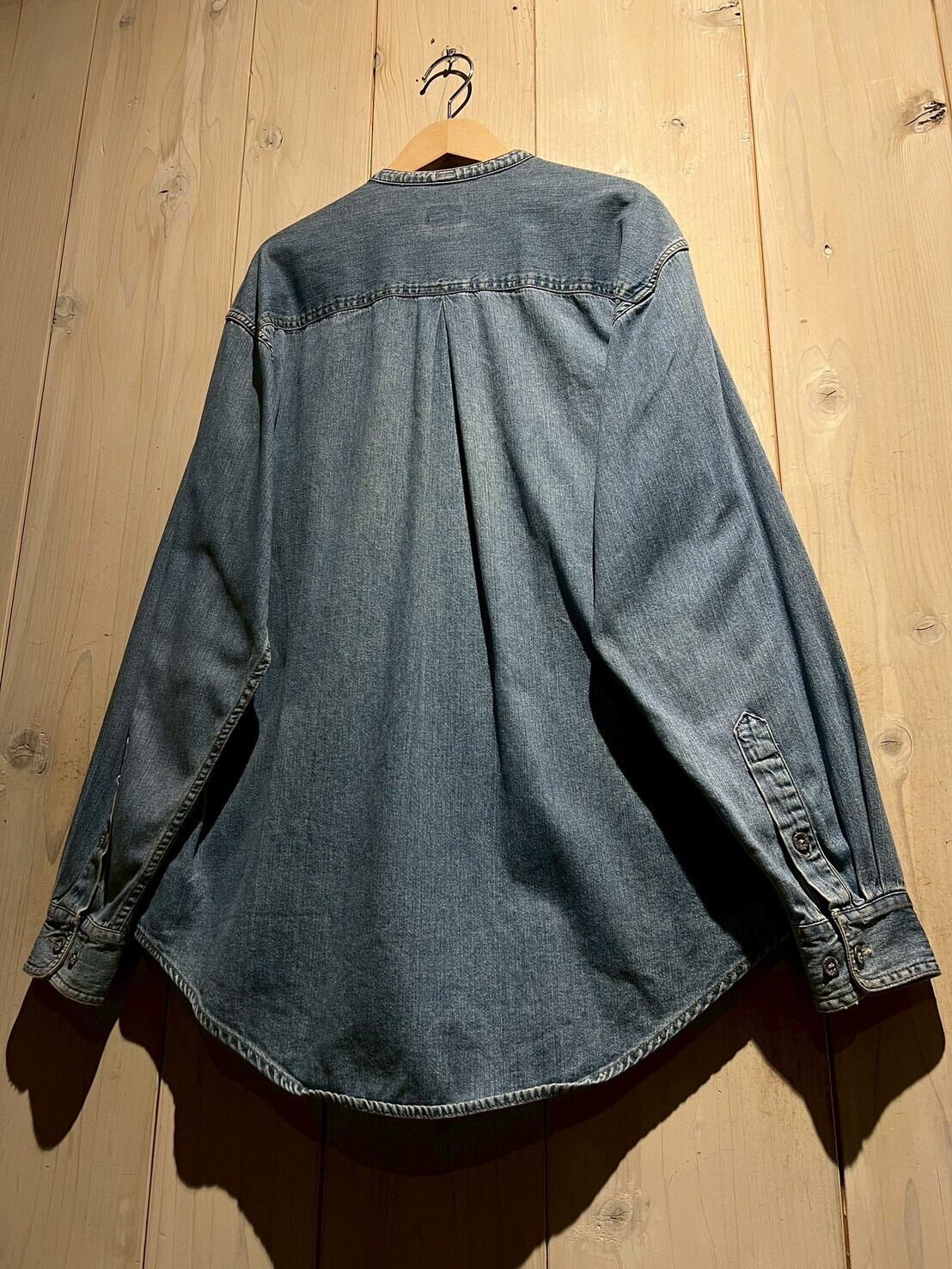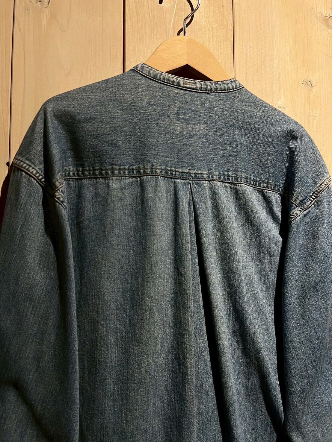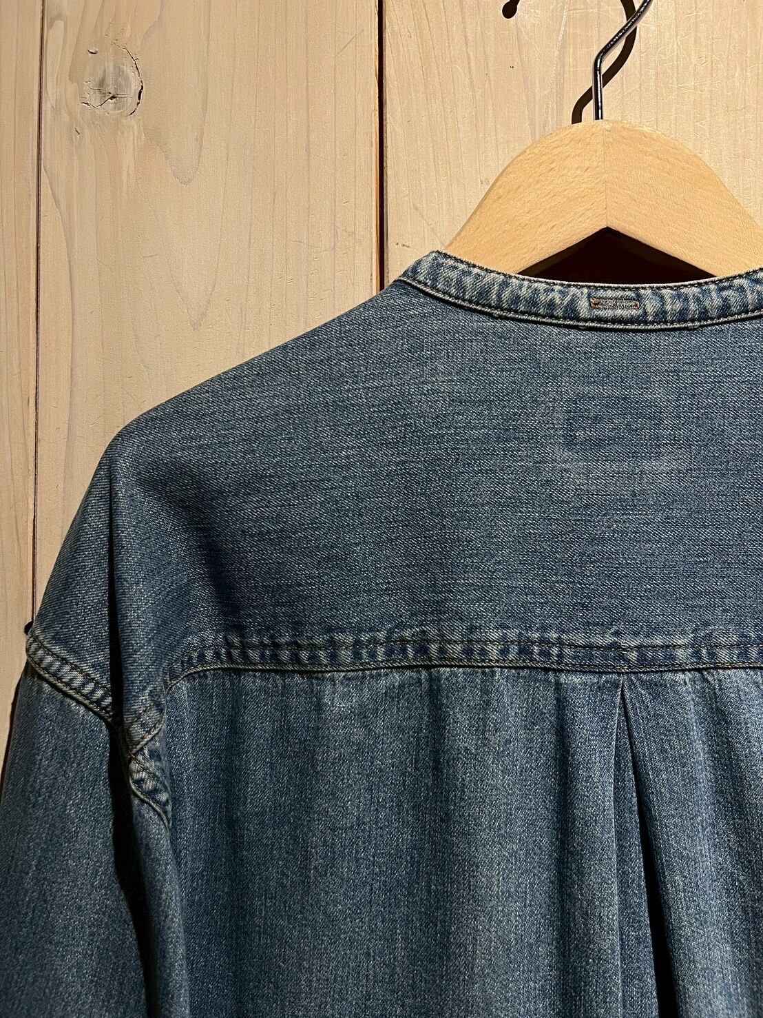 両胸ポケットに、左側にはブランドロゴパッチ。首元がバンドカラーで仕上げられているので、デニムの無骨さが緩和され、カジュアルさが引き立てられています。