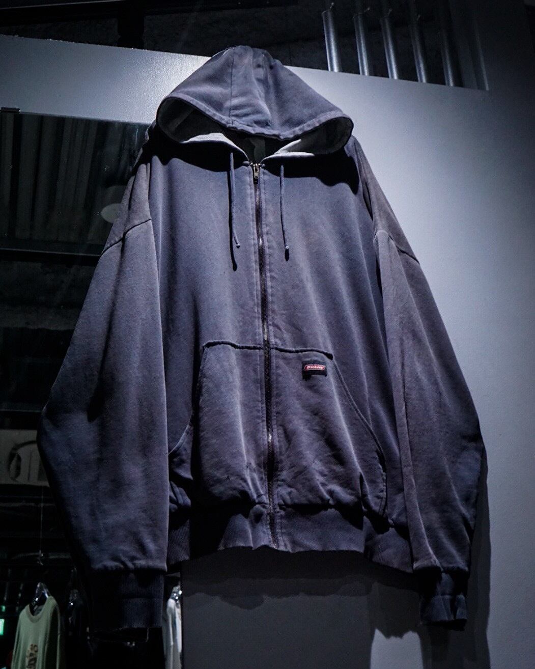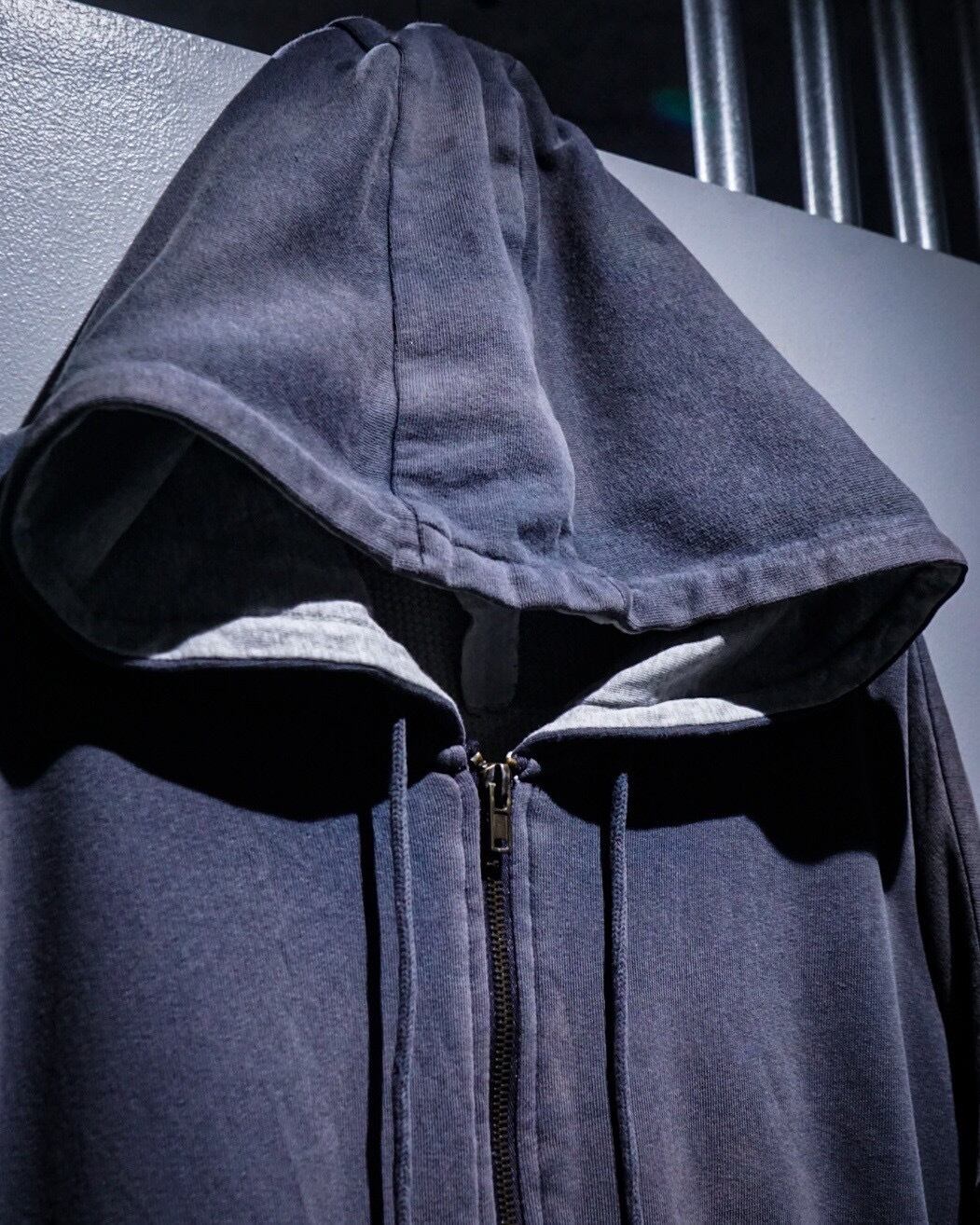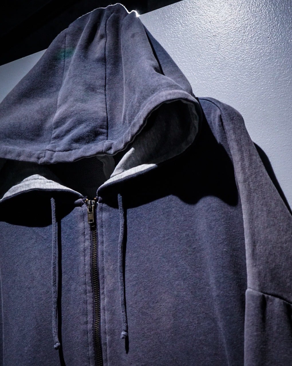 フェード感の素晴らしいネイビーのスウェット地のボディに、ボロ、エイジングの渋さが載せられたジップアップフーディ。