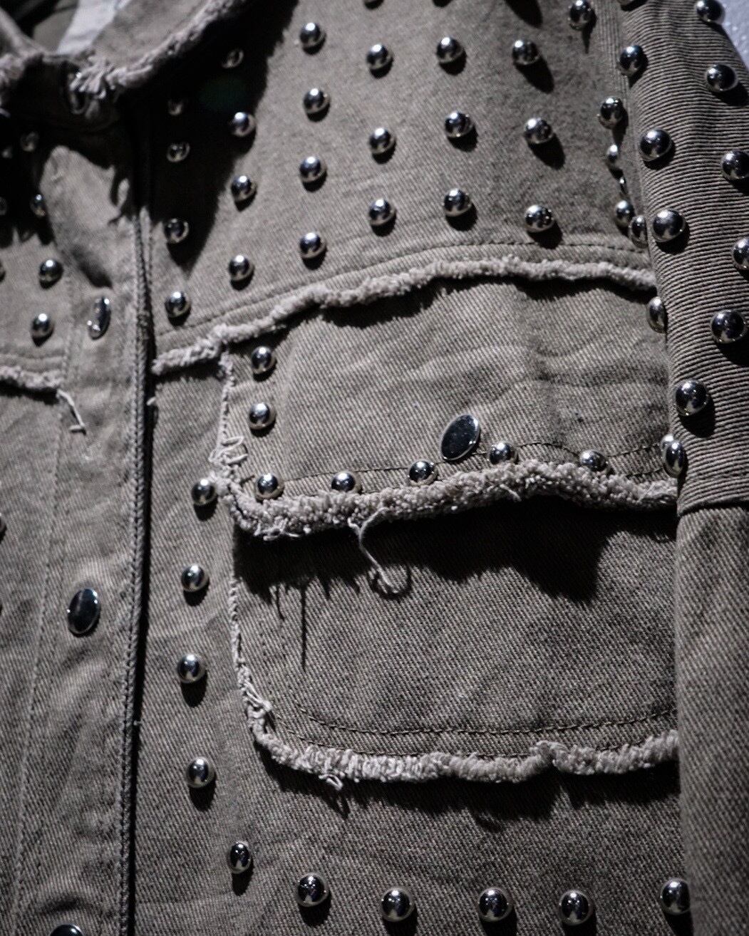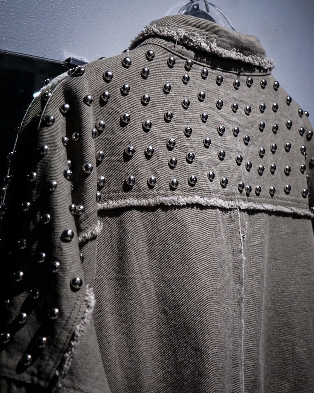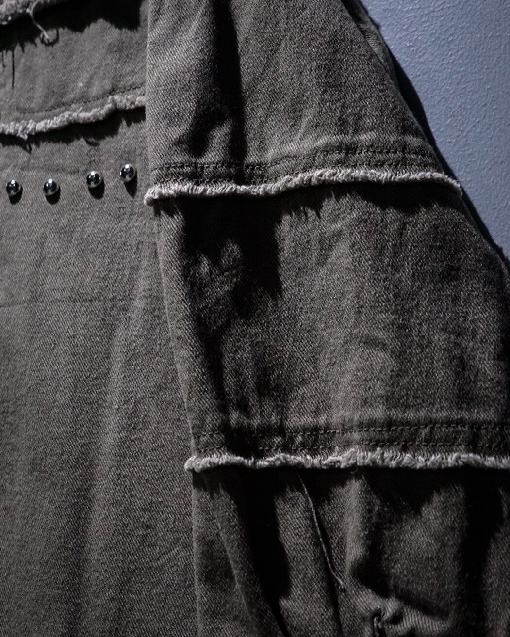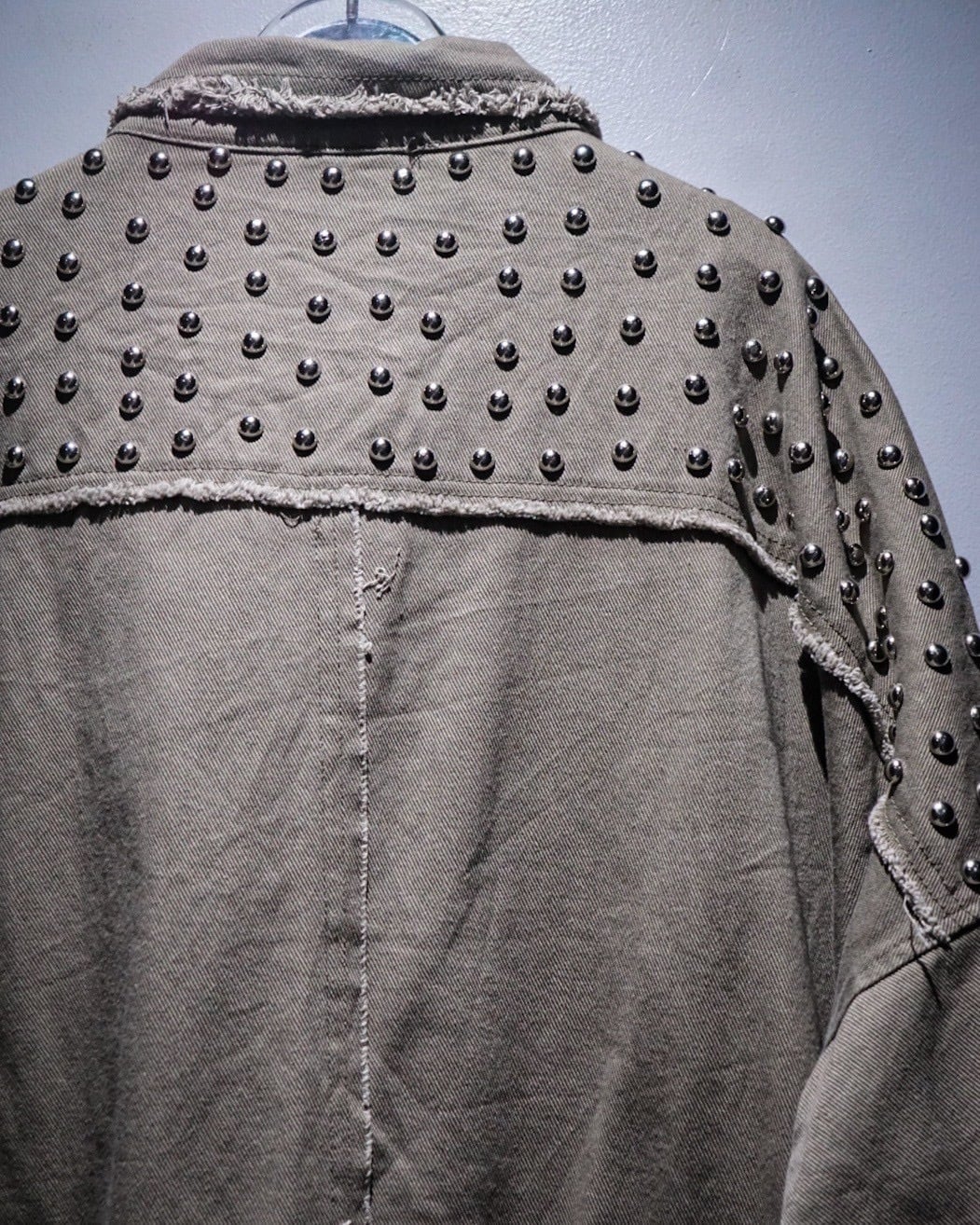立体的かつボリューミーなインサイドアウトに加えて、輝きのある大ぶりなスタッズを半身に追加。生地を切りっぱなしにし、着用を重ねる事で生まれる自然なほつれがアイテムの表情により一層深みをもたらせてくれます。