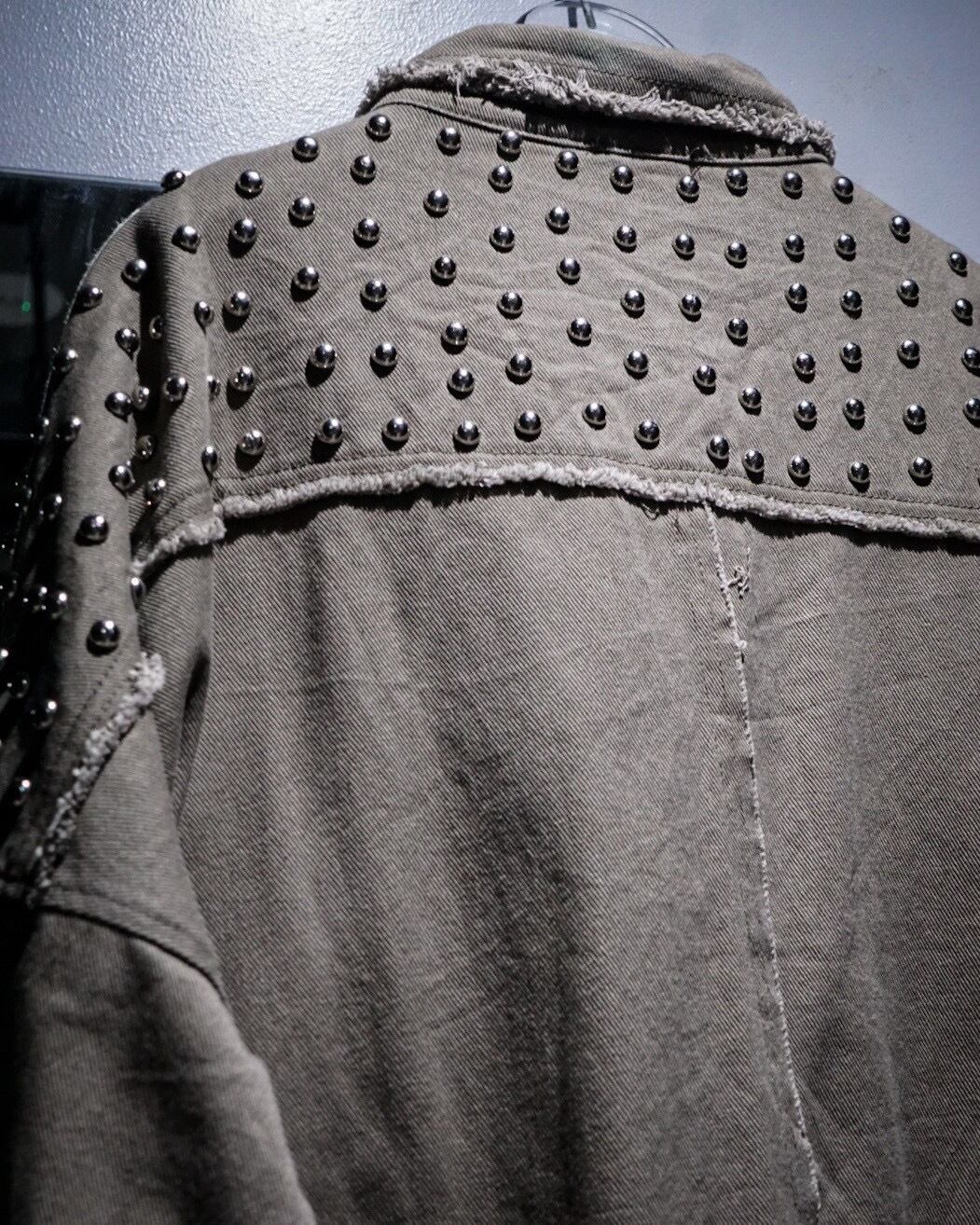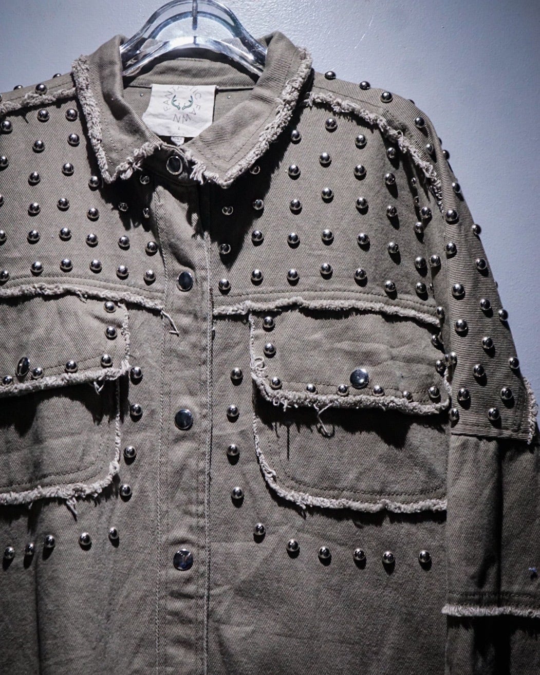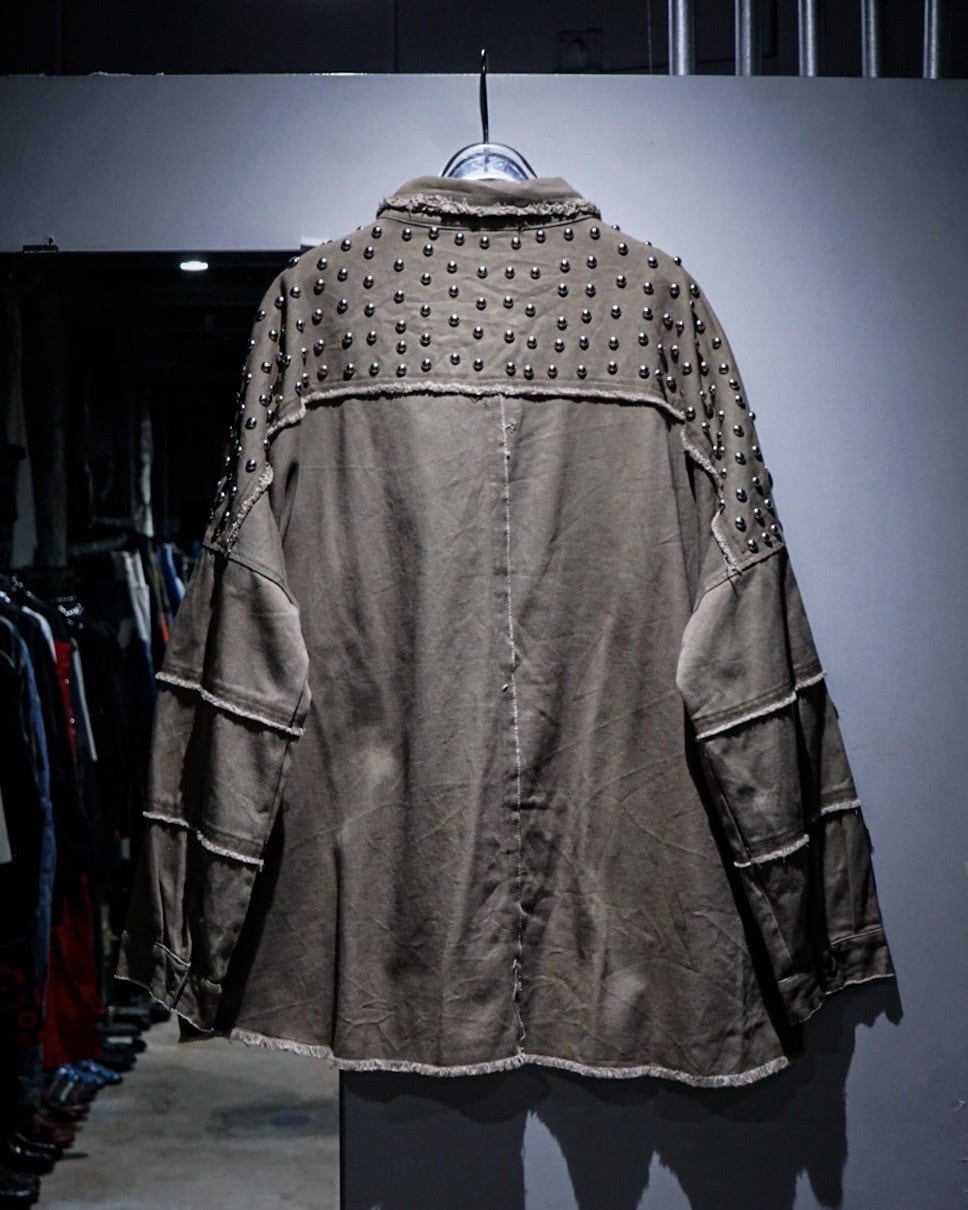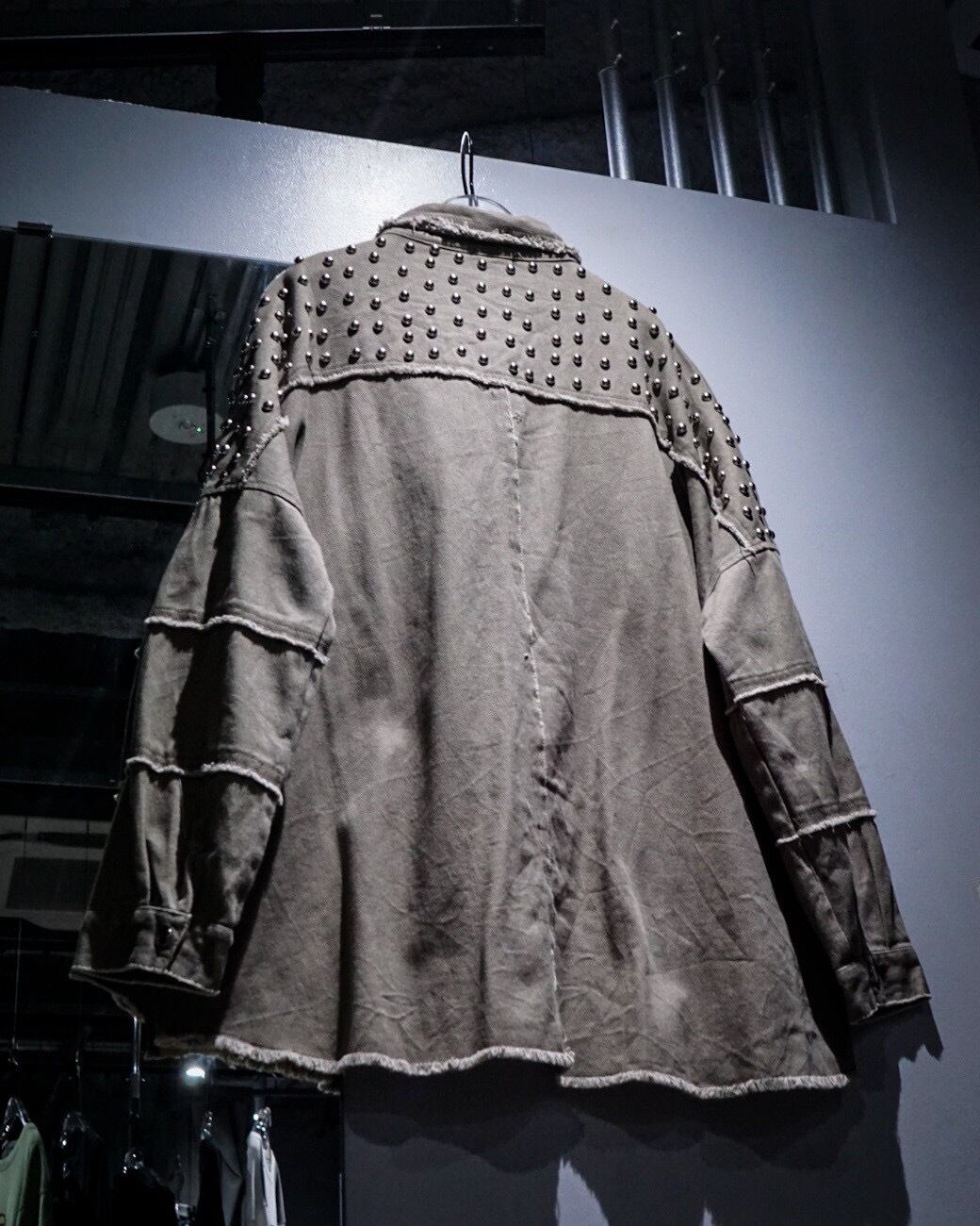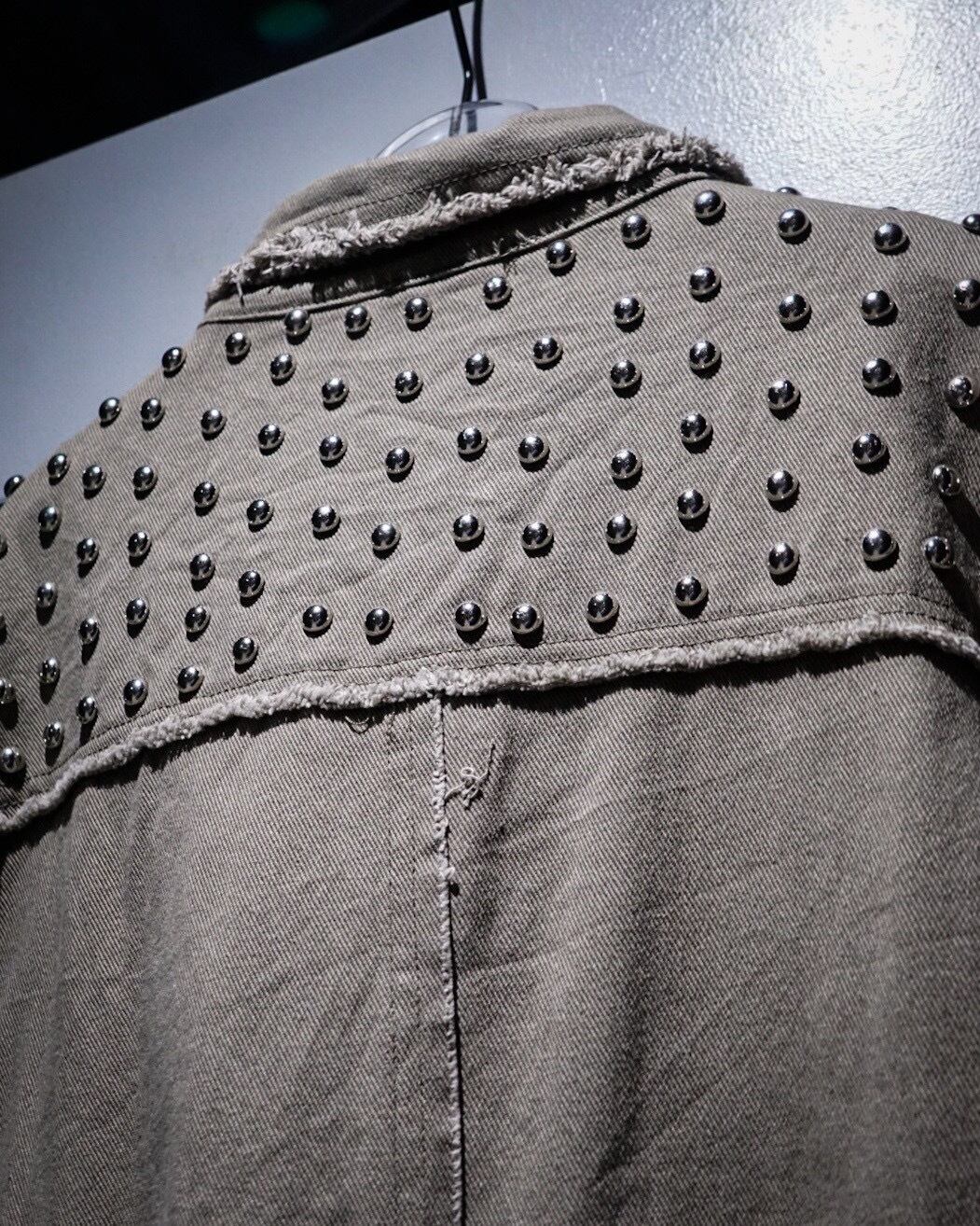 立体的かつボリューミーなインサイドアウトに加えて、輝きのある大ぶりなスタッズを半身に追加。生地を切りっぱなしにし、着用を重ねる事で生まれる自然なほつれがアイテムの表情により一層深みをもたらせてくれます。