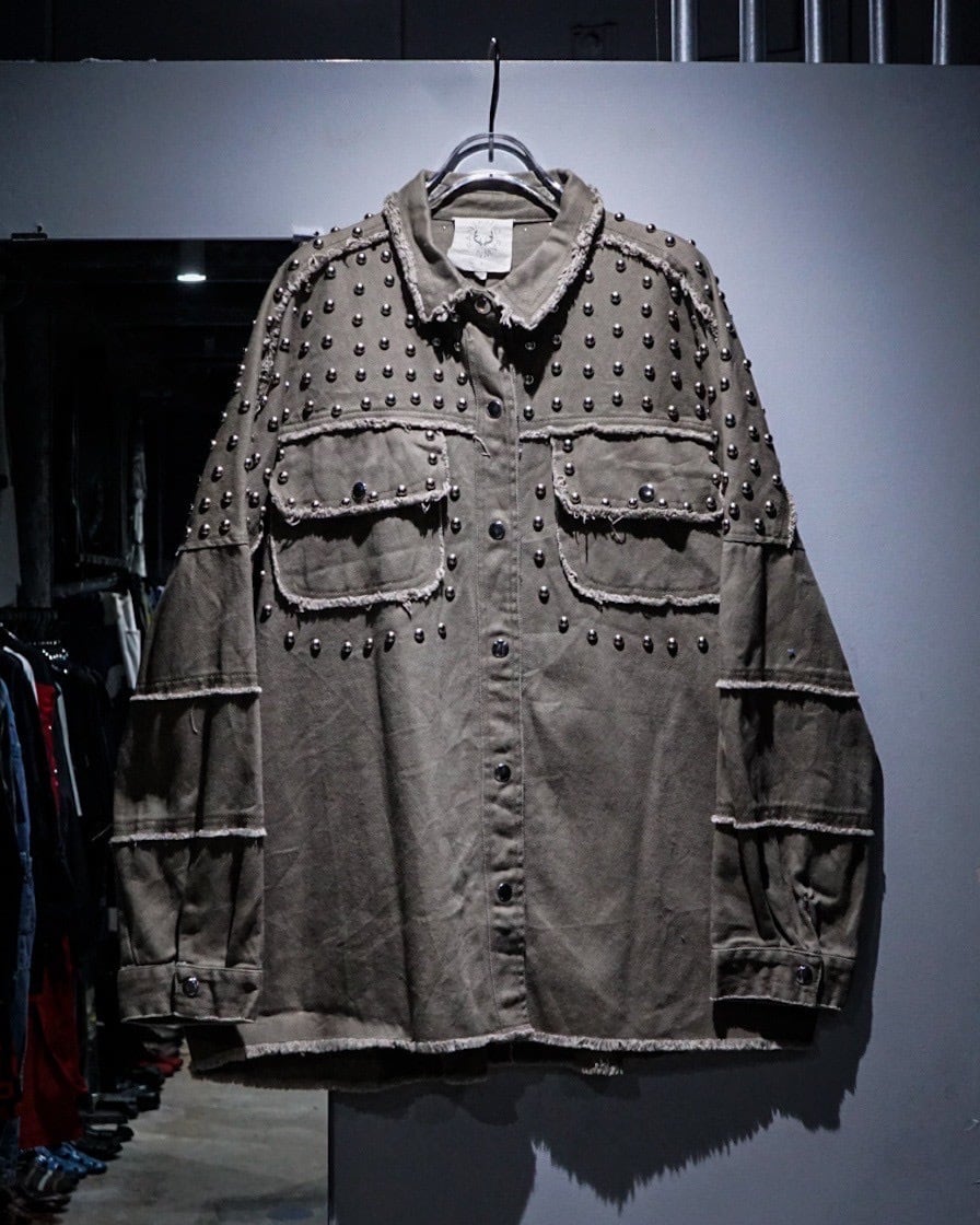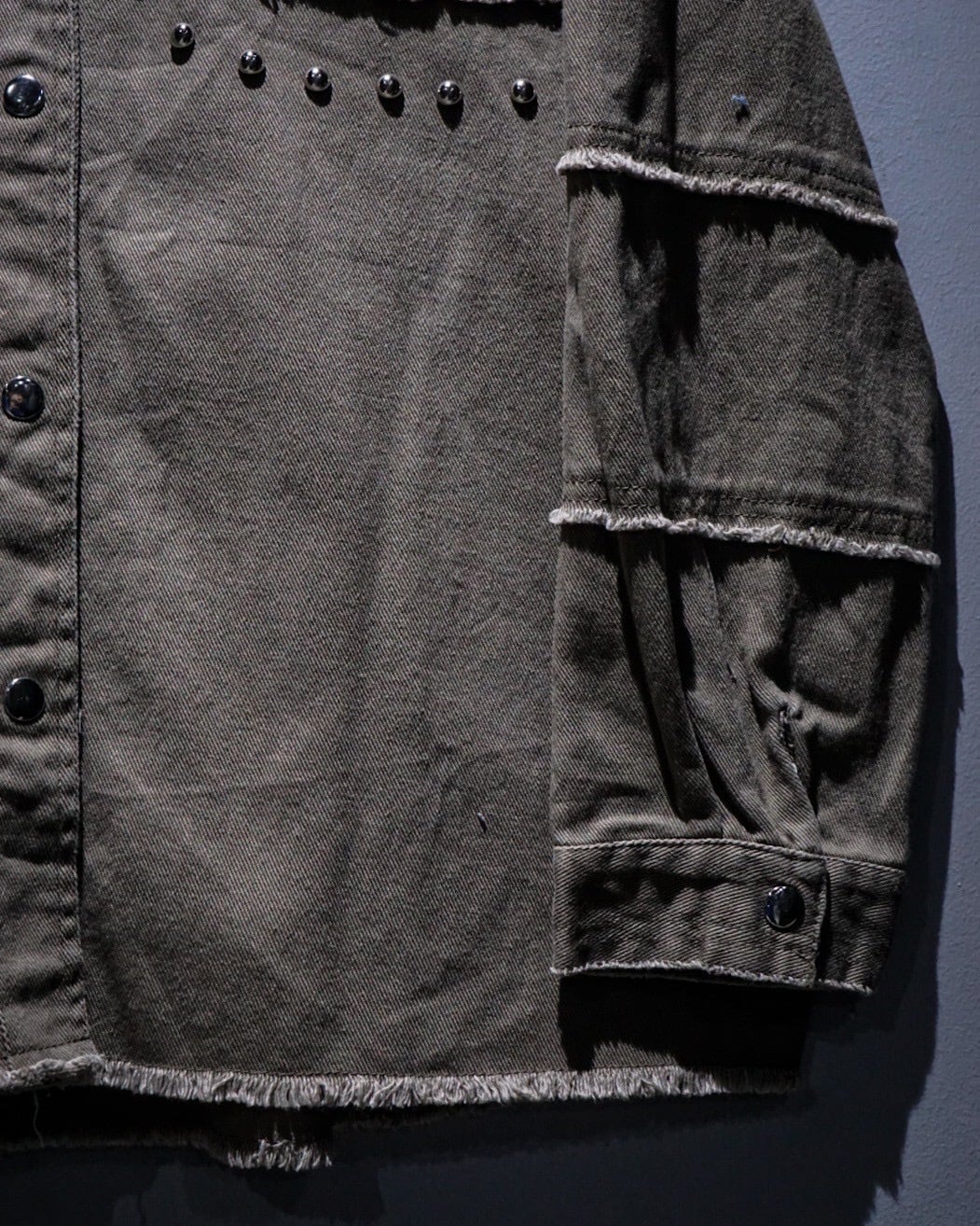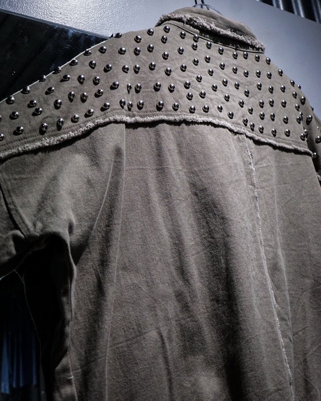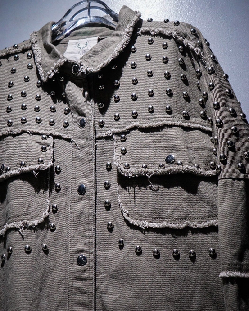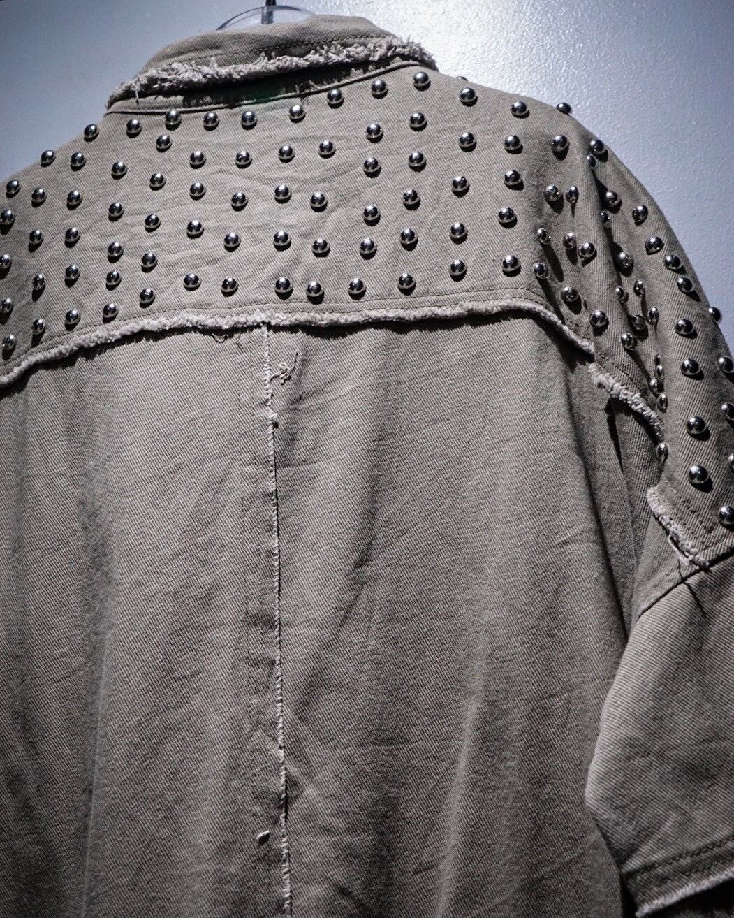 立体的かつボリューミーなインサイドアウトに加えて、輝きのある大ぶりなスタッズを半身に追加。生地を切りっぱなしにし、着用を重ねる事で生まれる自然なほつれがアイテムの表情により一層深みをもたらせてくれます。