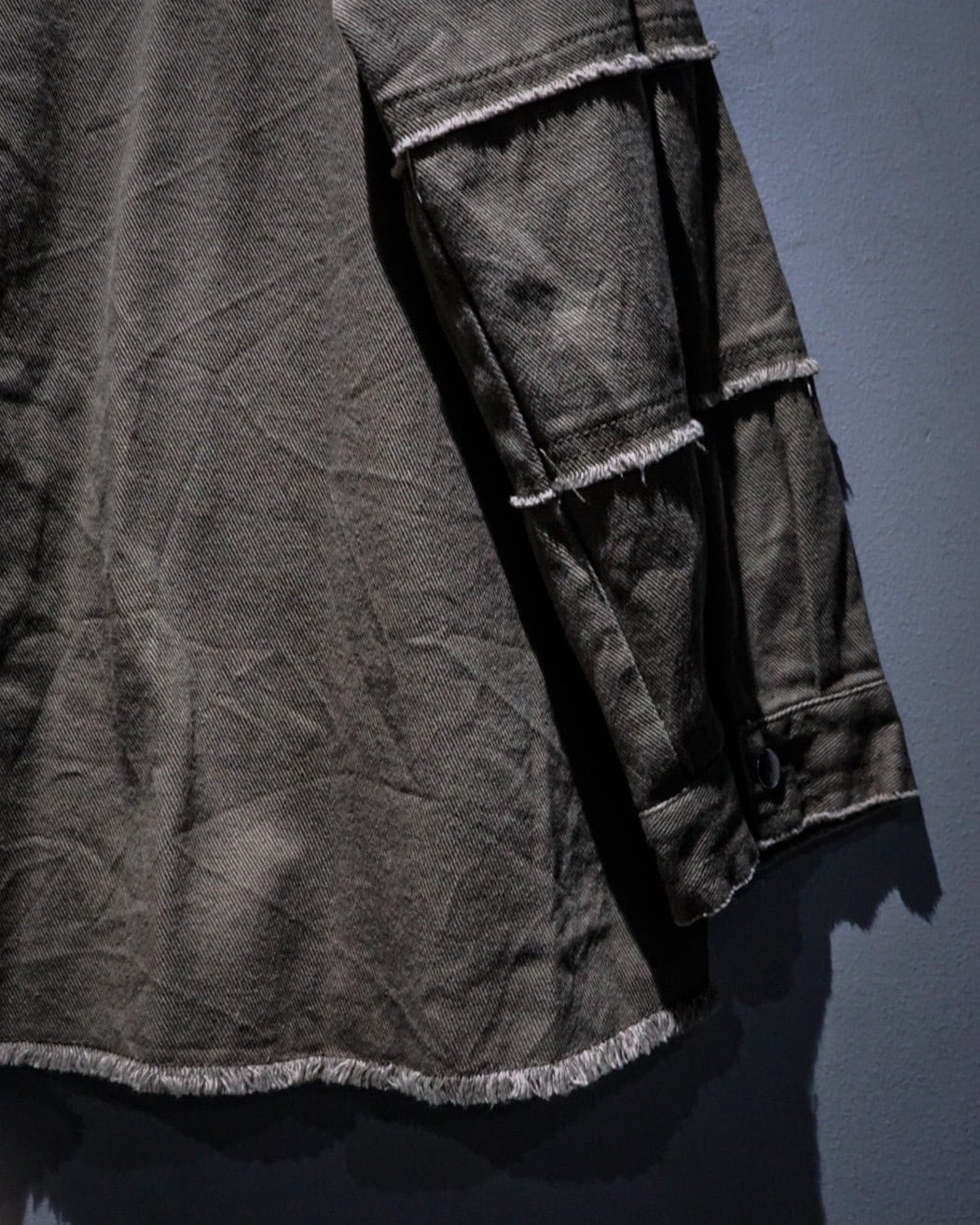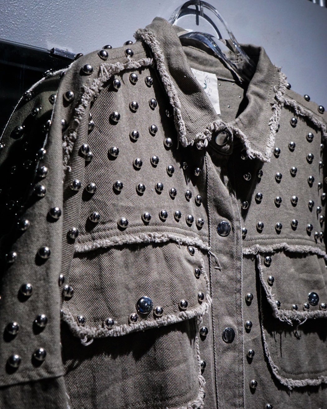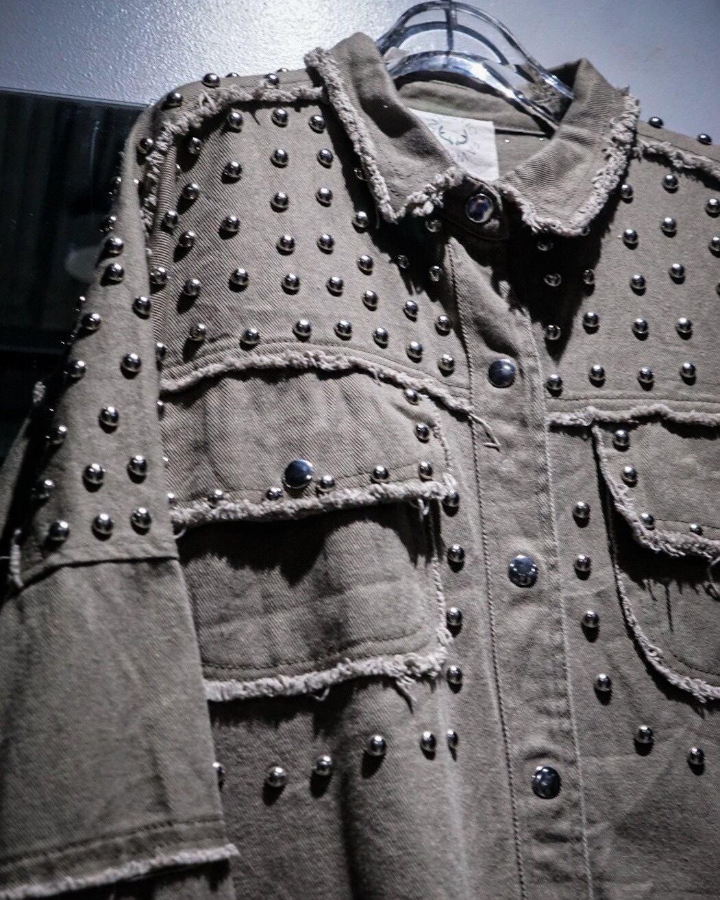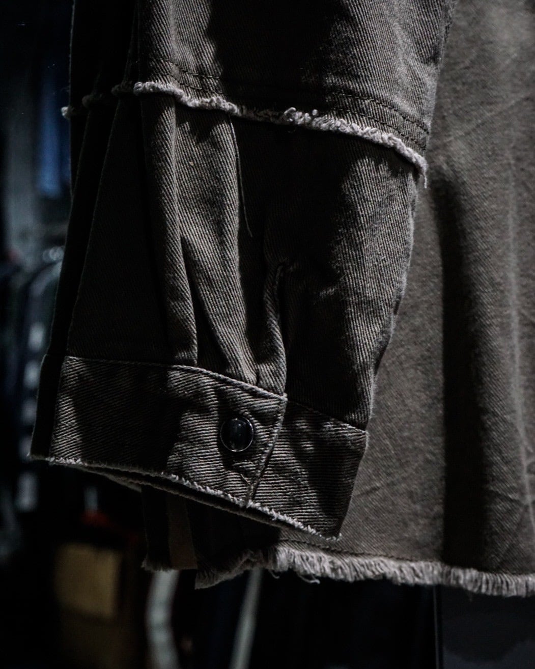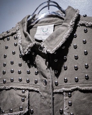 立体的かつボリューミーなインサイドアウトに加えて、輝きのある大ぶりなスタッズを半身に追加。生地を切りっぱなしにし、着用を重ねる事で生まれる自然なほつれがアイテムの表情により一層深みをもたらせてくれます。