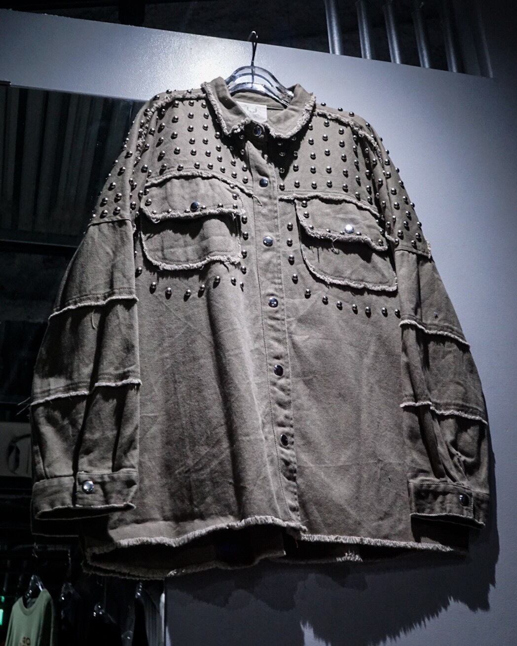 燻みのあるベージュのボディをベースに、インサイドアウトやスタッズと立体的なディテールを載せた1着。