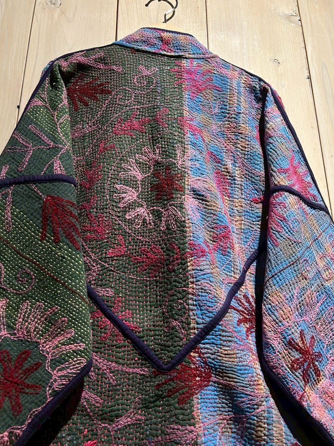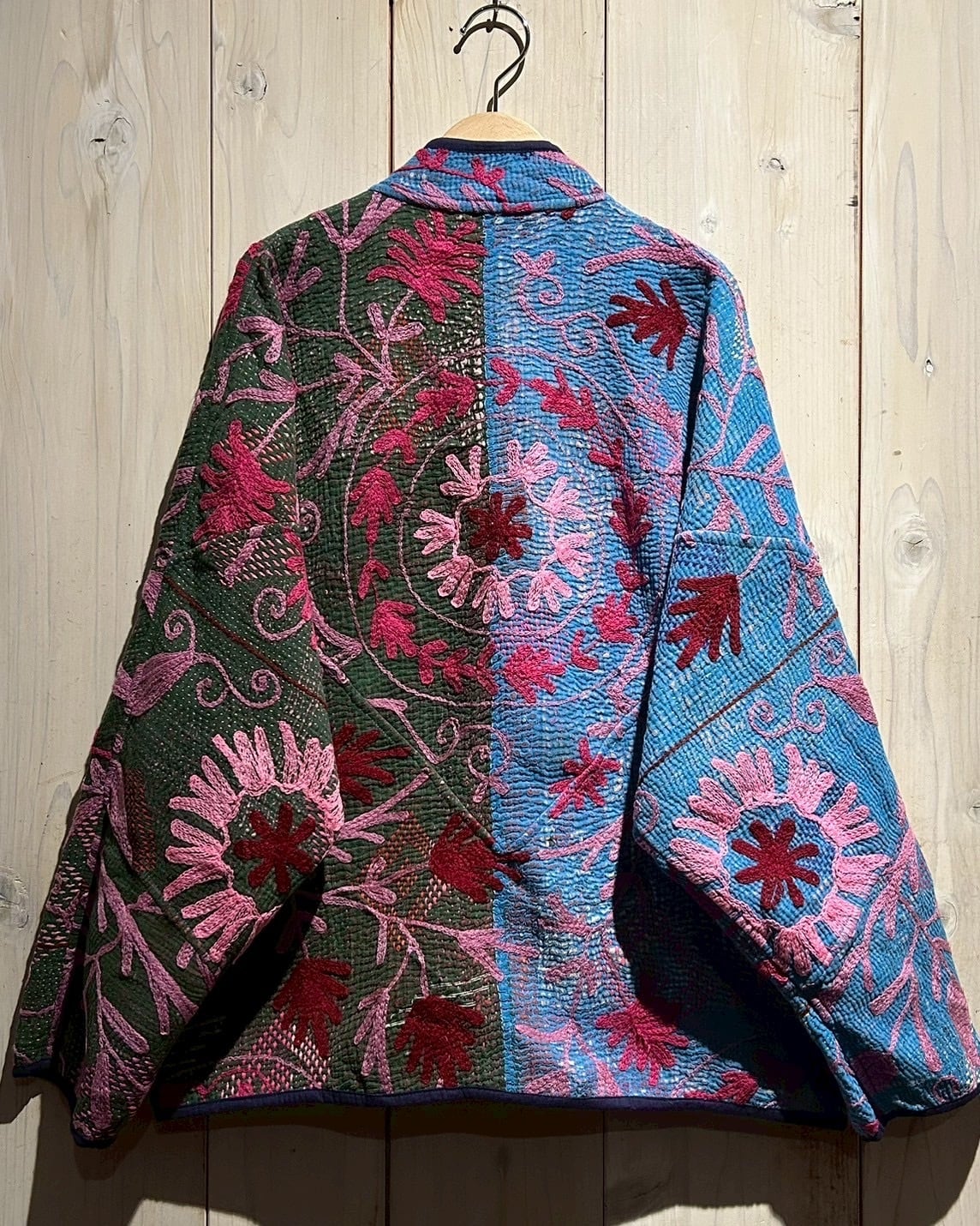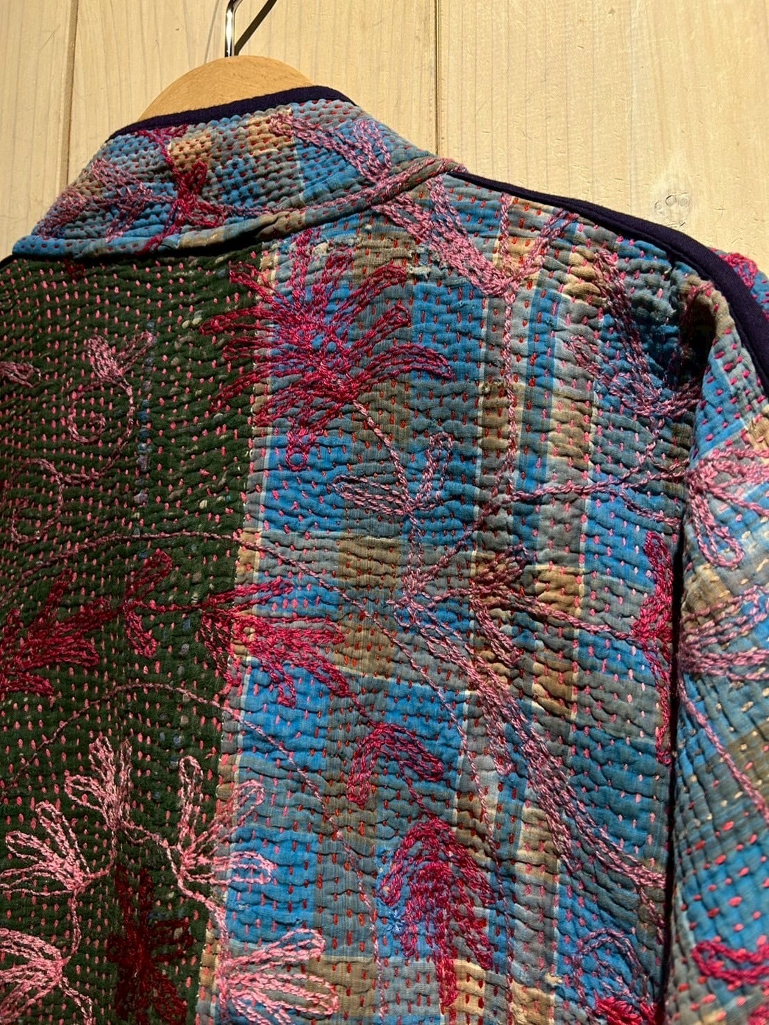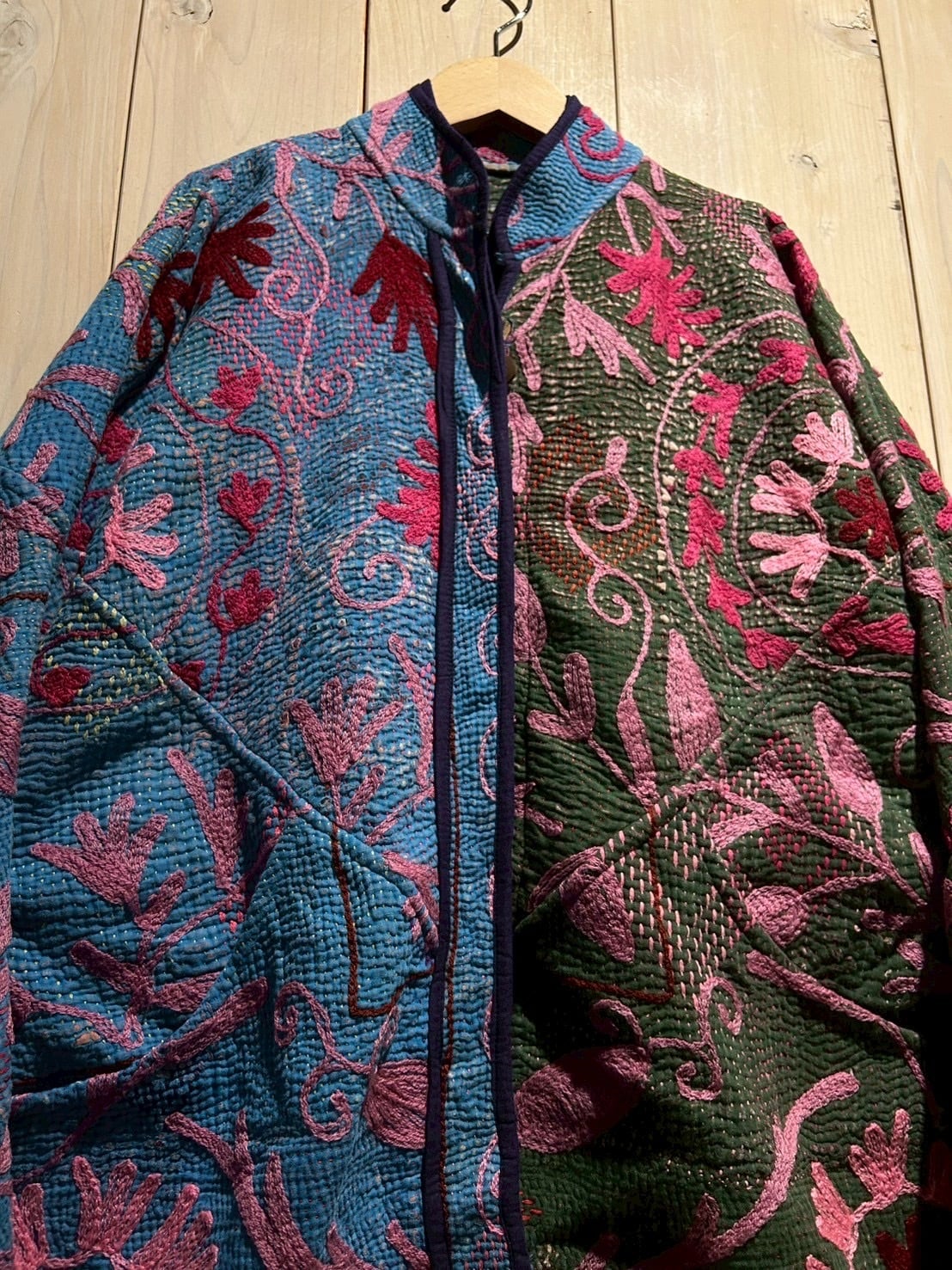このブランドの最大の特徴でもある、インドのアンティークテキスタイルを用いたボディに、ボタニカルな刺繍を刻んだジャケット。
