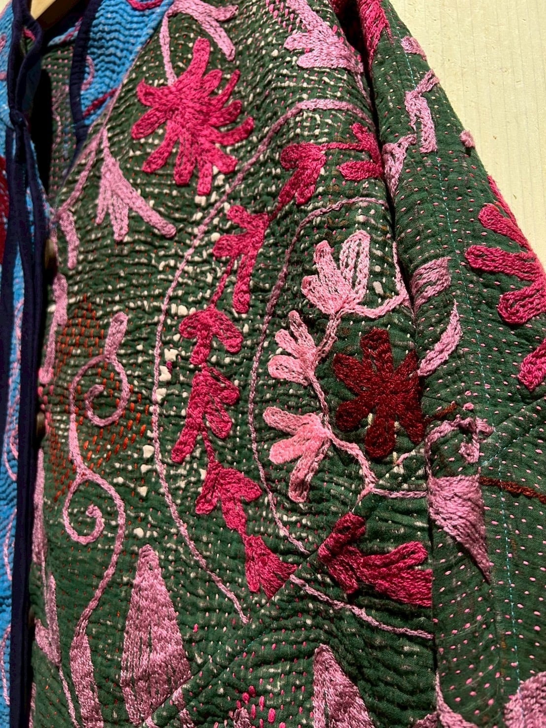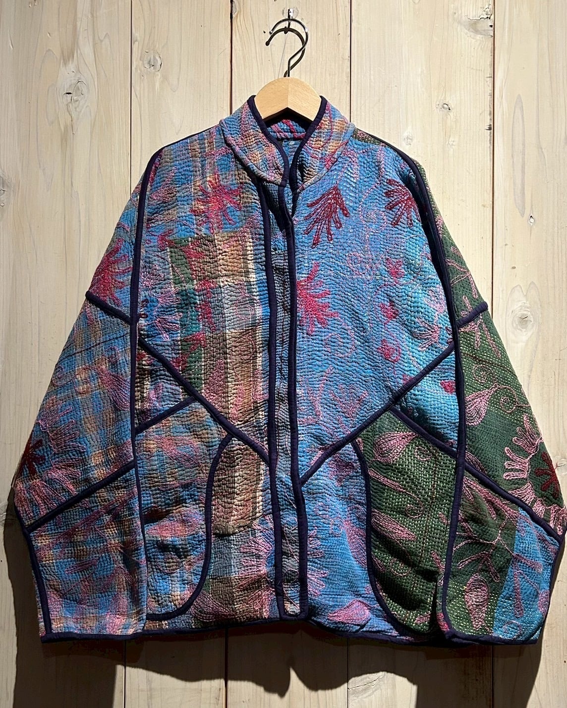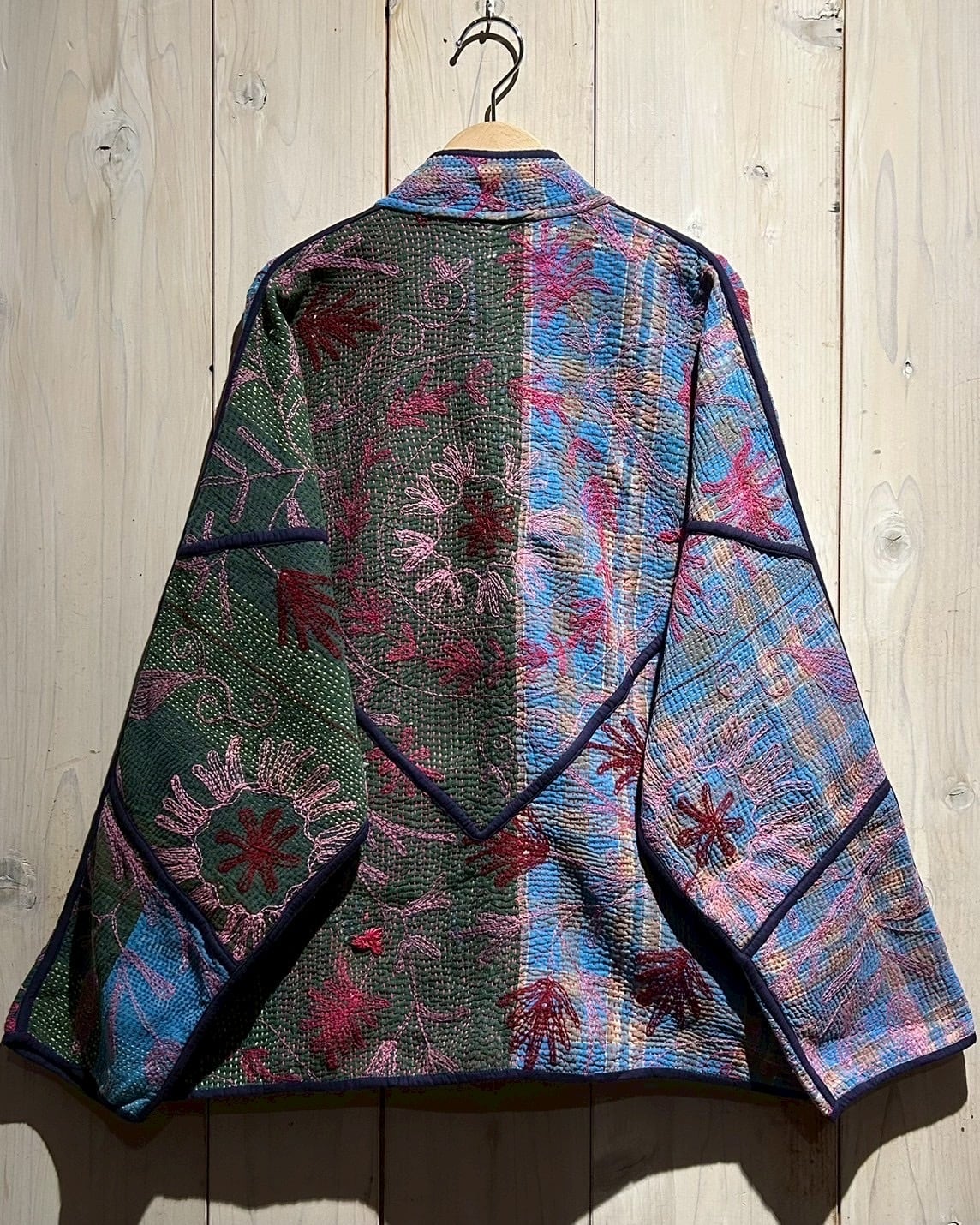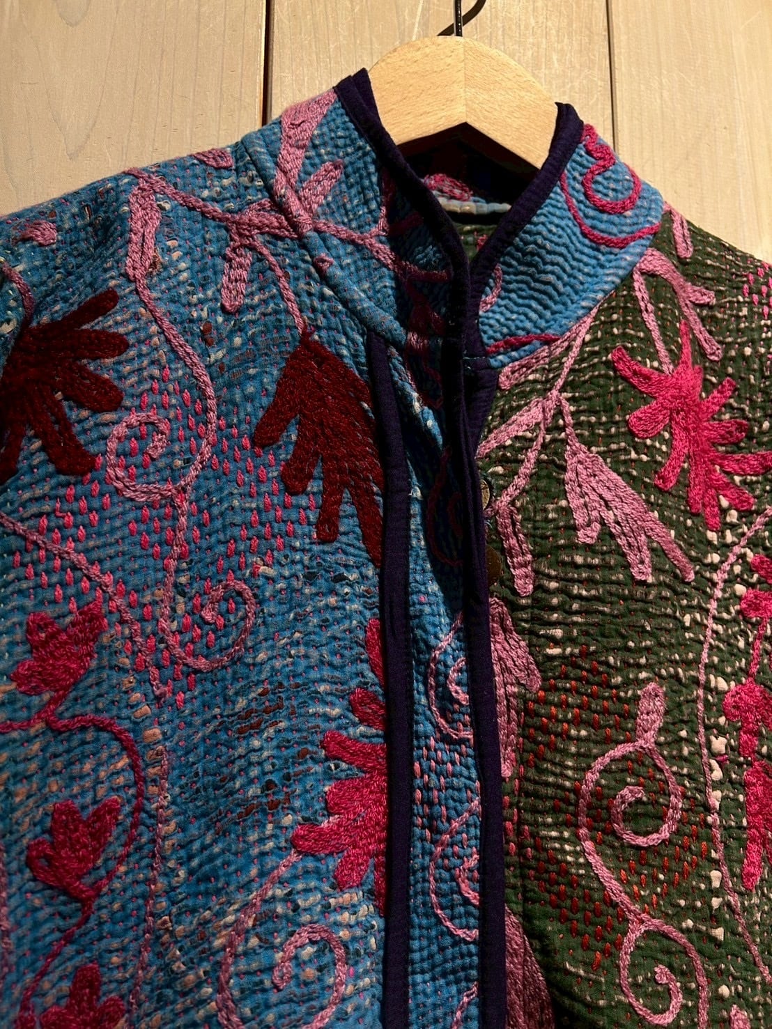 このブランドの最大の特徴でもある、インドのアンティークテキスタイルを用いたボディに、ボタニカルな刺繍を刻んだジャケット。