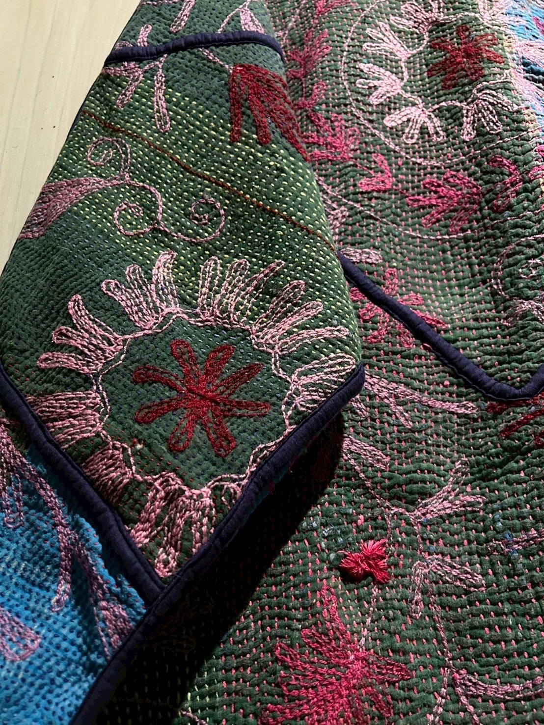 モスグリーン、水色のシボ感のある生地を切り替えた上に、鮮やかなピンクの花々の刺繍が立体的で美しく、唯一無二な雰囲気をムンムンに放っています。