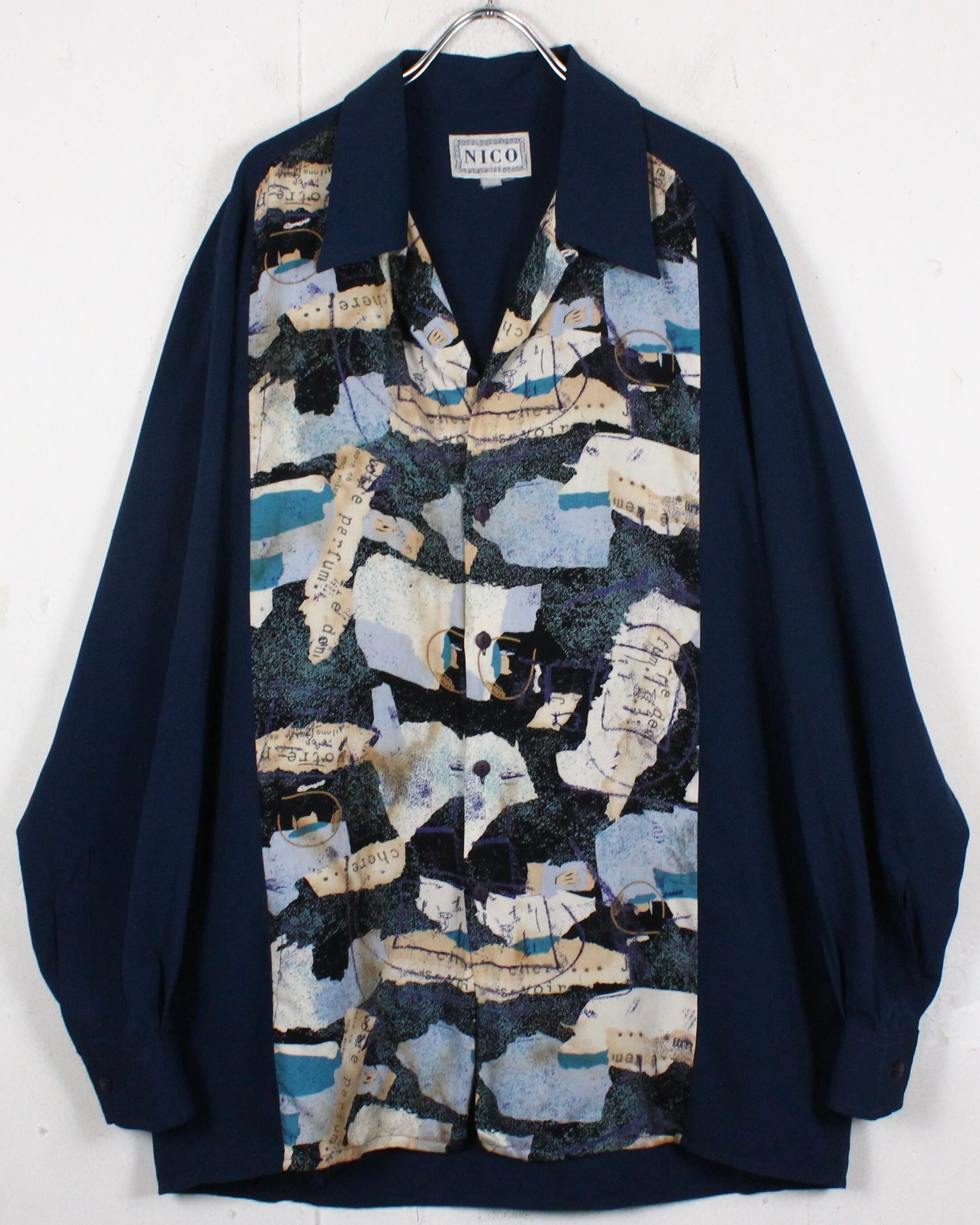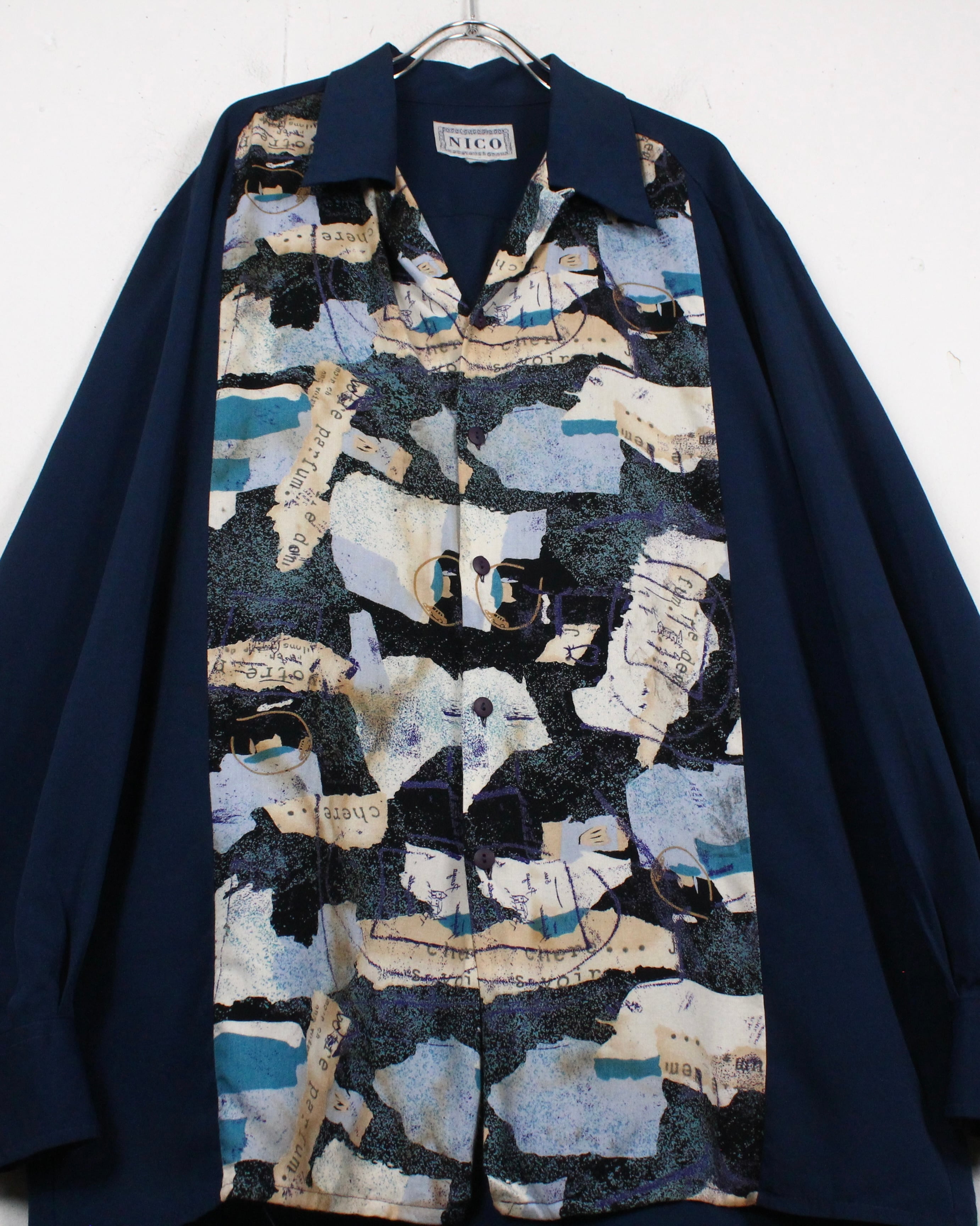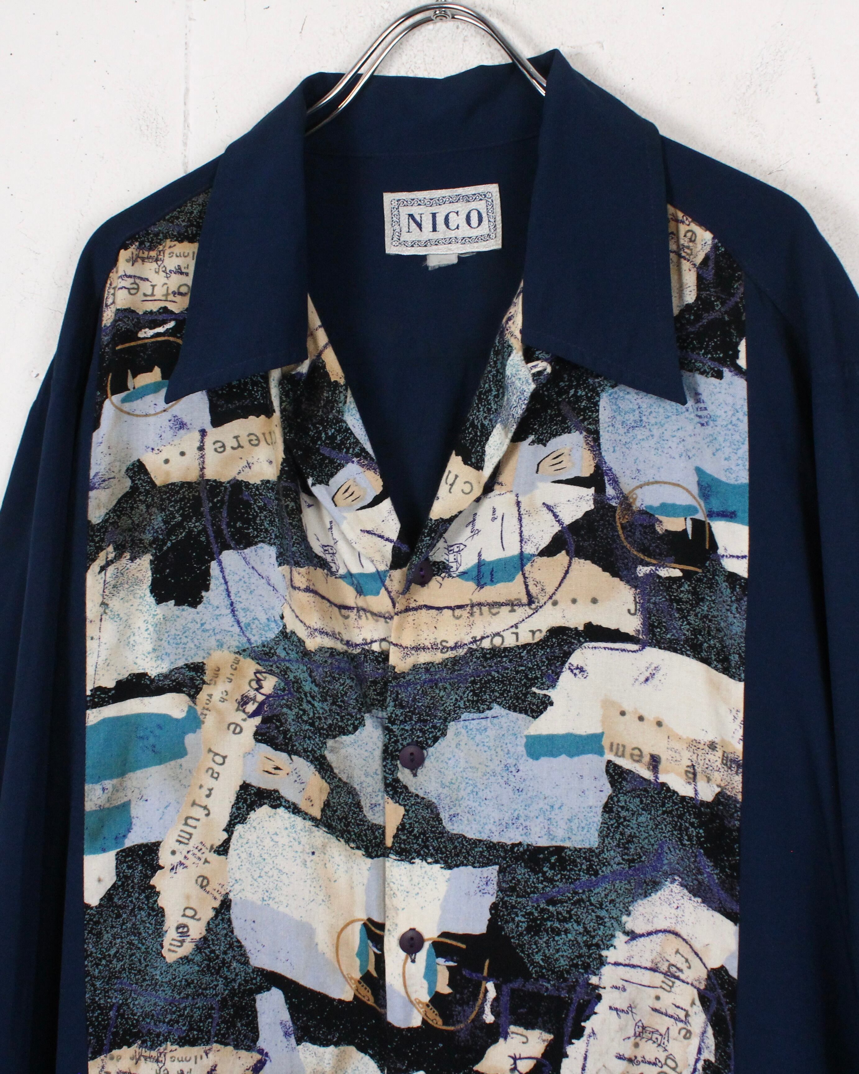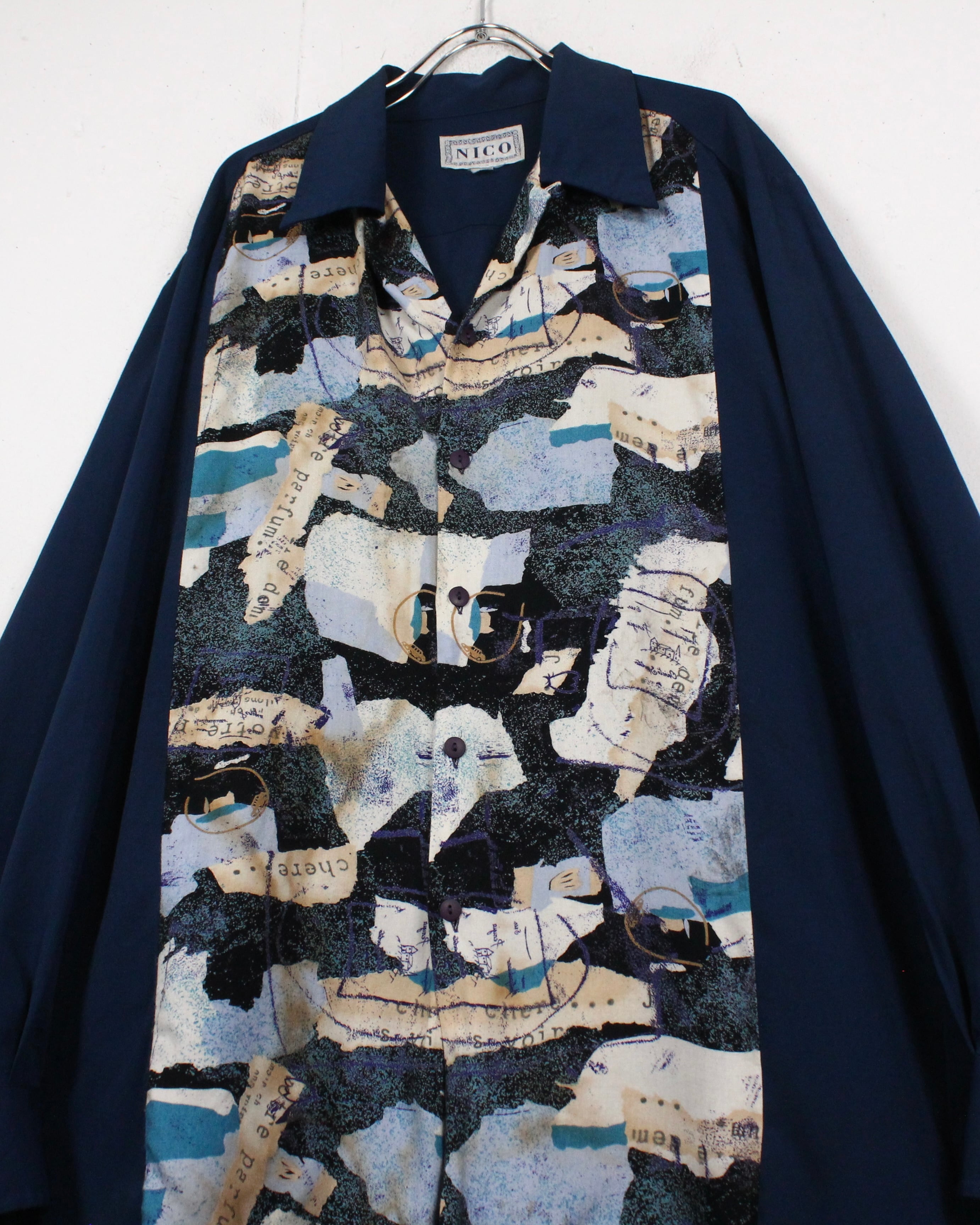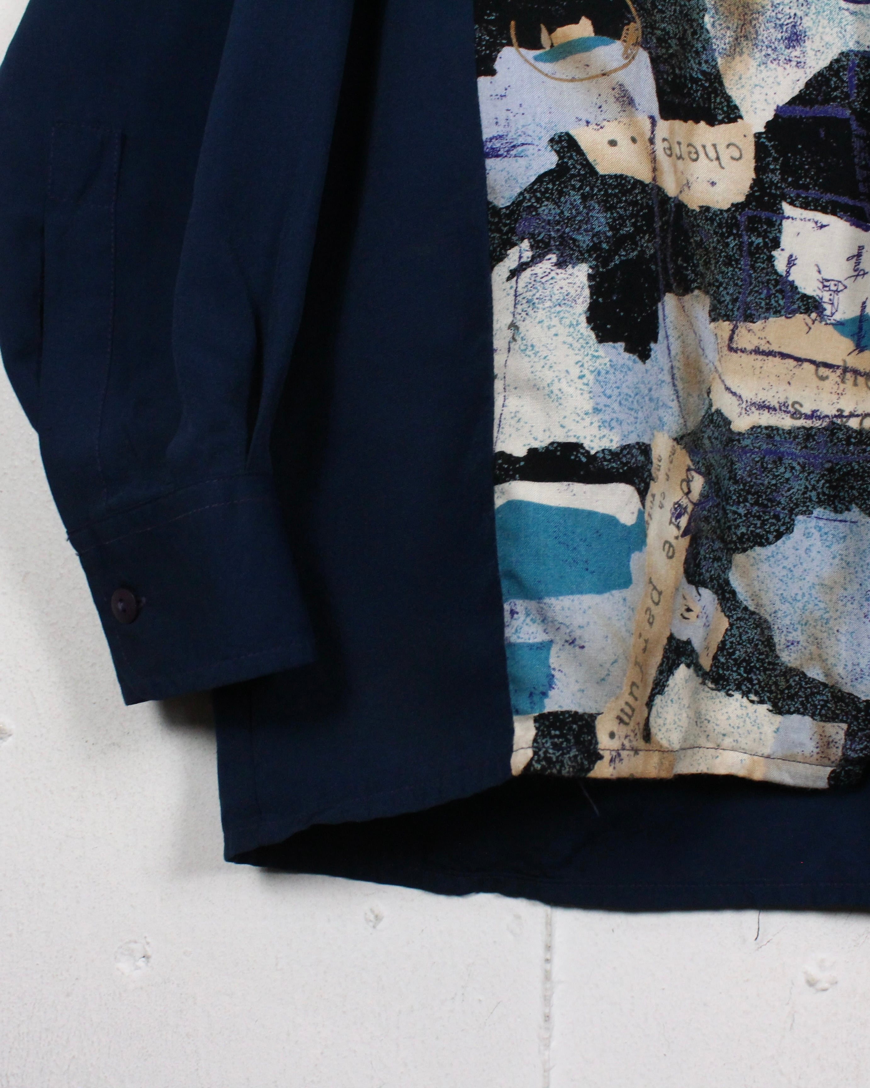 ネイビーのボディをベースに、レタリング風のデザインを切り替えた長袖オープンカラーシャツ。