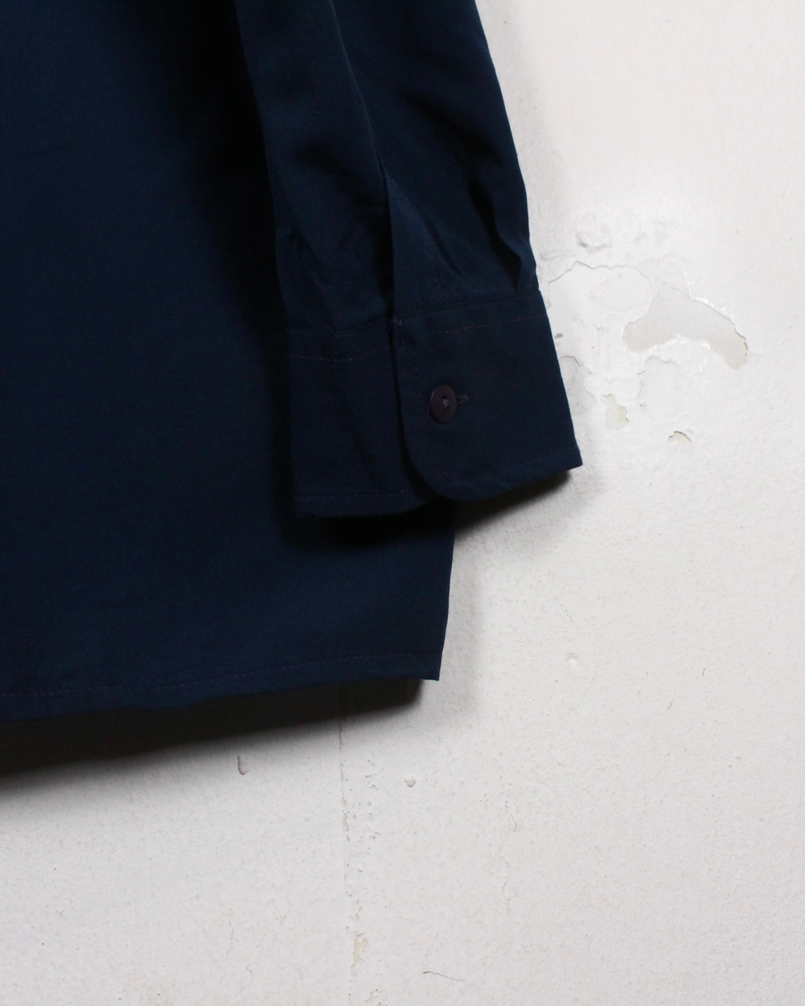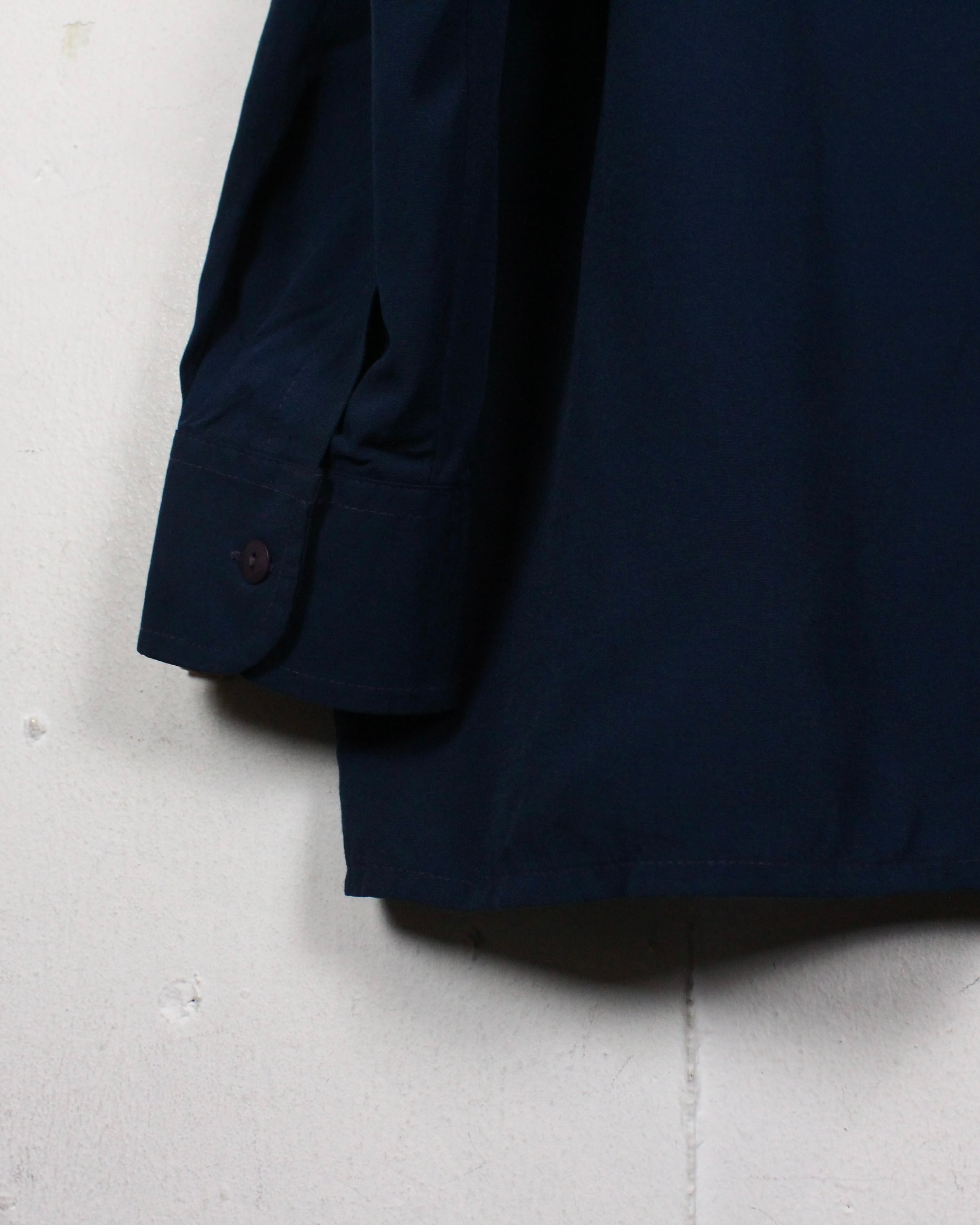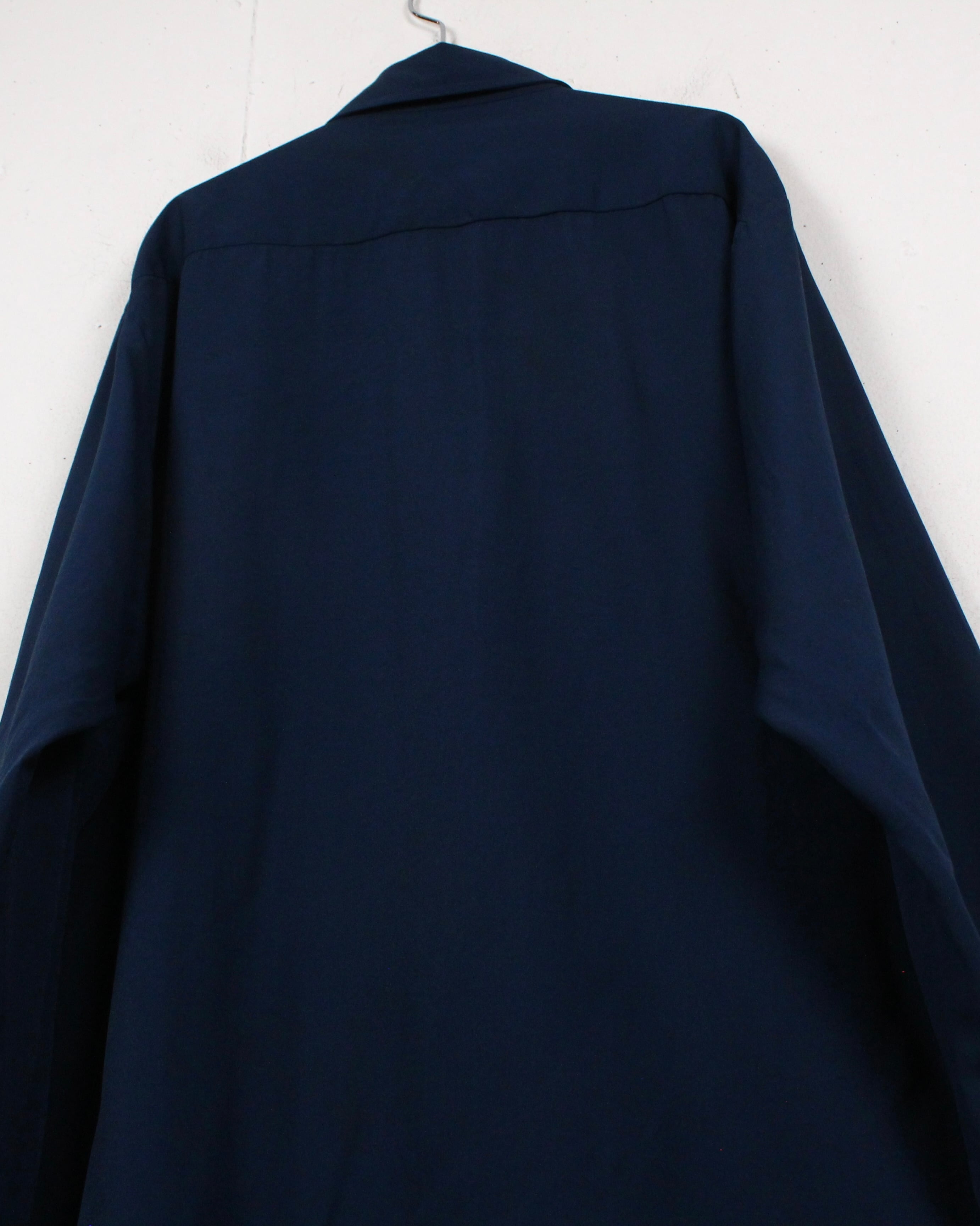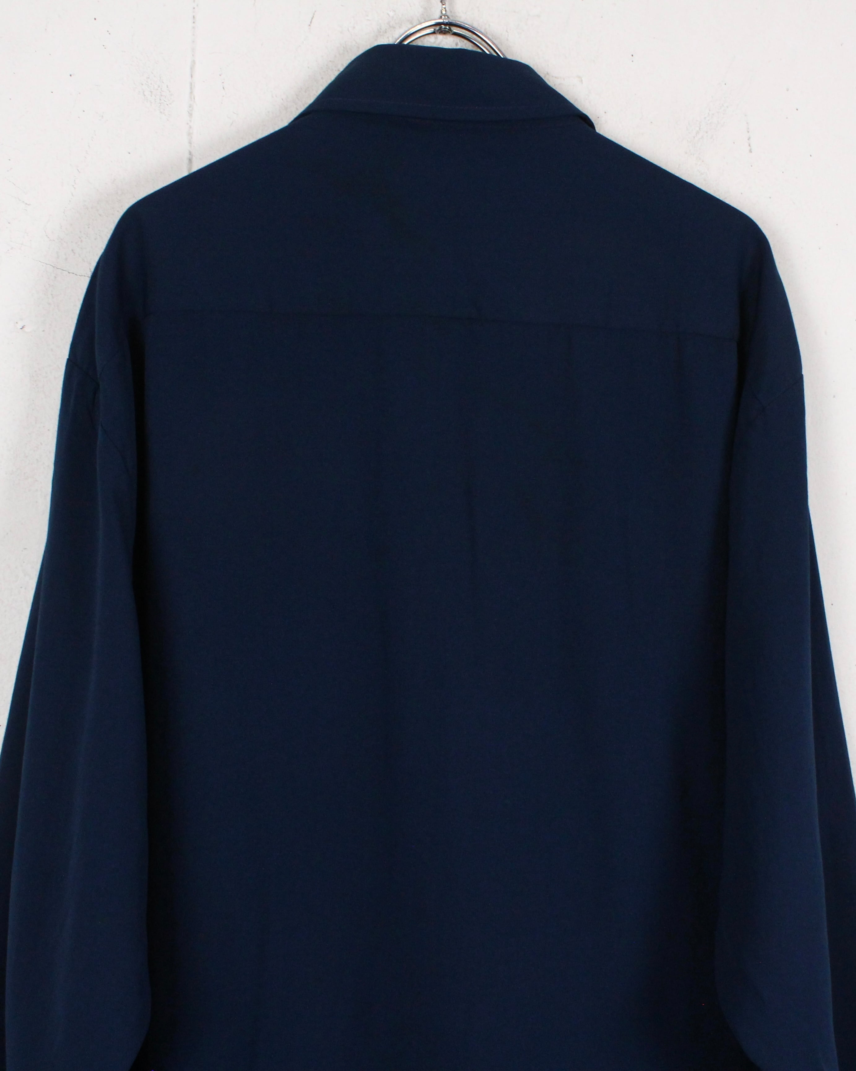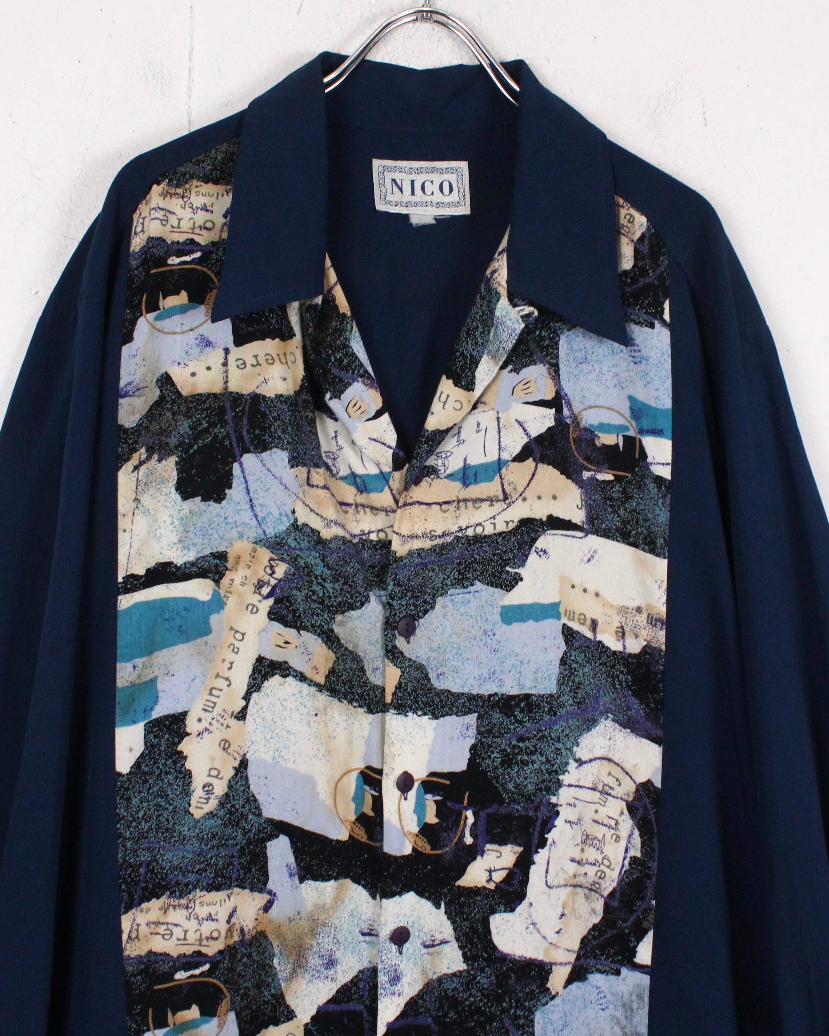 ネイビーのボディをベースに、レタリング風のデザインを切り替えた長袖オープンカラーシャツ。