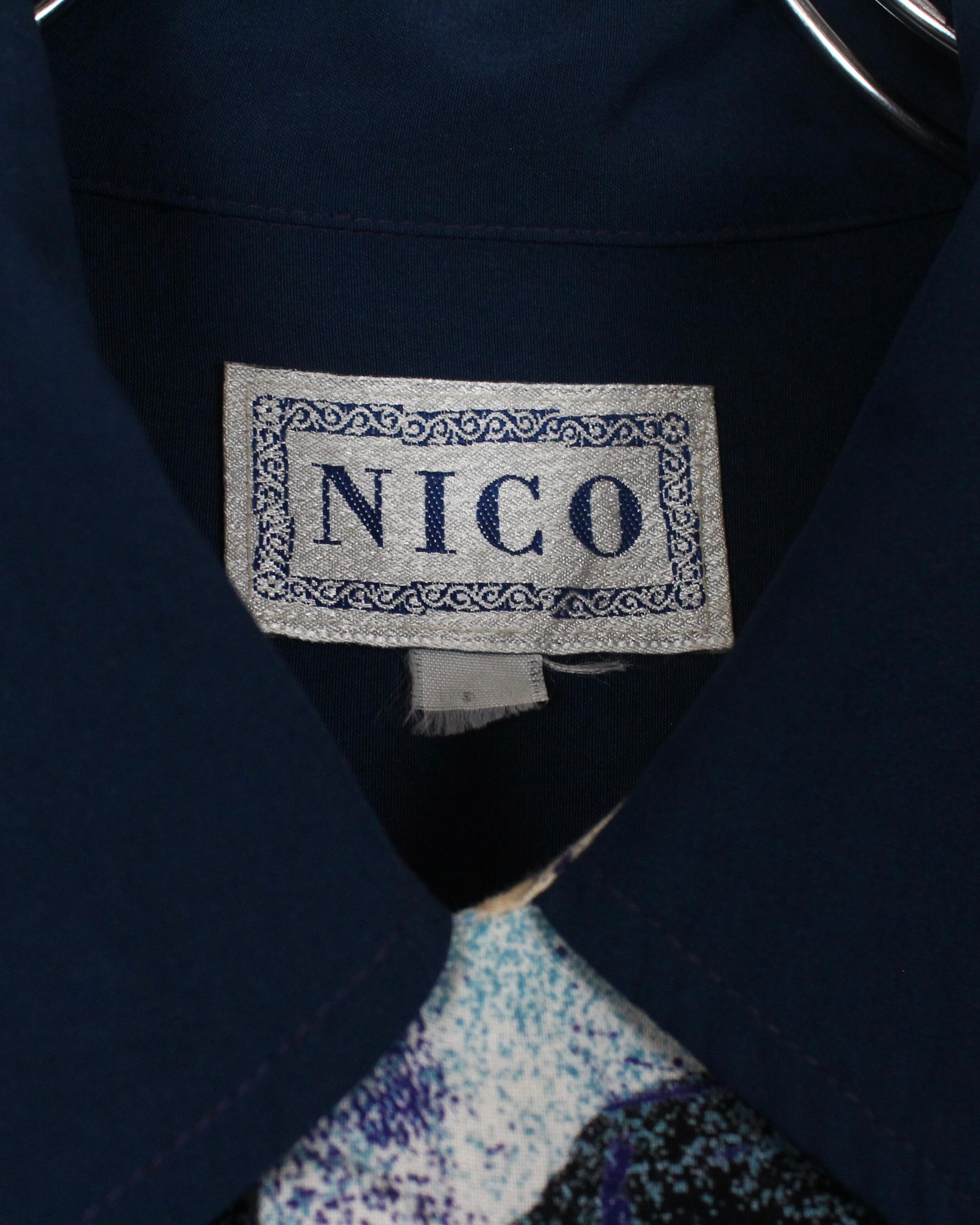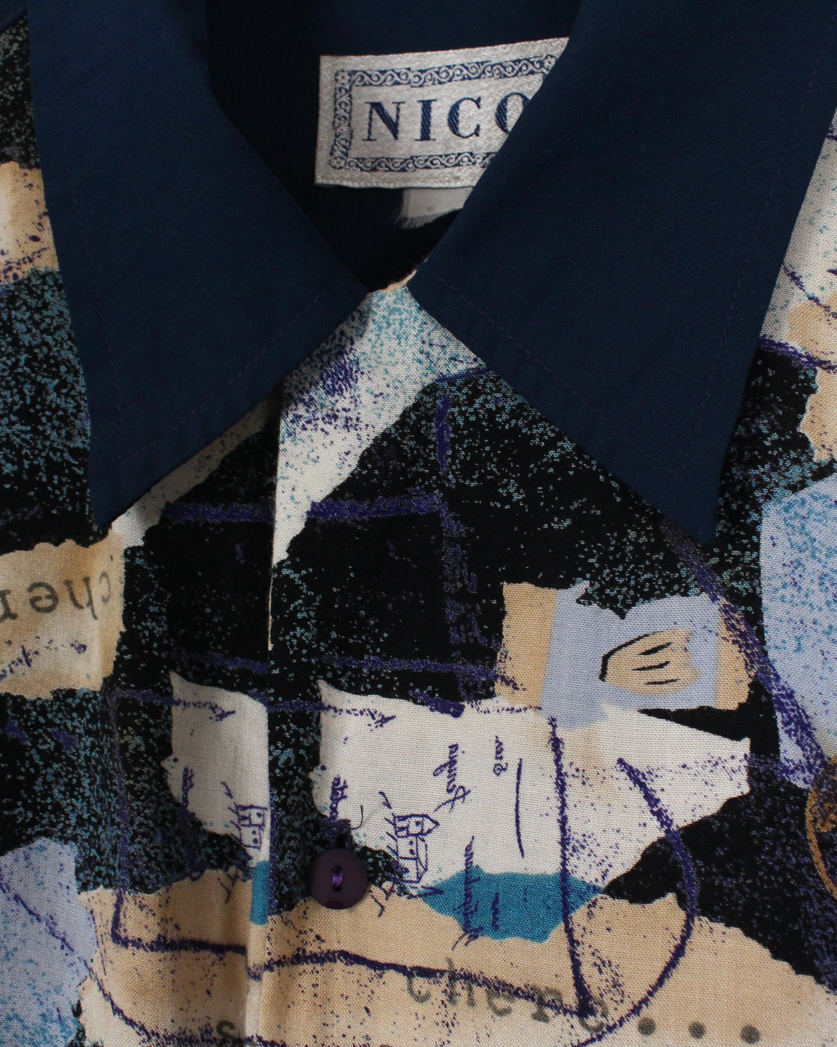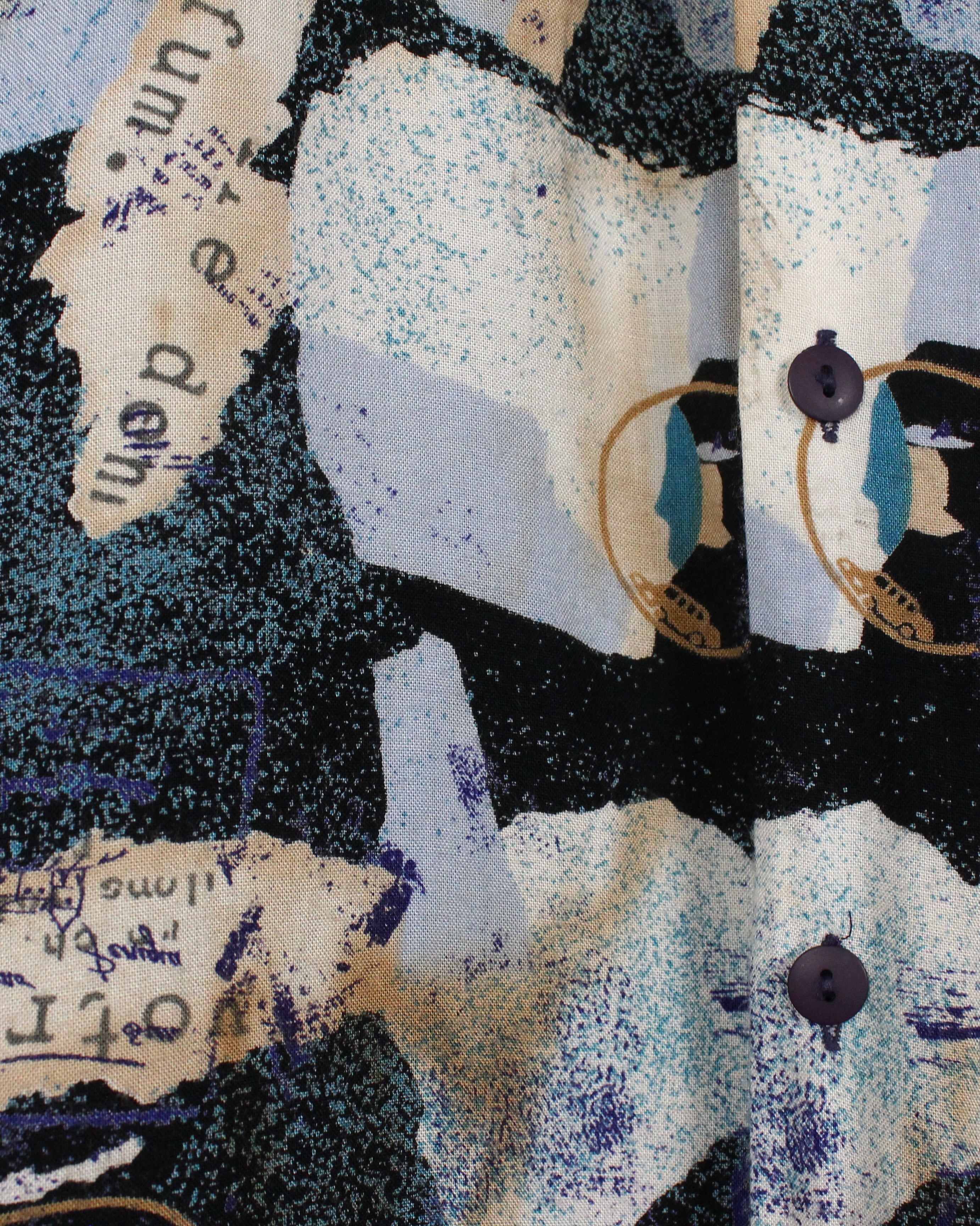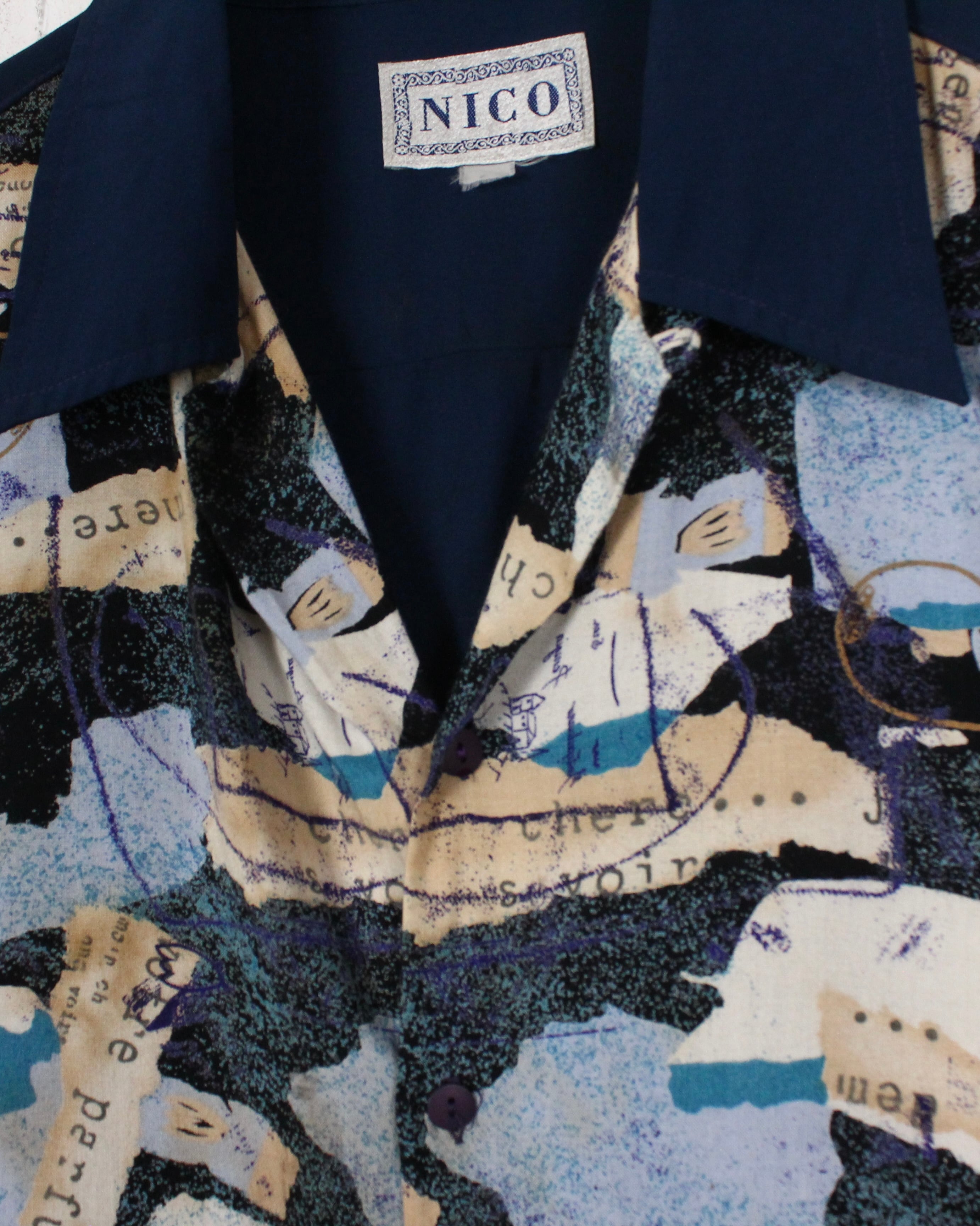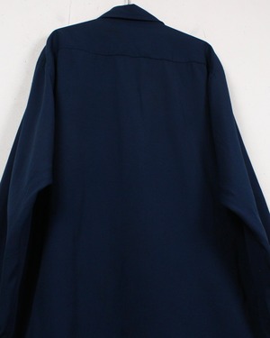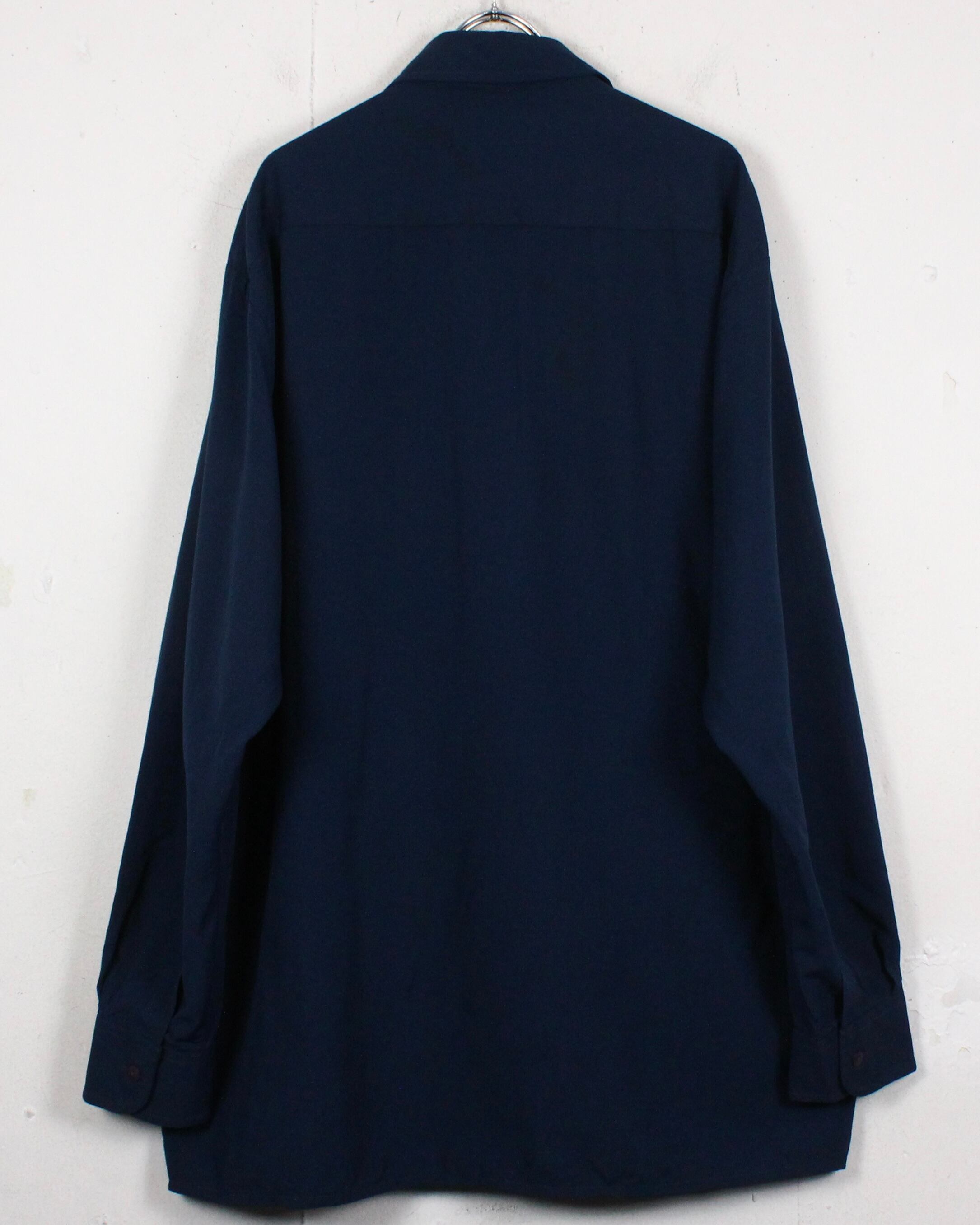 ネイビーのボディをベースに、レタリング風のデザインを切り替えた長袖オープンカラーシャツ。