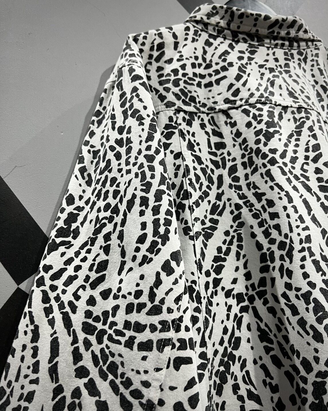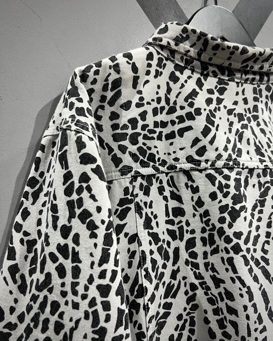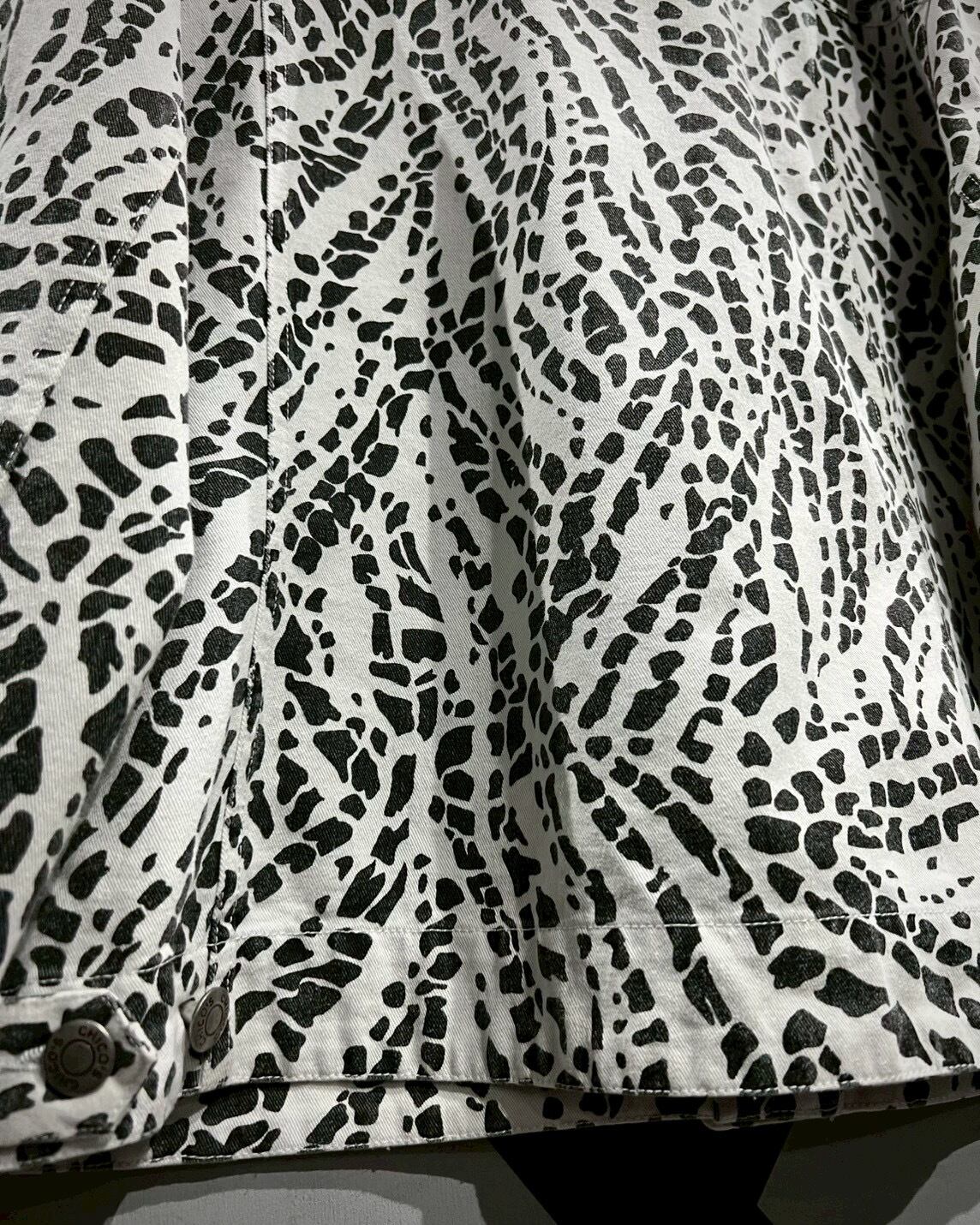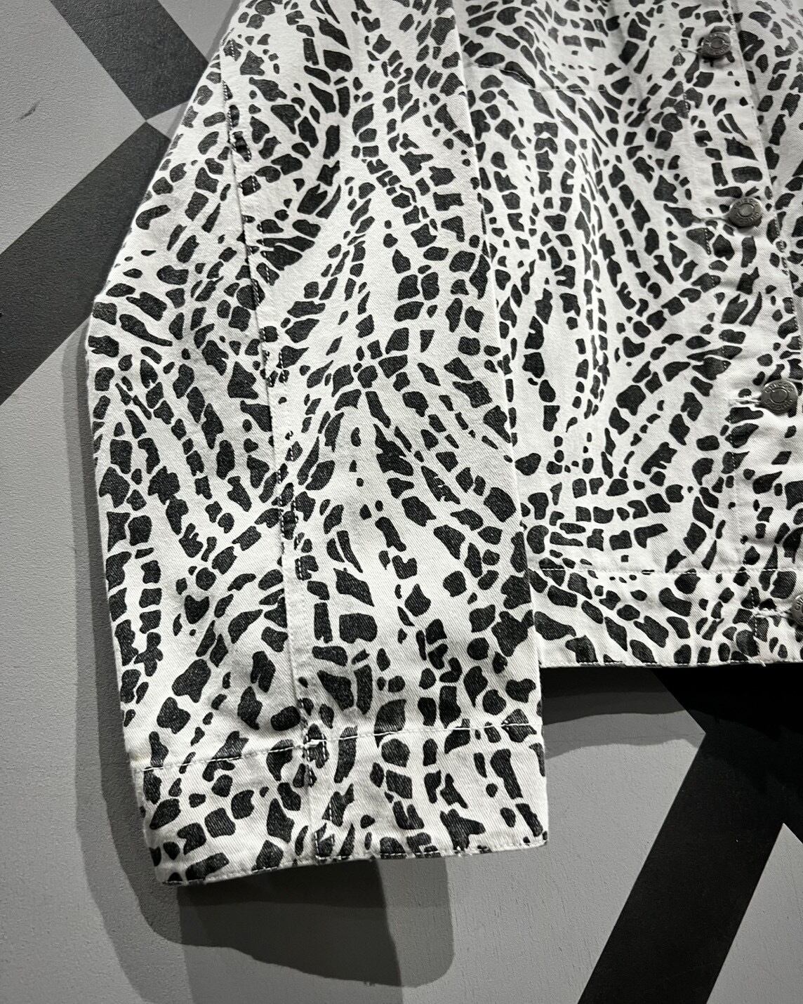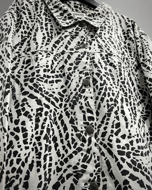 柔らかくコシのあるインド綿を用いたボディに、モノトーンのアート柄を載せたトラッカージャケット。
