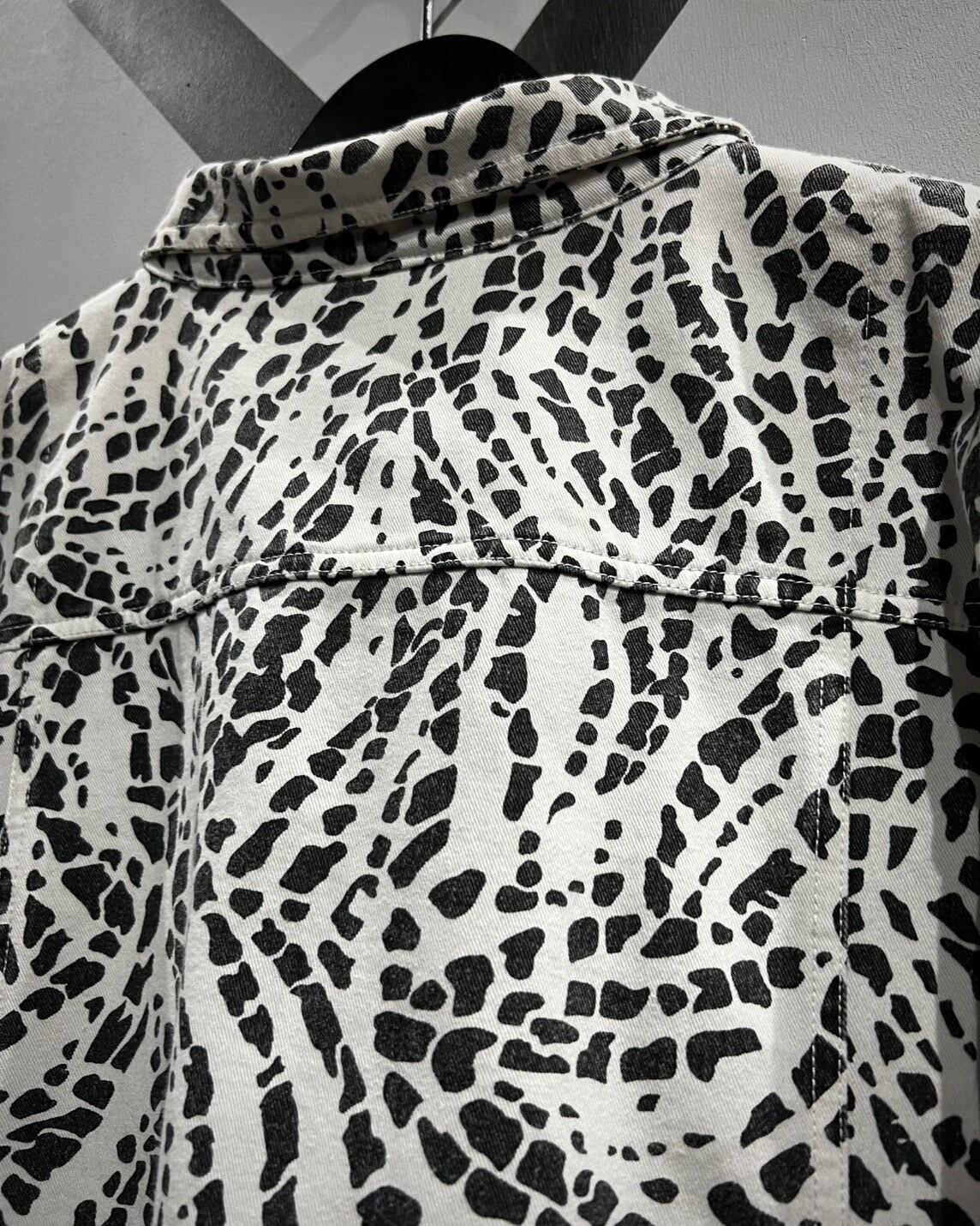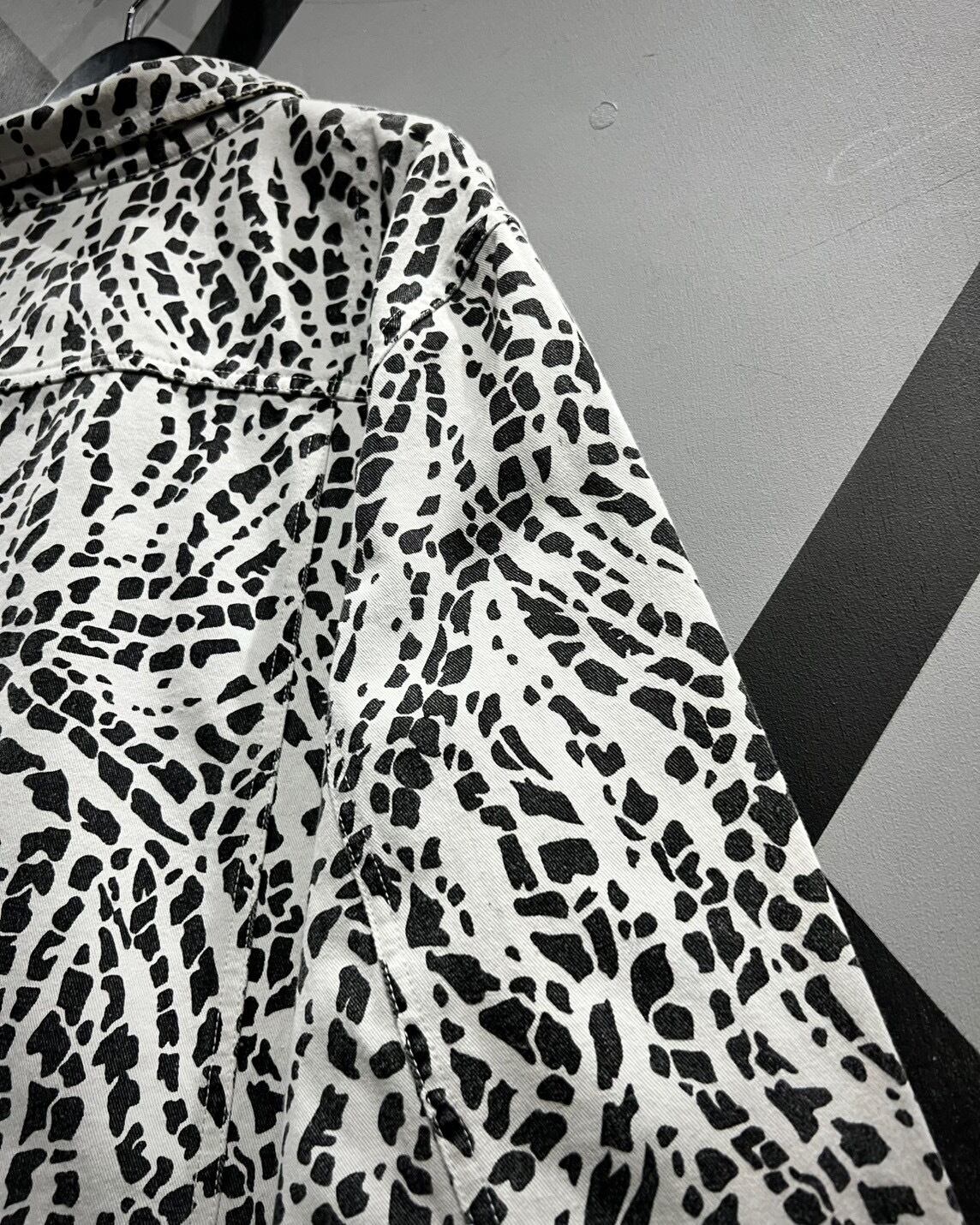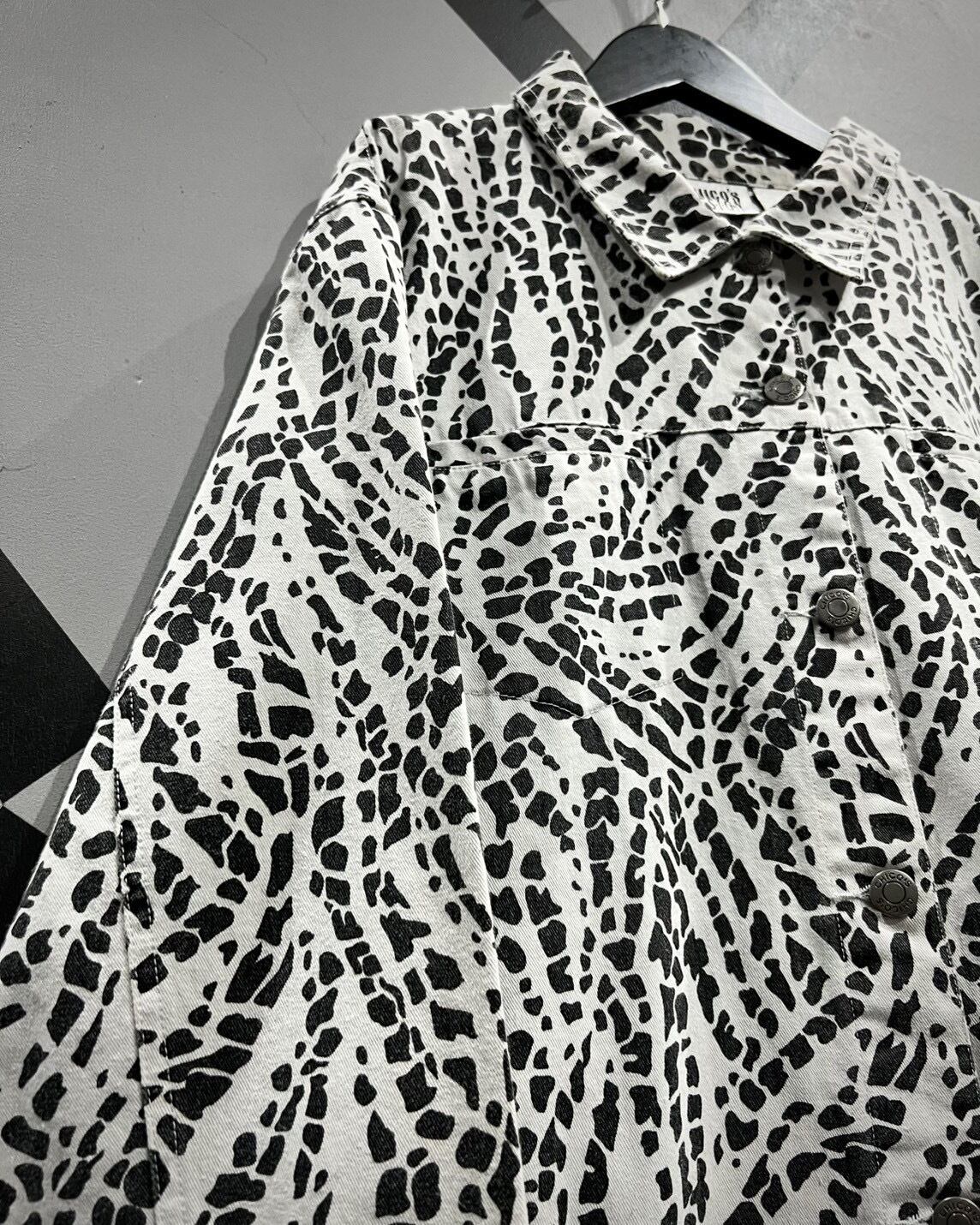 柔らかくコシのあるインド綿を用いたボディに、モノトーンのアート柄を載せたトラッカージャケット。