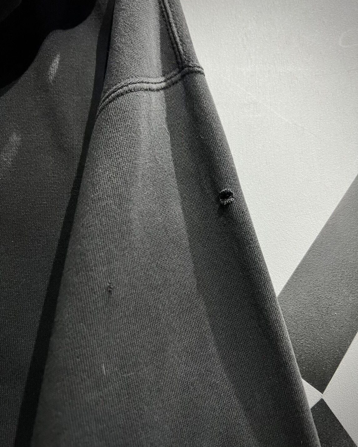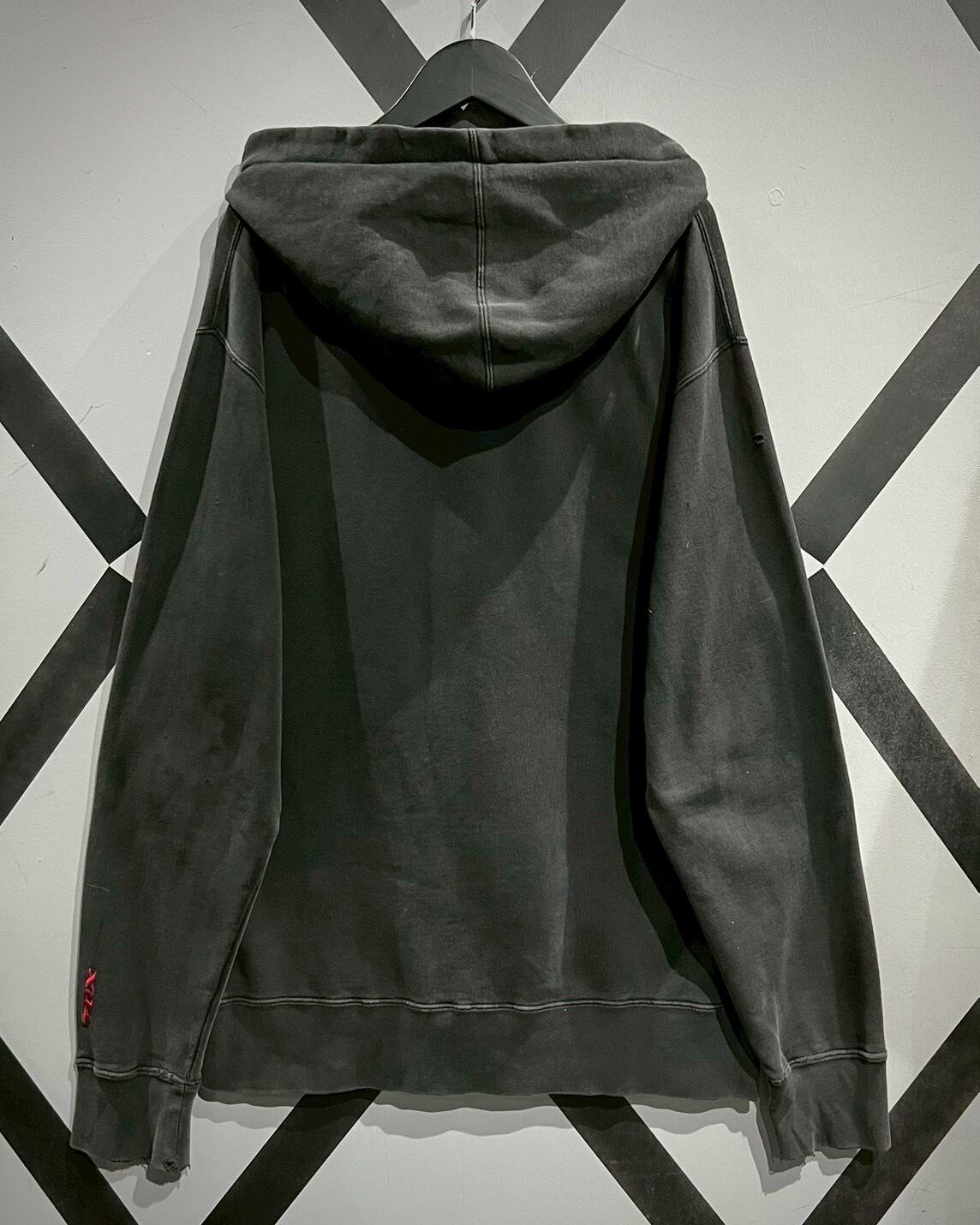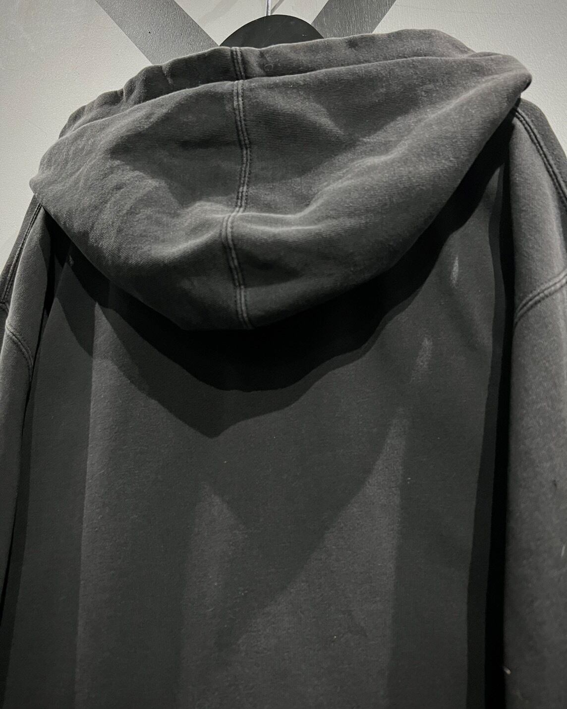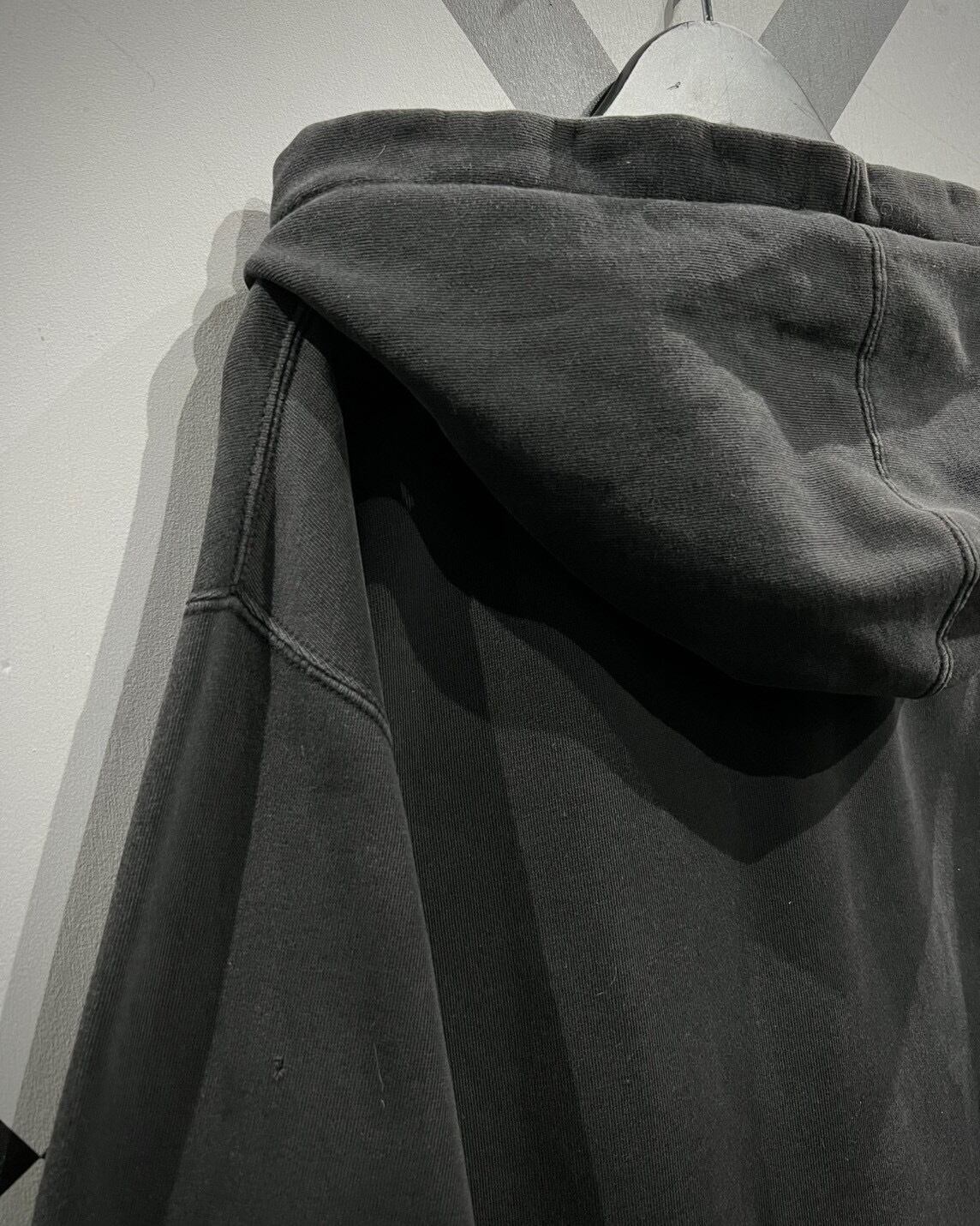 経年変化による墨黒のボディに、フロントにブランドロゴをプリントした1着。