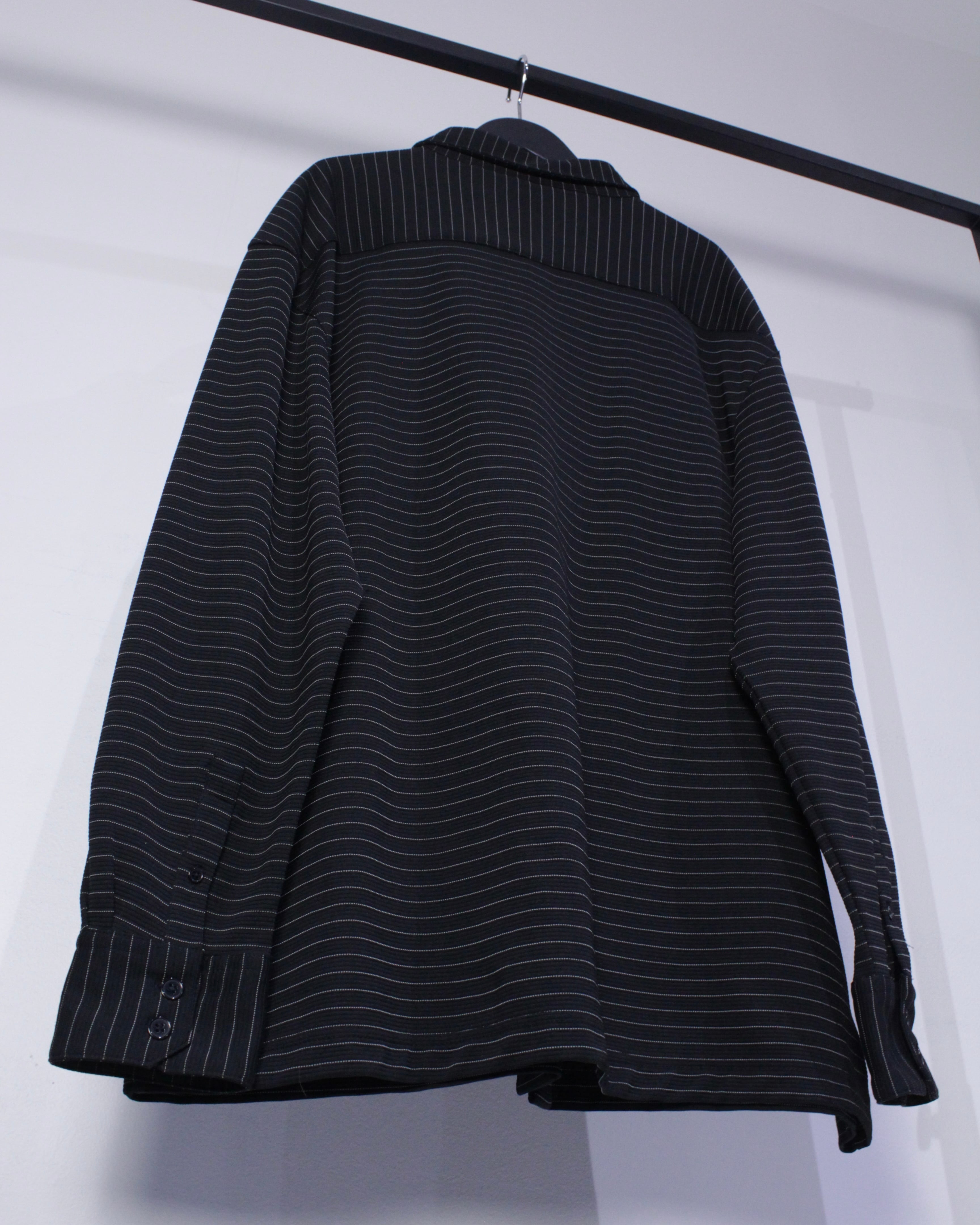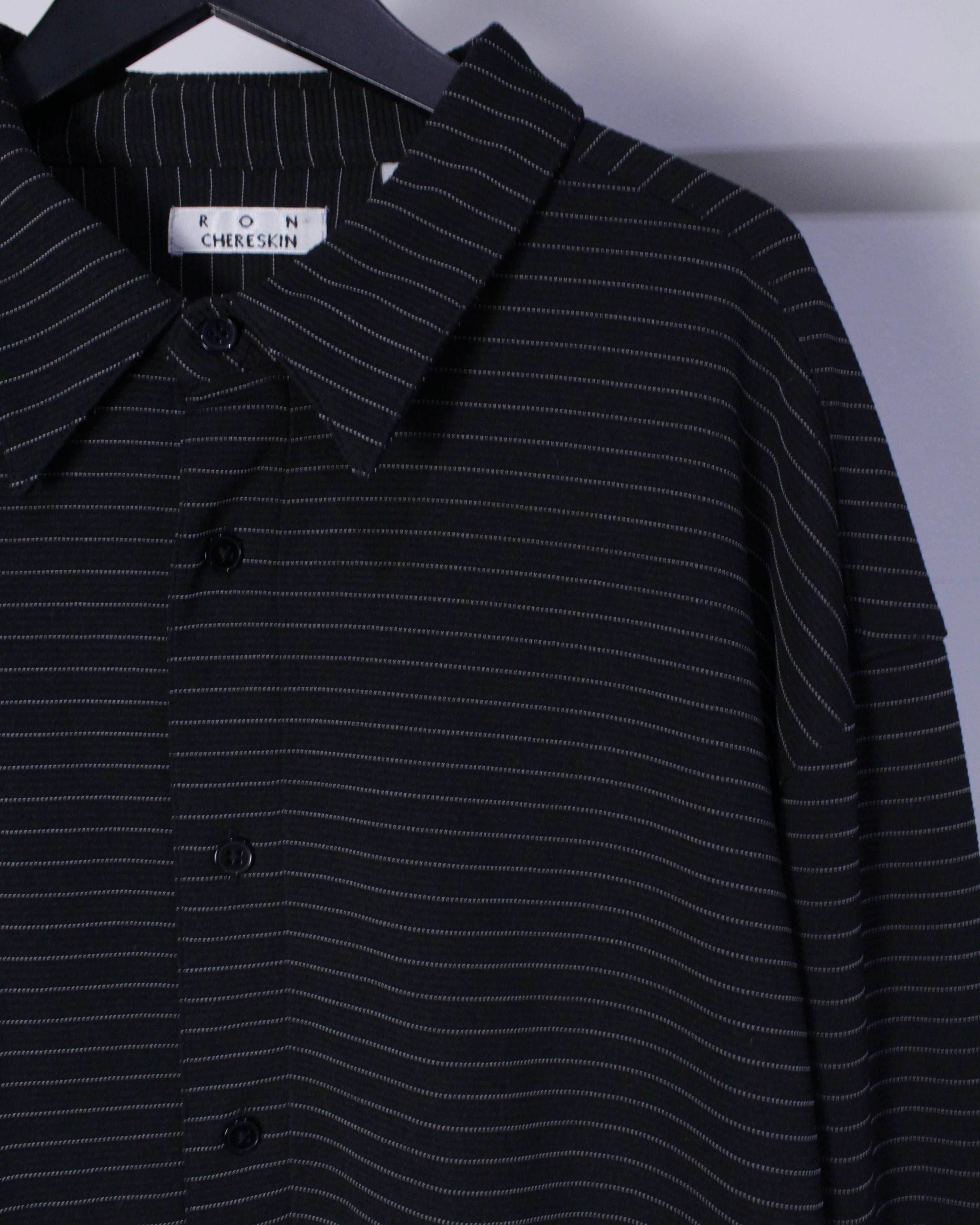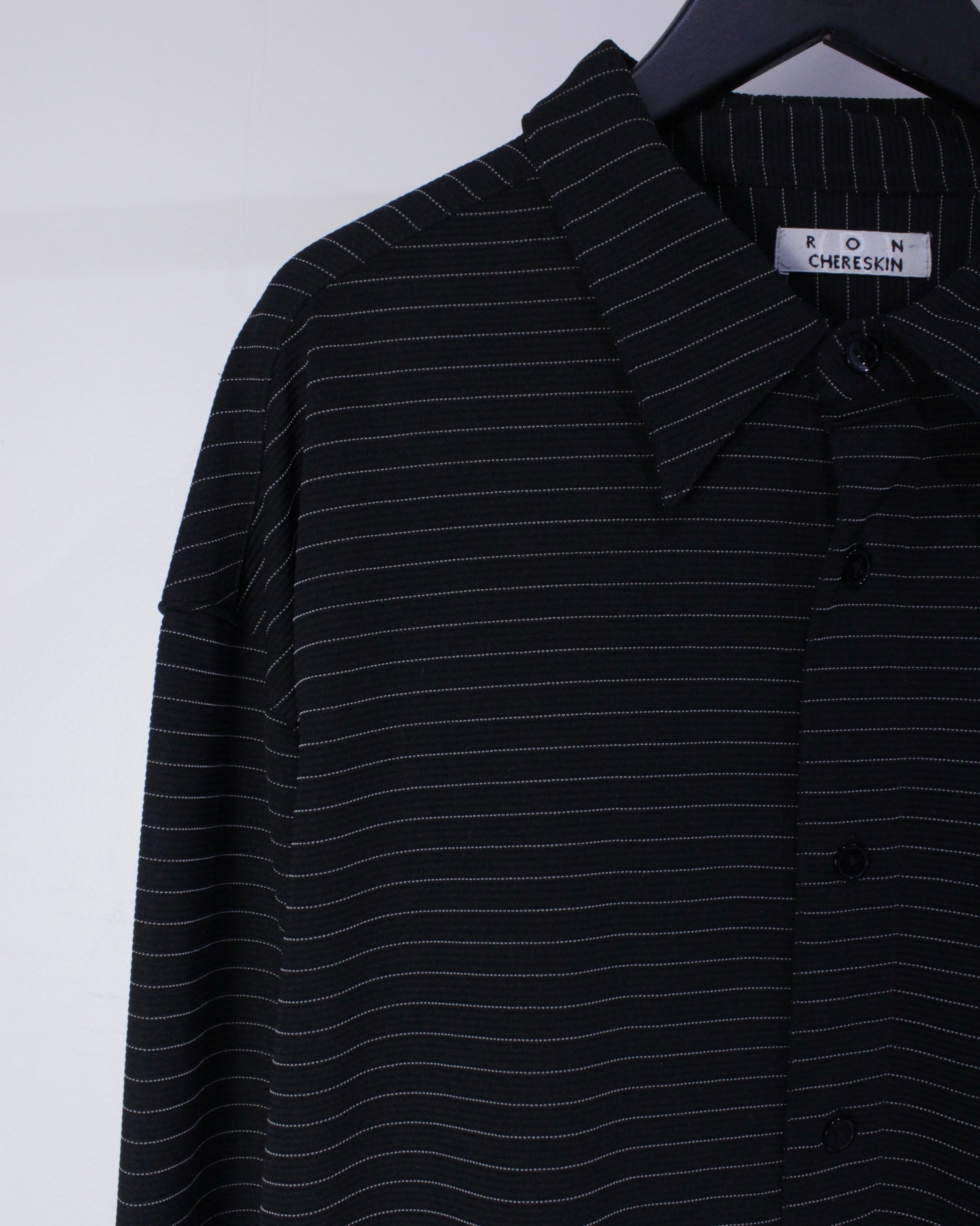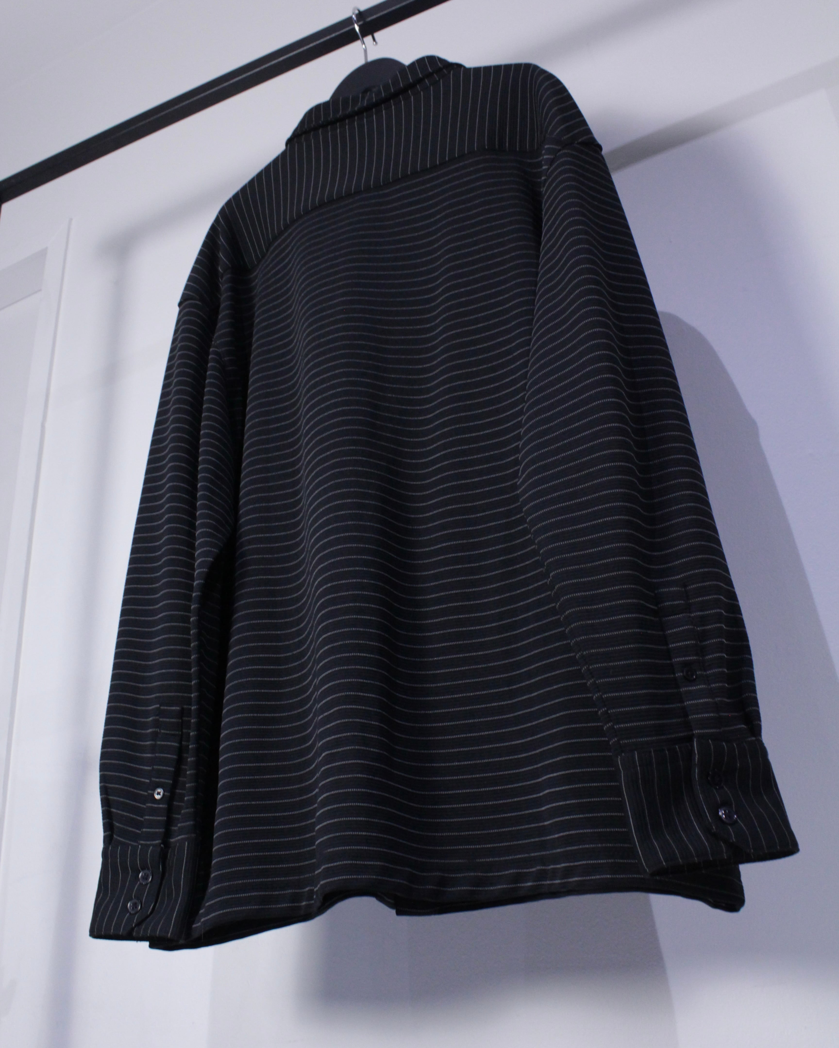 サラリとドライなポリレーヨンの素材を用いたブラックのボディに、ボーダーのデザインを施した長袖シャツ。