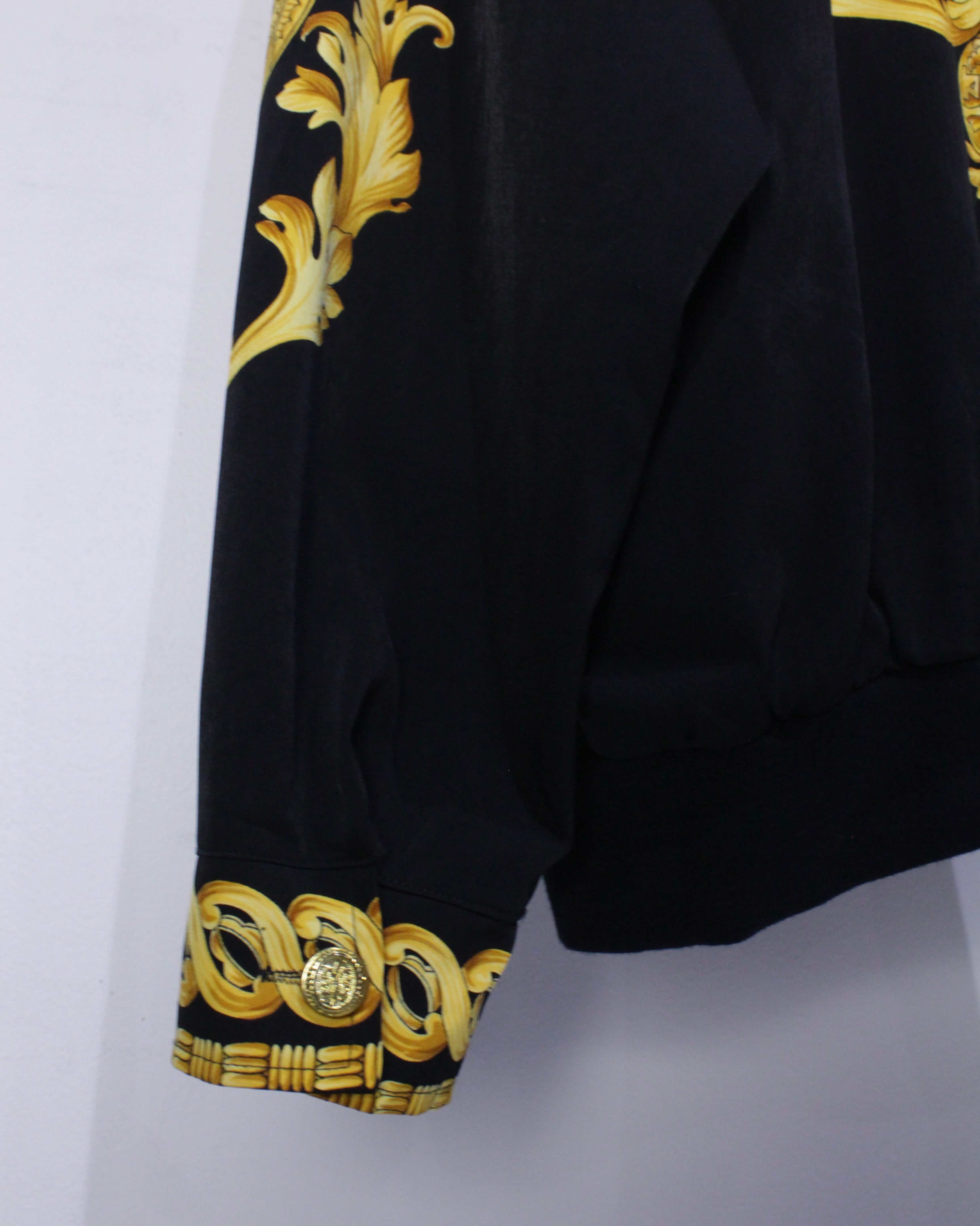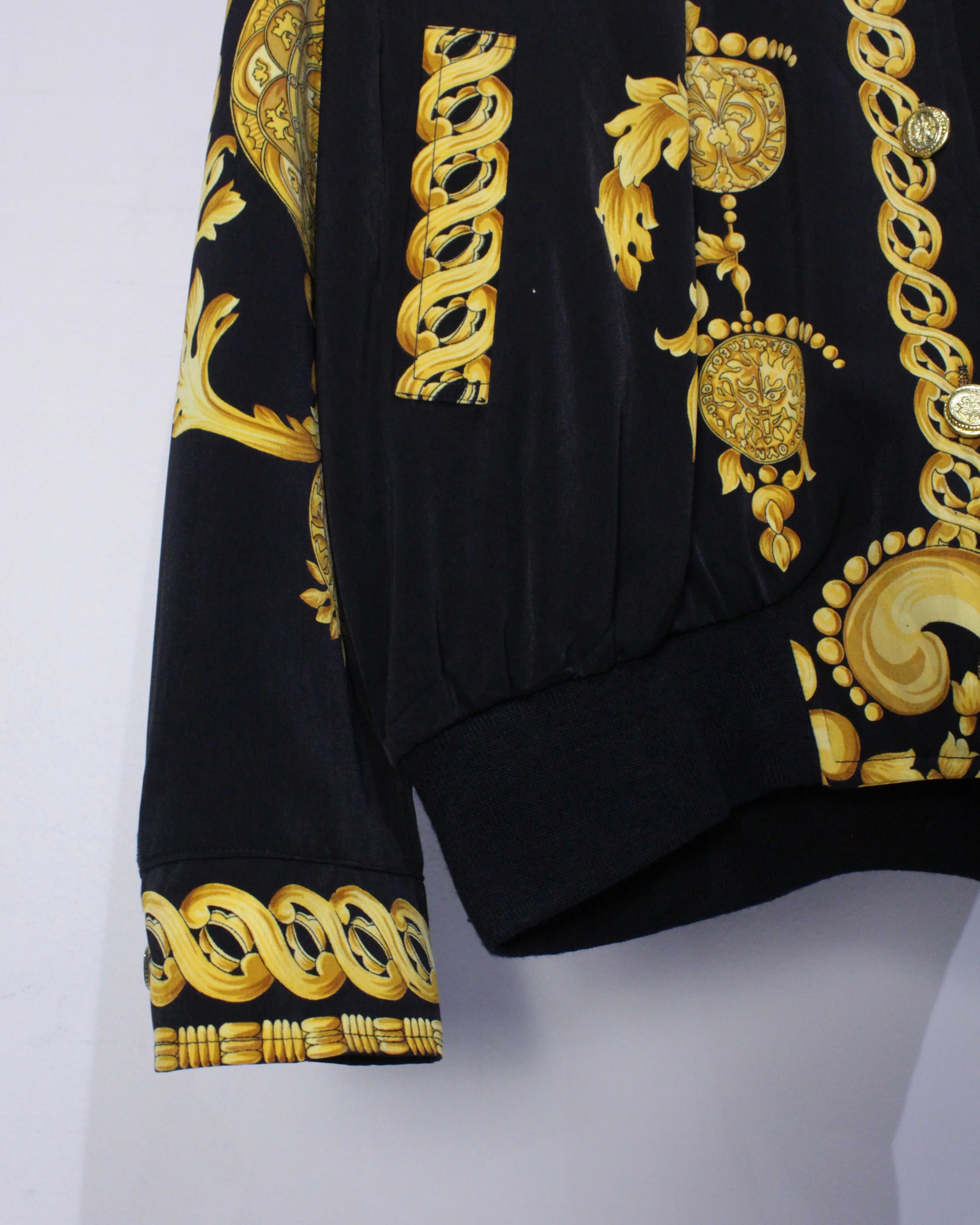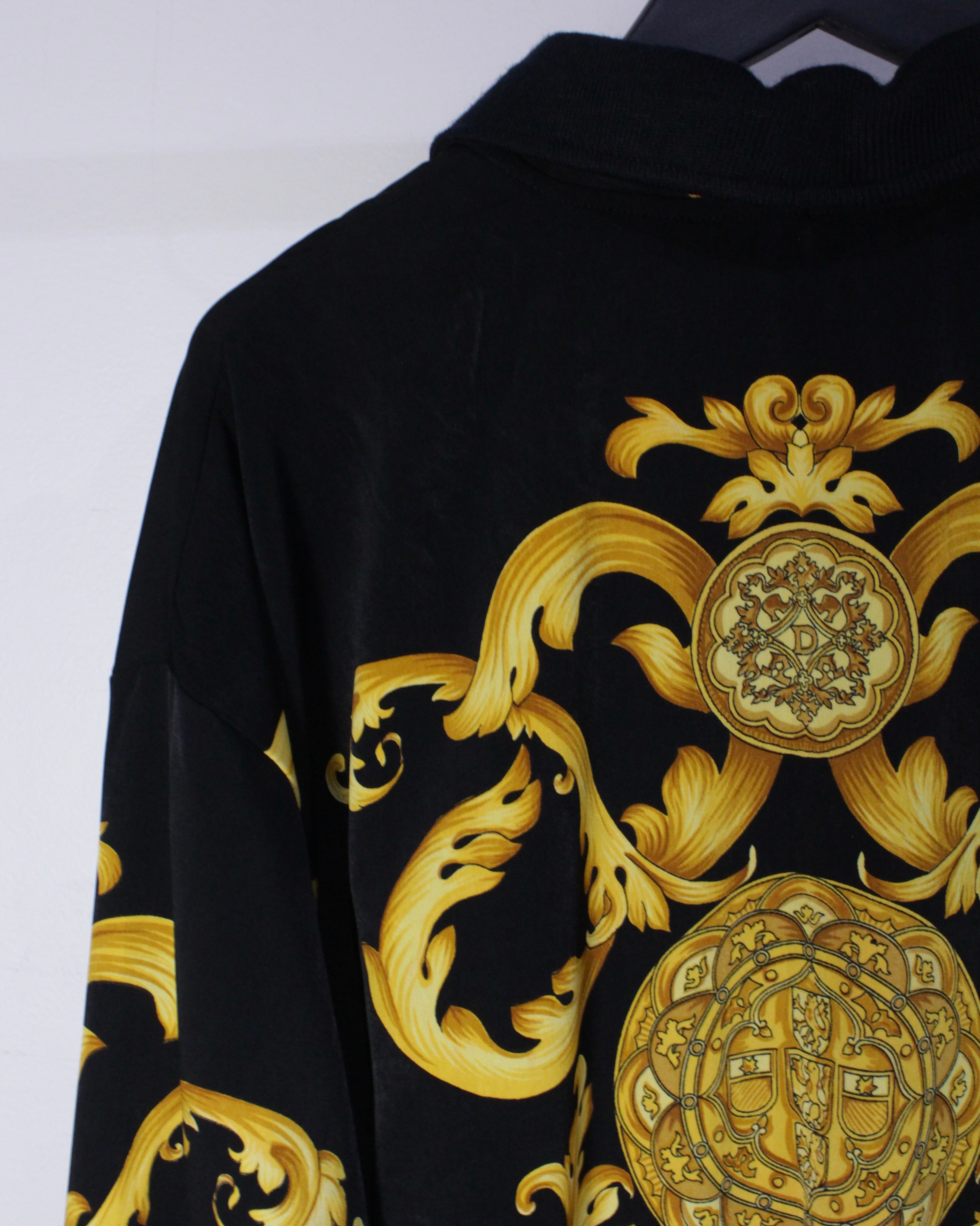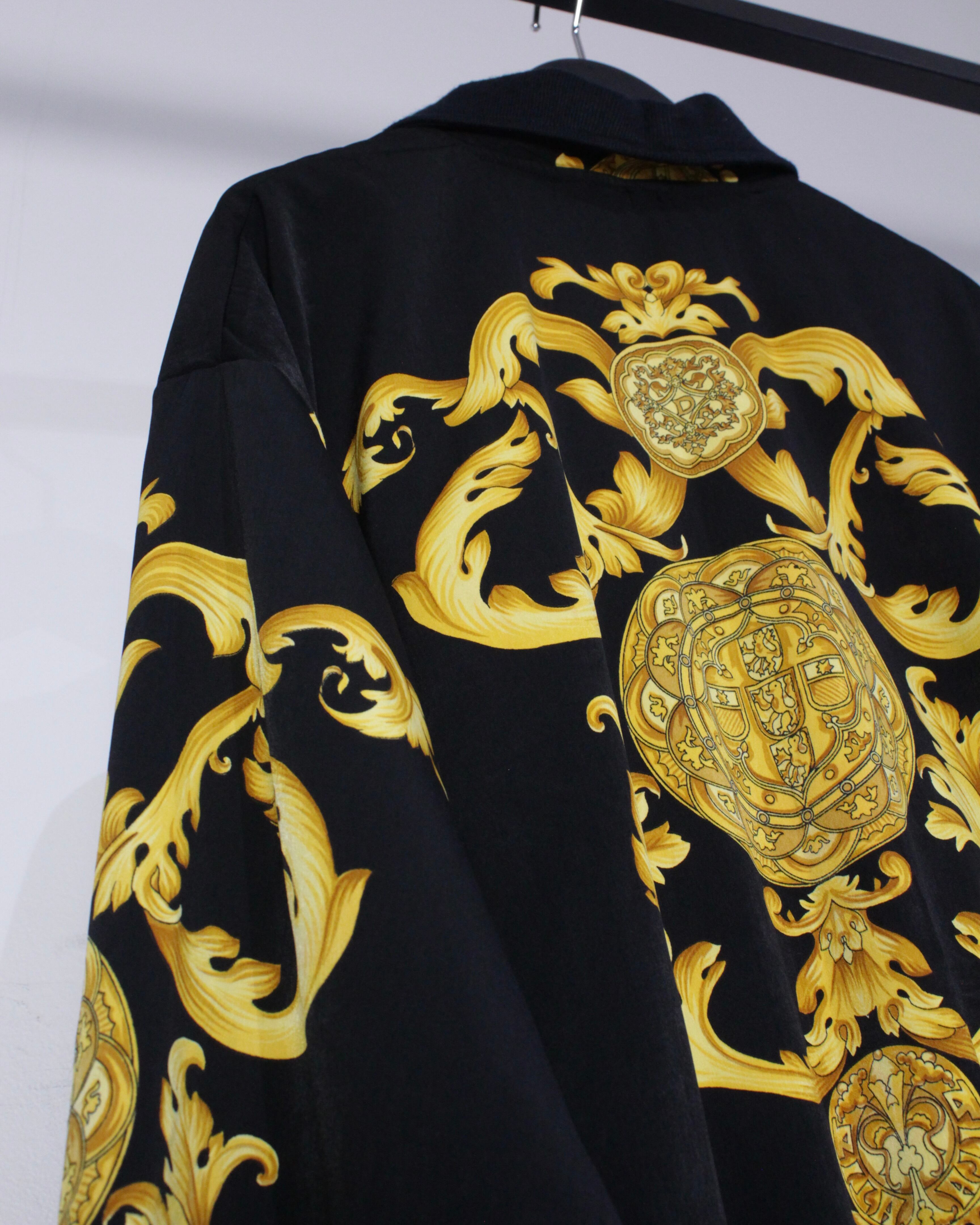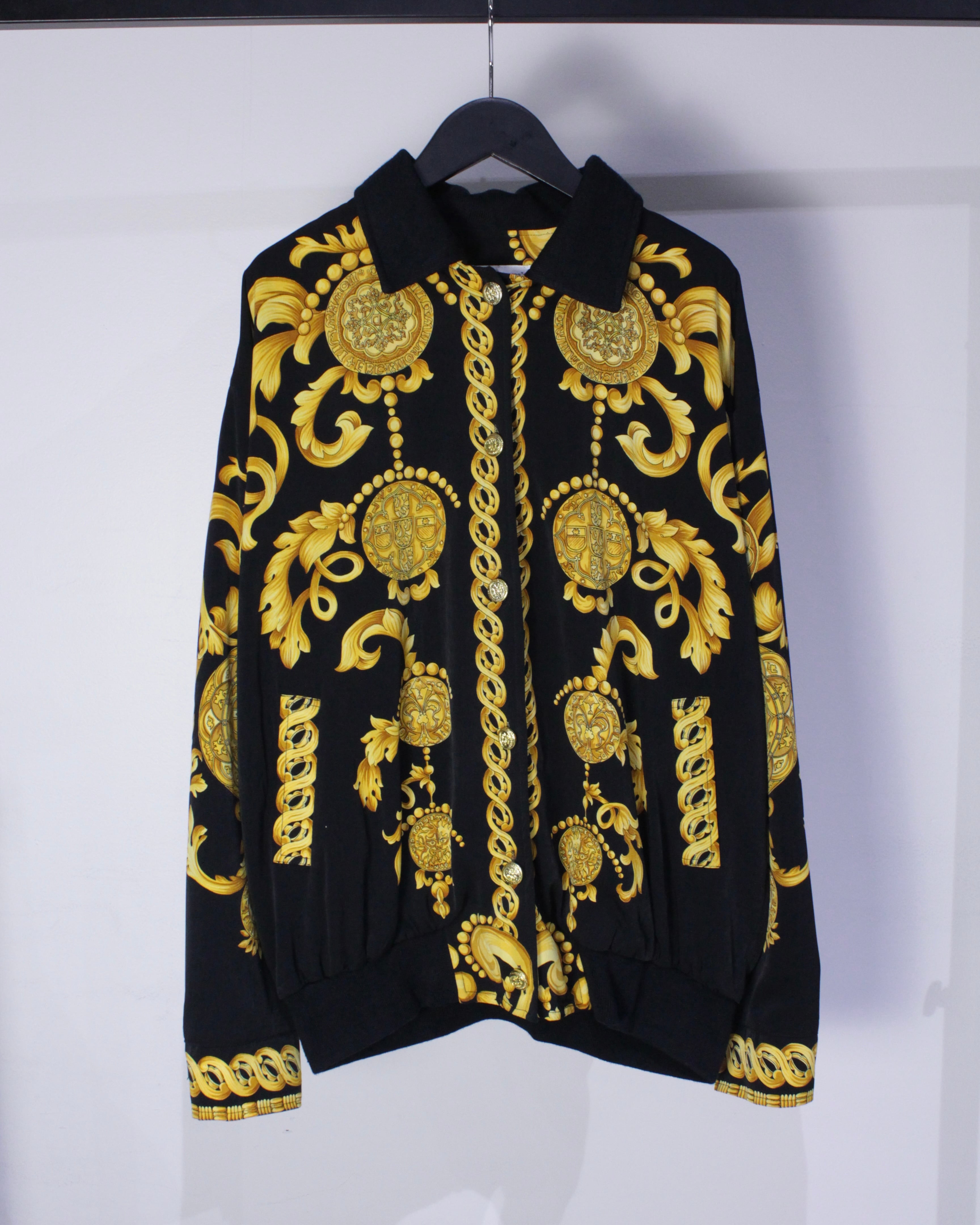 チェーン柄などヴェルサーチ的なテキスタイルが素晴らしく、この手のアイテムの中でも頭ひとつ抜けてクオリティハイな1着です。フロントのゴールドのボタンも高級感を引き立ててくれますね。