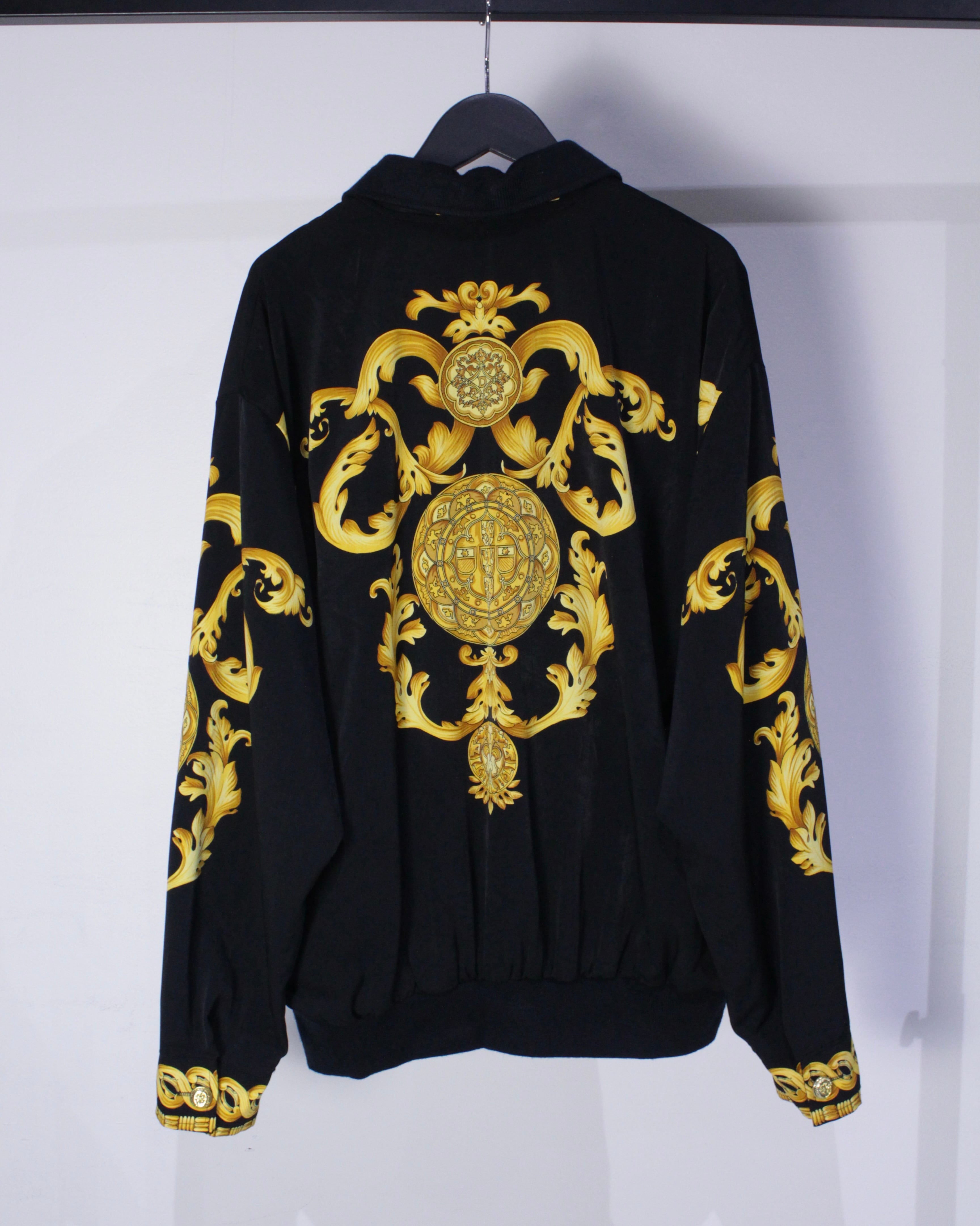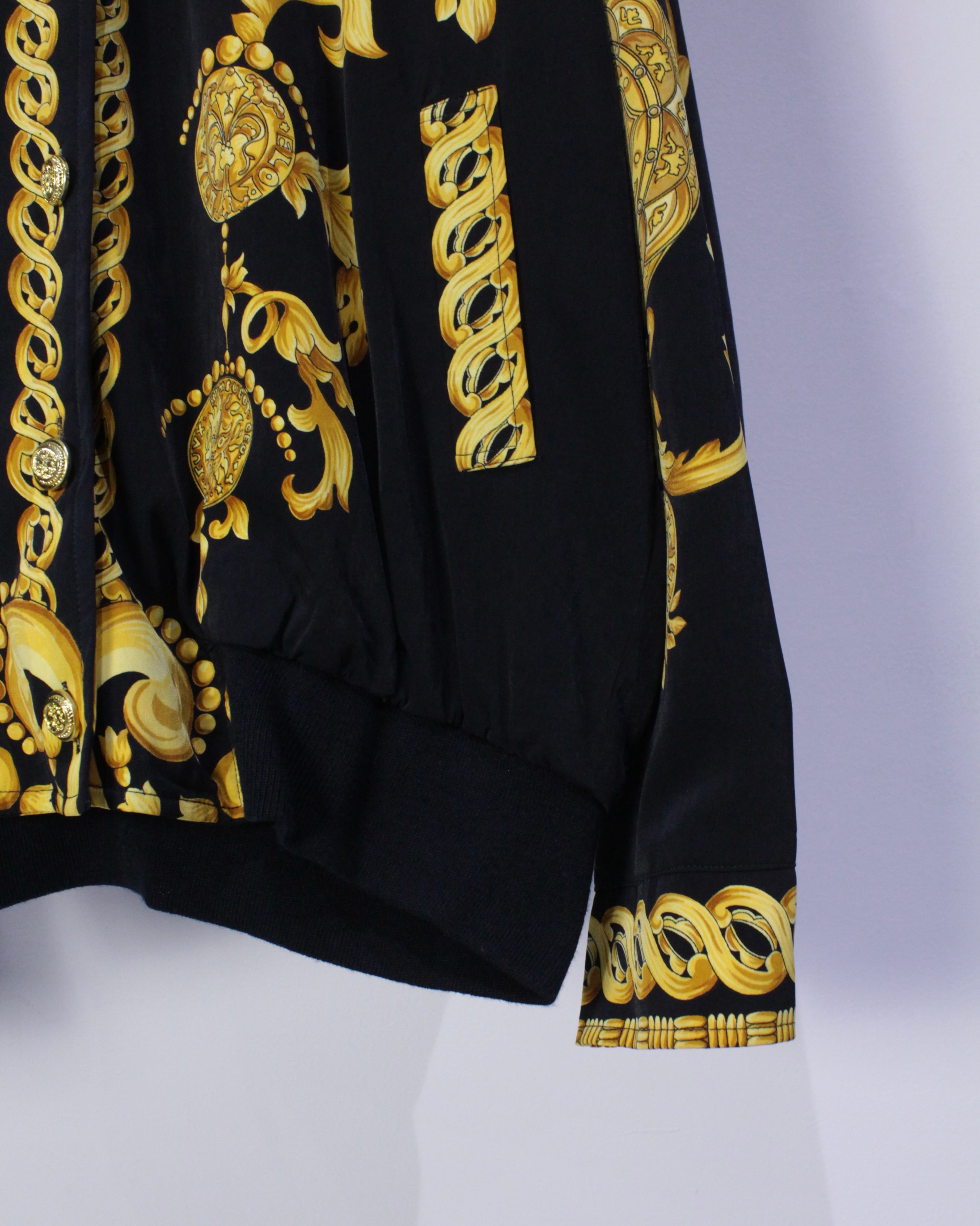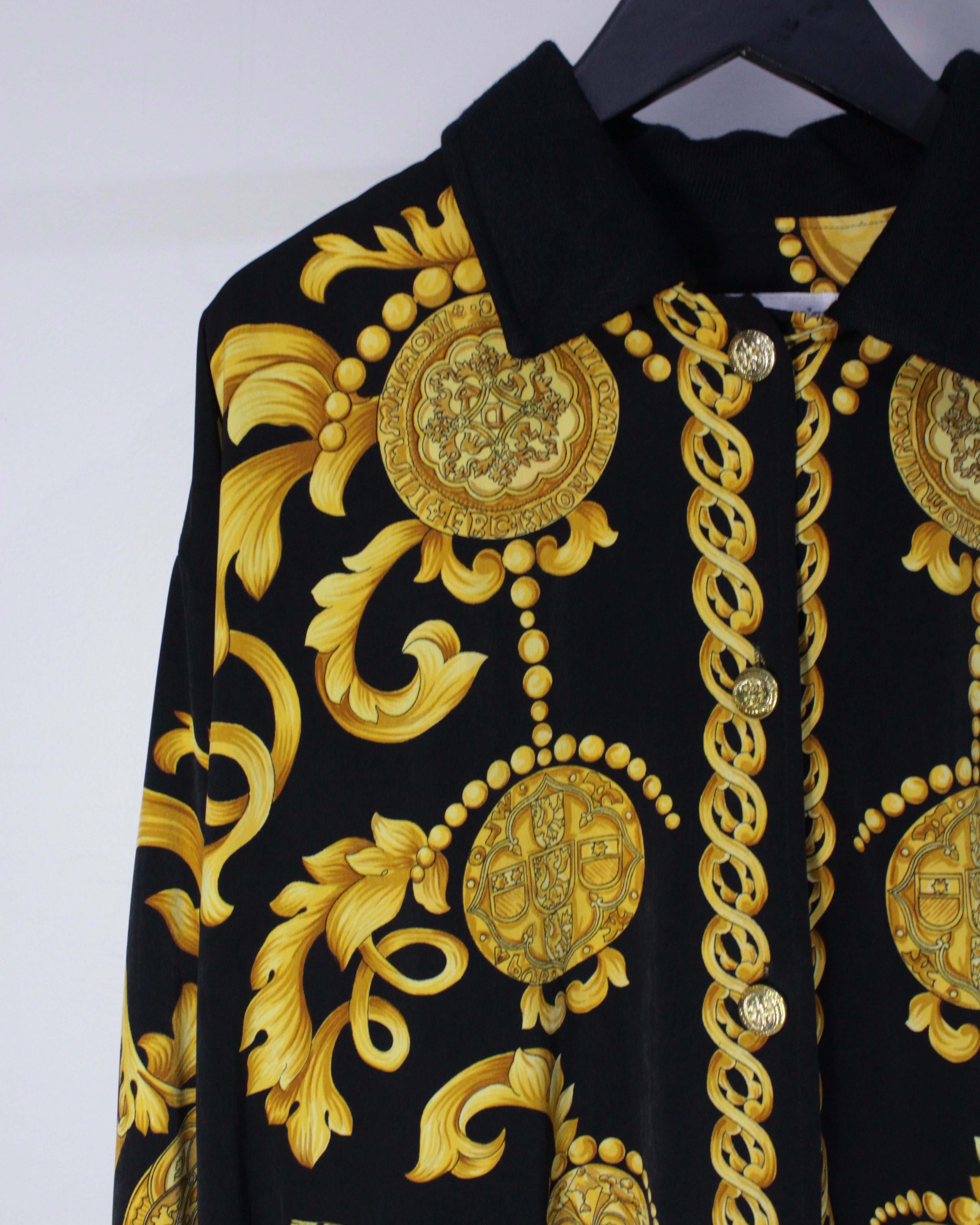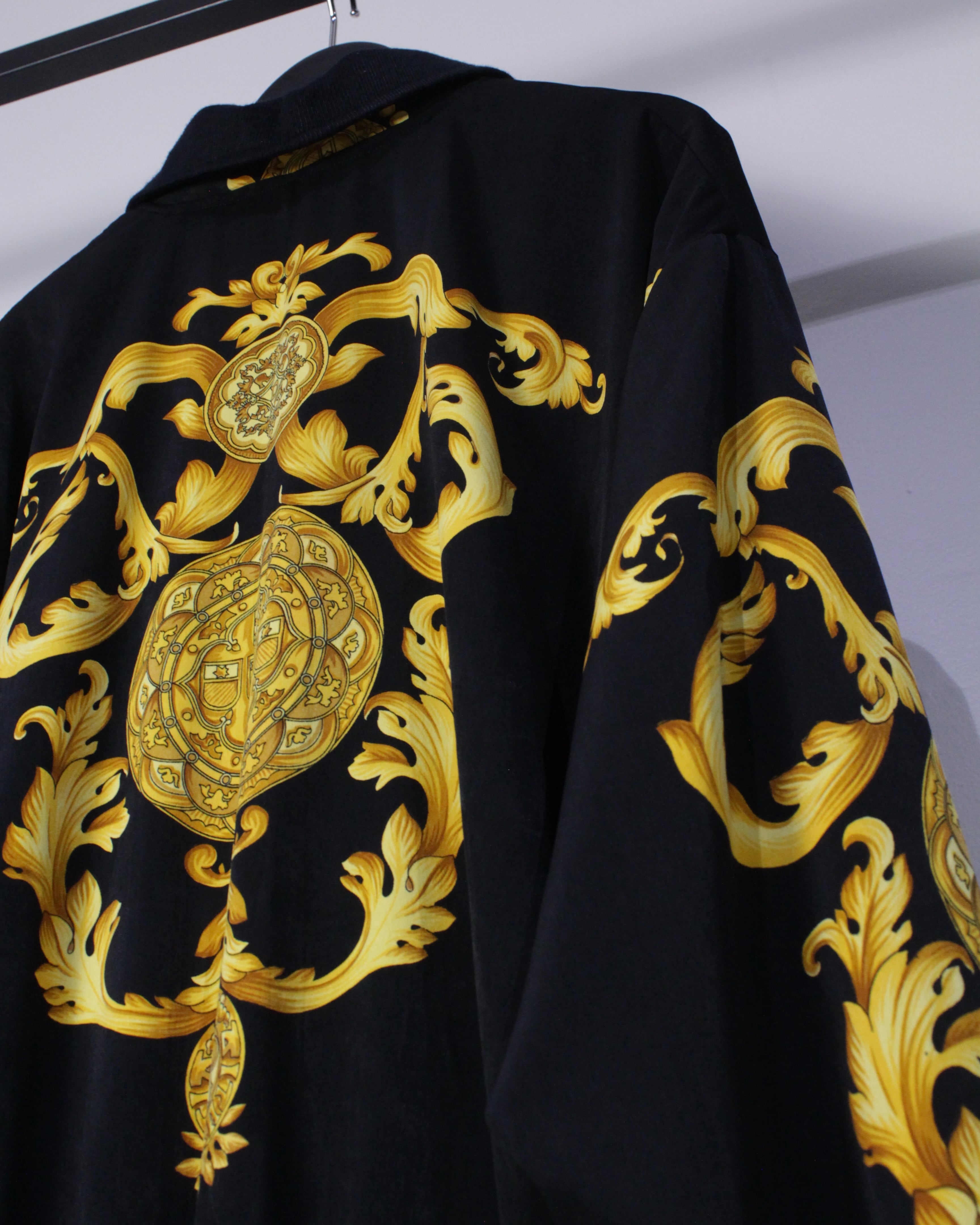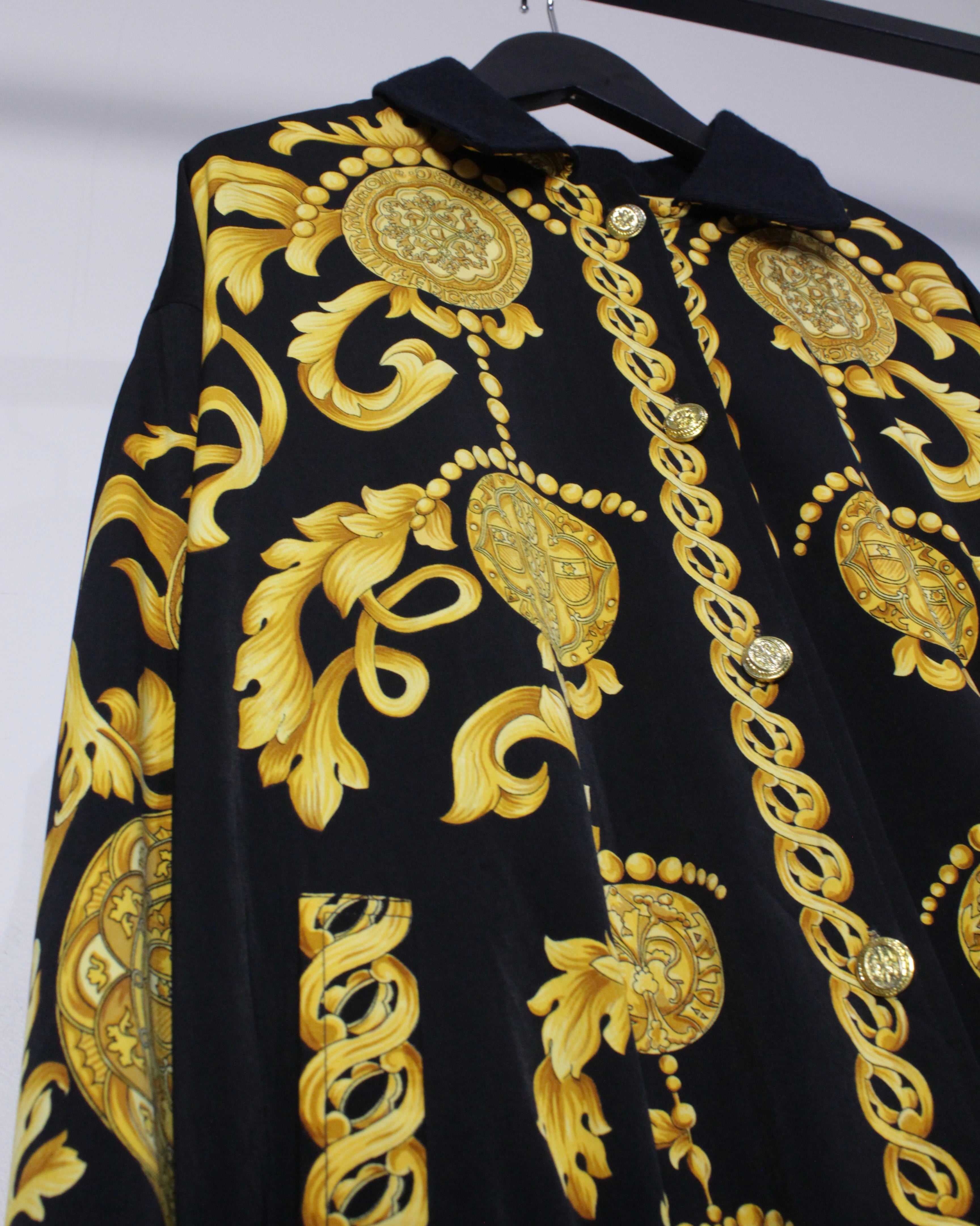チェーン柄などヴェルサーチ的なテキスタイルが素晴らしく、この手のアイテムの中でも頭ひとつ抜けてクオリティハイな1着です。フロントのゴールドのボタンも高級感を引き立ててくれますね。