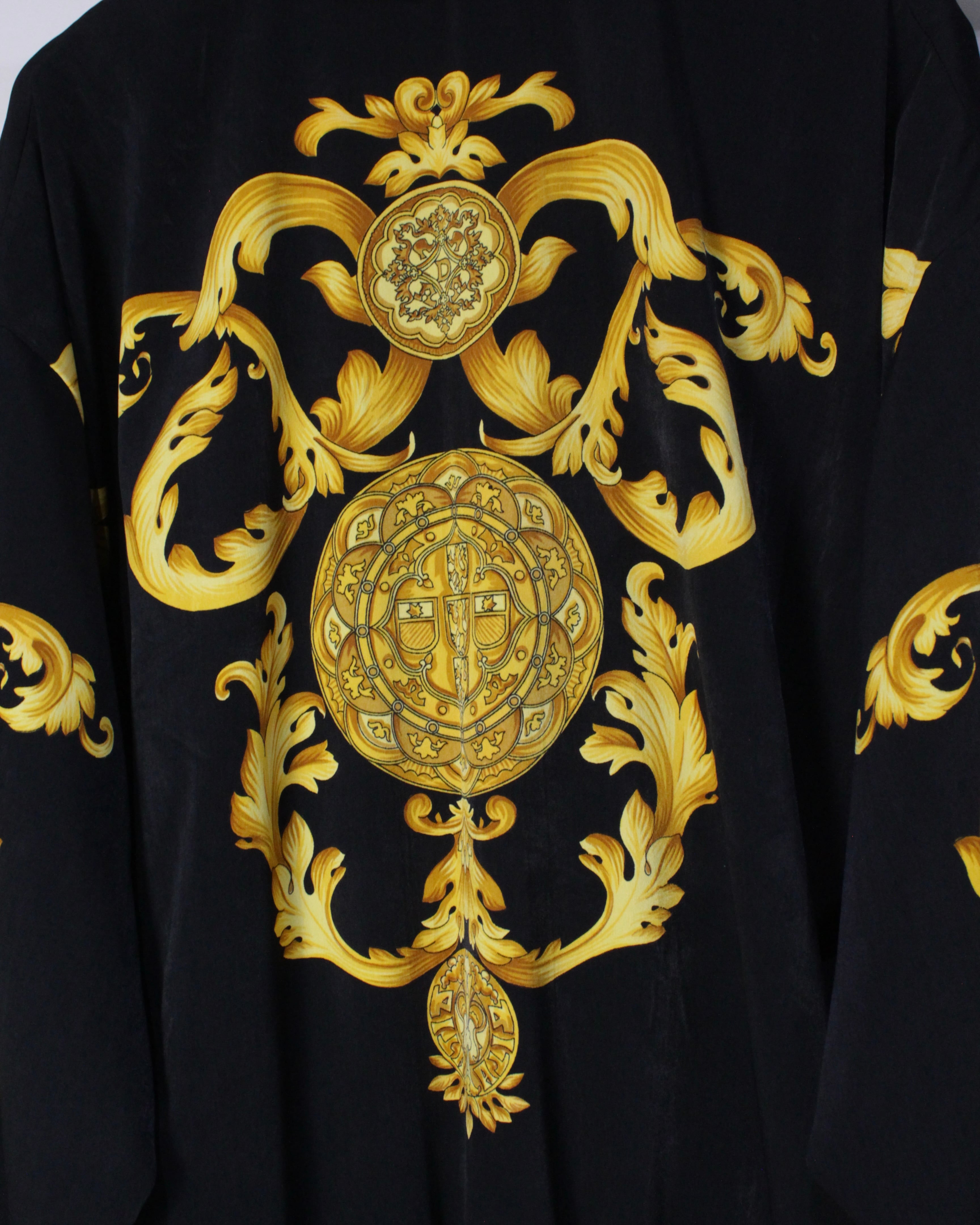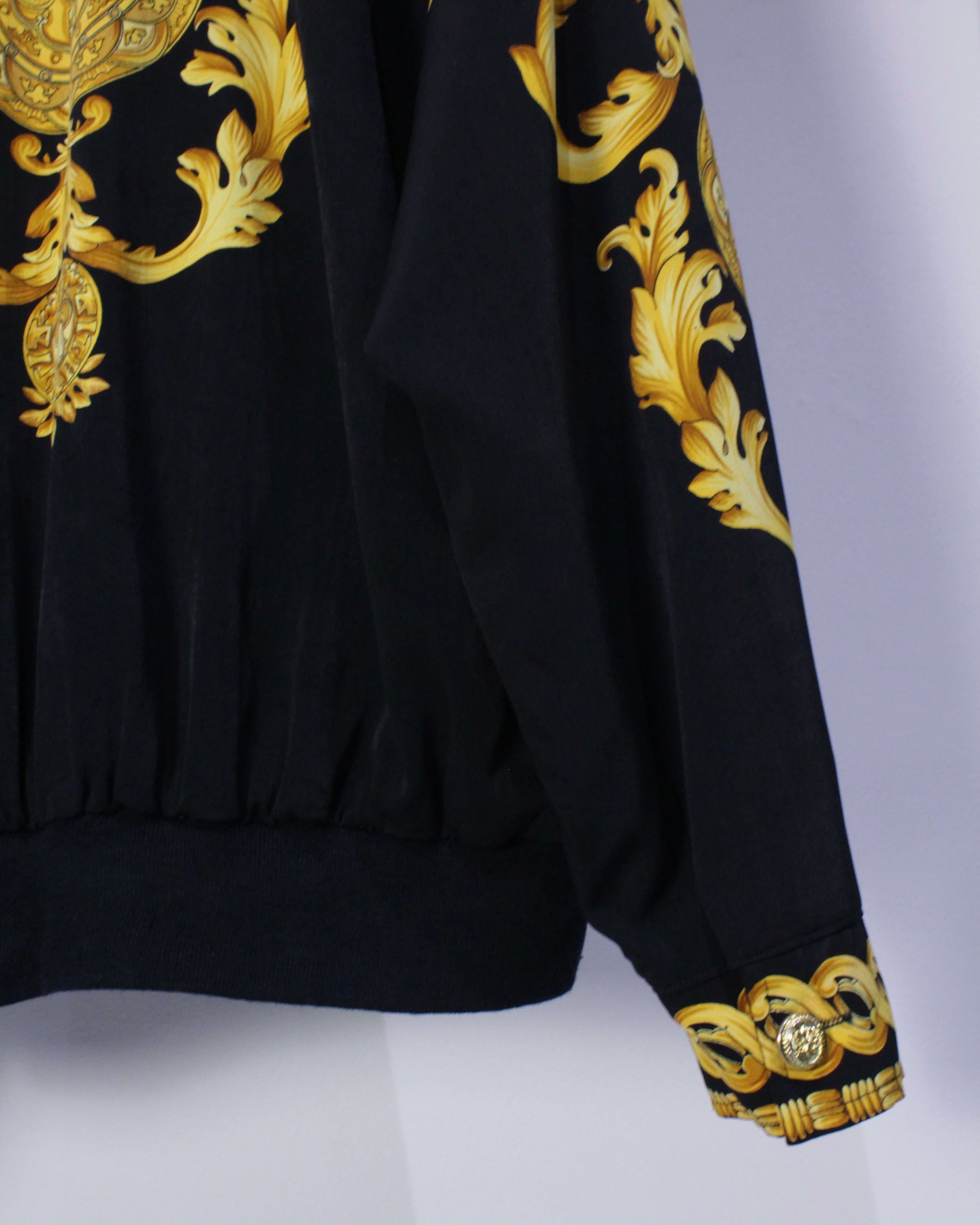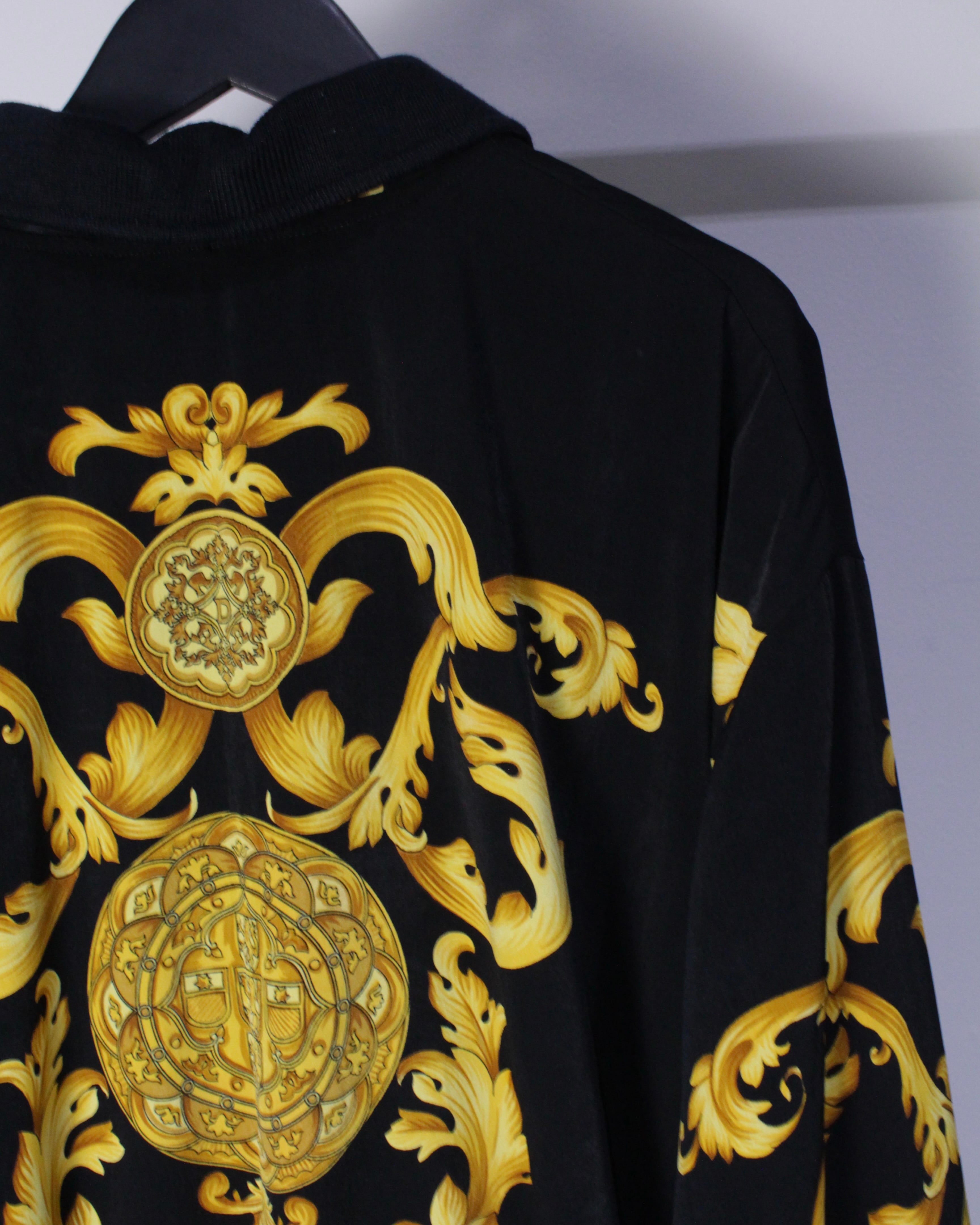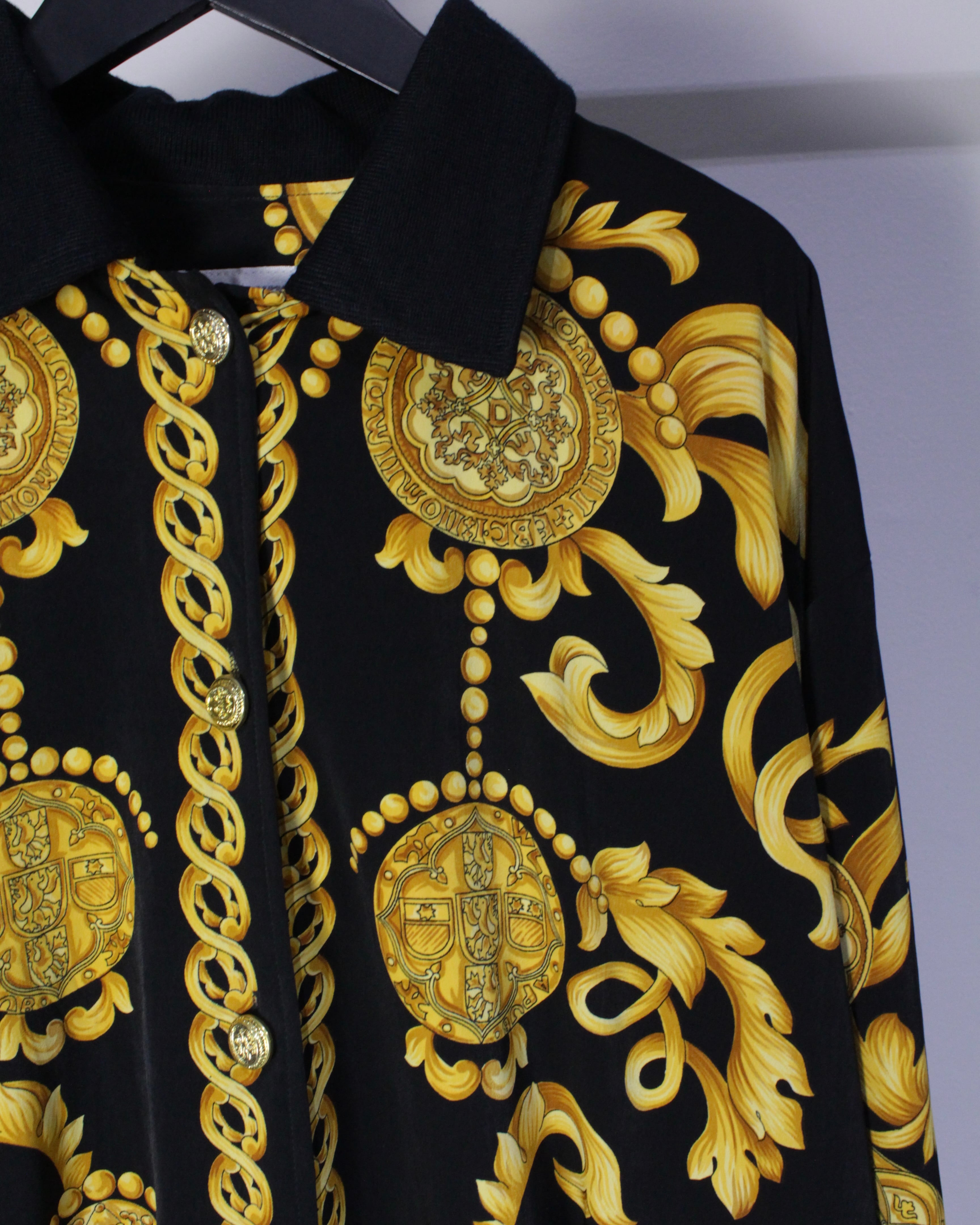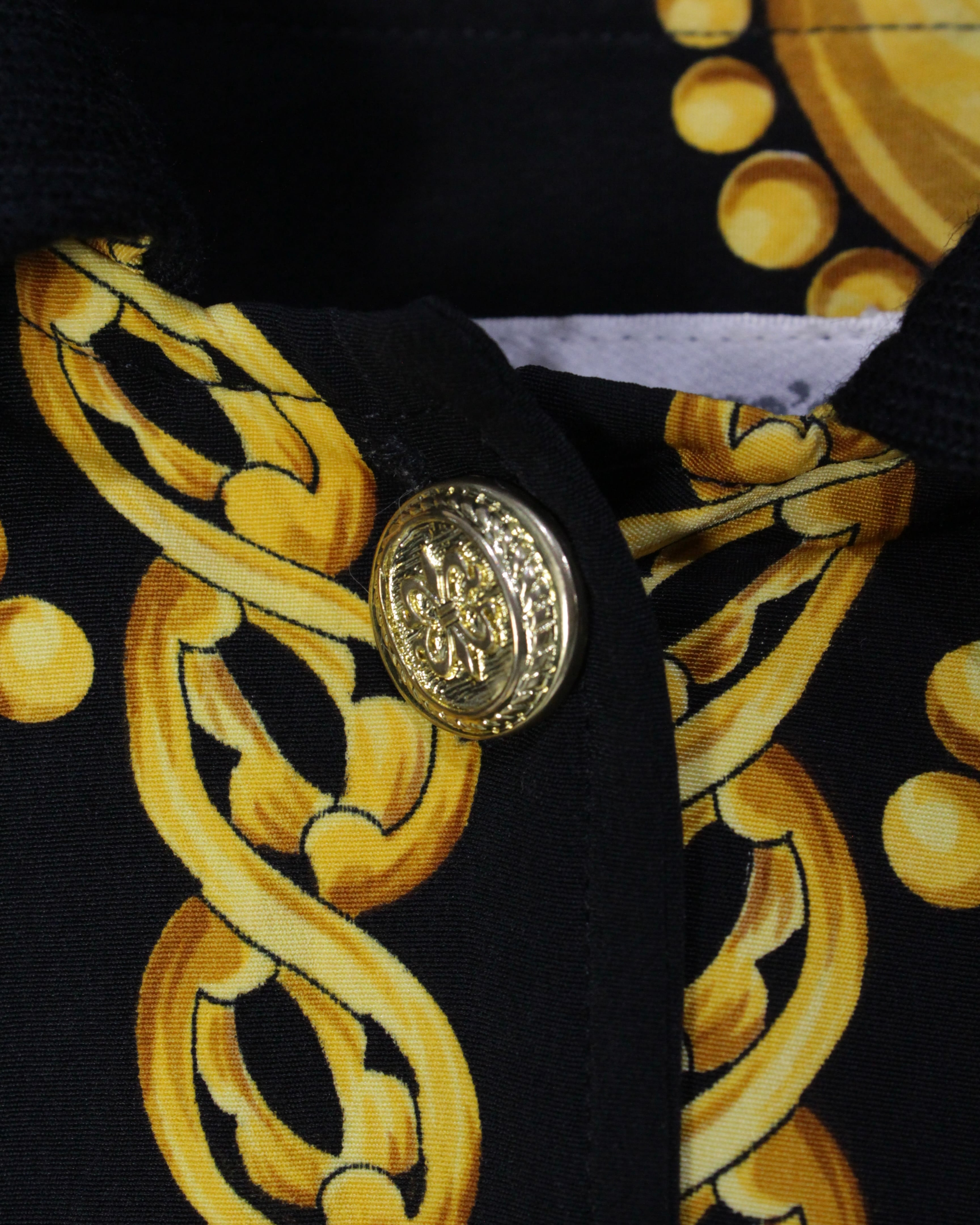 チェーン柄などヴェルサーチ的なテキスタイルが素晴らしく、この手のアイテムの中でも頭ひとつ抜けてクオリティハイな1着です。フロントのゴールドのボタンも高級感を引き立ててくれますね。