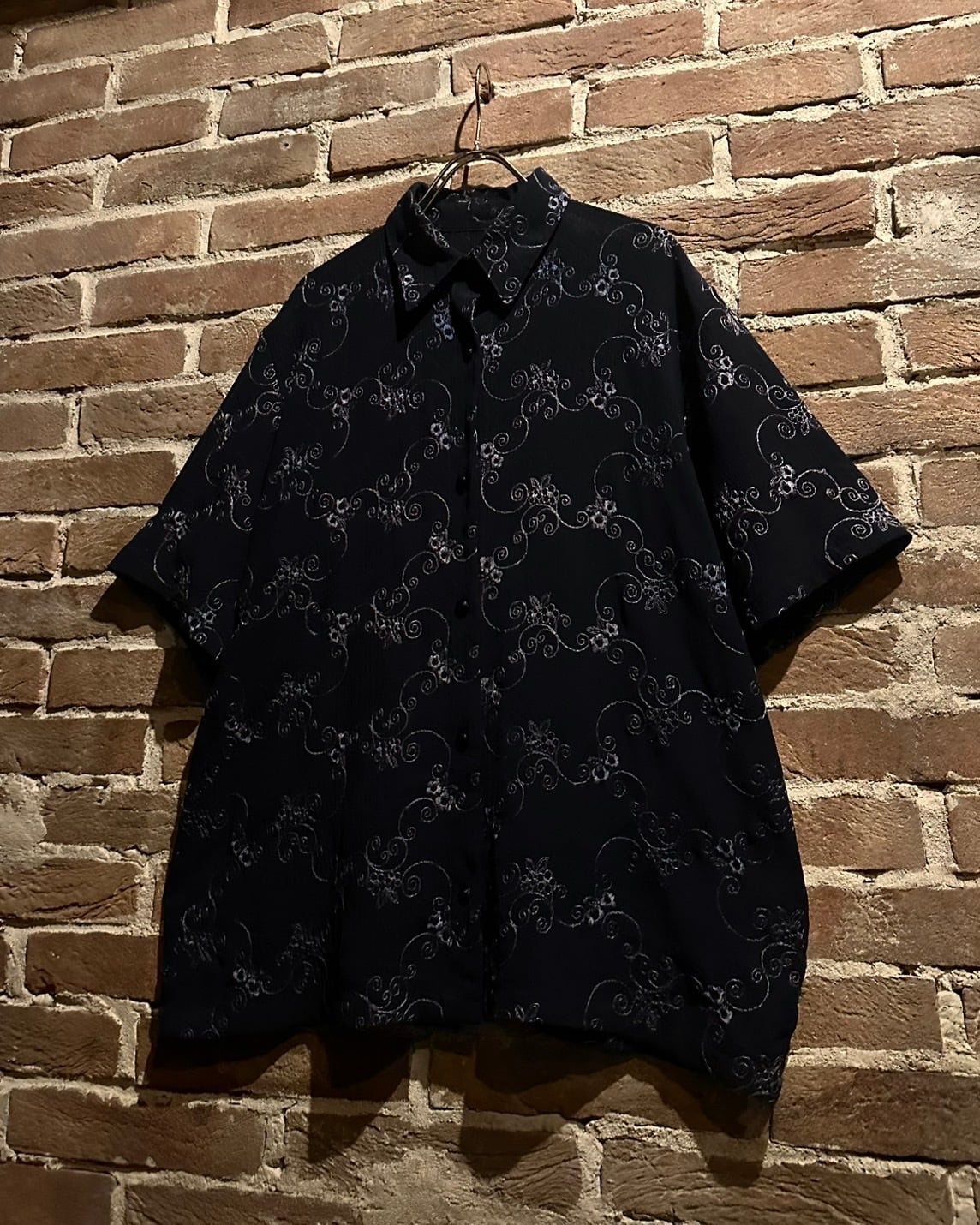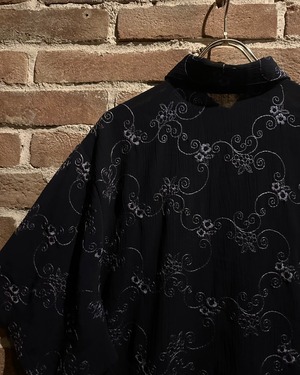 プリーツのように畝のあるブラックのボディに、花柄などボタニカルな刺繍を刻んだ半袖シャツ。