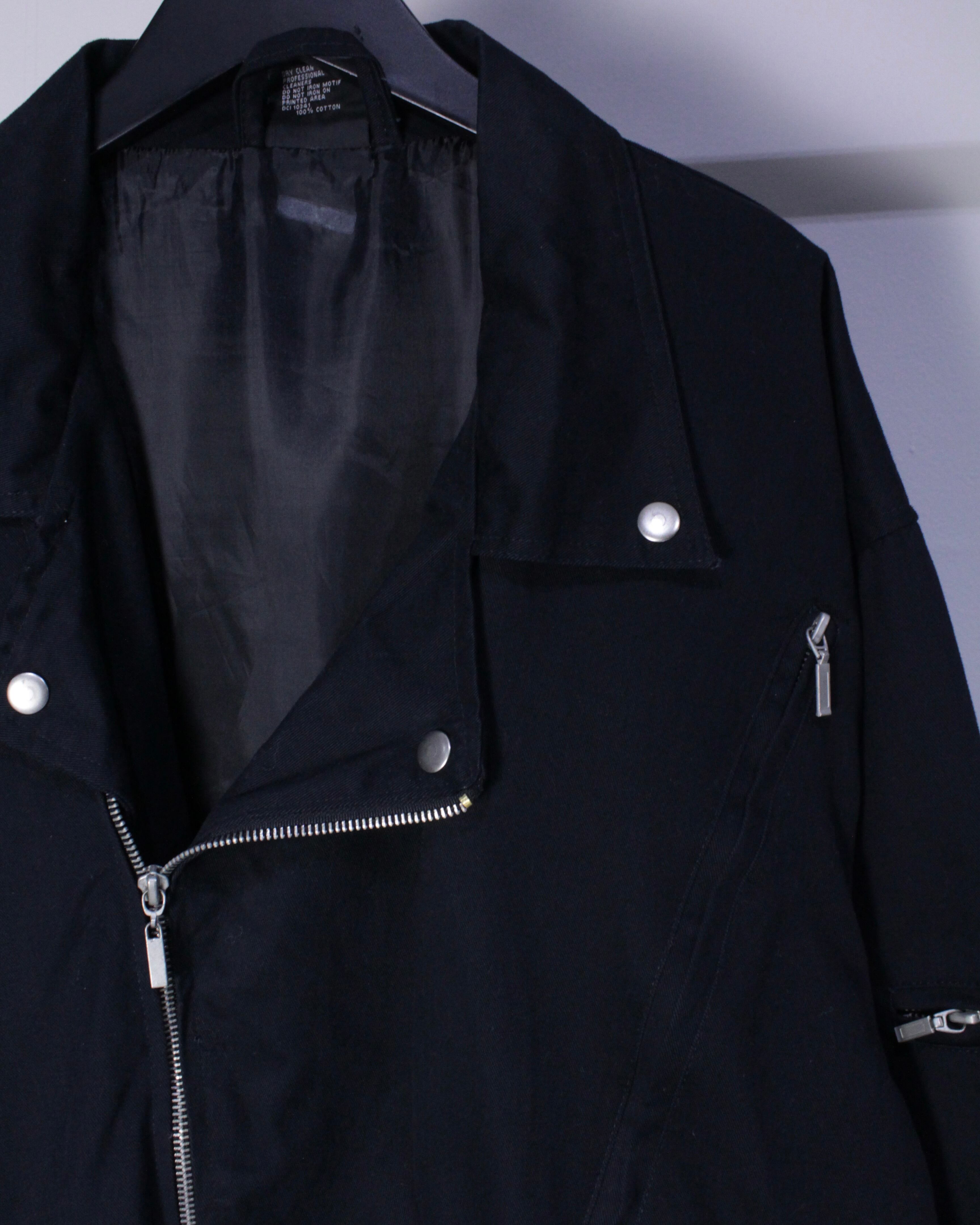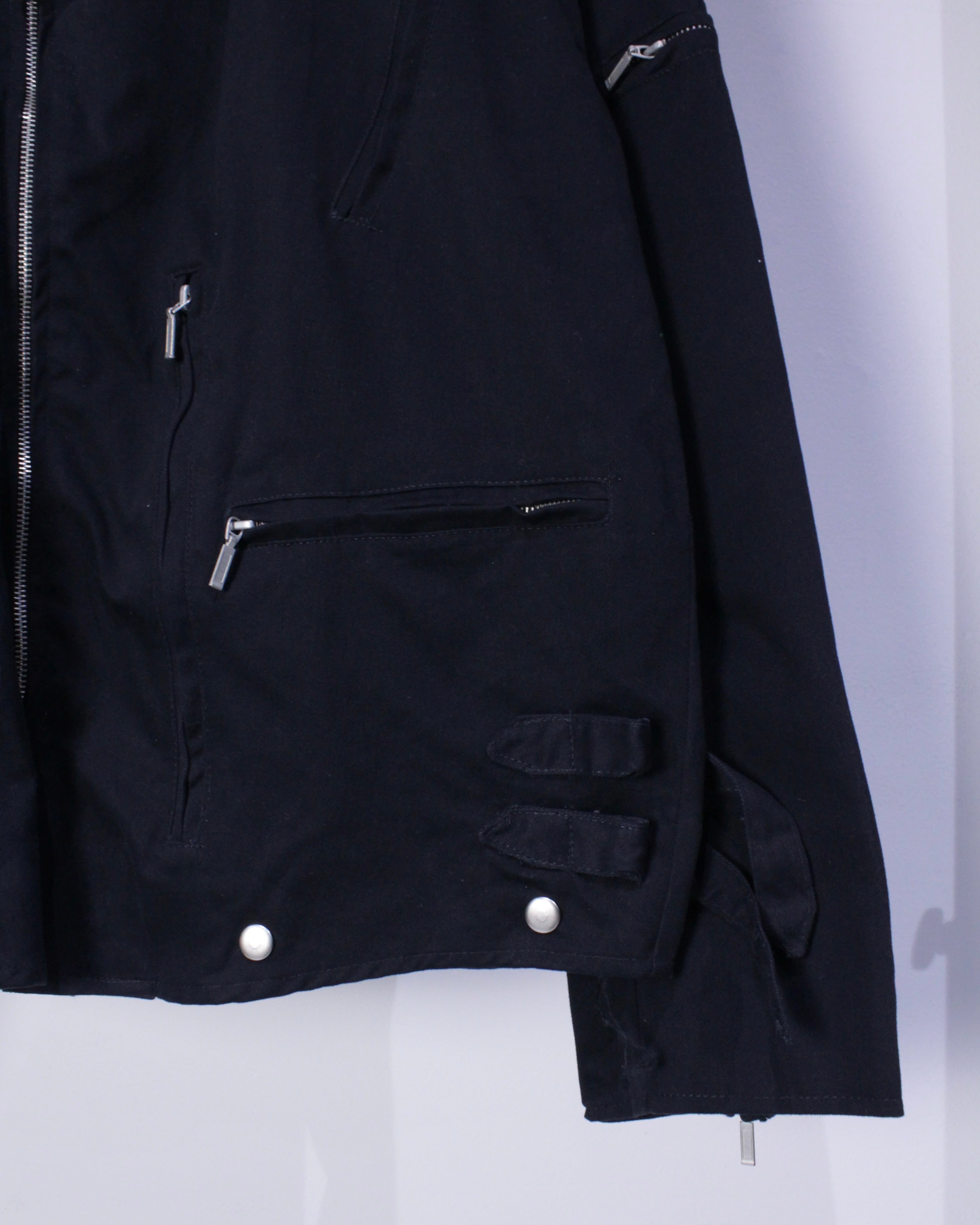 フロントのジップに大ぶりな襟、そしてボディの随所にはジップポケットのギミック。ボディサイドにはベルトが付属しており、ギュッと絞ることでシルエットに変化をつけることができます。