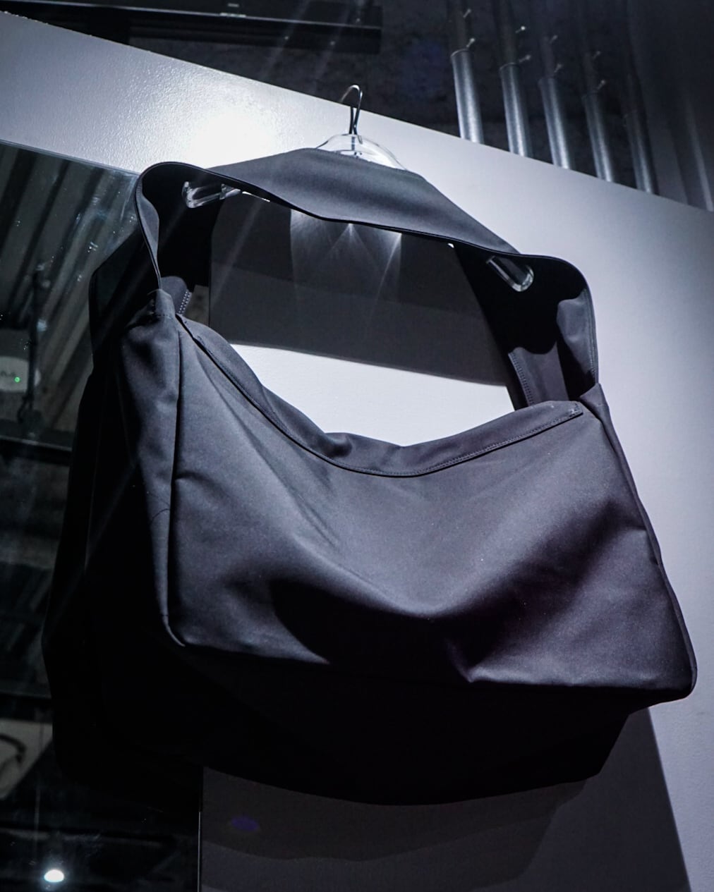 マチ両サイドには折り畳み傘やボトル等を入れることが可能。メイン素材は工業用プレス機でボンディング加工された特殊な3層構造ポリエステル。真ん中にラバーが仕込まれており、弾力性があります。