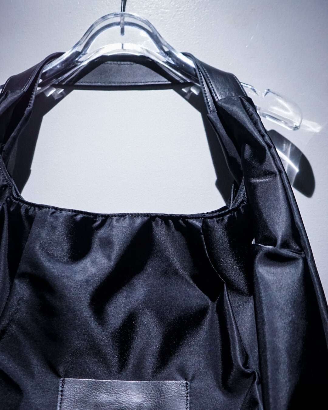 裏地にはテック系アウトドアのアウターなどにも採用される、高強度の66ナイロンを使用した極薄の素材を使用し、表生地も同じく強度はありながら柔らかく、手触りしなやかな仕上がりに。これら二つの生地が丁度よく重なることで、まるで衣服の延長のように、重力に沿った「ドレープ感」を生み出しています。
