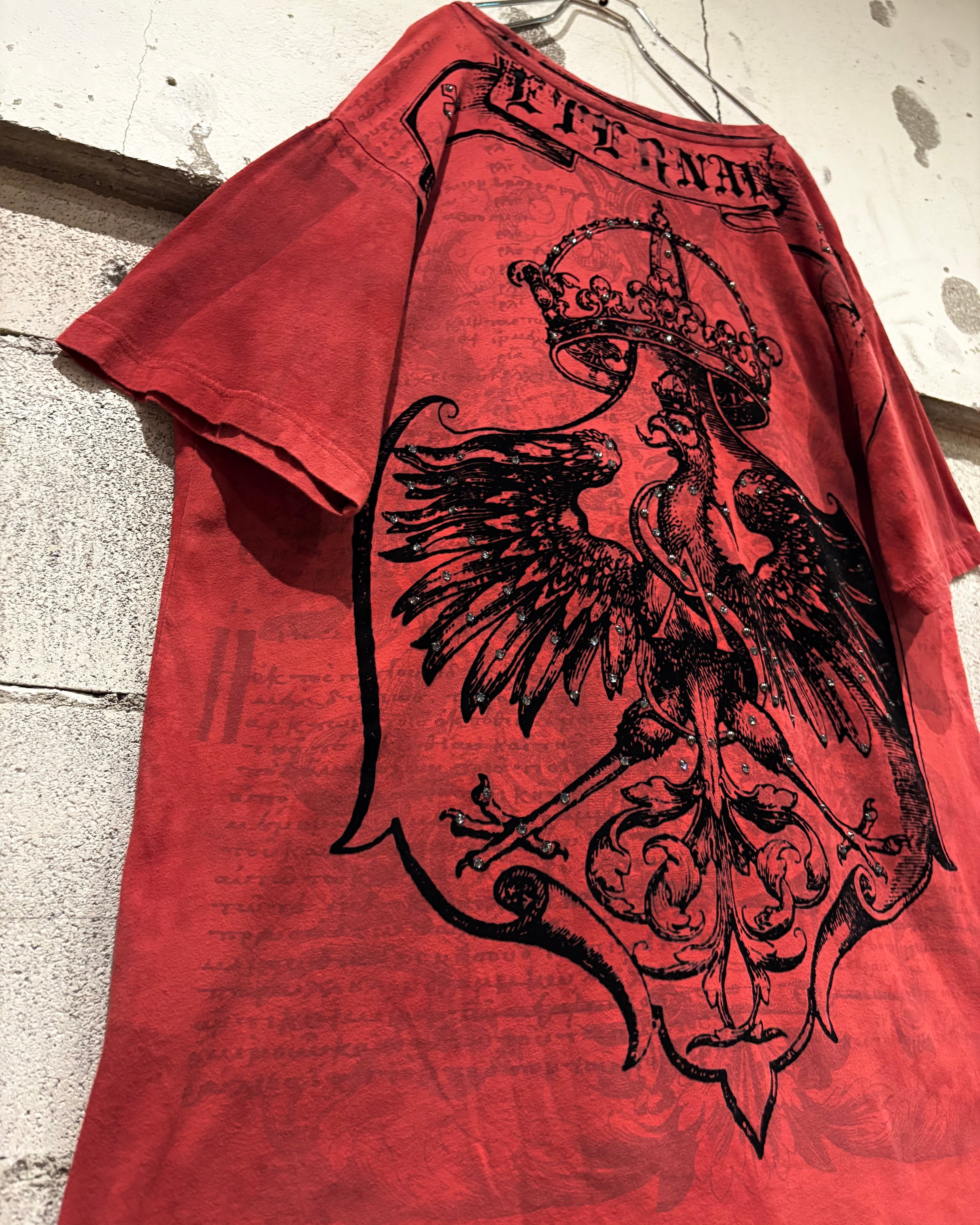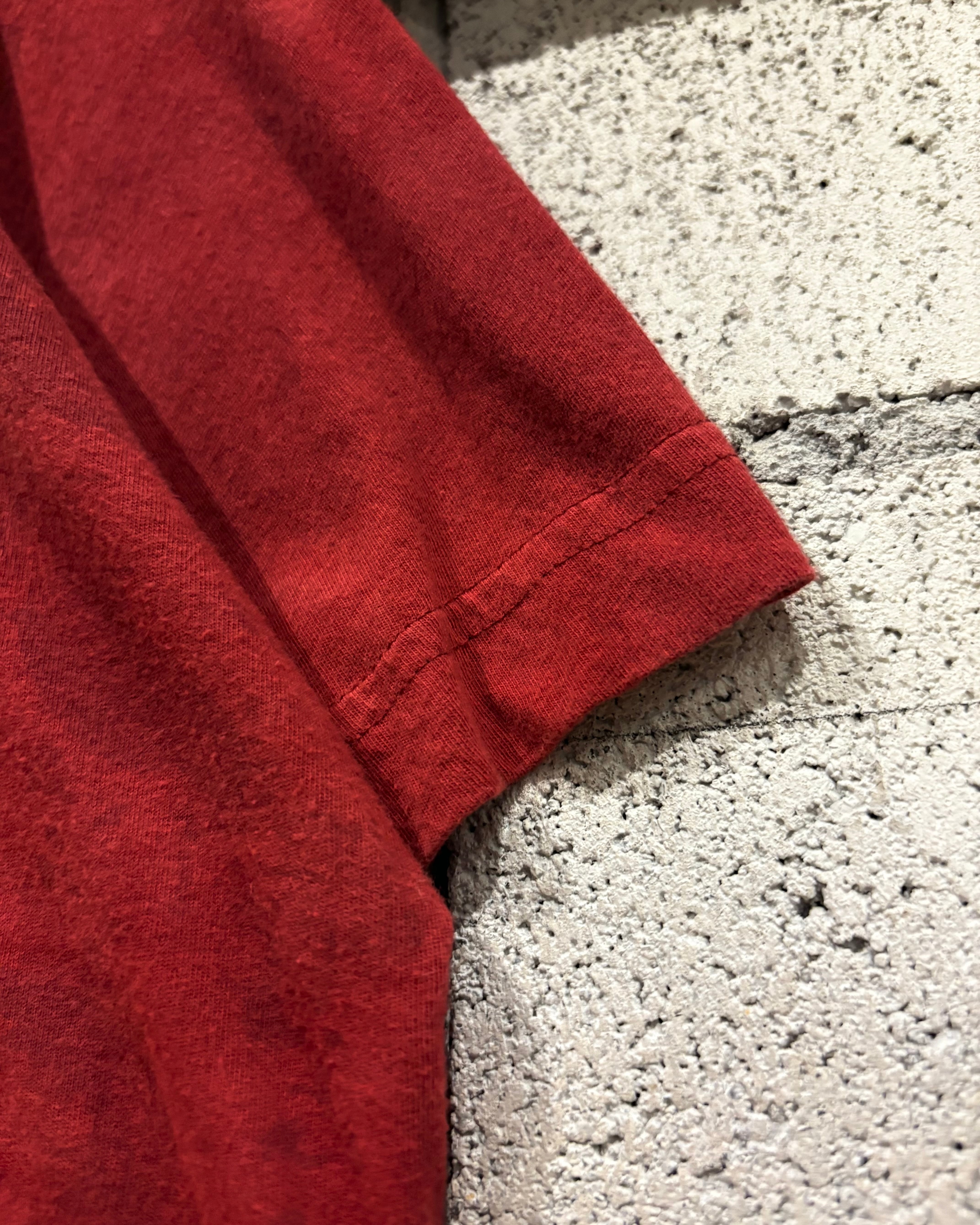 レタリングのデザインをベースにフェードがかかった赤のボディ。加えて起毛感のあるフロッキープリントでボタニカルやエンブレムのデザインを載せた1着。