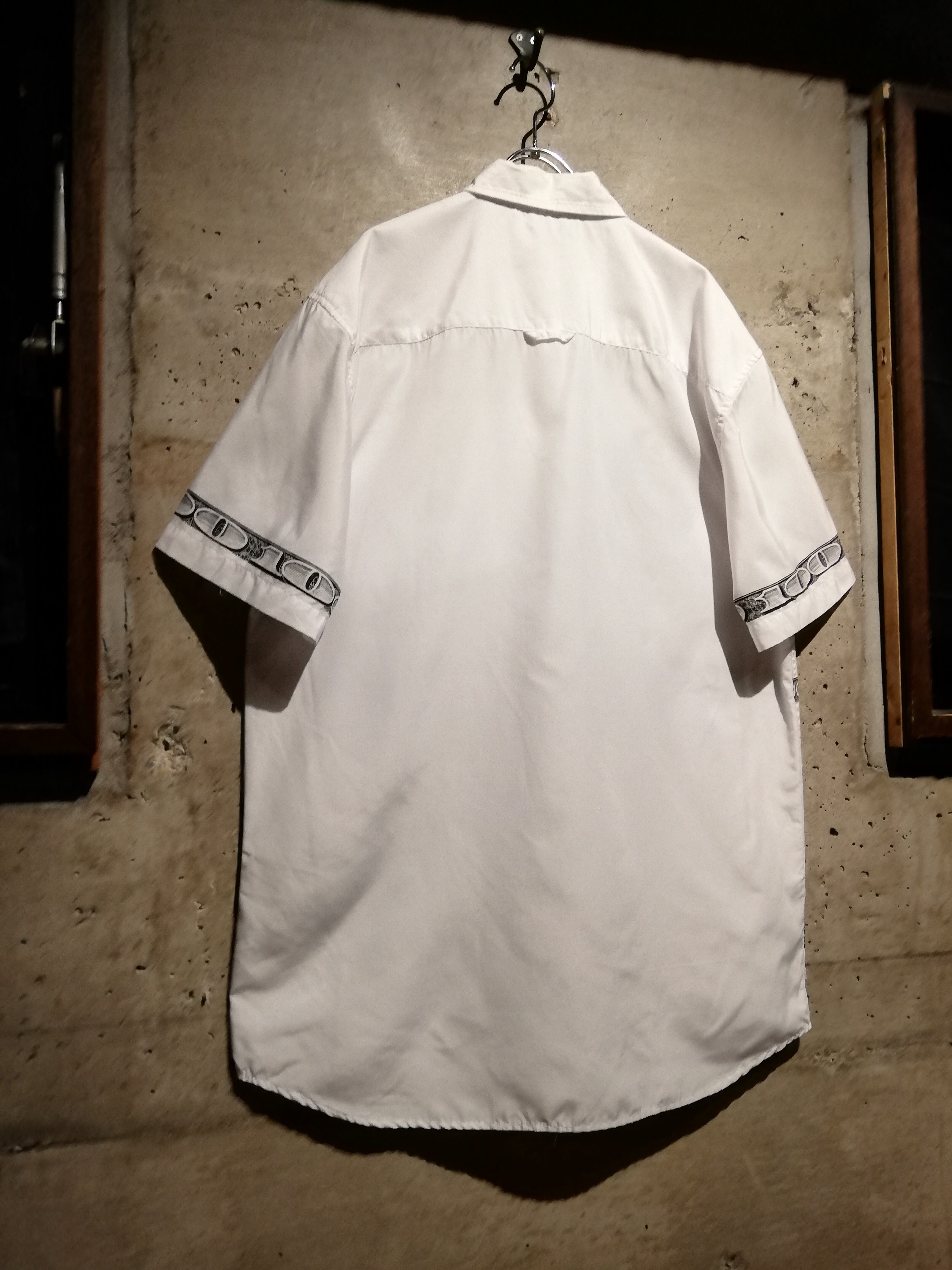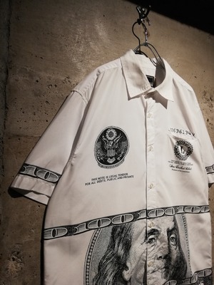 白のボディをベースに、両胸には紙幣に用いられているデザイン、裾や腕周りには100ドル札をプリントした半袖シャツ。