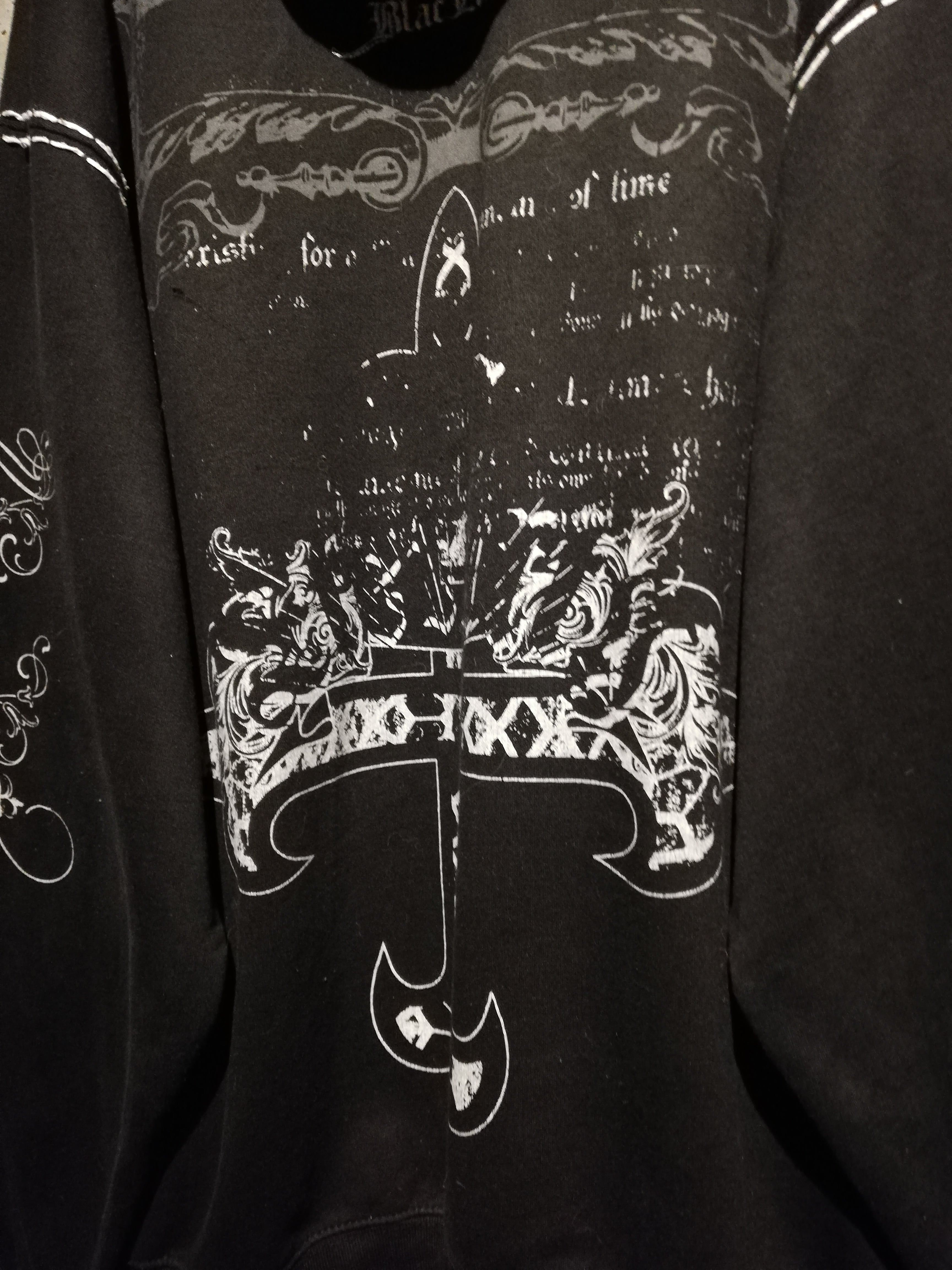 程よく肉感のあるブラックのボディに、ゴシックな雰囲気を漂わせるデザインを載せたジップアップフーディ。