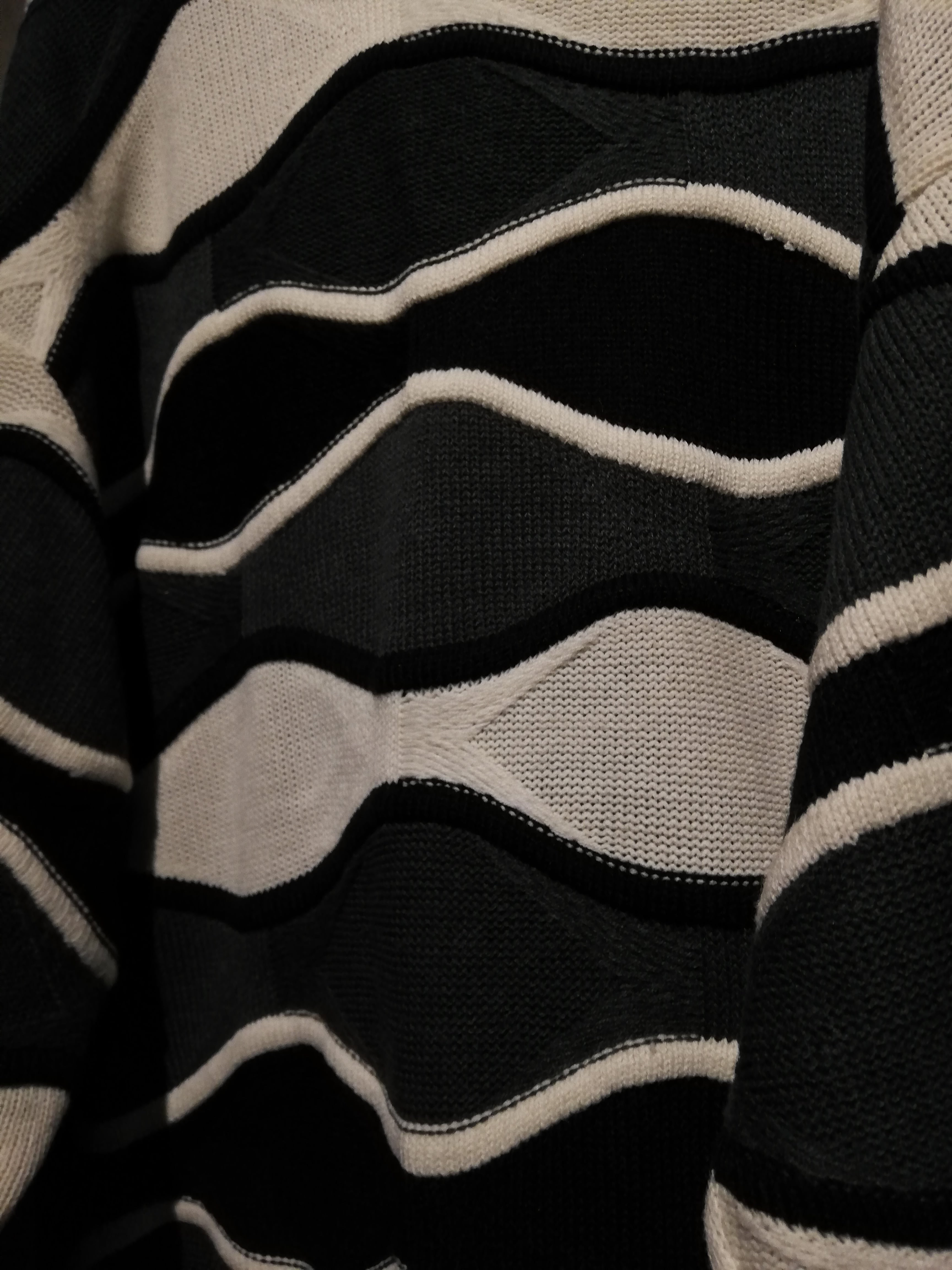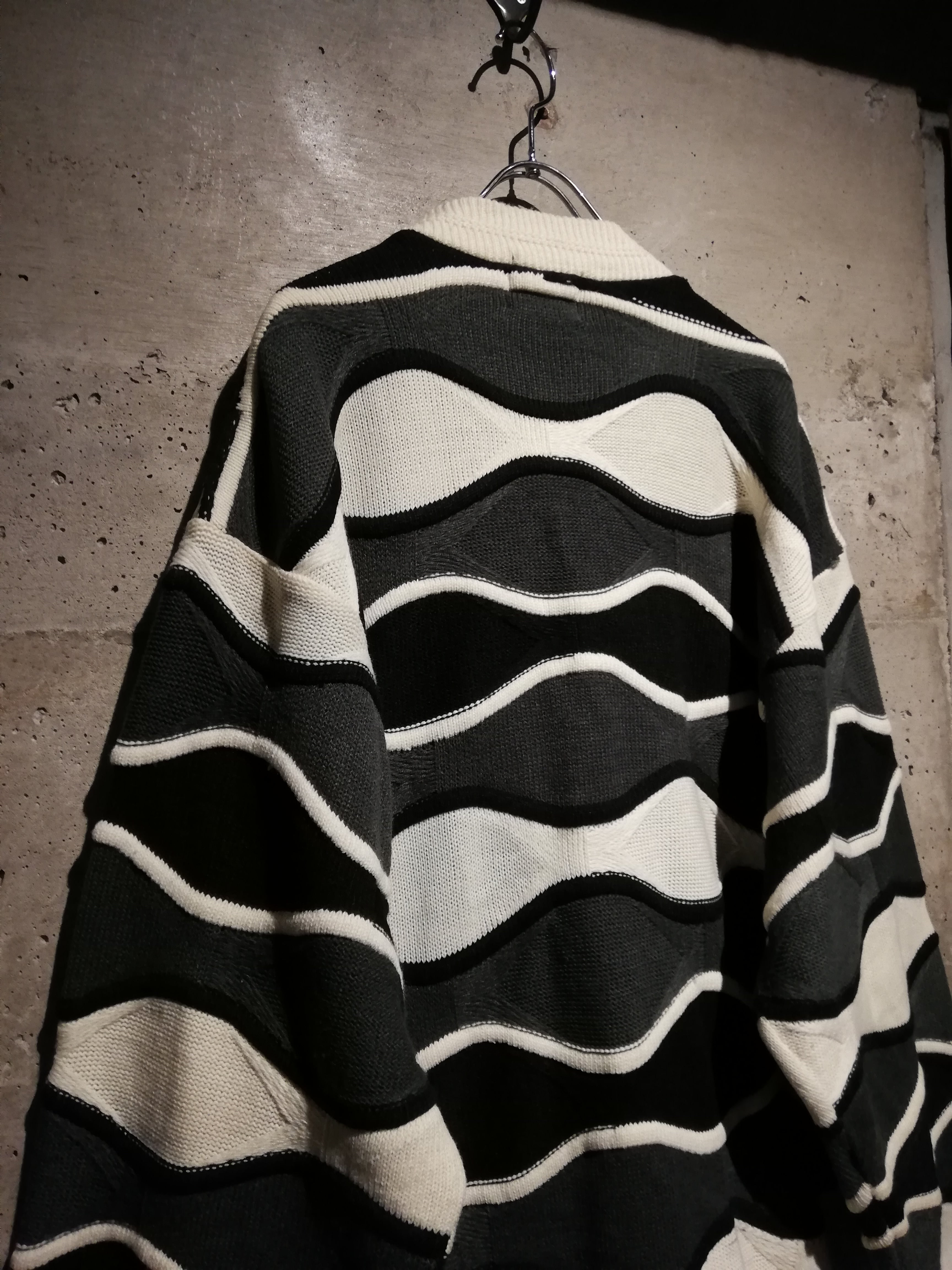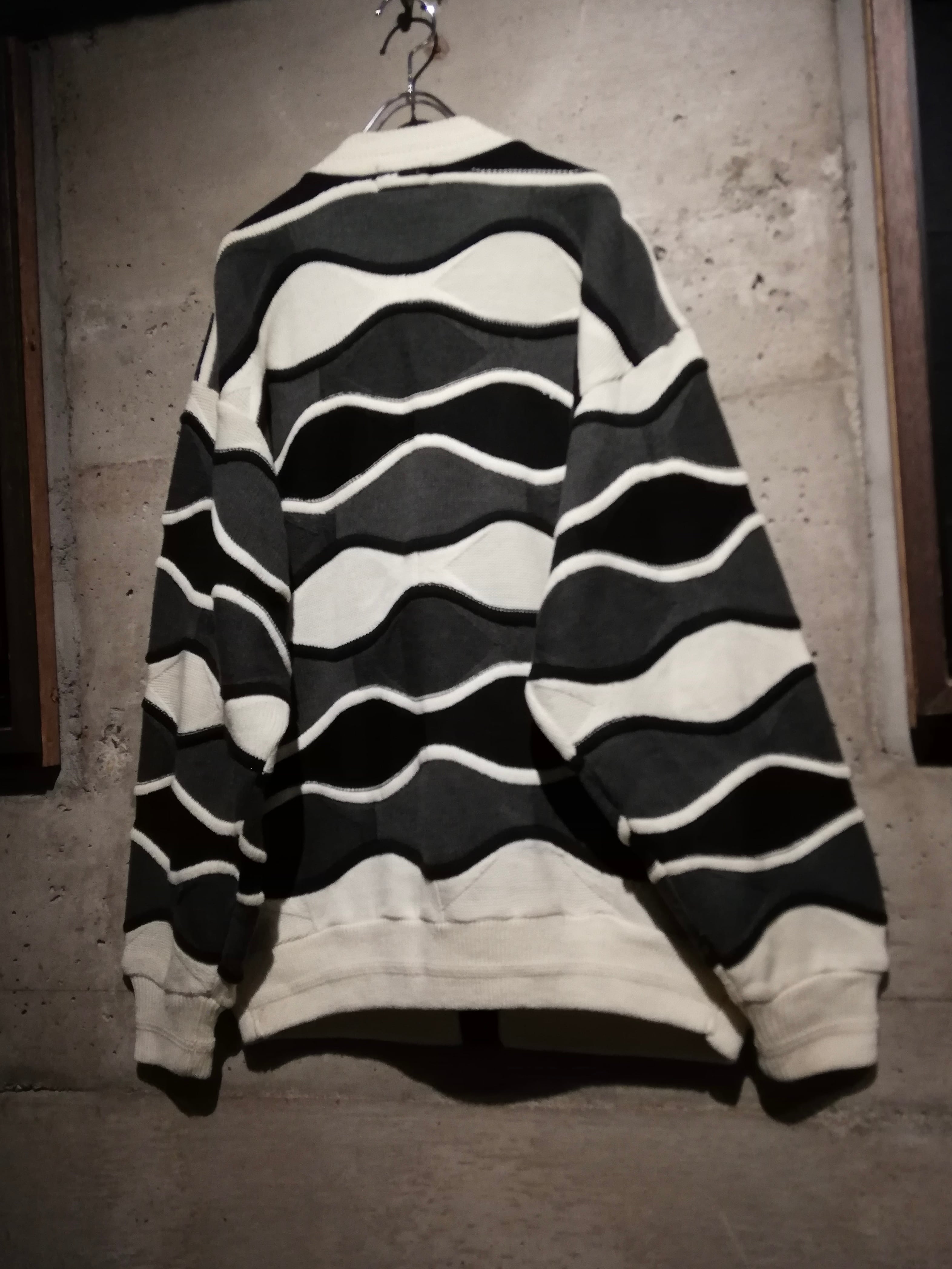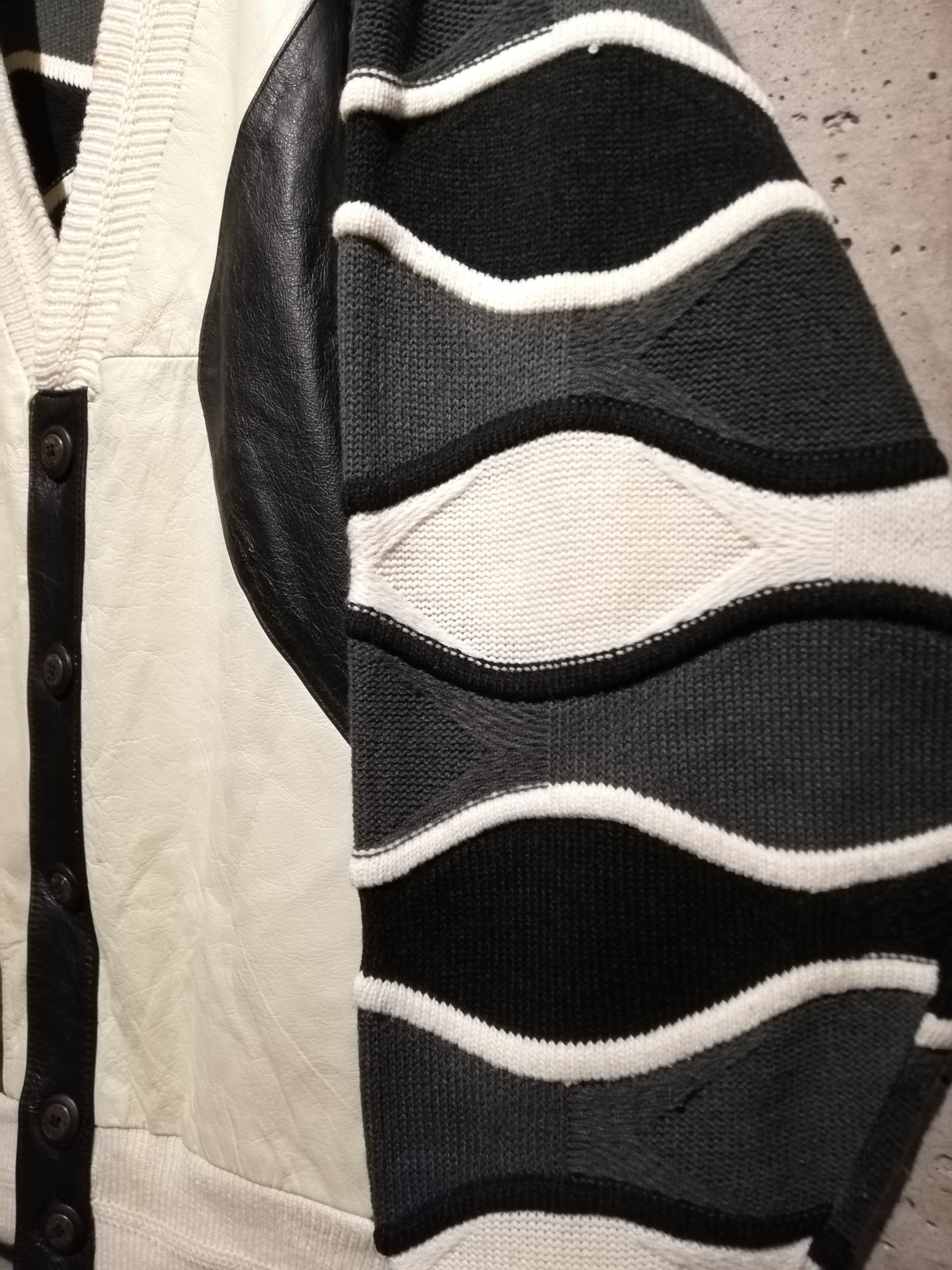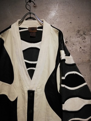 白、グレー、黒のモノトーンで編まれた3Dニットのボディに、ハリのある上質なレザーを掛け合わせたカーディガンジャケット。