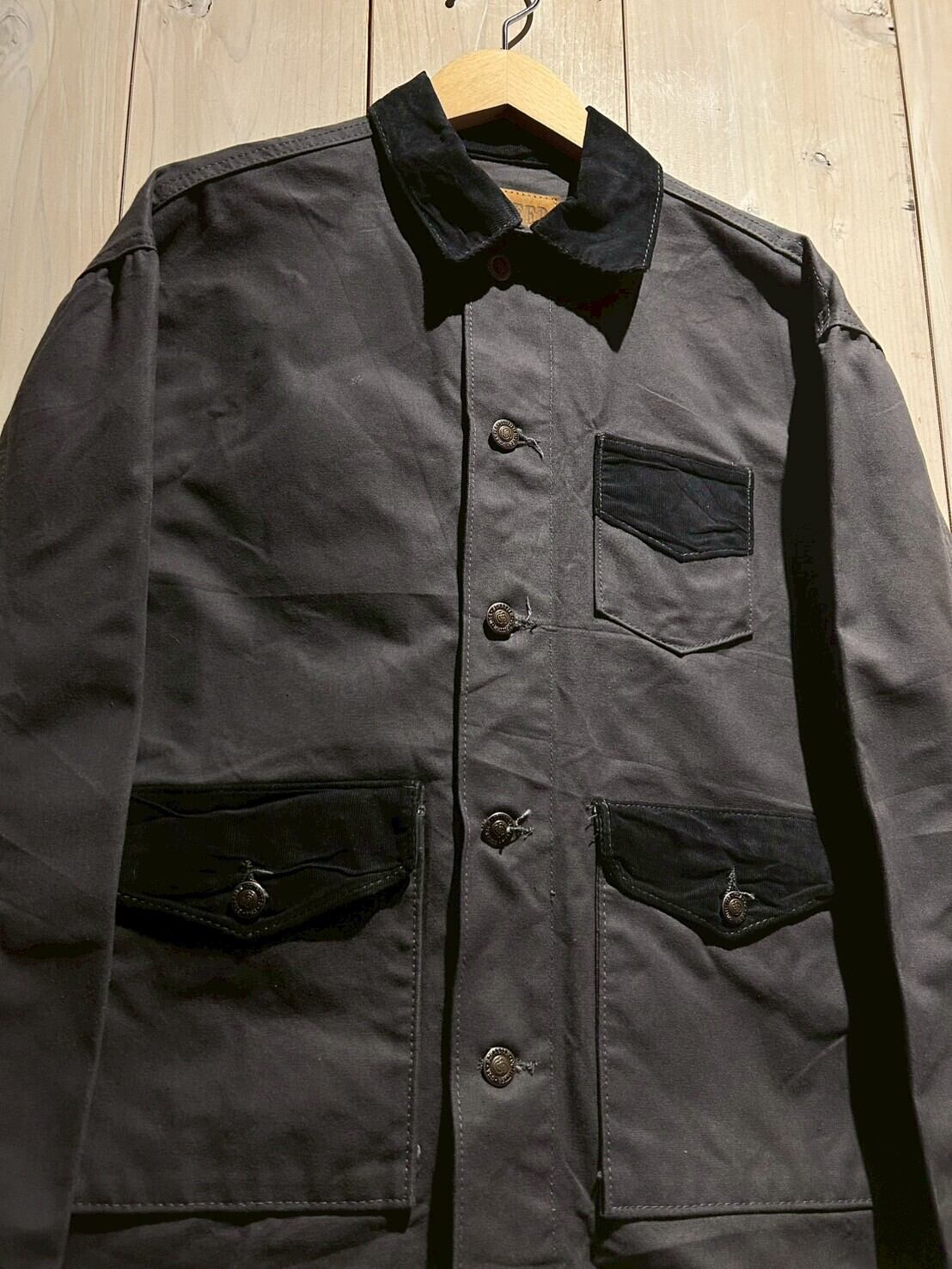 ハリのあるタフなダック地を用いたボディに3つのポケットを載せ、フラップや部分的に黒のコーデュロイを切り替えたダックジャケット。