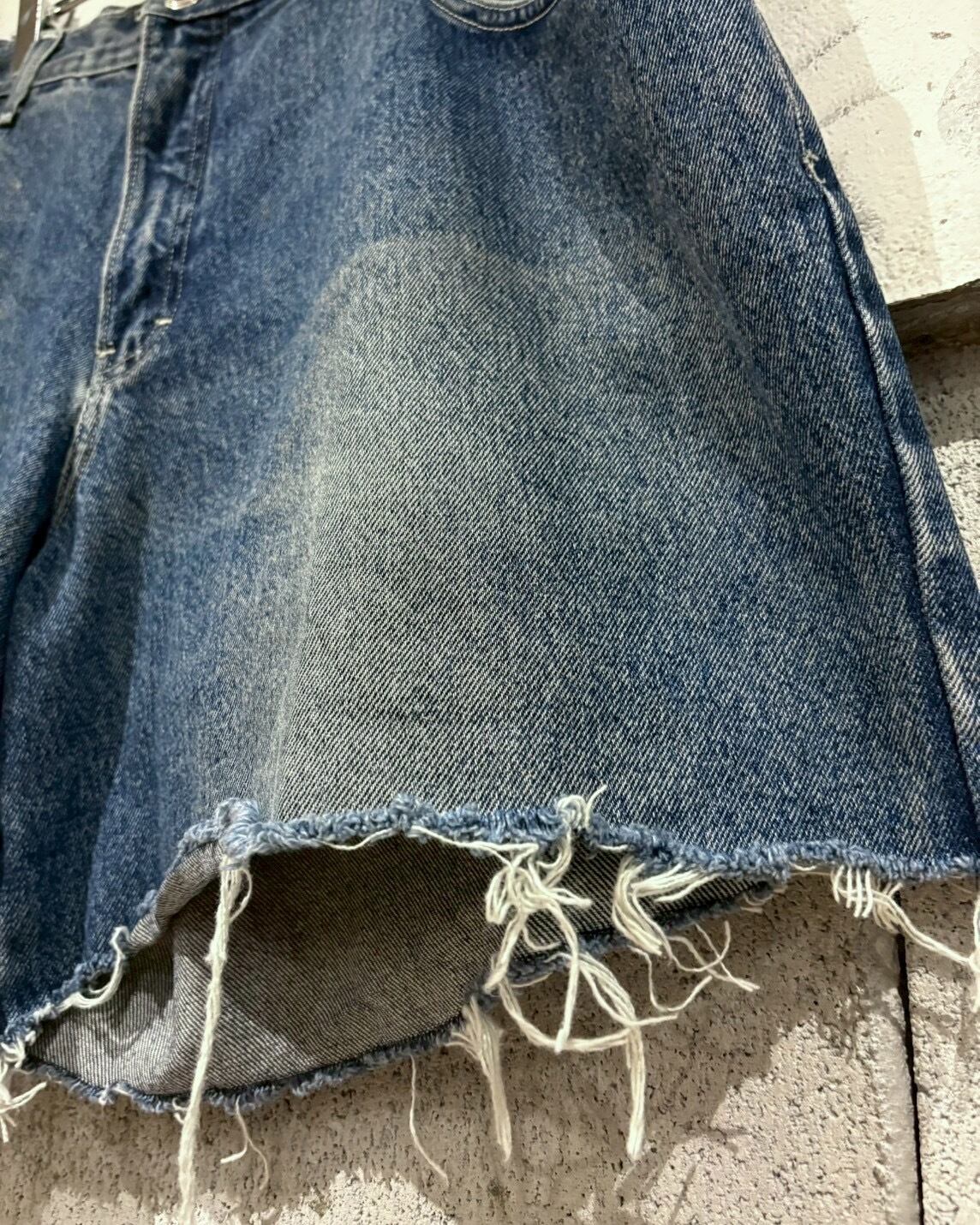 このブランドならではの美シルエットのレイブデニムパンツを、太ももでざっくりとカットオフしたショーツ。