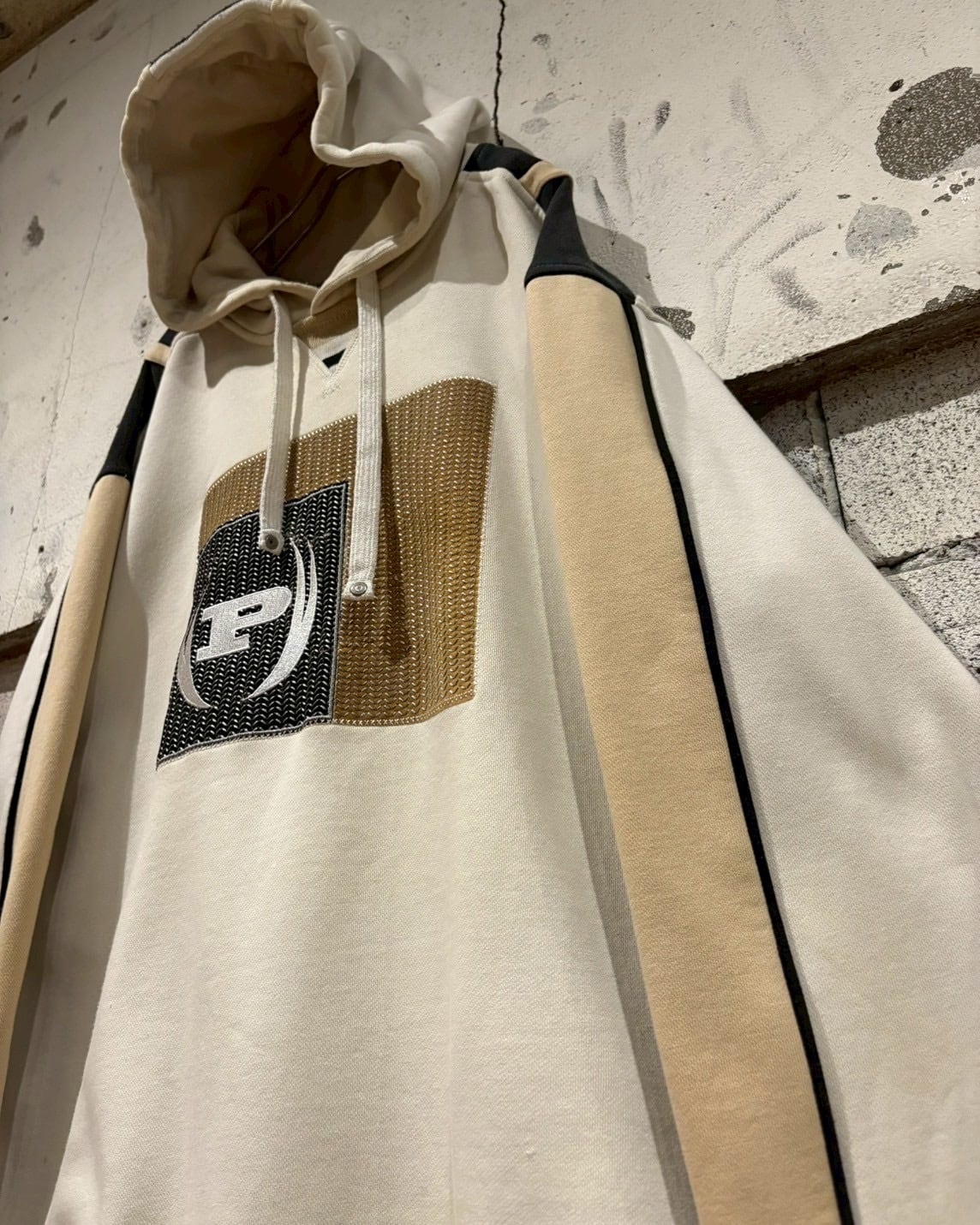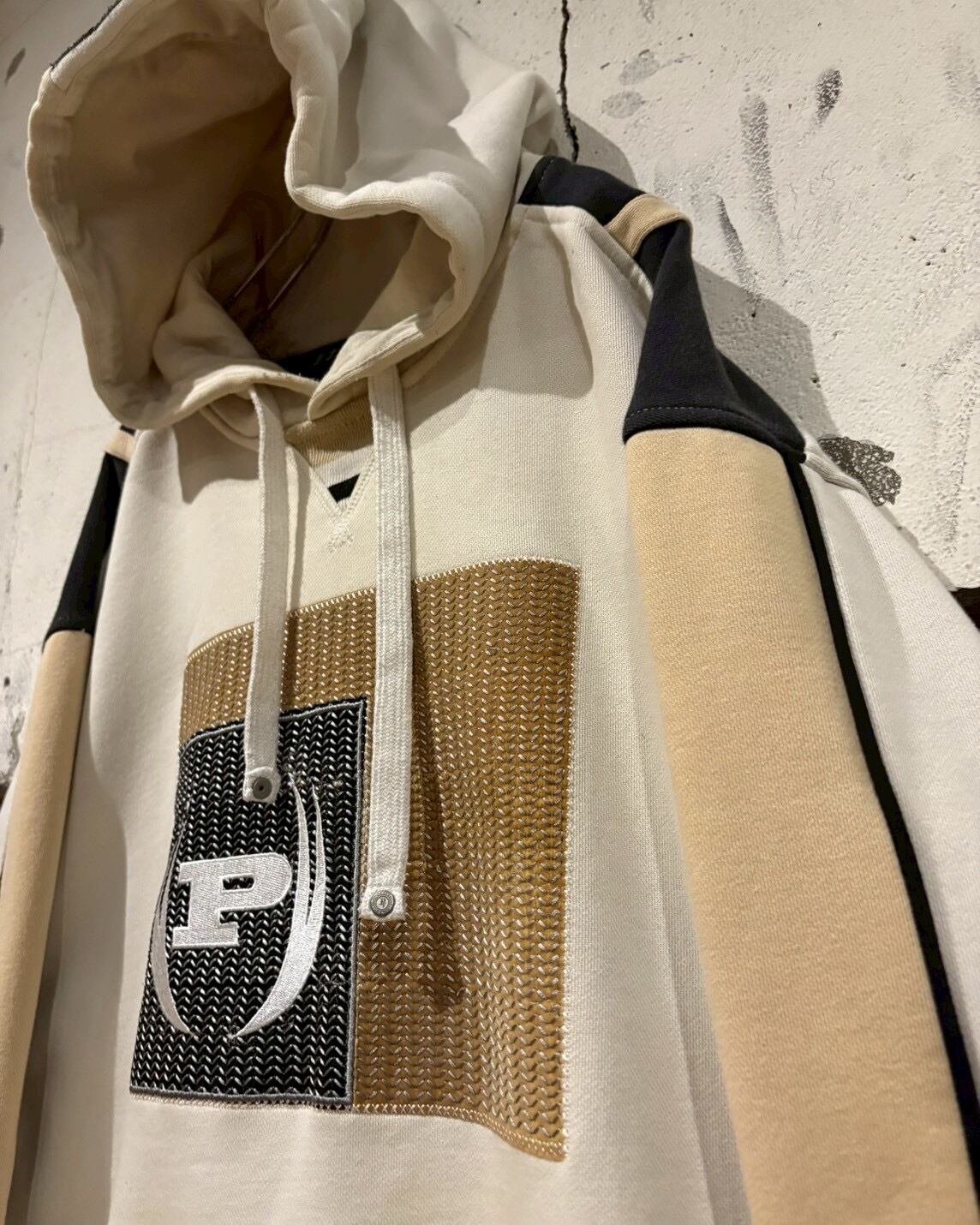 肉感のあるベージュ×ホワイトのボディをベースに、ベロア調の起毛感のある生地を切り替え、その上からブランドロゴを刺繍で刻んだプルオーバーフーディ。