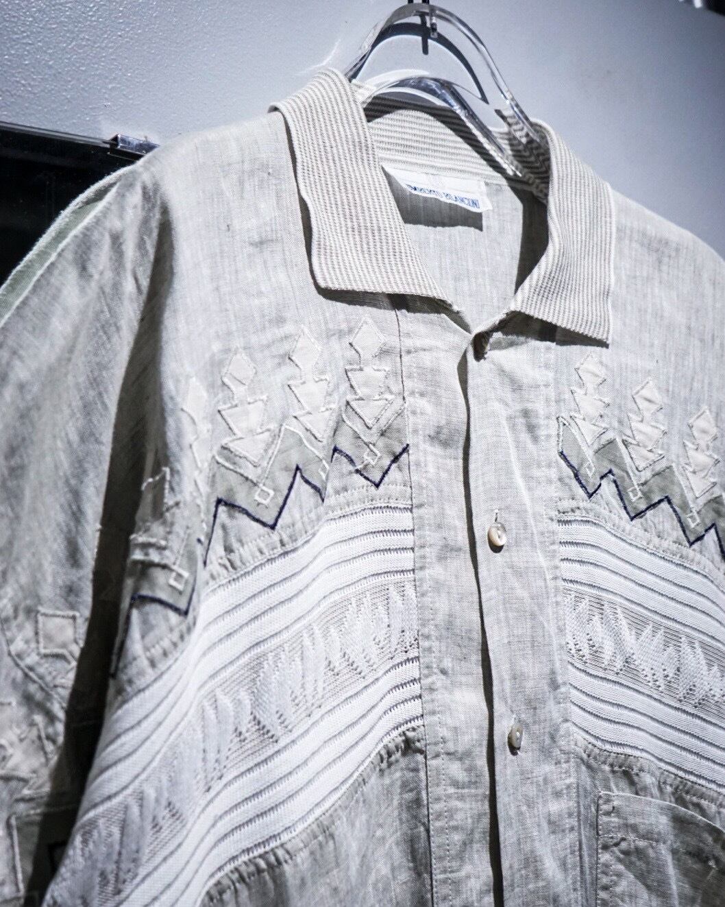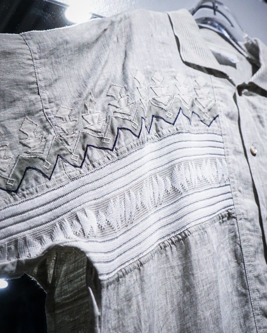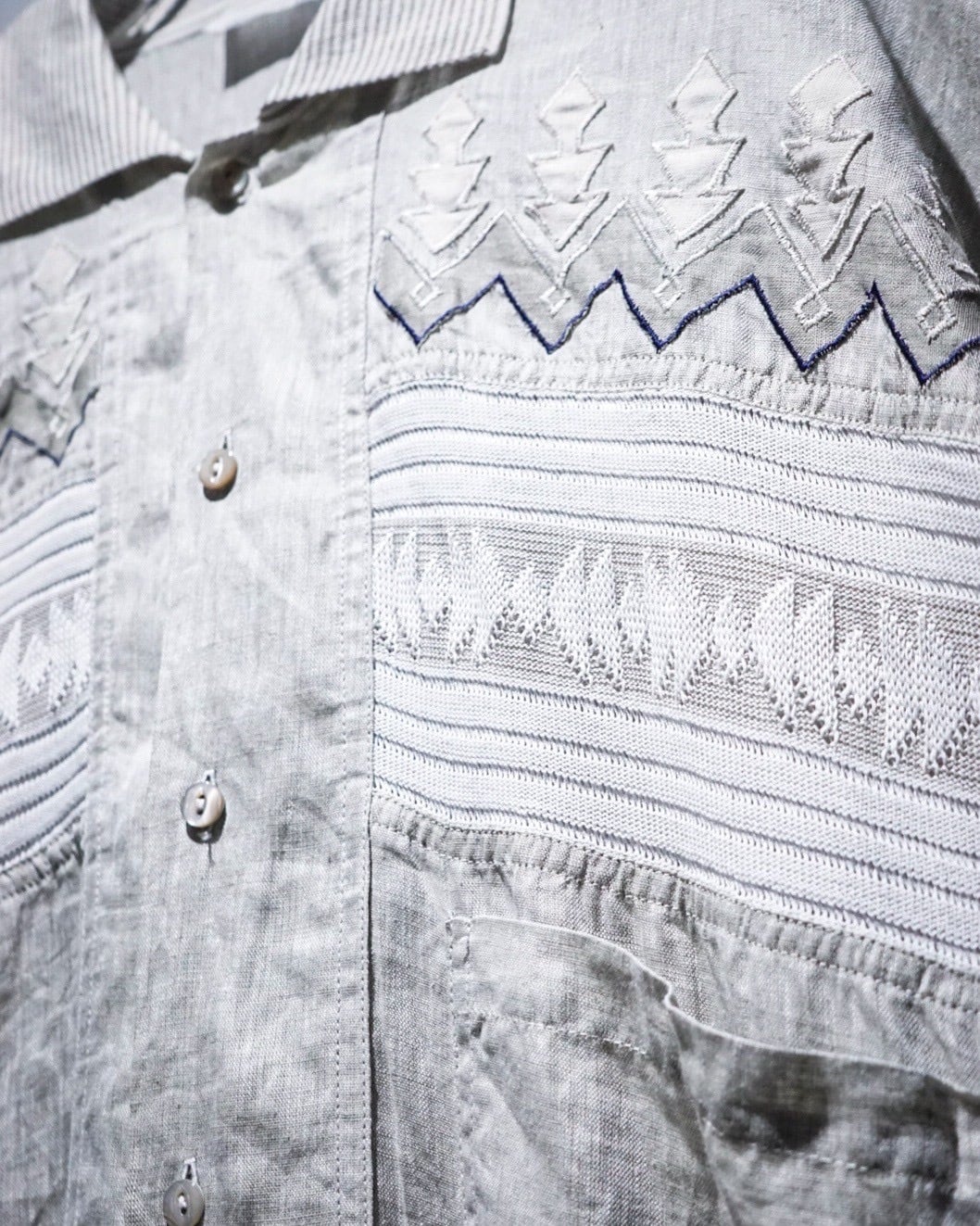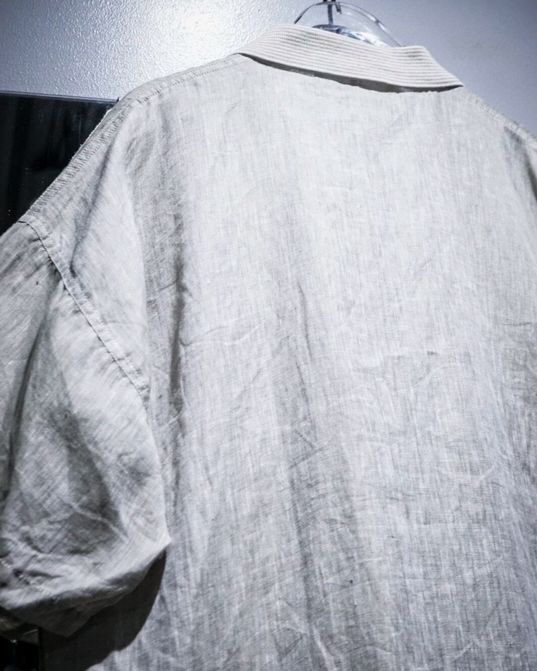 渋い風合いを醸し出すリネン素材を用いたグレーカラーをベースとし、胸元には上品且つアーティスティックな柄を施した半袖シャツ。