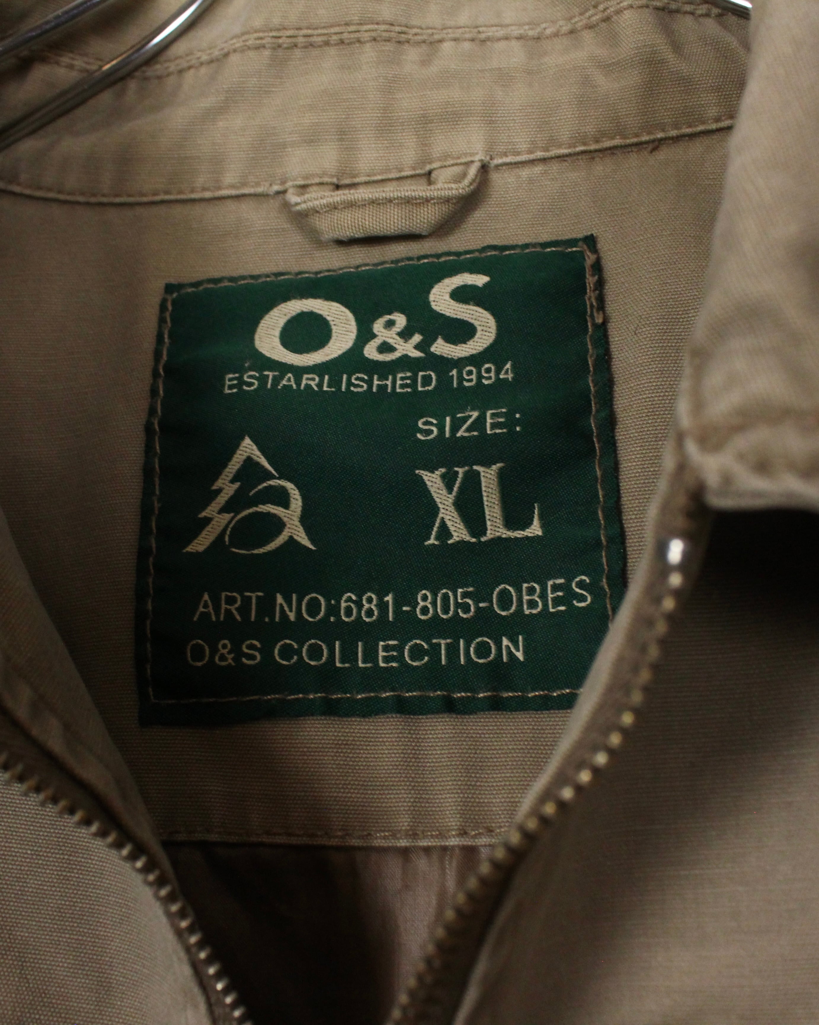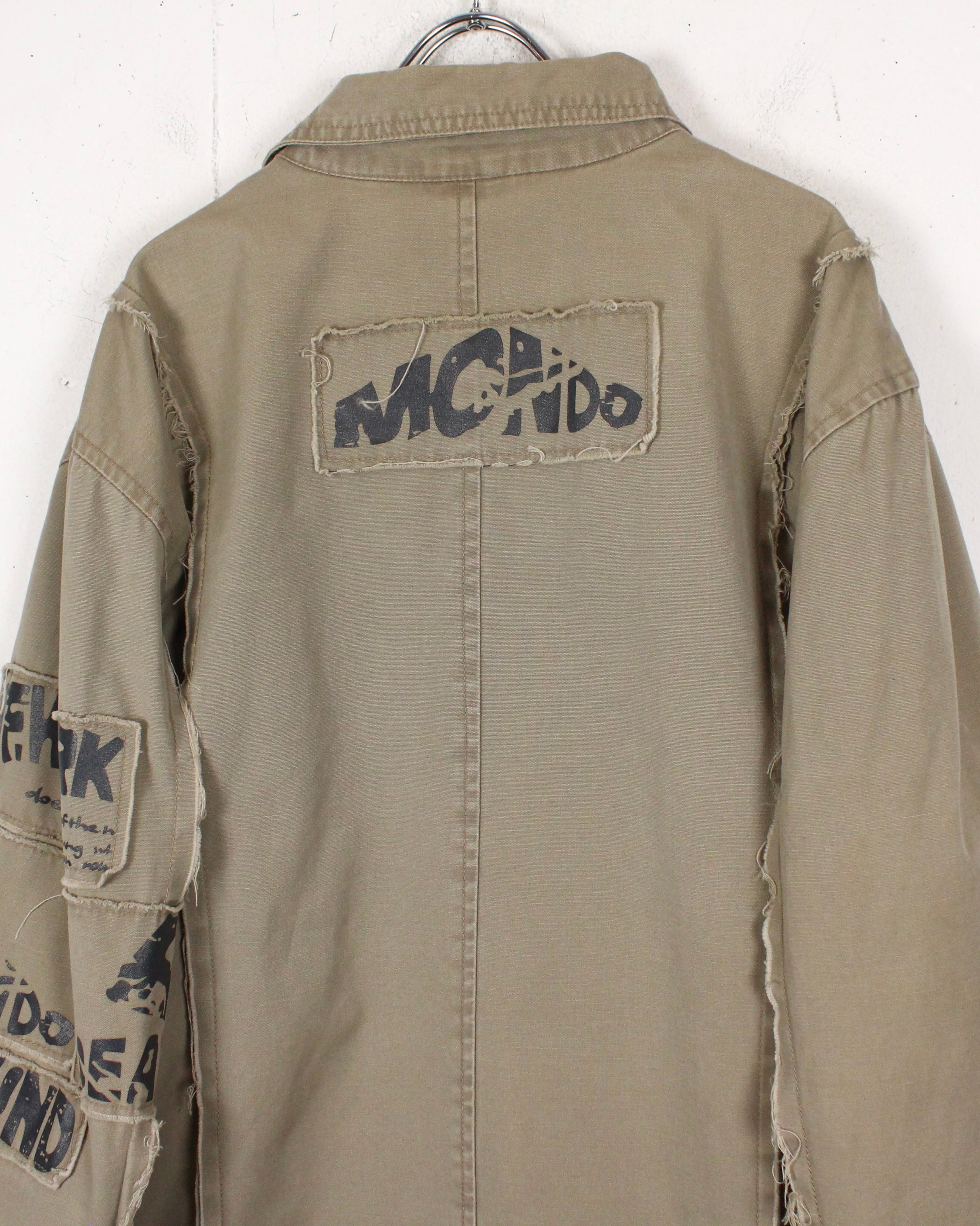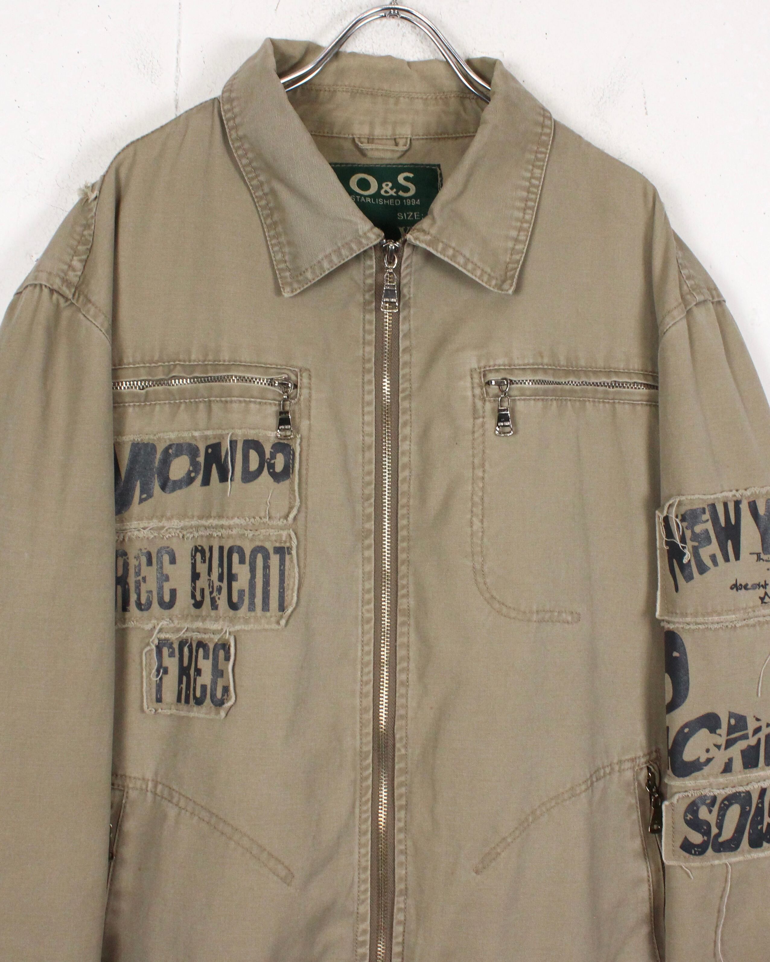 ベージュのダックを用いたボディに、右胸や左腕、背面にパッチ、その上からプリントを載せたジップアップジャケット。