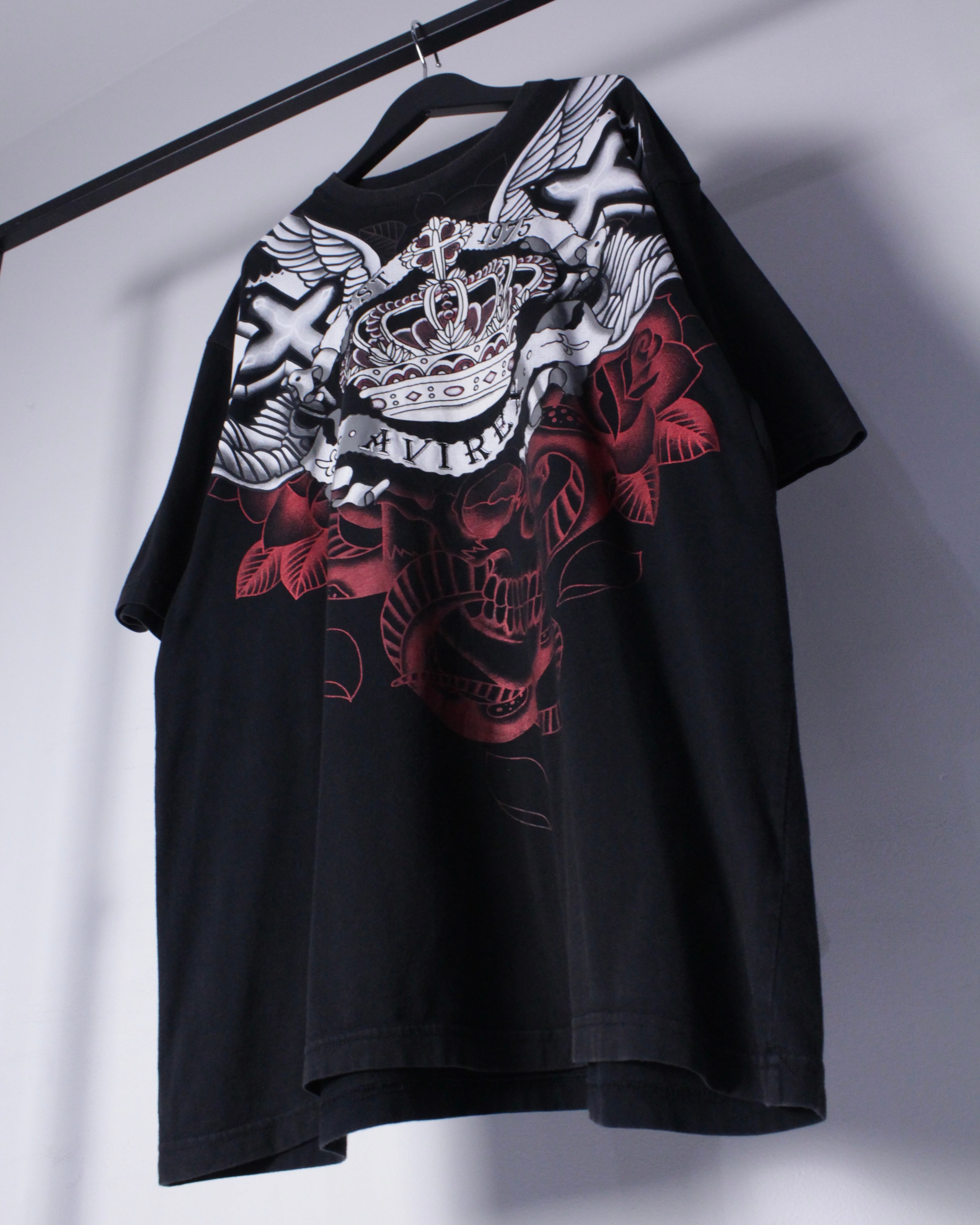 ブラックのボディをベースに、クラウンに羽、クロス、薔薇などのゴシック調のプリントを載せた1着。