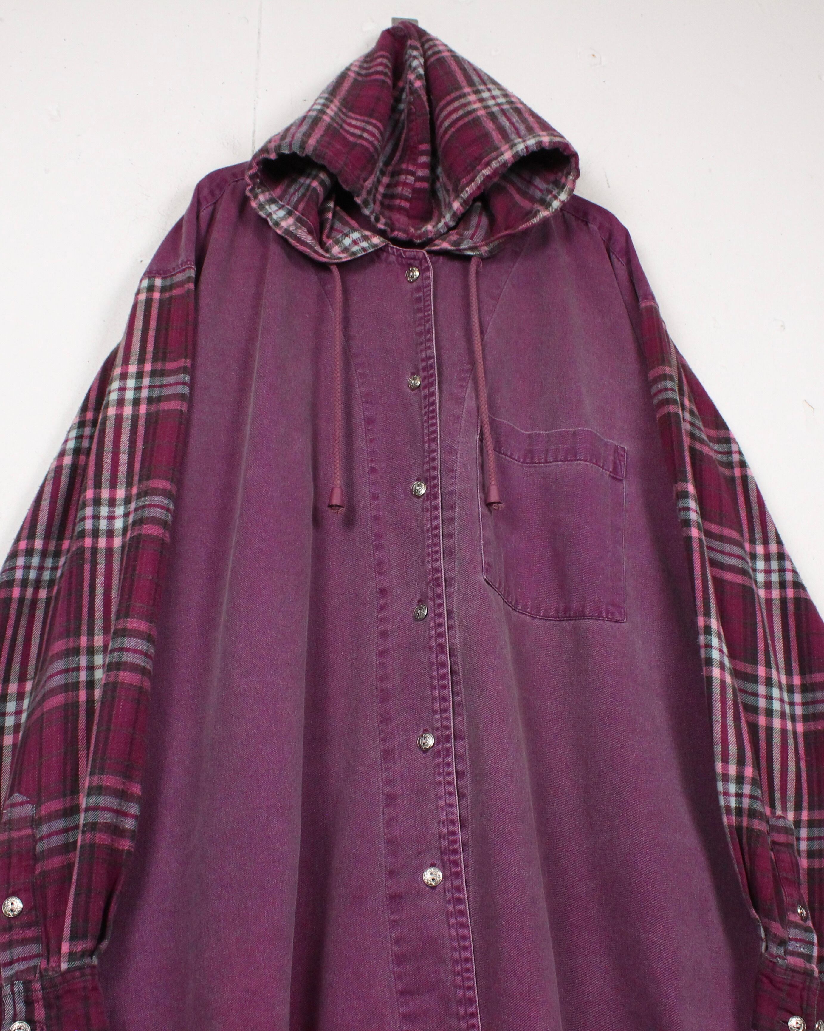 パープルのコットン素材を用いたボディをベースに、アーム、フードにはネルシャツ調のチェック柄を切り替えたフーディシャツ。