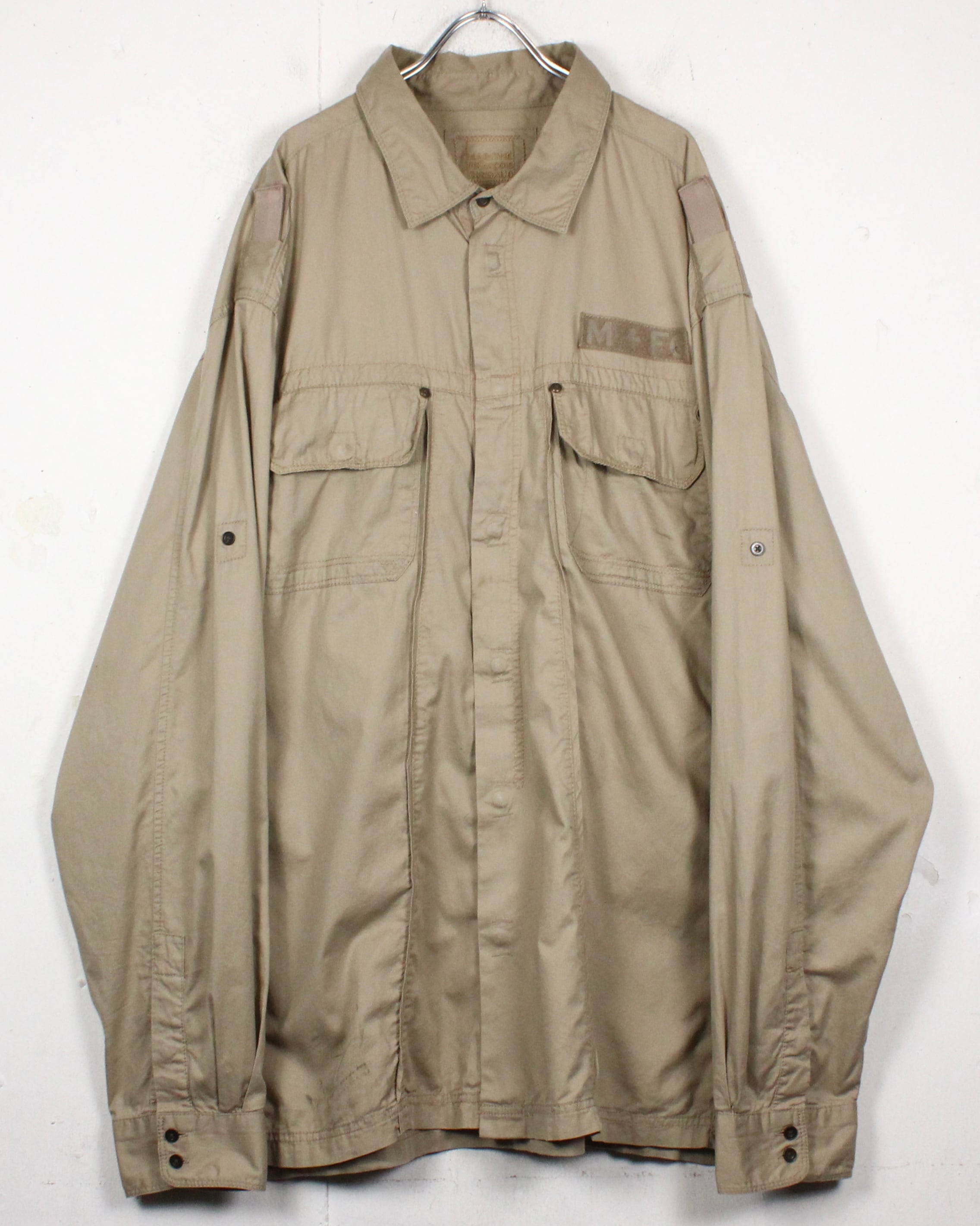 フロントには2つのフラップポケットに、当ブランドの定番アイテム、シャトルパンツにも使用されるベルクロデザインを左胸に、両肩にもエポレットのようなベルクロを施したデザイン。
